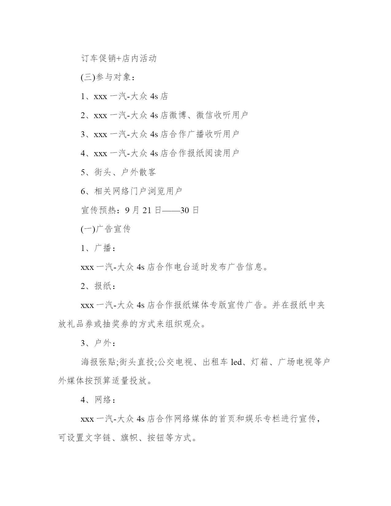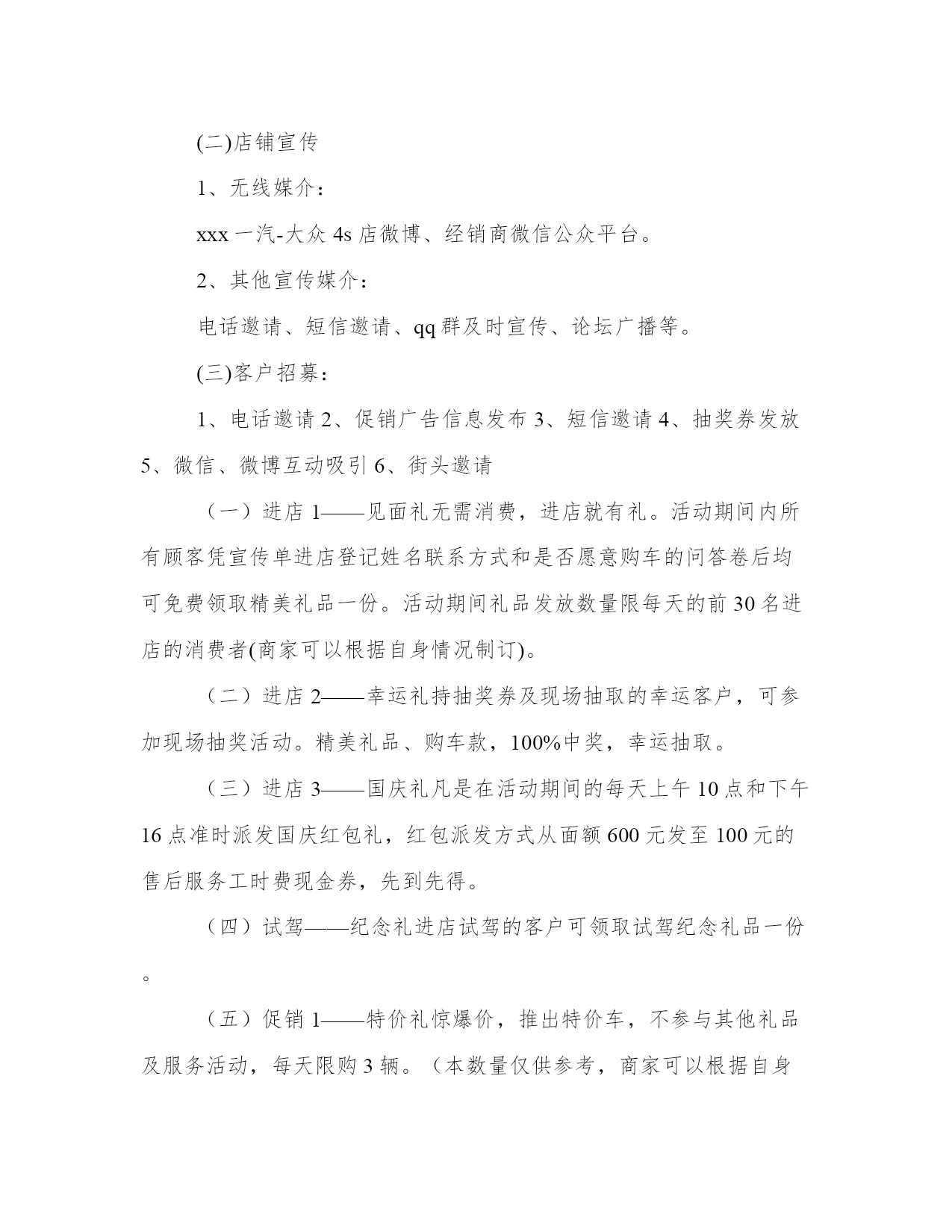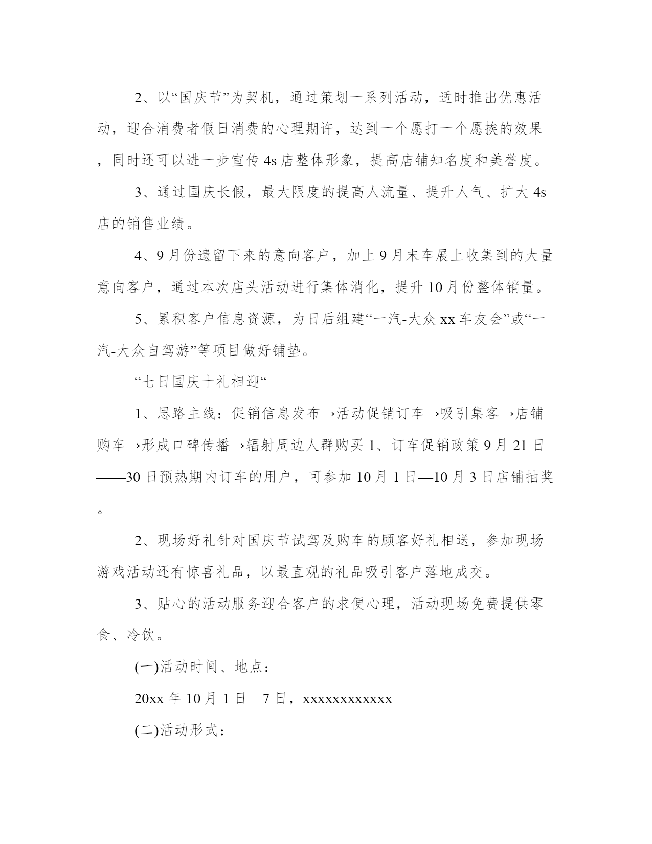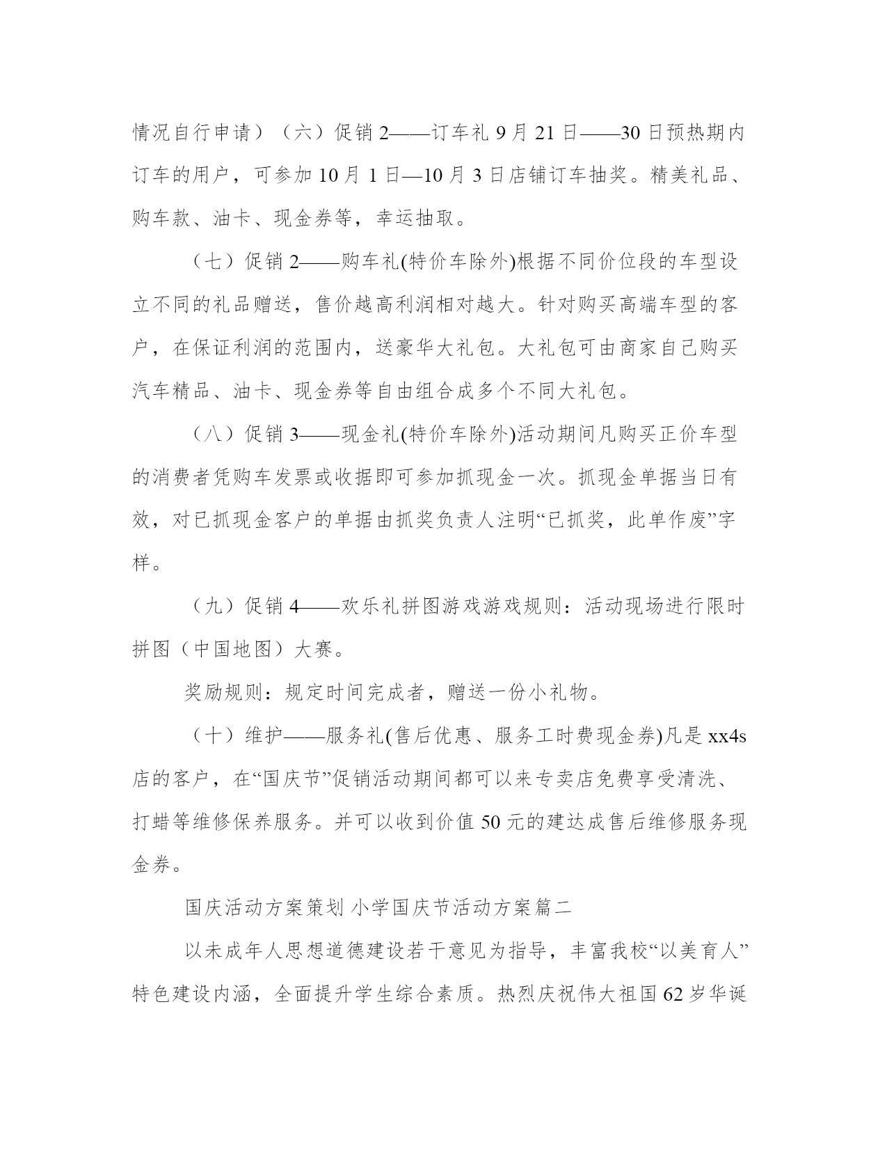 2023年国庆活动方案策划小学国庆节活动方案5篇(优质)方案是从目的、要求、方式、方法、进度等都部署具体、周密,并有很强可操作性的计划。怎样写方案才更能起到其作用呢?方案应该怎么制定呢?以下是小编给大家介绍的方案范文的相关内容,希望对大家有所帮助。国庆活动方案策划小学国庆节活动方案篇一1、九月底十月初汽车用品销售已经进入黄金销售时段。随着国庆的到来,到4s店进行维修保养及车辆检查的客户日益增多,新车市场也迎来了销售旺季。2、假日消费在中国已深入人心,消费者往往认为在大型节假日购车将享受到更多平时没有的优惠,决定了很多客户将购车计划放在节假日里。3、国庆黄金周,大部分地区都有媒体组织的各种类型的室内室外车展。通过9月份车展,各经销商均已收集到大量的意向客户,急需组织大型店头活动进行集体消化。4、金九银十!9、10月份是全国车市旺季,持币观望客户将在9、10月份进行集中释放。1、本次活动目标集客量:xxx组。目标订单量:xxx台。2、以“国庆节”为契机,通过策划一系列活动,适时推出优惠活动,迎合消费者假日消费的心理期许,达到一个愿打一个愿挨的效果,同时还可以进一步宣传4s店整体形象,提高店铺知名度和美誉度。3、通过国庆长假,最大限度的提高人流量、提升人气、扩大4s店的销售业绩。4、9月份遗留下来的意向客户,加上9月末车展上收集到的大量意向客户,通过本次店头活动进行集体消化,提升10月份整体销量。5、累积客户信息资源,为日后组建“一汽-大众xx车友会”或“一汽-大众自驾游”等项目做好铺垫。“七日国庆十礼相迎“1、思路主线:促销信息发布→活动促销订车→吸引集客→店铺购车→形成口碑传播→辐射周边人群购买1、订车促销政策9月21日——30日预热期内订车的用户,可参加10月1日—10月3日店铺抽奖。2、现场好礼针对国庆节试驾及购车的顾客好礼相送,参加现场游戏活动还有惊喜礼品,以最直观的礼品吸引客户落地成交。3、贴心的活动服务迎合客户的求便心理,活动现场免费提供零食、冷饮。(一)活动时间、地点:20xx年10月1日—7日,xxxxxxxxxxxx(二)活动形式:订车促销+店内活动(三)参与对象:1、xxx一汽-大众4s店2、xxx一汽-大众4s店微博、微信收听用户3、xxx一汽-大众4s店合作广播收听用户4、xxx一汽-大众4s店合作报纸阅读用户5、街头、户外散客6、相关网络门户浏览用户宣传预热:9月21日——30日(一)广告宣传1、广播:xxx一汽-大众4s店合作电台适时发布广告信息。2、报纸:xxx一汽-大众4s店合作报纸媒体专版宣传广告。并在报纸中夹放礼品券或抽奖券的方式来组织观众。3、户外:海报张贴;街头直投;公交电视、出租车led、灯箱、广场电视等户外媒体按预算适量投放。4、网络:xxx一汽-大众4s店合作网络媒体的首页和娱乐专栏进行宣传,可设置文字链、旗帜、按钮等方式。(二)店铺宣传1、无线媒介:xxx一汽-大众4s店微博、经销商微信公众平台。2、其他宣传媒介:电话邀请、短信邀请、qq群及时宣传、论坛广播等。(三)客户招募:1、电话邀请2、促销广告信息发布3、短信邀请4、抽奖券发放5、微信、微博互动吸引6、街头邀请(一)进店1——见面礼无需消费,进店就有礼。活动期间内所有顾客凭宣传单进店登记姓名联系方式和是否愿意购车的问答卷后均可免费领取精美礼品一份。活动期间礼品发放数量限每天的前30名进店的消费者(商家可以根据自身情况制订)。(二)进店2——幸运礼持抽奖券及现场抽取的幸运客户,可参加现场抽奖活动。精美礼品、购车款,100%中奖,幸运抽取。(三)进店3——国庆礼凡是在活动期间的每天上午10点和下午16点准时派发国庆红包礼,红包派发方式从面额600元发至100元的售后服务工时费现金券,先到先得。(四)试驾——纪念礼进店试驾的客户可领取试驾纪念礼品一份。(五)促销1——特价礼惊爆价,推出特价车,不参与其他礼品及服务活动,每天限购3辆。(本数量仅供参考,商家可以根据自身情况自行申请)(六)促销2——订车礼9月21日——30日预热期内订车的用户,可参加10月1日—10月3日店铺订车抽奖。精美礼品、购车款、油卡、现金券等,幸运抽取。(七)促销2——购车礼(特价车除外)根据不同价位段的车型设立不同的礼品赠送,售价越高利润相对越大。针对购买高端车型的客户,在保证利润的范围内,送豪华大礼包。大礼包可由商家自己购买汽车精品、油卡、现金券等自由组合成多个不同大礼包。(八)促销3——现金礼(特价车除外)活动期间凡购买正价车型的消费者凭购车发票或收据即可参加抓现金一次。抓现金单据当日有效,对已抓现金客户的单据由抓奖负责人注明“已抓奖,此单作废”字样。(九)促销4——欢乐礼拼图游戏游戏规则:活动现场进行限时拼图(中国地图)大赛。奖励规则:规定时间完成者,赠
