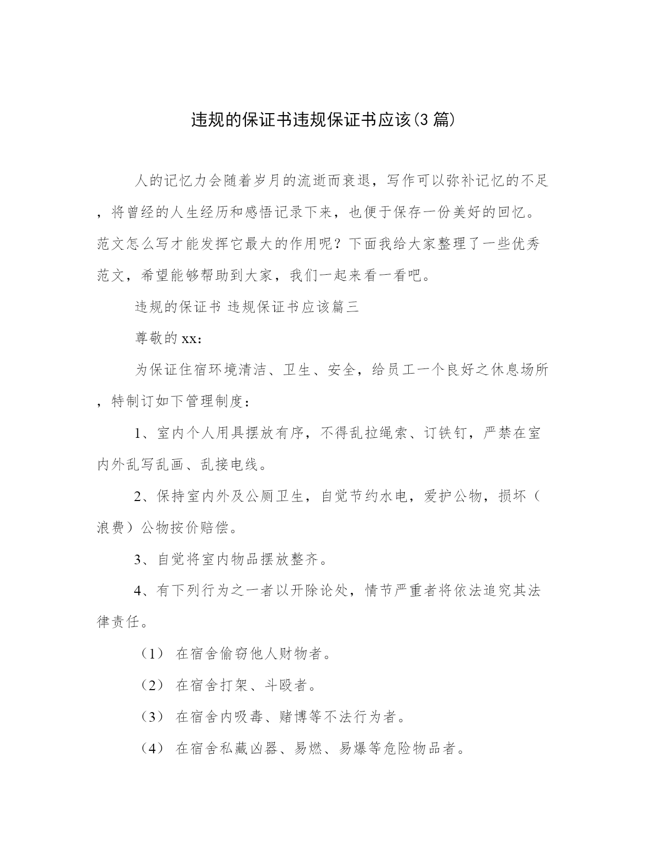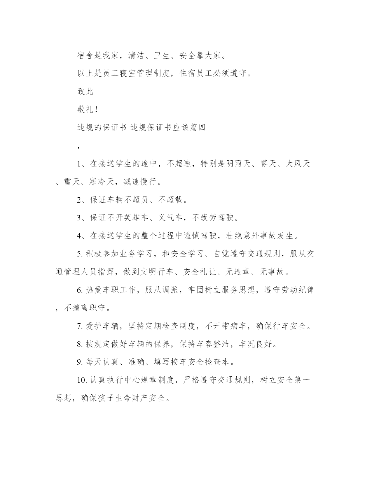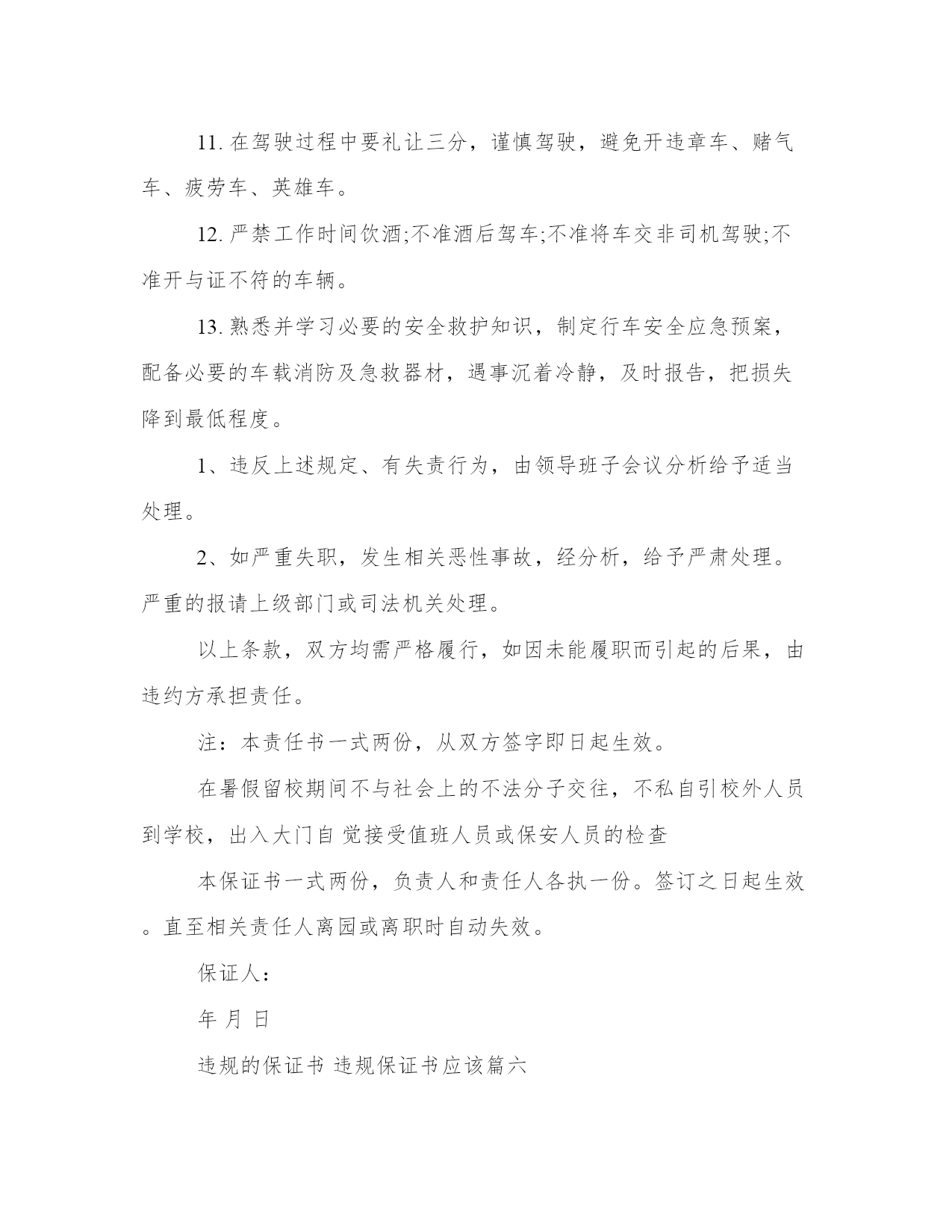 违规的保证书违规保证书应该(3篇)人的记忆力会随着岁月的流逝而衰退,写作可以弥补记忆的不足,将曾经的人生经历和感悟记录下来,也便于保存一份美好的回忆。范文怎么写才能发挥它最大的作用呢?下面我给大家整理了一些优秀范文,希望能够帮助到大家,我们一起来看一看吧。违规的保证书违规保证书应该篇三尊敬的xx:为保证住宿环境清洁、卫生、安全,给员工一个良好之休息场所,特制订如下管理制度:1、室内个人用具摆放有序,不得乱拉绳索、订铁钉,严禁在室内外乱写乱画、乱接电线。2、保持室内外及公厕卫生,自觉节约水电,爱护公物,损坏(浪费)公物按价赔偿。3、自觉将室内物品摆放整齐。4、有下列行为之一者以开除论处,情节严重者将依法追究其法律责任。(1)在宿舍偷窃他人财物者。(2)在宿舍打架、斗殴者。(3)在宿舍内吸毒、赌博等不法行为者。(4)在宿舍私藏凶器、易燃、易爆等危险物品者。(5)留宿外来人员者。5、施行宿舍长负责制。每个宿舍设宿舍长一名。6、住宿人员注意事项:(1)宿舍房间内的清洁卫生工作由宿舍员工负责,确保宿舍整洁卫生。(2)经常清理屋顶的蜘蛛网。(3)各人床铺应摆放整齐。(4)节水节电,对宿舍的用电器,煤气,饮用水及时检查更新。(5)做好宿舍的安全保卫工作,出入房间随手关门,注意安全防盗。(6)出门前应检查各用电器是否处于开启、待机状态,应及时关闭,以免发生火灾。(7)出门前应关闭水阀,以免因长流水造成水资源浪费。(8)宿舍仅限本公司员工住宿,未经许可一律不得容留非本寝人员造访。(9)所有人员应在22:00前返回宿舍(因公司工作安排而临时不能归寝者除外),超过22:00不归者视为夜不归寝。一个月内有4次以上夜不归寝者,公司将取消其免费住宿的福利待遇,由其本人自行解决住宿问题。7、公司将不定期抽查各寝室卫生、安全情况。宿舍是我家,清洁、卫生、安全靠大家。以上是员工寝室管理制度,住宿员工必须遵守。致此敬礼!违规的保证书违规保证书应该篇四,1、在接送学生的途中,不超速,特别是阴雨天、雾天、大风天、雪天、寒冷天,减速慢行。2、保证车辆不超员、不超载。3、保证不开英雄车、义气车,不疲劳驾驶。4、在接送学生的整个过程中谨慎驾驶,杜绝意外事故发生。5.积极参加业务学习,和安全学习、自觉遵守交通规则,服从交通管理人员指挥,做到文明行车、安全礼让、无违章、无事故。6.热爱车职工作,服从调派,牢固树立服务思想,遵守劳动纪律,不擅离职守。7.爱护车辆,坚持定期检查制度,不开带病车,确保行车安全。8.按规定做好车辆的保养,保持车容整洁,车况良好。9.每天认真、准确、填写校车安全检查本。10.认真执行中心规章制度,严格遵守交通规则,树立安全第一思想,确保孩子生命财产安全。11.在驾驶过程中要礼让三分,谨慎驾驶,避免开违章车、赌气车、疲劳车、英雄车。12.严禁工作时间饮酒;不准酒后驾车;不准将车交非司机驾驶;不准开与证不符的车辆。13.熟悉并学习必要的安全救护知识,制定行车安全应急预案,配备必要的车载消防及急救器材,遇事沉着冷静,及时报告,把损失降到最低程度。1、违反上述规定、有失责行为,由领导班子会议分析给予适当处理。2、如严重失职,发生相关恶性事故,经分析,给予严肃处理。严重的报请上级部门或司法机关处理。以上条款,双方均需严格履行,如因未能履职而引起的后果,由违约方承担责任。注:本责任书一式两份,从双方签字即日起生效。在暑假留校期间不与社会上的不法分子交往,不私自引校外人员到学校,出入大门自觉接受值班人员或保安人员的检查本保证书一式两份,负责人和责任人各执一份。签订之日起生效。直至相关责任人离园或离职时自动失效。保证人:年月日违规的保证书违规保证书应该篇六为创造有序、畅通、安全、和谐的道路交通环境,保护学生的人身安全,创建文明交通安全学校,让学生掌握交通法规知识,提高学生的交通安全意识、自我保护意识。班主任与学生、家长签订交通安全保证书,具体内容如下:一、家长要认真教育孩子,自觉遵守交通法规,养成良好的行为习惯,不在公路上踢球、玩、戏闹。放学必须站好路队,中途不准散队、购物、串门、并排走,时时处处注意交通安全。二、三、教育孩子乘车时要遵守秩序,注意乘车安全。家长作为孩子的第一监护人,必须保证孩子不乘坐无标识、无证、无牌或不合格手续的报废车、农用车及无运营手续的违规车辆。四、家长要教育孩子文明乘车,做到排队候车,有序上车,不将身体的任何部位伸出车外,不向车外抛撒任何物品。不拥挤,不抢座,不打架,自觉遵守乘车纪律,确保乘车期间的人身安全。五、六、家长要确保自己的孩子不乘坐超员的车辆.乘车的学生,家长要监督孩子在规定的时间内到指定的地点等车,坐车。不得提前出门,更不得在大街上跑闹,扰乱周边居民的正常生活。七、家长要督促孩子准时上学,有条件的家长可亲自接送,严禁学生独自骑自行