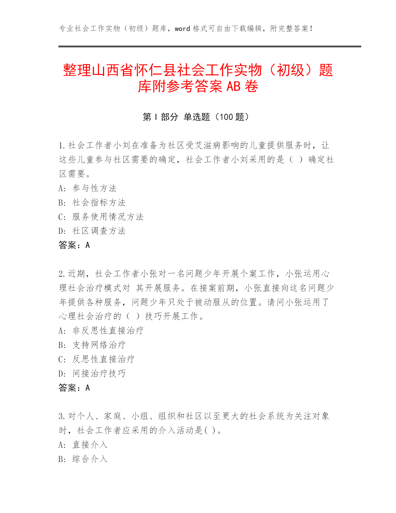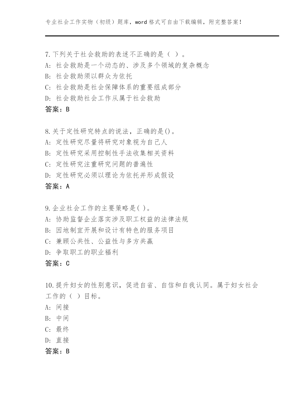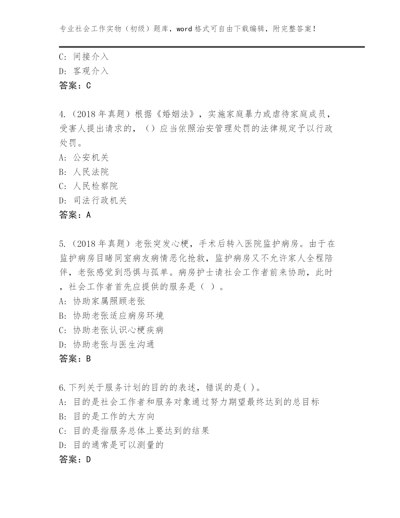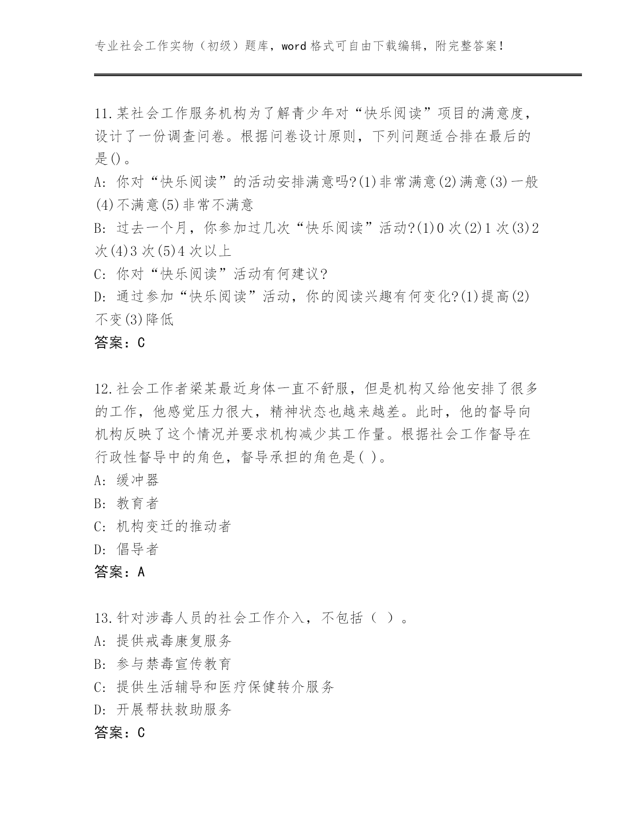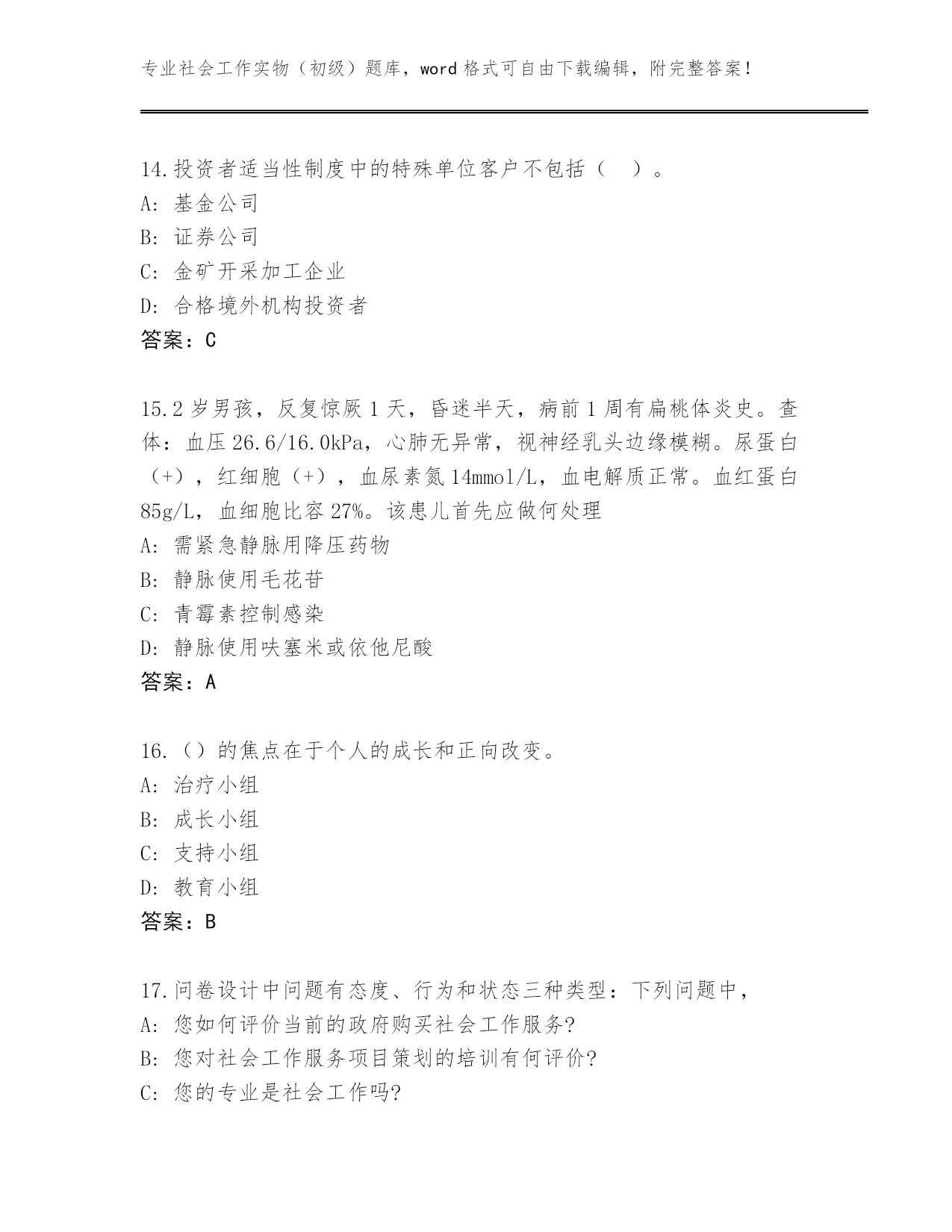 专业社会工作实物(初级)题库,word格式可自由下载编辑,附完整答案!整理山西省怀仁县社会工作实物(初级)题库附参考答案AB卷第I部分单选题(100题)1.社会工作者小刘在准备为社区受艾滋病影响的儿童提供服务时,让这些儿童参与社区需要的确定,社会工作者小刘采用的是()确定社区需要。A:参与性方法B:社会指标方法C:服务使用情况方法D:社区调查方法答案:A2.近期,社会工作者小张对一名问题少年开展个案工作,小张运用心理社会治疗模式对其开展服务。在接案前期,小张直接向这名问题少年提供各种服务,问题少年只处于被动服从的位置。请问小张运用了心理社会治疗的()技巧开展工作。A:非反思性直接治疗B:支持网络治疗C:反思性直接治疗D:间接治疗技巧答案:A3.对个人、家庭、小组、组织和社区以至更大的社会系统为关注对象时,社会工作者应采用的介入活动是()。A:直接介入B:综合介入C:间接介入D:客观介入答案:C4.(2018年真题)根据《婚姻法》,实施家庭暴力或虐待家庭成员,受害人提出请求的,()应当依照治安管理处罚的法律规定予以行政处罚。A:公安机关B:人民法院C:人民检察院D:司法行政机关答案:A5.(2018年真题)老张突发心梗,手术后转入医院监护病房。由于在监护病房目睹同室病友病情恶化抢救,监护病房又不允许家人全程陪伴,老张感觉到恐惧与孤单。病房护士请社会工作者前来协助,此时,社会工作者首先应提供的服务是()。A:协助家属照顾老张B:协助老张适应病房环境C:协助老张认识心梗疾病D:协助老张与医生沟通答案:B6.下列关于服务计划的目的的表述,错误的是()。A:目的是社会工作者和服务对象通过努力期望最终达到的总目标B:目的是工作的大方向C:目的是指服务总体上要达到的结果D:目的通常是可以测量的答案:D7.下列关于社会救助的表述不正确的是()。A:社会救助是一个动态的、涉及多个领域的复杂概念B:社会救助须以群众为依托C:社会救助是社会保障体系的重要组成部分D:社会救助社会工作从属于社会救助答案:B8.关于定性研究特点的说法,正确的是()。A:定性研究尽量将研究对象视为自己人B:定性研究采用控制性手法收集相关资料C:定性研究注重研究问题的普遍性D:定性研究必须以理论为依托并形成假设答案:A9.企业社会工作的主要策略是()。A:协助监督企业落实涉及职工权益的法律法规B:因地制宜开展和设计有特色的服务项目C:兼顾公共性、公益性与多方共赢D:争取职工的职业福利答案:C10.提升妇女的性别意识,促进自省、自信和自我认同。属于妇女社会工作的()目标。A:间接B:中间C:最终D:直接答案:B11.某社会工作服务机构为了解青少年对“快乐阅读”项目的满意度,设计了一份调查问卷。根据问卷设计原则,下列问题适合排在最后的是()。A:你对“快乐阅读”的活动安排满意吗?(1)非常满意(2)满意(3)一般(4)不满意(5)非常不满意B:过去一个月,你参加过几次“快乐阅读”活动?(1)0次(2)1次(3)2次(4)3次(5)4次以上C:你对“快乐阅读”活动有何建议?D:通过参加“快乐阅读”活动,你的阅读兴趣有何变化?(1)提高(2)不变(3)降低答案:C12.社会工作者梁某最近身体一直不舒服,但是机构又给他安排了很多的工作,他感觉压力很大,精神状态也越来越差。此时,他的督导向机构反映了这个情况并要求机构减少其工作量。根据社会工作督导在行政性督导中的角色,督导承担的角色是()。A:缓冲器B:教育者C:机构变迁的推动者D:倡导者答案:A13.针对涉毒人员的社会工作介入,不包括()。A:提供戒毒康复服务B:参与禁毒宣传教育C:提供生活辅导和医疗保健转介服务D:开展帮扶救助服务答案:C14.投资者适当性制度中的特殊单位客户不包括()。A:基金公司B:证券公司C:金矿开采加工企业D:合格境外机构投资者答案:C15.2岁男孩,反复惊厥1天,昏迷半天,病前1周有扁桃体炎史。查体:血压26.6/16.0kPa,心肺无异常,视神经乳头边缘模糊。尿蛋白(+),红细胞(+),血尿素氮14mmol/L,血电解质正常。血红蛋白85g/L,血细胞比容27%。该患儿首先应做何处理A:需紧急静脉用降压药物B:静脉使用毛花苷C:青霉素控制感染D:静脉使用呋塞米或依他尼酸答案:A16.()的焦点在于个人的成长和正向改变。A:治疗小组B:成长小组C:支持小组D:教育小组答案:B17.问卷设计中问题有态度、行为和状态三种类型:下列问题中,A:您如何评价当前的政府购买社会工作服务?B:您对社会工作服务项目策划的培训有何评价?C:您的专业是社会工作吗?D:过去一个月您参加过几次读书会活动?答案:C18.符号思维能力从()开始形成。A:婴幼儿阶段B:青少年阶段C:学龄期阶段D:学龄前阶段答案:A19.在选择介入行动的
