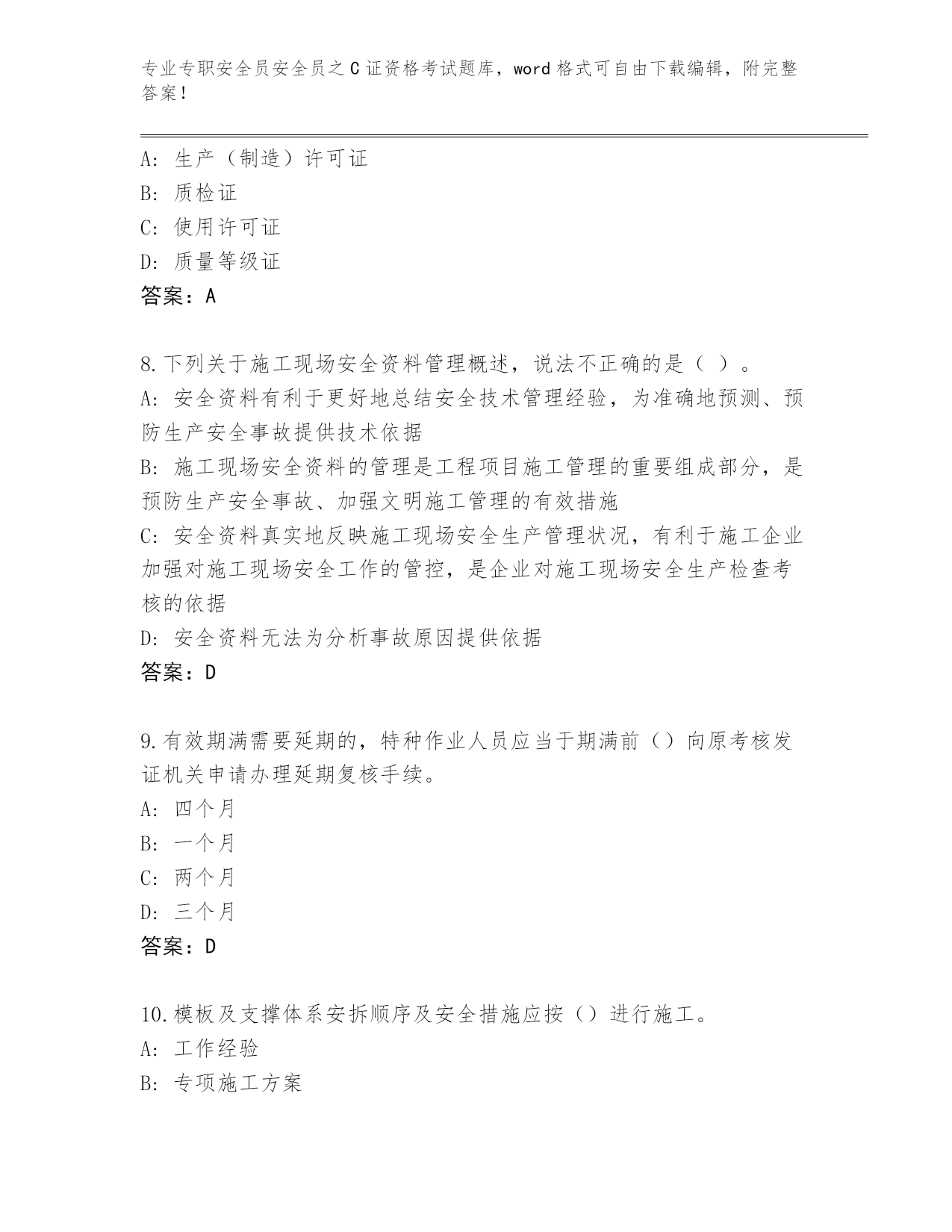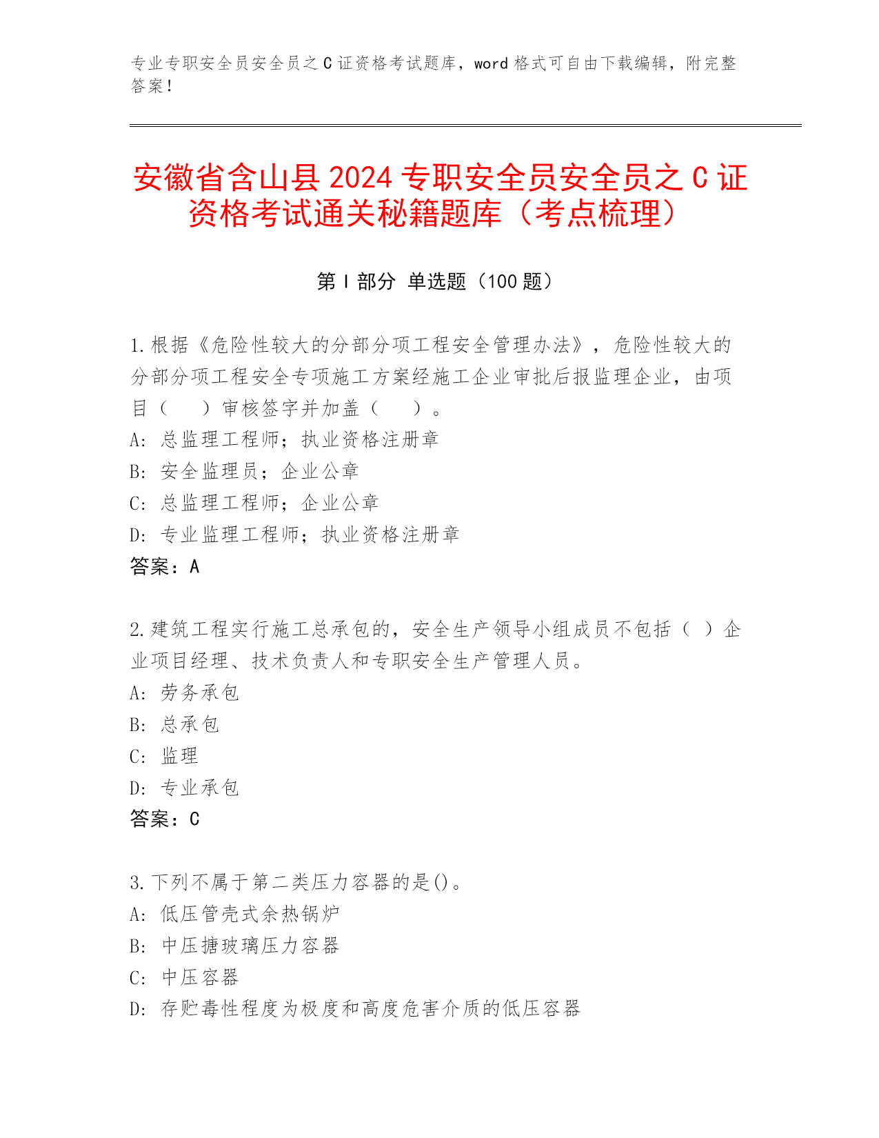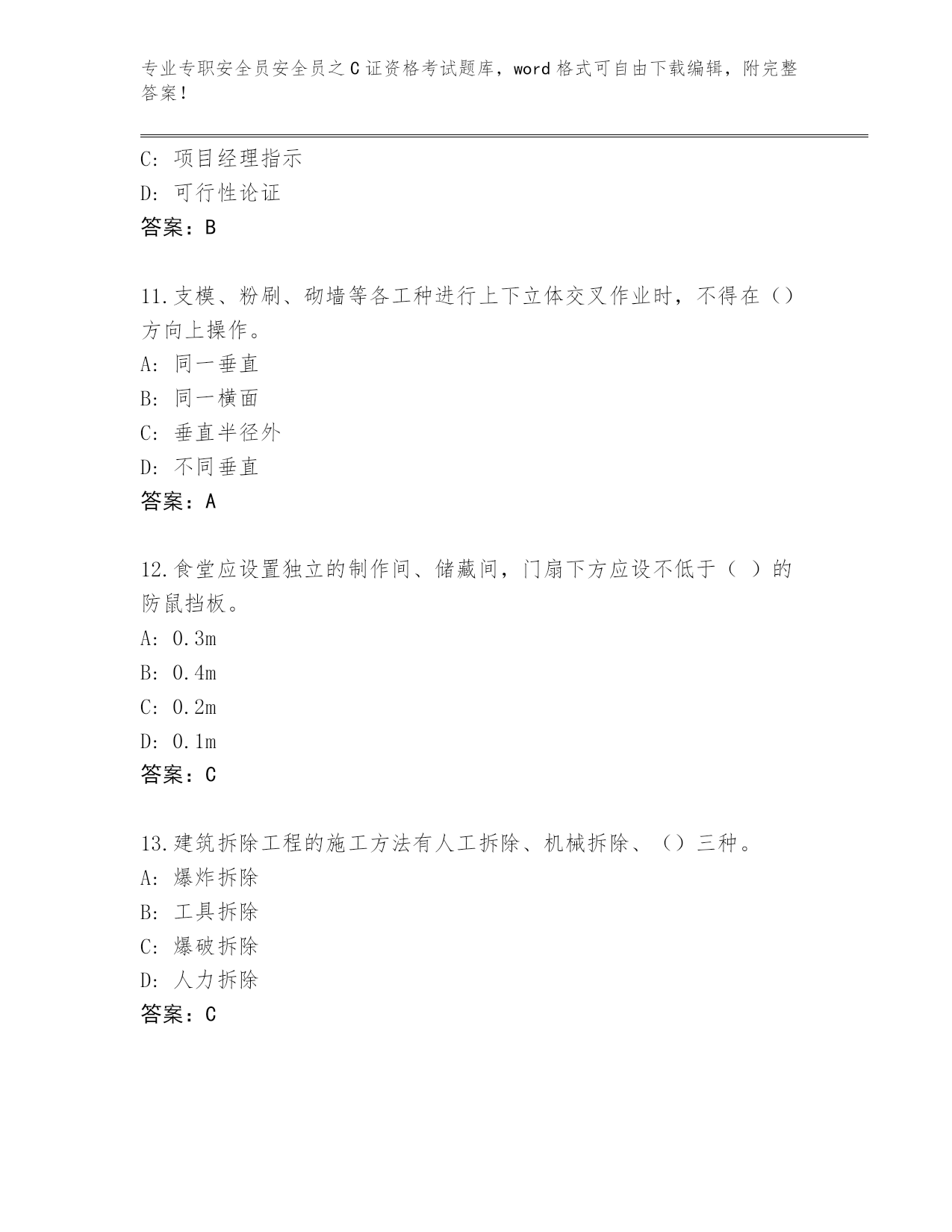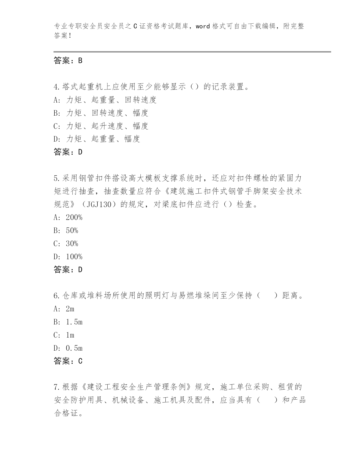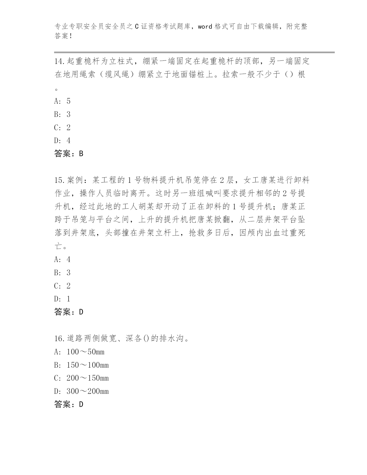 专业专职安全员安全员之C证资格考试题库,word格式可自由下载编辑,附完整答案!安徽省含山县2024专职安全员安全员之C证资格考试通关秘籍题库(考点梳理)第I部分单选题(100题)1.根据《危险性较大的分部分项工程安全管理办法》,危险性较大的分部分项工程安全专项施工方案经施工企业审批后报监理企业,由项目()审核签字并加盖()。A:总监理工程师;执业资格注册章B:安全监理员;企业公章C:总监理工程师;企业公章D:专业监理工程师;执业资格注册章答案:A2.建筑工程实行施工总承包的,安全生产领导小组成员不包括()企业项目经理、技术负责人和专职安全生产管理人员。A:劳务承包B:总承包C:监理D:专业承包答案:C3.下列不属于第二类压力容器的是()。A:低压管壳式余热锅炉B:中压搪玻璃压力容器C:中压容器D:存贮毒性程度为极度和高度危害介质的低压容器答案:B4.塔式起重机上应使用至少能够显示()的记录装置。A:力矩、起重量、回转速度B:力矩、回转速度、幅度C:力矩、起升速度、幅度D:力矩、起重量、幅度答案:D5.采用钢管扣件搭设高大模板支撑系统时,还应对扣件螺栓的紧固力矩进行抽查,抽查数量应符合《建筑施工扣件式钢管手脚架安全技术规范》(JGJ130)的规定,对梁底扣件应进行()检查。A:200%B:50%C:30%D:100%答案:D6.仓库或堆料场所使用的照明灯与易燃堆垛间至少保持()距离。A:2mB:1.5mC:1mD:0.5m答案:C7.根据《建设工程安全生产管理条例》规定,施工单位采购、租赁的安全防护用具、机械设备、施工机具及配件,应当具有()和产品合格证。A:生产(制造)许可证B:质检证C:使用许可证D:质量等级证答案:A8.下列关于施工现场安全资料管理概述,说法不正确的是()。A:安全资料有利于更好地总结安全技术管理经验,为准确地预测、预防生产安全事故提供技术依据B:施工现场安全资料的管理是工程项目施工管理的重要组成部分,是预防生产安全事故、加强文明施工管理的有效措施C:安全资料真实地反映施工现场安全生产管理状况,有利于施工企业加强对施工现场安全工作的管控,是企业对施工现场安全生产检查考核的依据D:安全资料无法为分析事故原因提供依据答案:D9.有效期满需要延期的,特种作业人员应当于期满前()向原考核发证机关申请办理延期复核手续。A:四个月B:一个月C:两个月D:三个月答案:D10.模板及支撑体系安拆顺序及安全措施应按()进行施工。A:工作经验B:专项施工方案C:项目经理指示D:可行性论证答案:B11.支模、粉刷、砌墙等各工种进行上下立体交叉作业时,不得在()方向上操作。A:同一垂直B:同一横面C:垂直半径外D:不同垂直答案:A12.食堂应设置独立的制作间、储藏间,门扇下方应设不低于()的防鼠挡板。A:0.3mB:0.4mC:0.2mD:0.1m答案:C13.建筑拆除工程的施工方法有人工拆除、机械拆除、()三种。A:爆炸拆除B:工具拆除C:爆破拆除D:人力拆除答案:C14.起重桅杆为立柱式,绷紧一端固定在起重桅杆的顶部,另一端固定在地用绳索(缆风绳)绷紧立于地面锚桩上。拉索一般不少于()根。A:5B:3C:2D:4答案:B15.案例:某工程的1号物料提升机吊笼停在2层,女工唐某进行卸料作业,操作人员临时离开。这时另一班组喊叫要求提升相邻的2号提升机,经过此地的工人胡某却开动了正在卸料的1号提升机;唐某正跨于吊笼与平台之间,上升的提升机把唐某掀翻,从二层井架平台坠落到井架底,头部撞在井架立杆上,抢救多日后,因颅内出血过重死亡。A:4B:3C:2D:1答案:D16.道路两侧做宽、深各()的排水沟。A:100~50mmB:150~100mmC:200~150mmD:300~200mm答案:D17.从汽车式起重机约70%以上的翻车事故是因()造成的,因此,在使用汽车起重机时应特别引起重视。A:道路不平B:大风C:无人指挥D:超载或支腿陷落答案:D18.在《工业企业噪声卫生标准》中规定:新建企业、车间的噪声标准不准超过()。A:95dB()B:90dB()C:100dB()D:85dB()答案:D19.室外固定式灯具的安装高度应为()。A:>2.5mB:≥3mC:2mD:2.5m答案:B20.案例:某公司在一工地用吊篮架进行外装修作业时,首层安全网已经拆除,施工员指派一名抹灰工升降吊篮,在用倒链升降时,未挂保险钢丝绳,突然一个倒链急剧下滑,吊篮随即倾斜,使一名工人从吊篮上摔下死亡。A:对于临场的安排抹灰工操作一下升降吊篮没有什么,是施工员统筹考虑现场实际的正确工作布置B:抹灰工对于施工员布置的明显有较大危险而且没有防护设施的工作可以不接受C:施工现场的工作布置由施工员安排,没有违章指挥D:事故责任在于设备,与施工员无关答案:B21.建筑