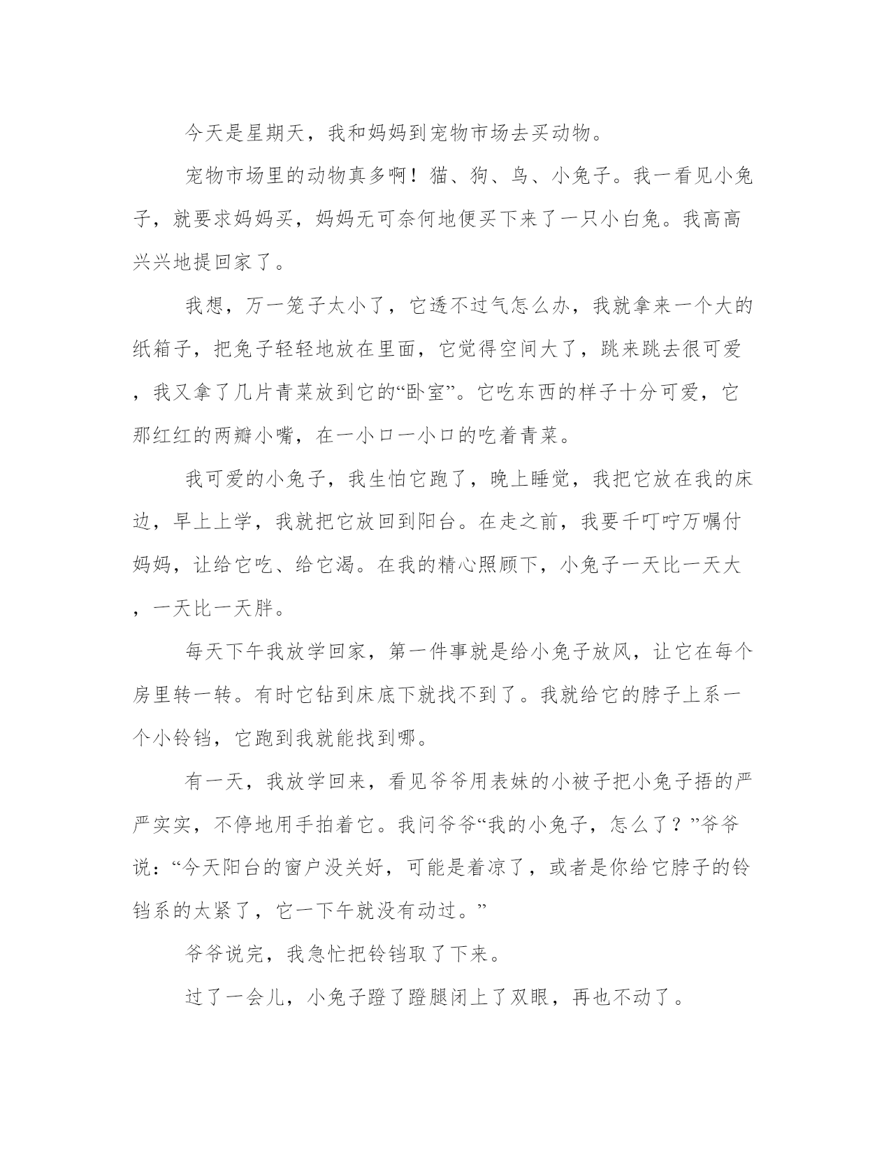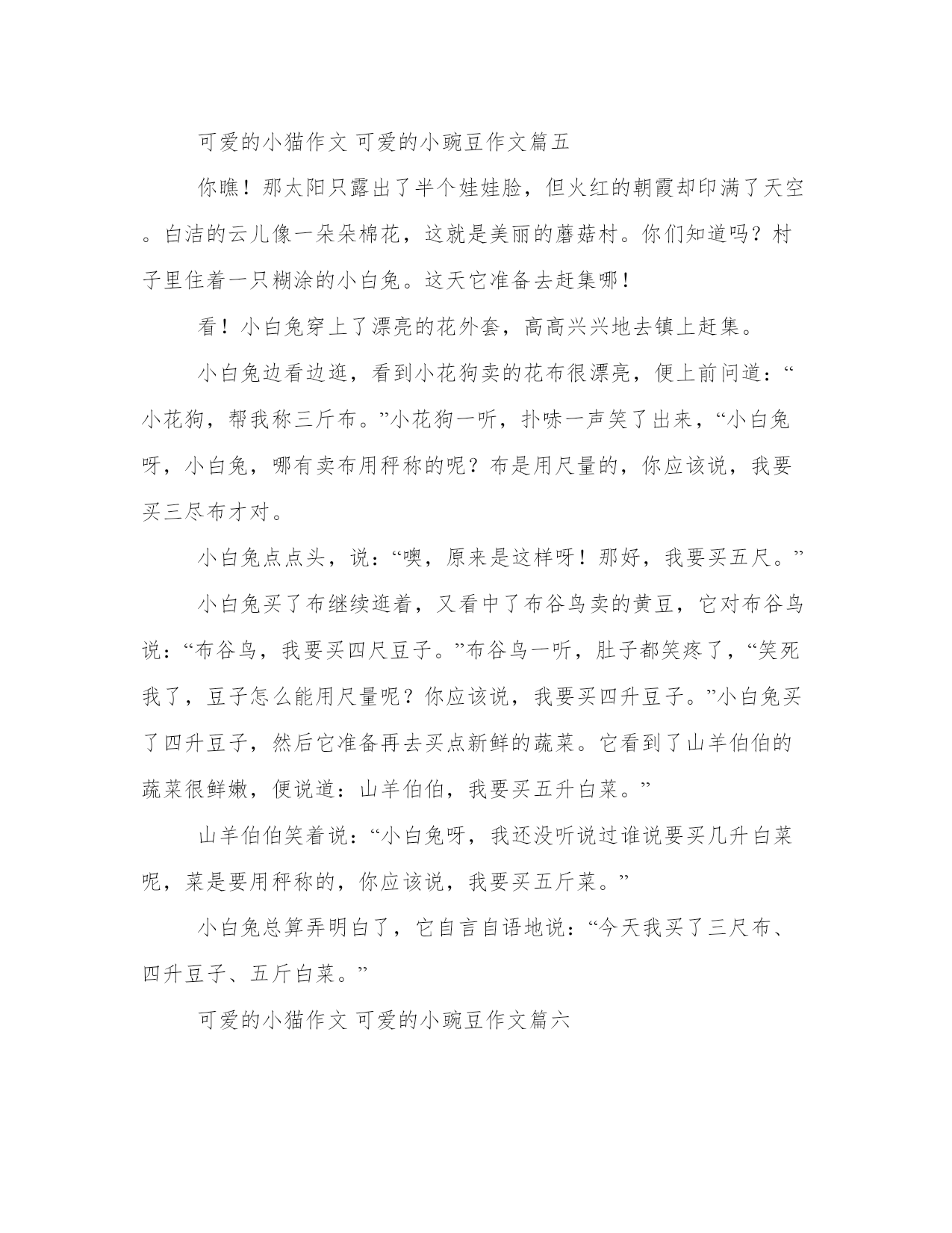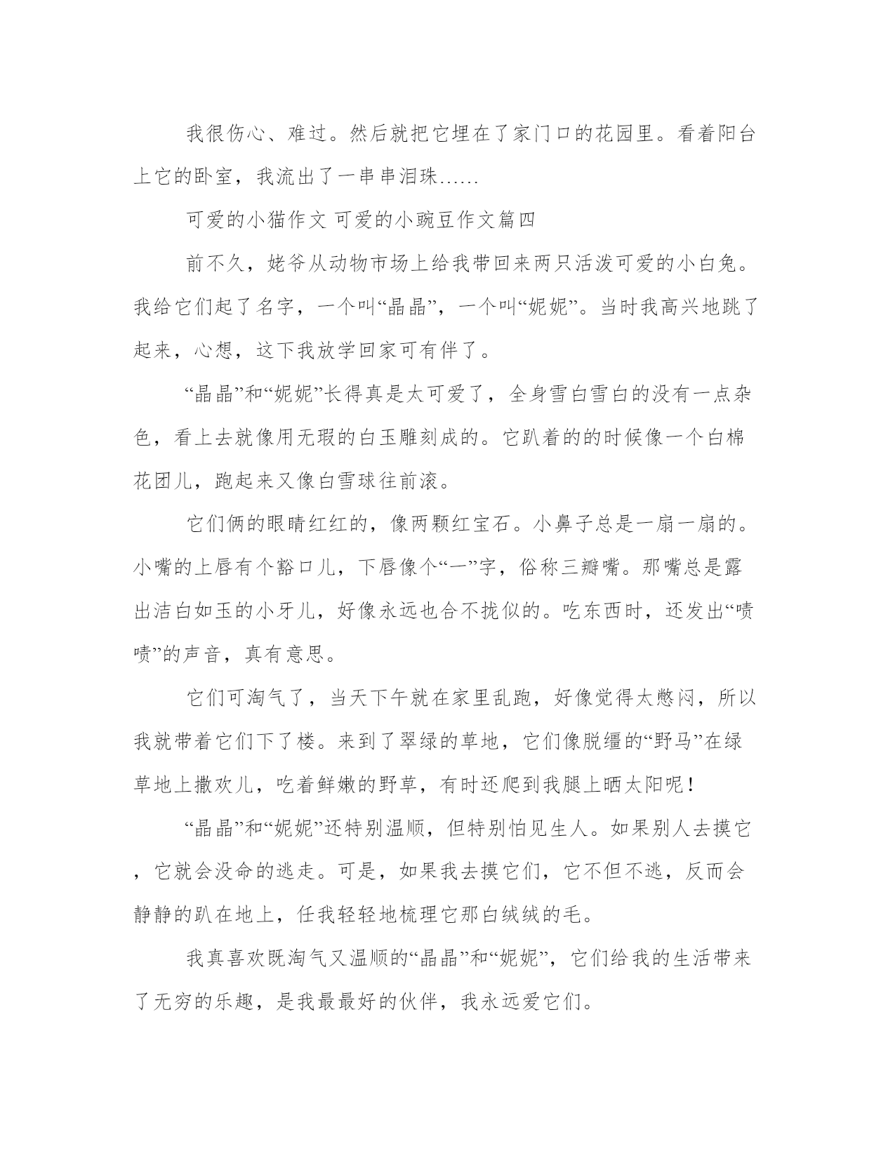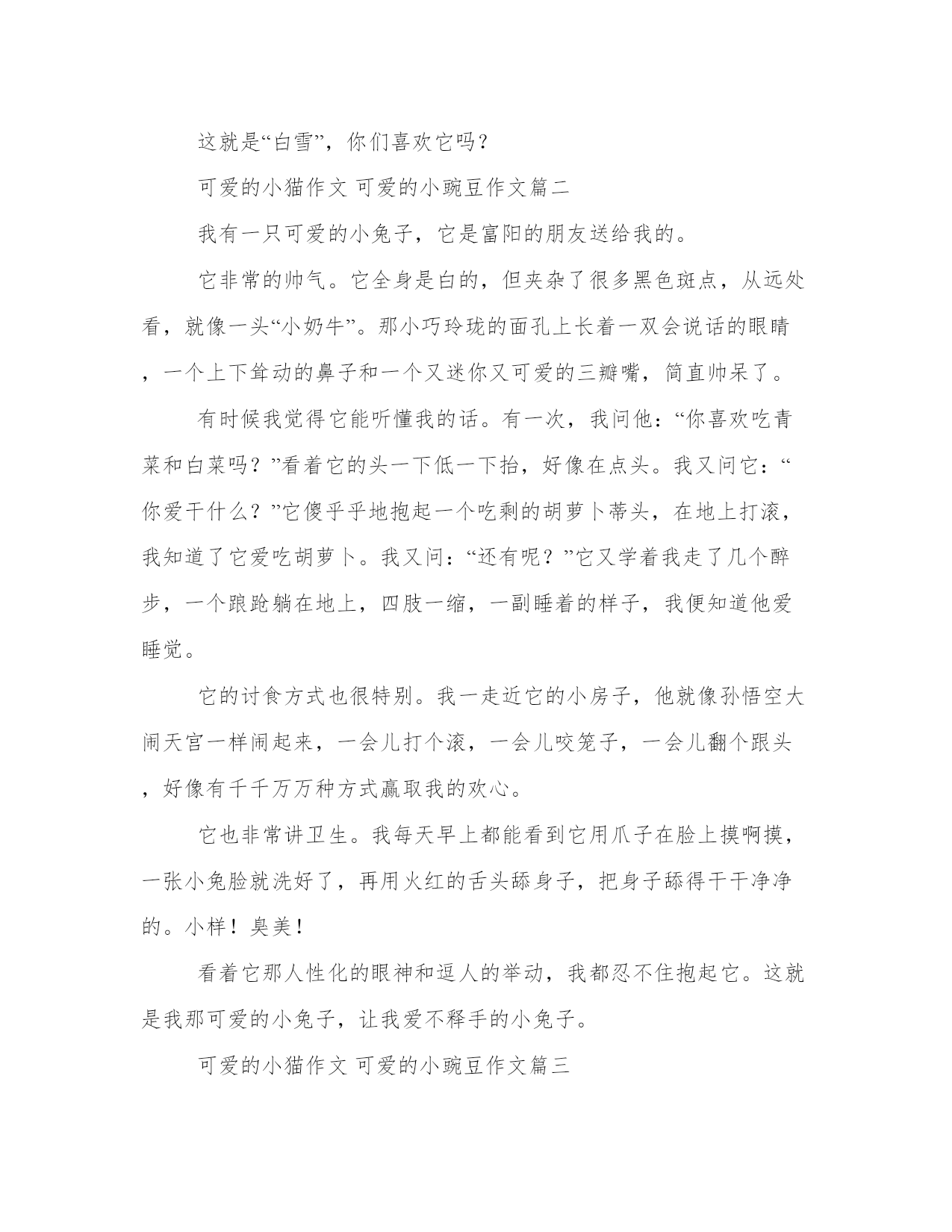 2023年可爱的小猫作文可爱的小豌豆作文精选(二十二篇)人的记忆力会随着岁月的流逝而衰退,写作可以弥补记忆的不足,将曾经的人生经历和感悟记录下来,也便于保存一份美好的回忆。大家想知道怎么样才能写一篇比较优质的范文吗?以下是小编为大家收集的优秀范文,欢迎大家分享阅读。可爱的小猫作文可爱的小豌豆作文篇一“白雪”是个美丽的“女子”。它披着一件“白大衣”,头上竖着两只雪白的长耳朵,像是电视的天线,熬夜多远、多小的声音都能听得到。“白雪”有着两颗红宝石似的大眼睛,小巧玲珑的三瓣嘴,绒球似的短尾巴,真是可爱极了。“白雪”是个“机灵鬼”。有一次,我和妈妈一起出去洗澡,回来之后,发现“白雪”在笼子里上窜下跳,仿佛在说:“小主人,你给我点食物吧!我的肚子饿死了。”我看到它那可爱样,便拿来骨头考考它。看看它聪明不聪明,如果蒙对了,我就奖励它五个胡萝卜。想着想着,我便把骨头放进兔笼,只见“白雪”用眼睛瞄了一下,继续上蹦下跳,仿佛在说:“小主人,你骗我,这不是我爱吃的萝卜,这是狗狗小黑吃的,我不会上当的。”我见它这么聪明,便跑去厨房,拿来五个胡萝卜,“白雪”看见了,一蹦三尺高,然后三下五除二,便把几个萝卜吞下了肚子。“白雪”可贪吃了。它一连吃下四到五个胡萝卜。这就是“白雪”,你们喜欢它吗?可爱的小猫作文可爱的小豌豆作文篇二我有一只可爱的小兔子,它是富阳的朋友送给我的。它非常的帅气。它全身是白的,但夹杂了很多黑色斑点,从远处看,就像一头“小奶牛”。那小巧玲珑的面孔上长着一双会说话的眼睛,一个上下耸动的鼻子和一个又迷你又可爱的三瓣嘴,简直帅呆了。有时候我觉得它能听懂我的话。有一次,我问他:“你喜欢吃青菜和白菜吗?”看着它的头一下低一下抬,好像在点头。我又问它:“你爱干什么?”它傻乎乎地抱起一个吃剩的胡萝卜蒂头,在地上打滚,我知道了它爱吃胡萝卜。我又问:“还有呢?”它又学着我走了几个醉步,一个踉跄躺在地上,四肢一缩,一副睡着的样子,我便知道他爱睡觉。它的讨食方式也很特别。我一走近它的小房子,他就像孙悟空大闹天宫一样闹起来,一会儿打个滚,一会儿咬笼子,一会儿翻个跟头,好像有千千万万种方式赢取我的欢心。它也非常讲卫生。我每天早上都能看到它用爪子在脸上摸啊摸,一张小兔脸就洗好了,再用火红的舌头舔身子,把身子舔得干干净净的。小样!臭美!看着它那人性化的眼神和逗人的举动,我都忍不住抱起它。这就是我那可爱的小兔子,让我爱不释手的小兔子。可爱的小猫作文可爱的小豌豆作文篇三今天是星期天,我和妈妈到宠物市场去买动物。宠物市场里的动物真多啊!猫、狗、鸟、小兔子。我一看见小兔子,就要求妈妈买,妈妈无可奈何地便买下来了一只小白兔。我高高兴兴地提回家了。我想,万一笼子太小了,它透不过气怎么办,我就拿来一个大的纸箱子,把兔子轻轻地放在里面,它觉得空间大了,跳来跳去很可爱,我又拿了几片青菜放到它的“卧室”。它吃东西的样子十分可爱,它那红红的两瓣小嘴,在一小口一小口的吃着青菜。我可爱的小兔子,我生怕它跑了,晚上睡觉,我把它放在我的床边,早上上学,我就把它放回到阳台。在走之前,我要千叮咛万嘱付妈妈,让给它吃、给它渴。在我的精心照顾下,小兔子一天比一天大,一天比一天胖。每天下午我放学回家,第一件事就是给小兔子放风,让它在每个房里转一转。有时它钻到床底下就找不到了。我就给它的脖子上系一个小铃铛,它跑到我就能找到哪。有一天,我放学回来,看见爷爷用表妹的小被子把小兔子捂的严严实实,不停地用手拍着它。我问爷爷“我的小兔子,怎么了?”爷爷说:“今天阳台的窗户没关好,可能是着凉了,或者是你给它脖子的铃铛系的太紧了,它一下午就没有动过。”爷爷说完,我急忙把铃铛取了下来。过了一会儿,小兔子蹬了蹬腿闭上了双眼,再也不动了。我很伤心、难过。然后就把它埋在了家门口的花园里。看着阳台上它的卧室,我流出了一串串泪珠……可爱的小猫作文可爱的小豌豆作文篇四前不久,姥爷从动物市场上给我带回来两只活泼可爱的小白兔。我给它们起了名字,一个叫“晶晶”,一个叫“妮妮”。当时我高兴地跳了起来,心想,这下我放学回家可有伴了。“晶晶”和“妮妮”长得真是太可爱了,全身雪白雪白的没有一点杂色,看上去就像用无瑕的白玉雕刻成的。它趴着的的时候像一个白棉花团儿,跑起来又像白雪球往前滚。它们俩的眼睛红红的,像两颗红宝石。小鼻子总是一扇一扇的。小嘴的上唇有个豁口儿,下唇像个“一”字,俗称三瓣嘴。那嘴总是露出洁白如玉的小牙儿,好像永远也合不拢似的。吃东西时,还发出“啧啧”的声音,真有意思。它们可淘气了,当天下午就在家里乱跑,好像觉得太憋闷,所以我就带着它们下了楼。来到了翠绿的草地,它们像脱缰的“野马”在绿草地上撒欢儿,吃着鲜嫩的野草,有时还爬到我腿上晒太阳呢!“晶晶”和“妮妮”还特别温顺,但特别怕见生人。如果别人去摸它,它就会没命的逃走。可是,如果我去