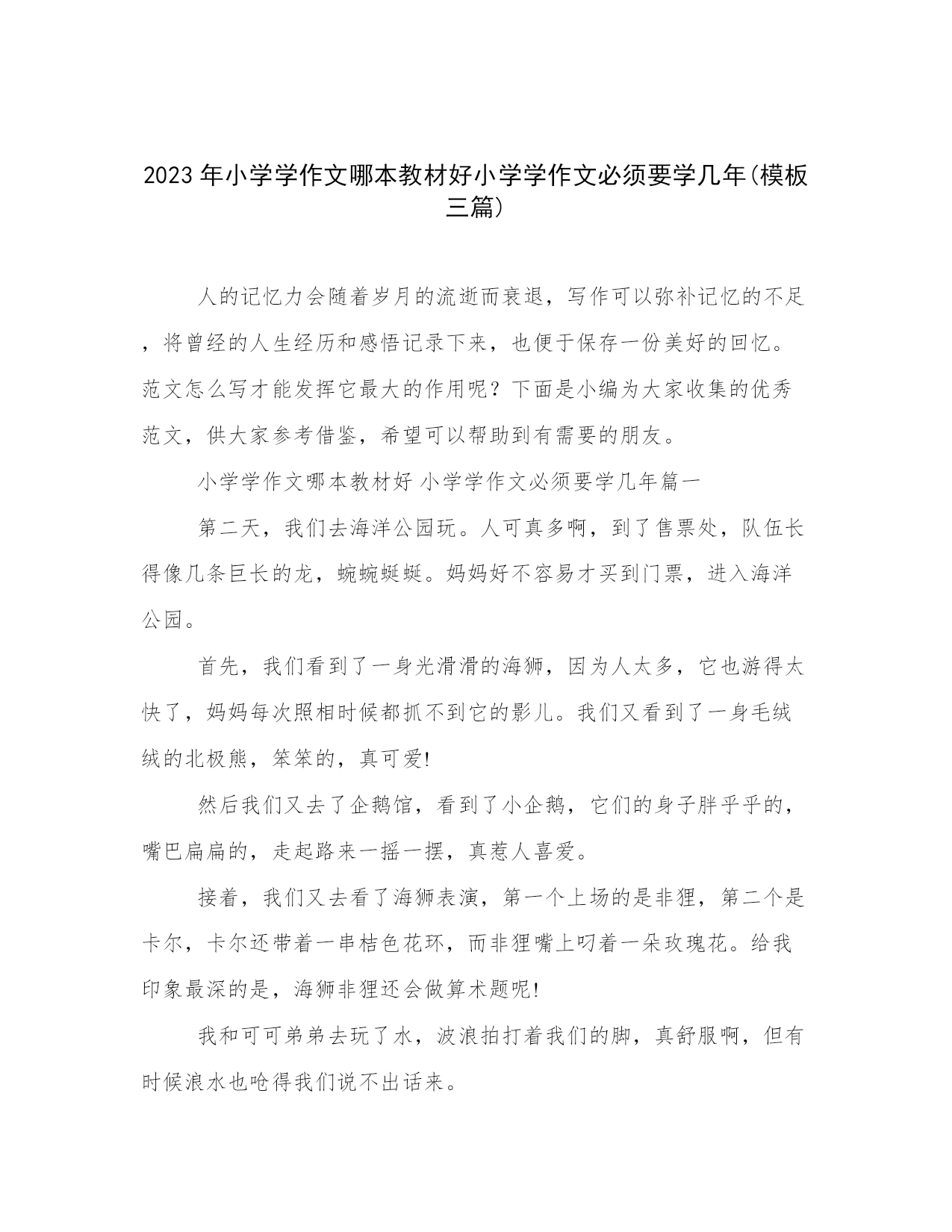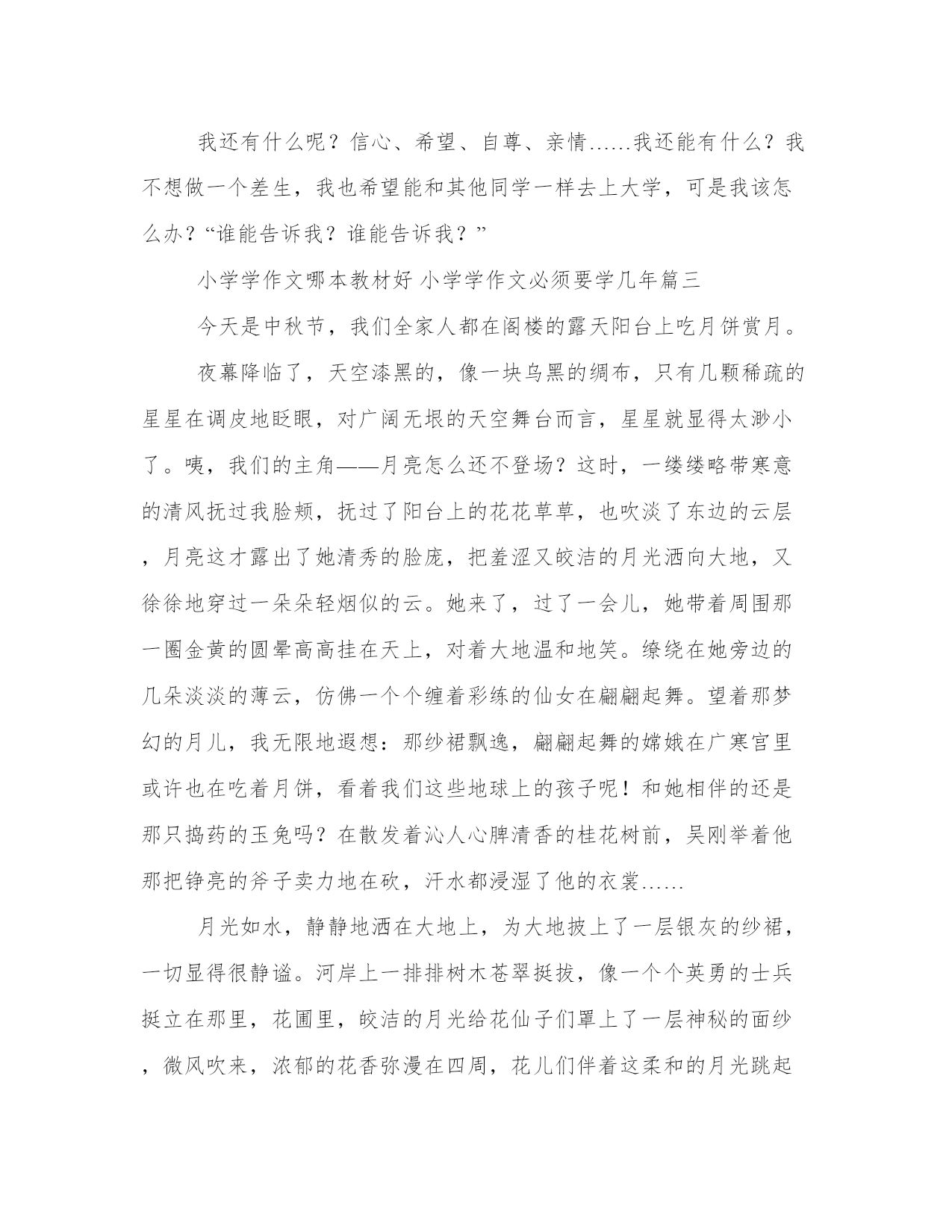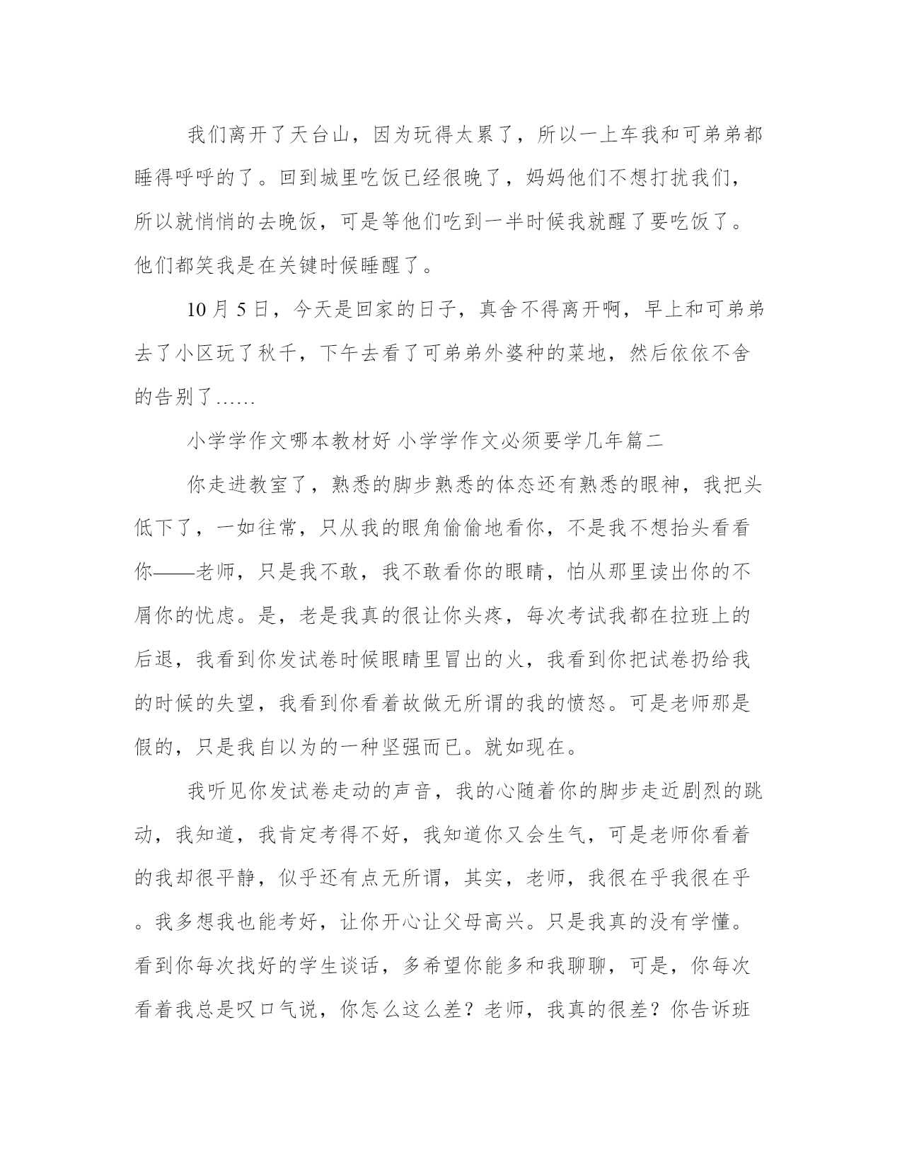 2023年小学学作文哪本教材好小学学作文必须要学几年(模板三篇)人的记忆力会随着岁月的流逝而衰退,写作可以弥补记忆的不足,将曾经的人生经历和感悟记录下来,也便于保存一份美好的回忆。范文怎么写才能发挥它最大的作用呢?下面是小编为大家收集的优秀范文,供大家参考借鉴,希望可以帮助到有需要的朋友。小学学作文哪本教材好小学学作文必须要学几年篇一第二天,我们去海洋公园玩。人可真多啊,到了售票处,队伍长得像几条巨长的龙,蜿蜿蜒蜒。妈妈好不容易才买到门票,进入海洋公园。首先,我们看到了一身光滑滑的海狮,因为人太多,它也游得太快了,妈妈每次照相时候都抓不到它的影儿。我们又看到了一身毛绒绒的北极熊,笨笨的,真可爱!然后我们又去了企鹅馆,看到了小企鹅,它们的身子胖乎乎的,嘴巴扁扁的,走起路来一摇一摆,真惹人喜爱。接着,我们又去看了海狮表演,第一个上场的是非狸,第二个是卡尔,卡尔还带着一串桔色花环,而非狸嘴上叼着一朵玫瑰花。给我印象最深的是,海狮非狸还会做算术题呢!我和可可弟弟去玩了水,波浪拍打着我们的脚,真舒服啊,但有时候浪水也呛得我们说不出话来。不知过了多久,我们去了鲨鱼馆,看到了长着尖尖牙齿的鲨鱼,饿了还吃小鱼呢。我们还看到了可以发电的电毡,看到了保护动物:中华鲟,还见到了百年长寿的海龟呢!我们快快乐乐的渡过了这一天。10月3日,我们去坐了地铁,第一次坐,有些兴奋。地铁长长的,外面有一层玻璃,真漂亮。地铁里面的人好多啊,不过比公交车快多了。接着我和可可弟弟还参观了科技馆,看了飞机模型呢!下午,我们又去了塔子山公园玩,印象最深的是攀岩。妈呀,怎么这样高呀!第一次顺利过关,第二次,跌了下去,但我心里面说:试一试,准能行!旁边的可可弟弟也说:“紫仪,加油,经给你一点信心!”我也不断的给自己加油,第二次,终于爬上顶。我们又去坐了星际飞船,我和可可弟弟觉得太好玩了,一口气就坐了四次。10月4日,我们去了天台山玩水。我们先去长虹瀑布玩,水清清的,踩着石头冰凉冰凉。因为石头上有青苔,所以我们都小心翼翼的走着。我们还去了响水滩瀑布,我一不小心,就摔到了水里,成了泥娃娃,把舅妈可可弟弟惹得捂着肚子哈哈大笑。我们边登山边玩。我和可弟弟看到位了真正的瀑布:盘龙瀑布。盘龙瀑布的水哗啦啦的直往下泻,好像一个小娃娃在唱歌呢!我不禁想起了李白的一首诗:“飞流直下三千尺,疑是银河落九天。”我们离开了天台山,因为玩得太累了,所以一上车我和可弟弟都睡得呼呼的了。回到城里吃饭已经很晚了,妈妈他们不想打扰我们,所以就悄悄的去晚饭,可是等他们吃到一半时候我就醒了要吃饭了。他们都笑我是在关键时候睡醒了。10月5日,今天是回家的日子,真舍不得离开啊,早上和可弟弟去了小区玩了秋千,下午去看了可弟弟外婆种的菜地,然后依依不舍的告别了……小学学作文哪本教材好小学学作文必须要学几年篇二你走进教室了,熟悉的脚步熟悉的体态还有熟悉的眼神,我把头低下了,一如往常,只从我的眼角偷偷地看你,不是我不想抬头看看你——老师,只是我不敢,我不敢看你的眼睛,怕从那里读出你的不屑你的忧虑。是,老是我真的很让你头疼,每次考试我都在拉班上的后退,我看到你发试卷时候眼睛里冒出的火,我看到你把试卷扔给我的时候的失望,我看到你看着故做无所谓的我的愤怒。可是老师那是假的,只是我自以为的一种坚强而已。就如现在。我听见你发试卷走动的声音,我的心随着你的脚步走近剧烈的跳动,我知道,我肯定考得不好,我知道你又会生气,可是老师你看着的我却很平静,似乎还有点无所谓,其实,老师,我很在乎我很在乎。我多想我也能考好,让你开心让父母高兴。只是我真的没有学懂。看到你每次找好的学生谈话,多希望你能多和我聊聊,可是,你每次看着我总是叹口气说,你怎么这么差?老师,我真的很差?你告诉班里的同学说,成绩好能考个好大学,成绩不好,只能回家找工作,每次说到这里你总会看着我,哎,老师,我真的没有希望了?看看窗外,小鸟多么快乐地在歌唱,他们在树枝间自由地跳跃,他们不要担心学习,我好羡慕啊!“同学,你又发呆了”我听到了你严厉的声音,我把头埋下了,你会怎样来处理我,你会通知我的家长吗?父亲的拳头是不是又会伴着母亲的啜泣声再次落到我的身上。哦老师,求求你,我不敢了,只是你不要告诉我的父母,我已经让他们丢尽了脸了,我不想他们再到学校里来了。你的办公室里每个人都认识我,因为我的成绩差,常是你指责的对象,班上的同学们都认识我的父母,因为他们常被你叫到学校里来,告诉他们我的成绩不好。多么让人羞耻啊!我走在校园里,我在去厕所的路上,我都似乎都能感觉到别人嘲笑的目光,象一根根针刺在我的脊梁上,痛着、无奈着。老师,你为我和别人打架生气,可是老师,不是我愿意打架,我也知道我不应该打架,只是,我不想让他们总是在背后笑我,只是我想告诉他们,其实我也有比他们强的一方面。我可以把他们打哭了,让他