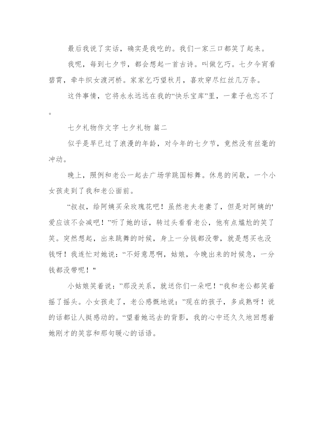 2023年七夕礼物作文字七夕礼物模板每个人都曾试图在平淡的学习、工作和生活中写一篇文章。写作是培养人的观察、联想、想象、思维和记忆的重要手段。范文书写有哪些要求呢?我们怎样才能写好一篇范文呢?下面是小编为大家收集的优秀范文,供大家参考借鉴,希望可以帮助到有需要的朋友。七夕礼物作文字七夕礼物篇一我的老爸知道就要过七夕节了。早就买了巧克力、玫瑰花、彩灯,和一对漂亮的“相恋”小熊。那天我笑着说:“老爸,像你这种直男,还会送这么浪漫的礼物。”老爸的手挠着后脑勺,不好意思的笑了。在七夕节,老妈总是会加班。我和老爸在布置着家里,弄得像过生日似的。二十分钟左右吧,我听到了高跟鞋的声音。这时,我的心里像有一只调皮可爱的小兔子,他抱住我的心脏,蹦的可快了。因为那时候家里没开灯。老爸让我去开灯,在这关键时候我生怕出什么差错。一会儿门开了,我一看门开了赶紧开灯,而爸爸就在一旁吹着喇叭,这时,妈妈掏出来了一盒巧克力,我高兴的抱住了妈妈。妈妈笑着对我说:“我的小情人儿你这么贴心,当然要送给你礼物了!”妈妈打开了爸爸送的礼物,很开心。可是里面怎么少了三块巧克力?妈妈一想对我说:“我的小情人儿,是不是你给偷吃了?”我实在是忍不住了,我的嘴像爆炸了一样一直在笑,笑个不停。最后我说了实话,确实是我吃的。我们一家三口都笑了起来。我呢,每到七夕节,都会想起一首古诗。叫做乞巧。七夕今宵看碧霄,牵牛织女渡河桥。家家乞巧望秋月,喜欢穿尽红丝几万条。这件事情,它将永永远远在我的“快乐宝库”里,一辈子也忘不了。七夕礼物作文字七夕礼物篇二似乎是早已过了浪漫的年龄,对今年的七夕节,竟然没有丝毫的冲动。晚上,照例和老公一起去广场学跳国标舞。休息的间歇,一个小女孩走到了我和老公面前。“叔叔,给阿姨买朵玫瑰花吧!虽然老夫老妻了,但是对阿姨的'爱应该不会减吧!”听了她的话,转过头看看老公,他有点尴尬的笑了笑。突然想起,出来跳舞的时候,身上一分钱都没带,就是想买也没钱呀!我连忙对她说:“不好意思啊,姑娘,今晚出来的时候急,一分钱都没带呢!"小姑娘笑着说:”那没关系,就送你们一朵吧!“我和老公都笑着摇了摇头。小女孩走了,老公感慨地说:”现在的孩子,多成熟呀!说的话都让人挺感动的。“望着她远去的背影,我的心中还久久地回想着她刚才的笑容和那句暖心的话语。这时候,教练走了过来,说道:”没拿钱怕啥么,先把花拿着!人家孩子都说了送给你,不如先拿着送给老婆么,问人家女孩要个电话,或者约好明晚在这给钱么,还能让人家把花拿走呀!”是呀,人家小女孩的心都那么宽的,反而是自己有点小气了。后悔之余,留下的竟然是久久地感动。