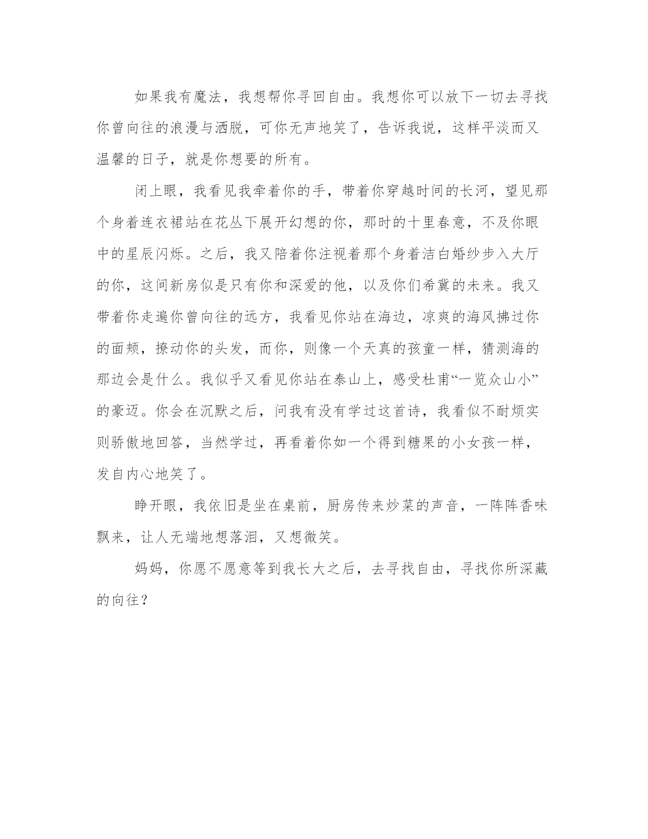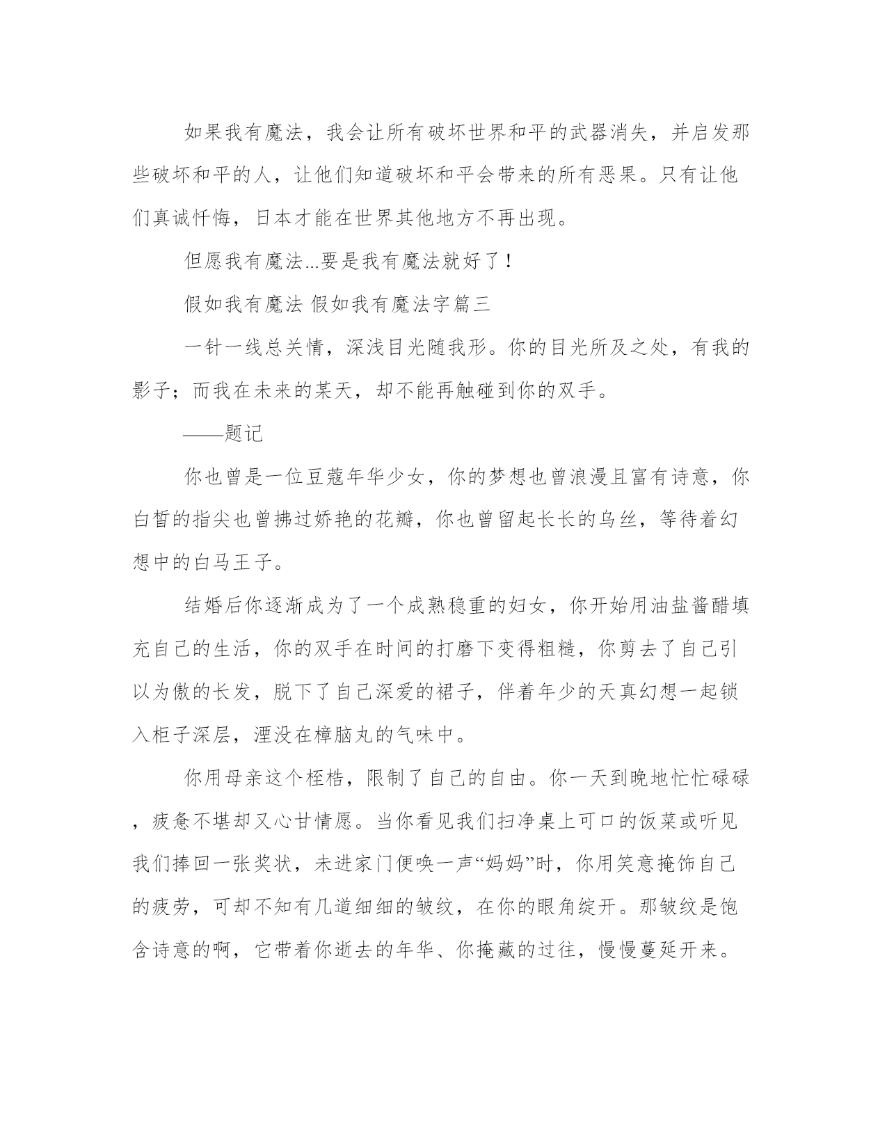 最新假如我有魔法假如我有魔法字(汇总三篇)在日常的学习、工作、生活中,肯定对各类范文都很熟悉吧。范文怎么写才能发挥它最大的作用呢?下面我给大家整理了一些优秀范文,希望能够帮助到大家,我们一起来看一看吧。假如我有魔法假如我有魔法字篇一如果我有魔法,我会将天天工作很忙的妈妈从这上面拉出来,帮她很快做好工作。让妈妈像小时候一样和我一起玩耍。如果我魔法,我会让那讨厌的手机下岗。把我真正的妈妈还回来,那样我就可以和妈妈一直兴高采烈的玩了。如果我有魔法,我就可以让我爸爸的病少一点。不要像那次秋天一样突然呕吐,妈妈还拿着洗衣服的盆接着了。可能是因为我学习不好好的,让爸爸生气才这样的吧。我可真是对不起爸爸了。唉,我们都为爸爸担心。当然,如果我有魔法,我希望能让爸爸少吵我一些。如果他还要吵我,我就用我的魔法,让爸爸立马变得和颜悦色的跟我讲话,我也就更高兴了。如果我有魔法了,我会将所有的功课都变得不再难,做题时有更好的方法,思路更巧妙,让所有的作业都变得没有了,每次考试都能考100分。如果我不学会变得不聪明,就什么也不知道了。所以我要让全世界的人把他们的知识,都贮存到人们的脑中,这样人人都会变得更聪明,就有更多的发明了,我们也就有更多好用的东西。我希望这些都能梦想成真。假如我有魔法假如我有魔法字篇二学生们,如果你有魔法,你会怎么做?如果我有魔法...如果我有魔法,我会回到汶川地震那天,提醒每个人为地震做好准备。给他们一个永远不会崩溃的魔法。这样,他们既不会有伤亡,也不会无家可归。如果我有魔法,我会飞到沙漠。产出大量的草和树,然后产出一些机器人,命令他们把所有的树和草种好。最后,我将飞往东海,请求龙王经常去沙漠给树木和草浇水,这样沙漠就不会被遗弃。如果我有魔法,我会生产许多药物,这些药物可以使盲人重见光明,并且可以像小壁虎的尾巴一样长出新的断肢臂或腿。如果可能的话,残疾人将不再受到歧视,世界上所有的人都将处于平等的地位。如果我有魔法,我会做污水净化器。然后安装在工厂的废水排放管上。世界上将不再有河流漂浮着大量的垃圾。看到死鱼。如果我有魔法,我一定会把电脑游戏中加速植物生长的肥料变成现实。这样,即使伐木工随意砍伐树木,它们也会迅速成长,生物链不会被破坏,环境也会更加美丽!如果我有魔法,我会让所有破坏世界和平的武器消失,并启发那些破坏和平的人,让他们知道破坏和平会带来的所有恶果。只有让他们真诚忏悔,日本才能在世界其他地方不再出现。但愿我有魔法...要是我有魔法就好了!假如我有魔法假如我有魔法字篇三一针一线总关情,深浅目光随我形。你的目光所及之处,有我的影子;而我在未来的某天,却不能再触碰到你的双手。——题记你也曾是一位豆蔻年华少女,你的梦想也曾浪漫且富有诗意,你白皙的指尖也曾拂过娇艳的花瓣,你也曾留起长长的乌丝,等待着幻想中的白马王子。结婚后你逐渐成为了一个成熟稳重的妇女,你开始用油盐酱醋填充自己的生活,你的双手在时间的打磨下变得粗糙,你剪去了自己引以为傲的长发,脱下了自己深爱的裙子,伴着年少的天真幻想一起锁入柜子深层,湮没在樟脑丸的气味中。你用母亲这个桎梏,限制了自己的自由。你一天到晚地忙忙碌碌,疲惫不堪却又心甘情愿。当你看见我们扫净桌上可口的饭菜或听见我们捧回一张奖状,未进家门便唤一声“妈妈”时,你用笑意掩饰自己的疲劳,可却不知有几道细细的皱纹,在你的眼角绽开。那皱纹是饱含诗意的啊,它带着你逝去的年华、你掩藏的过往,慢慢蔓延开来。如果我有魔法,我想帮你寻回自由。我想你可以放下一切去寻找你曾向往的浪漫与洒脱,可你无声地笑了,告诉我说,这样平淡而又温馨的日子,就是你想要的所有。闭上眼,我看见我牵着你的手,带着你穿越时间的长河,望见那个身着连衣裙站在花丛下展开幻想的你,那时的十里春意,不及你眼中的星辰闪烁。之后,我又陪着你注视着那个身着洁白婚纱步入大厅的你,这间新房似是只有你和深爱的他,以及你们希冀的未来。我又带着你走遍你曾向往的远方,我看见你站在海边,凉爽的海风拂过你的面颊,撩动你的头发,而你,则像一个天真的孩童一样,猜测海的那边会是什么。我似乎又看见你站在泰山上,感受杜甫“一览众山小”的豪迈。你会在沉默之后,问我有没有学过这首诗,我看似不耐烦实则骄傲地回答,当然学过,再看着你如一个得到糖果的小女孩一样,发自内心地笑了。睁开眼,我依旧是坐在桌前,厨房传来炒菜的声音,一阵阵香味飘来,让人无端地想落泪,又想微笑。妈妈,你愿不愿意等到我长大之后,去寻找自由,寻找你所深藏的向往?