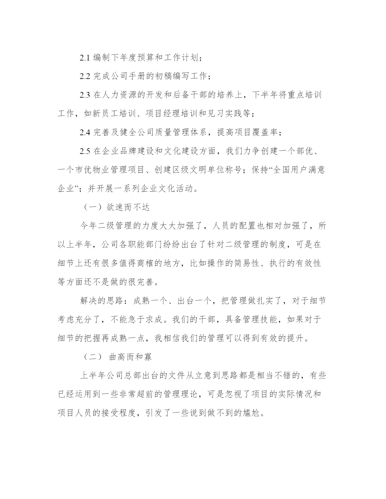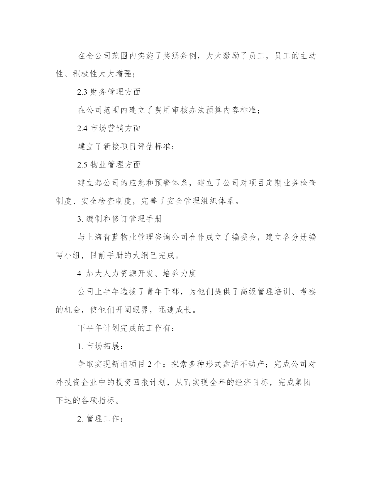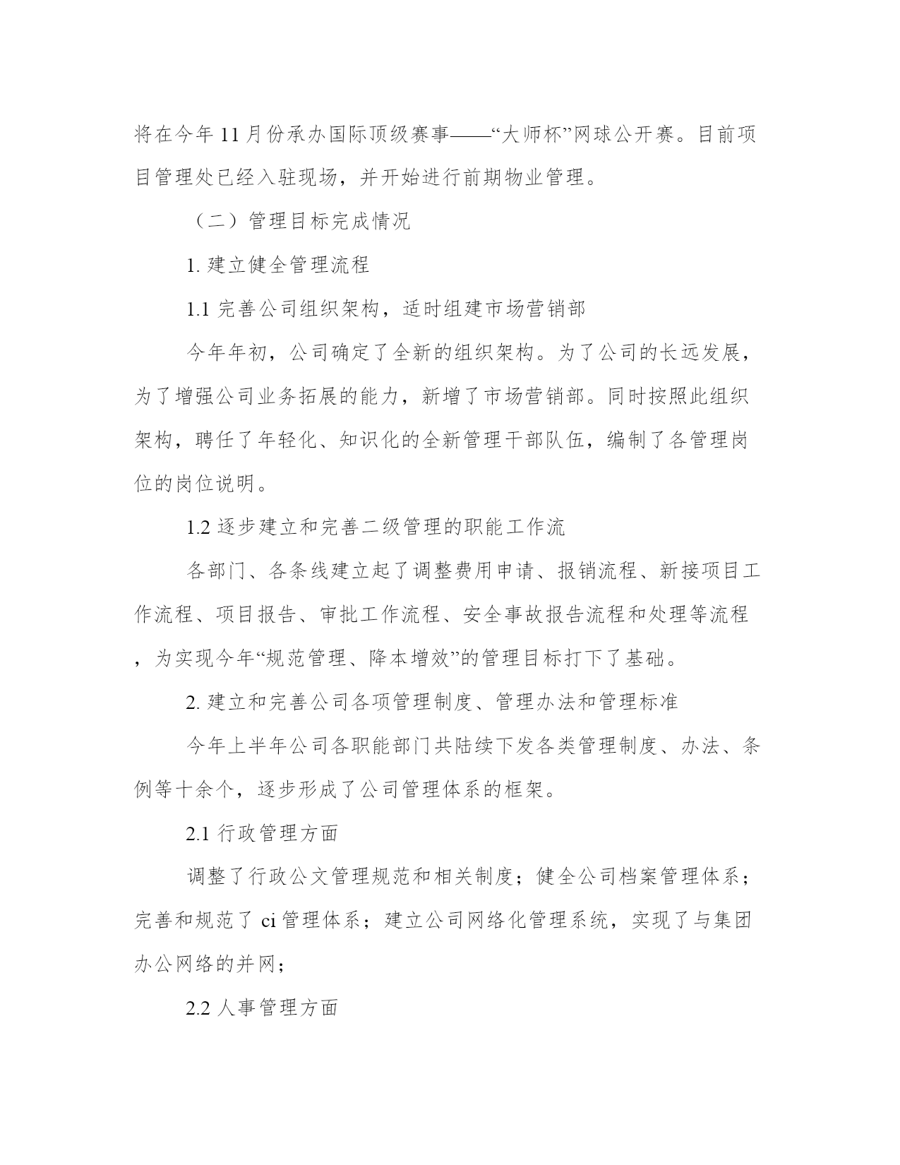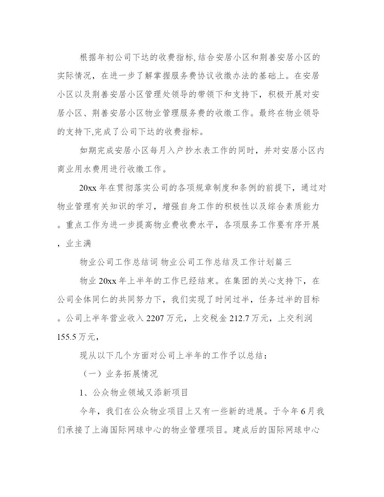 物业公司工作总结词物业公司工作总结及工作计划实用(四篇)制定计划前,要分析分析工作现状,充分了解下一步工作是在什么基础上进行的,是依据什么来制定这个计划的。我们该怎么拟定计划呢?下面是小编带来的优秀计划范文,希望大家能够喜欢!物业公司工作总结词物业公司工作总结及工作计划篇一回顾一年来的客服工作,有得有失。现将一年来的客服工作总结如下:在20xx年初进入安居小区时,我初次接触物业管理工作,对物业工作人员的职责任务不甚了解,为了能够尽快适应新的工作岗位和工作环境,我自觉加强学习,虚心求教释惑,不断理清工作思路,总结工作方法。一方面,在干中学、学中干,不断掌握工作方法,积累工作经验。在安居小区实际工作中,我注重以工作任务为牵引,依托工作岗位学习提高工作能力,通过观察、摸索和实践锻炼,通过在xx小区的一线进行收费等工作的锻炼使我能够较快地进入了实际工作中,为我在下半年在xx小区工作的开展打下了良好的基础。另一方面,自己通过问书本、问同事,不断丰富物业知识,掌握工作实际工作技巧。在各级领导和同事的帮助指导下,从不会到会,从不熟悉到熟悉,我逐渐摸清了工作中的基本情况,找到了切入点,把握住了工作重点和难点。根据年初公司下达的收费指标,结合安居小区和荆善安居小区的实际情况,在进一步了解掌握服务费协议收缴办法的基础上。在安居小区以及荆善安居小区管理处领导的带领下和支持下,积极开展对安居小区、荆善安居小区物业管理服务费的收缴工作。最终在物业领导的支持下,完成了公司下达的收费指标。如期完成安居小区每月入户抄水表工作的同时,并对安居小区内商业用水费用进行收缴工作。20xx年在贯彻落实公司的各项规章制度和条例的前提下,通过对物业管理有关知识的学习,增强自身工作的积极性以及综合素质能力。重点工作为进一步提高物业费收费水平,各项服务工作要有序开展,业主满物业公司工作总结词物业公司工作总结及工作计划篇三物业20xx年上半年的工作已经结束。在集团的关心支持下,在公司全体同仁的共同努力下,我们实现了时间过半,任务过半的目标。公司上半年营业收入2207万元,上交税金212.7万元,上交利润155.5万元,现从以下几个方面对公司上半年的工作予以总结:(一)业务拓展情况1、公众物业领域又添新项目今年,我们在公众物业项目上又有一些新的进展。于今年6月我们承接了上海国际网球中心的物业管理项目。建成后的国际网球中心将在今年11月份承办国际顶级赛事——“大师杯”网球公开赛。目前项目管理处已经入驻现场,并开始进行前期物业管理。(二)管理目标完成情况1.建立健全管理流程1.1完善公司组织架构,适时组建市场营销部今年年初,公司确定了全新的组织架构。为了公司的长远发展,为了增强公司业务拓展的能力,新增了市场营销部。同时按照此组织架构,聘任了年轻化、知识化的全新管理干部队伍,编制了各管理岗位的岗位说明。1.2逐步建立和完善二级管理的职能工作流各部门、各条线建立起了调整费用申请、报销流程、新接项目工作流程、项目报告、审批工作流程、安全事故报告流程和处理等流程,为实现今年“规范管理、降本增效”的管理目标打下了基础。2.建立和完善公司各项管理制度、管理办法和管理标准今年上半年公司各职能部门共陆续下发各类管理制度、办法、条例等十余个,逐步形成了公司管理体系的框架。2.1行政管理方面调整了行政公文管理规范和相关制度;健全公司档案管理体系;完善和规范了ci管理体系;建立公司网络化管理系统,实现了与集团办公网络的并网;2.2人事管理方面在全公司范围内实施了奖惩条例,大大激励了员工,员工的主动性、积极性大大增强;2.3财务管理方面在公司范围内建立了费用审核办法预算内容标准;2.4市场营销方面建立了新接项目评估标准;2.5物业管理方面建立起公司的应急和预警体系,建立了公司对项目定期业务检查制度、安全检查制度,完善了安全管理组织体系。3.编制和修订管理手册与上海青蓝物业管理咨询公司合作成立了编委会,建立各分册编写小组,目前手册的大纲已完成。4.加大人力资源开发、培养力度公司上半年选拔了青年干部,为他们提供了高级管理培训、考察的机会,使他们开阔眼界,迅速成长。下半年计划完成的工作有:1.市场拓展:争取实现新增项目2个;探索多种形式盘活不动产;完成公司对外投资企业中的投资回报计划,从而实现全年的经济目标,完成集团下达的各项指标。2.管理工作:2.1编制下年度预算和工作计划;2.2完成公司手册的初稿编写工作;2.3在人力资源的开发和后备干部的培养上,下半年将重点培训工作,如新员工培训、项目经理培训和见习实践等;2.4完善及健全公司质量管理体系,提高项目覆盖率;2.5在企业品牌建设和文化建设方面,我们力争创建一个部优、一个市优物业管理项目、创建区级文明单位称号;保持“全国用户满意企业”;并开展一系列企业文化活动。