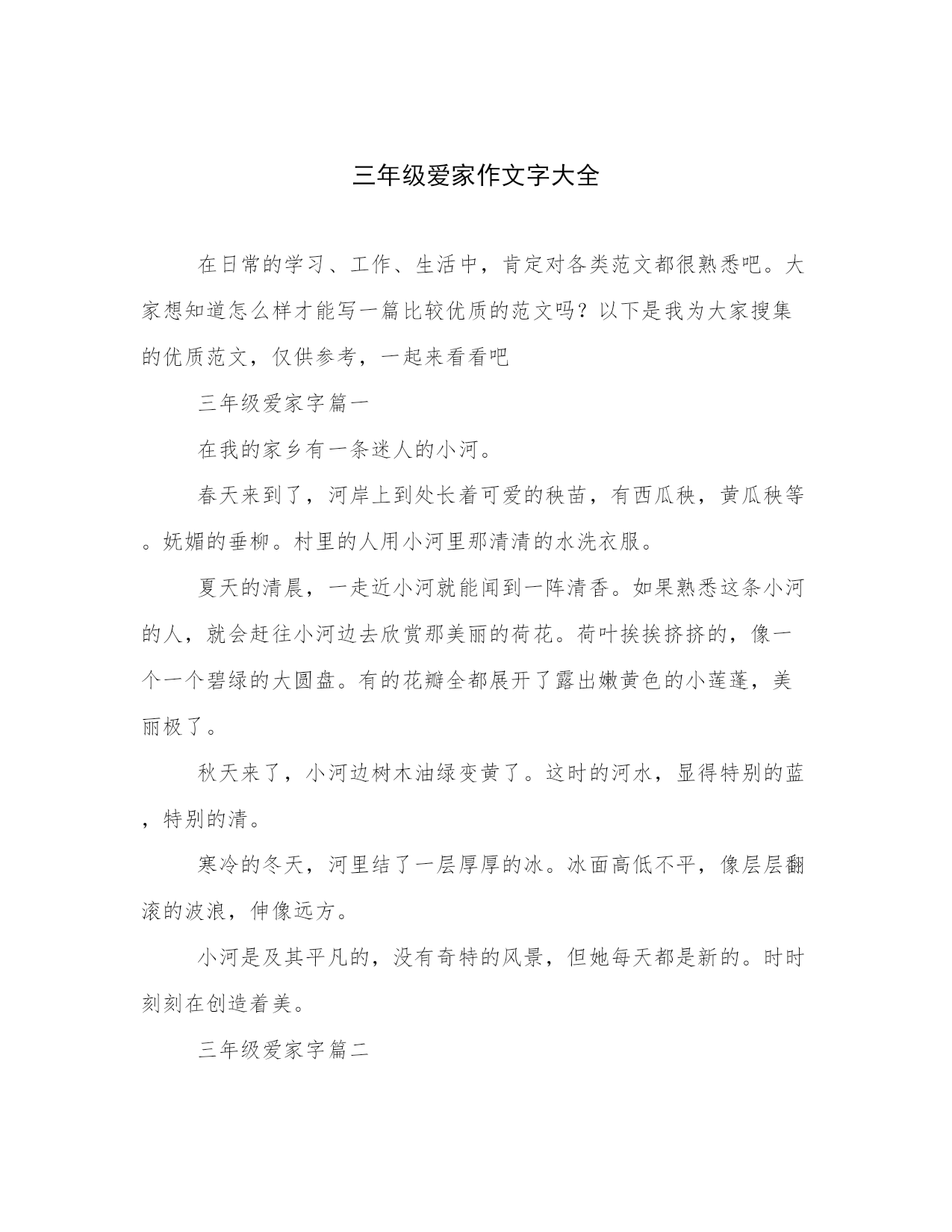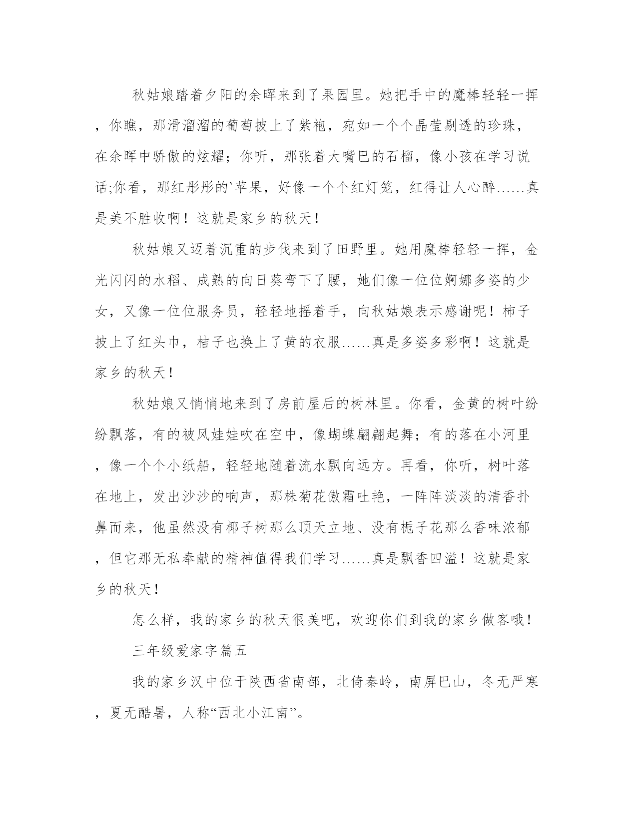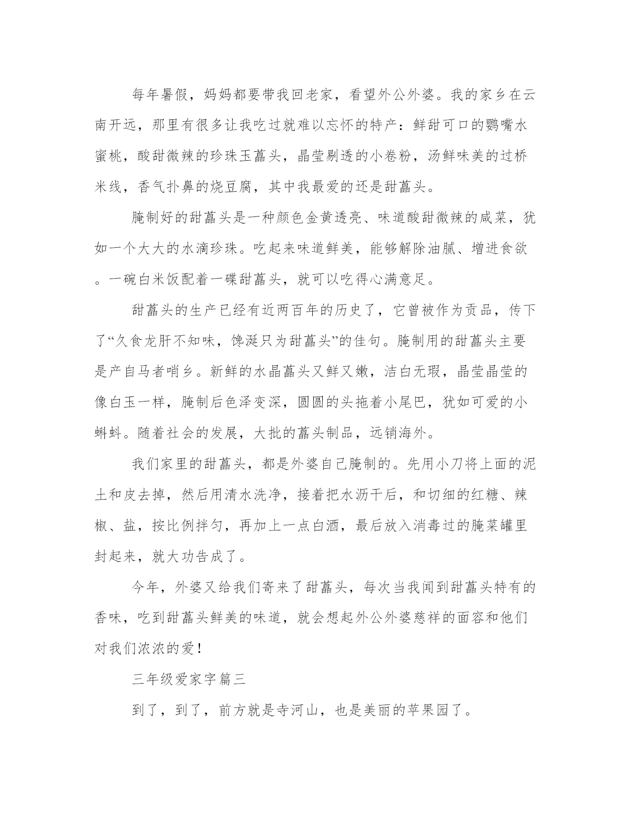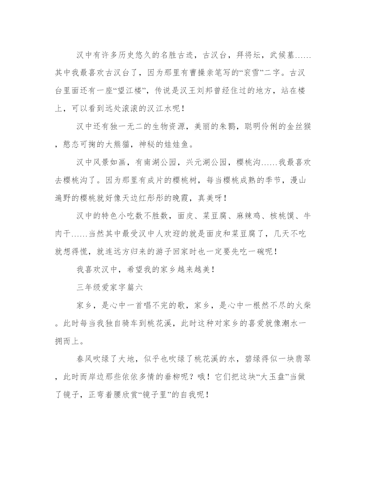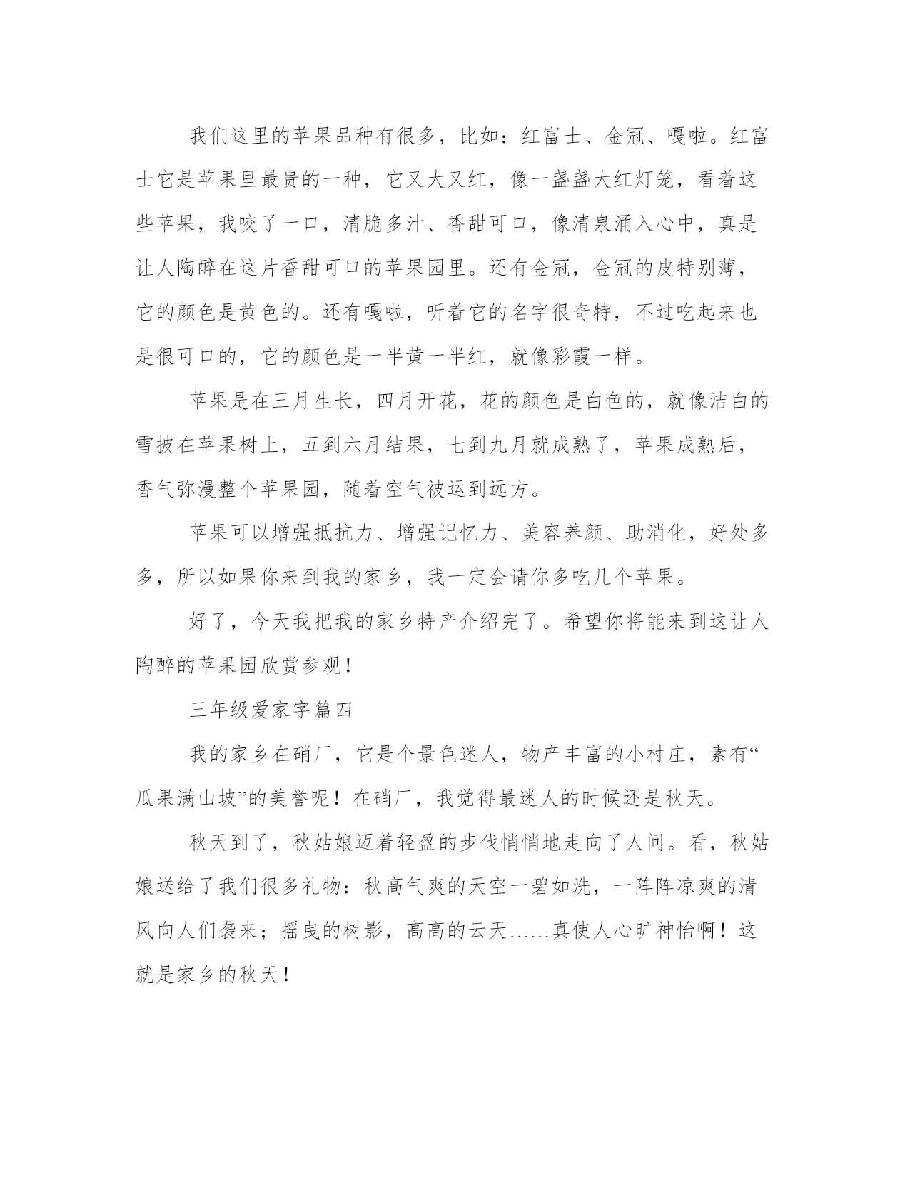 三年级爱家作文字大全在日常的学习、工作、生活中,肯定对各类范文都很熟悉吧。大家想知道怎么样才能写一篇比较优质的范文吗?以下是我为大家搜集的优质范文,仅供参考,一起来看看吧三年级爱家字篇一在我的家乡有一条迷人的小河。春天来到了,河岸上到处长着可爱的秧苗,有西瓜秧,黄瓜秧等。妩媚的垂柳。村里的人用小河里那清清的水洗衣服。夏天的清晨,一走近小河就能闻到一阵清香。如果熟悉这条小河的人,就会赶往小河边去欣赏那美丽的荷花。荷叶挨挨挤挤的,像一个一个碧绿的大圆盘。有的花瓣全都展开了露出嫩黄色的小莲蓬,美丽极了。秋天来了,小河边树木油绿变黄了。这时的河水,显得特别的蓝,特别的清。寒冷的冬天,河里结了一层厚厚的冰。冰面高低不平,像层层翻滚的波浪,伸像远方。小河是及其平凡的,没有奇特的风景,但她每天都是新的。时时刻刻在创造着美。三年级爱家字篇二每年暑假,妈妈都要带我回老家,看望外公外婆。我的家乡在云南开远,那里有很多让我吃过就难以忘怀的特产:鲜甜可口的鹦嘴水蜜桃,酸甜微辣的珍珠玉藠头,晶莹剔透的小卷粉,汤鲜味美的过桥米线,香气扑鼻的烧豆腐,其中我最爱的还是甜藠头。腌制好的甜藠头是一种颜色金黄透亮、味道酸甜微辣的咸菜,犹如一个大大的水滴珍珠。吃起来味道鲜美,能够解除油腻、增进食欲。一碗白米饭配着一碟甜藠头,就可以吃得心满意足。甜藠头的生产已经有近两百年的历史了,它曾被作为贡品,传下了“久食龙肝不知味,馋涎只为甜藠头”的佳句。腌制用的甜藠头主要是产自马者哨乡。新鲜的水晶藠头又鲜又嫩,洁白无瑕,晶莹晶莹的像白玉一样,腌制后色泽变深,圆圆的头拖着小尾巴,犹如可爱的小蝌蚪。随着社会的发展,大批的藠头制品,远销海外。我们家里的甜藠头,都是外婆自己腌制的。先用小刀将上面的泥土和皮去掉,然后用清水洗净,接着把水沥干后,和切细的红糖、辣椒、盐,按比例拌匀,再加上一点白酒,最后放入消毒过的腌菜罐里封起来,就大功告成了。今年,外婆又给我们寄来了甜藠头,每次当我闻到甜藠头特有的香味,吃到甜藠头鲜美的味道,就会想起外公外婆慈祥的面容和他们对我们浓浓的爱!三年级爱家字篇三到了,到了,前方就是寺河山,也是美丽的苹果园了。我们这里的苹果品种有很多,比如:红富士、金冠、嘎啦。红富士它是苹果里最贵的一种,它又大又红,像一盏盏大红灯笼,看着这些苹果,我咬了一口,清脆多汁、香甜可口,像清泉涌入心中,真是让人陶醉在这片香甜可口的苹果园里。还有金冠,金冠的皮特别薄,它的颜色是黄色的。还有嘎啦,听着它的名字很奇特,不过吃起来也是很可口的,它的颜色是一半黄一半红,就像彩霞一样。苹果是在三月生长,四月开花,花的颜色是白色的,就像洁白的雪披在苹果树上,五到六月结果,七到九月就成熟了,苹果成熟后,香气弥漫整个苹果园,随着空气被运到远方。苹果可以增强抵抗力、增强记忆力、美容养颜、助消化,好处多多,所以如果你来到我的家乡,我一定会请你多吃几个苹果。好了,今天我把我的家乡特产介绍完了。希望你将能来到这让人陶醉的苹果园欣赏参观!三年级爱家字篇四我的家乡在硝厂,它是个景色迷人,物产丰富的小村庄,素有“瓜果满山坡”的美誉呢!在硝厂,我觉得最迷人的时候还是秋天。秋天到了,秋姑娘迈着轻盈的步伐悄悄地走向了人间。看,秋姑娘送给了我们很多礼物:秋高气爽的天空一碧如洗,一阵阵凉爽的清风向人们袭来;摇曳的树影,高高的云天……真使人心旷神怡啊!这就是家乡的秋天!秋姑娘踏着夕阳的余晖来到了果园里。她把手中的魔棒轻轻一挥,你瞧,那滑溜溜的葡萄披上了紫袍,宛如一个个晶莹剔透的珍珠,在余晖中骄傲的炫耀;你听,那张着大嘴巴的石榴,像小孩在学习说话;你看,那红彤彤的`苹果,好像一个个红灯笼,红得让人心醉……真是美不胜收啊!这就是家乡的秋天!秋姑娘又迈着沉重的步伐来到了田野里。她用魔棒轻轻一挥,金光闪闪的水稻、成熟的向日葵弯下了腰,她们像一位位婀娜多姿的少女,又像一位位服务员,轻轻地摇着手,向秋姑娘表示感谢呢!柿子披上了红头巾,桔子也换上了黄的衣服……真是多姿多彩啊!这就是家乡的秋天!秋姑娘又悄悄地来到了房前屋后的树林里。你看,金黄的树叶纷纷飘落,有的被风娃娃吹在空中,像蝴蝶翩翩起舞;有的落在小河里,像一个个小纸船,轻轻地随着流水飘向远方。再看,你听,树叶落在地上,发出沙沙的响声,那株菊花傲霜吐艳,一阵阵淡淡的清香扑鼻而来,他虽然没有椰子树那么顶天立地、没有栀子花那么香味浓郁,但它那无私奉献的精神值得我们学习……真是飘香四溢!这就是家乡的秋天!怎么样,我的家乡的秋天很美吧,欢迎你们到我的家乡做客哦!三年级爱家字篇五我的家乡汉中位于陕西省南部,北倚秦岭,南屏巴山,冬无严寒,夏无酷暑,人称“西北小江南”。汉中有许多历史悠久的名胜古迹,古汉台,拜将坛,武候墓……其中我最喜欢古汉台了,因为那里有曹操亲笔写的“衮雪”二字。古汉台里面还有一座“望江楼