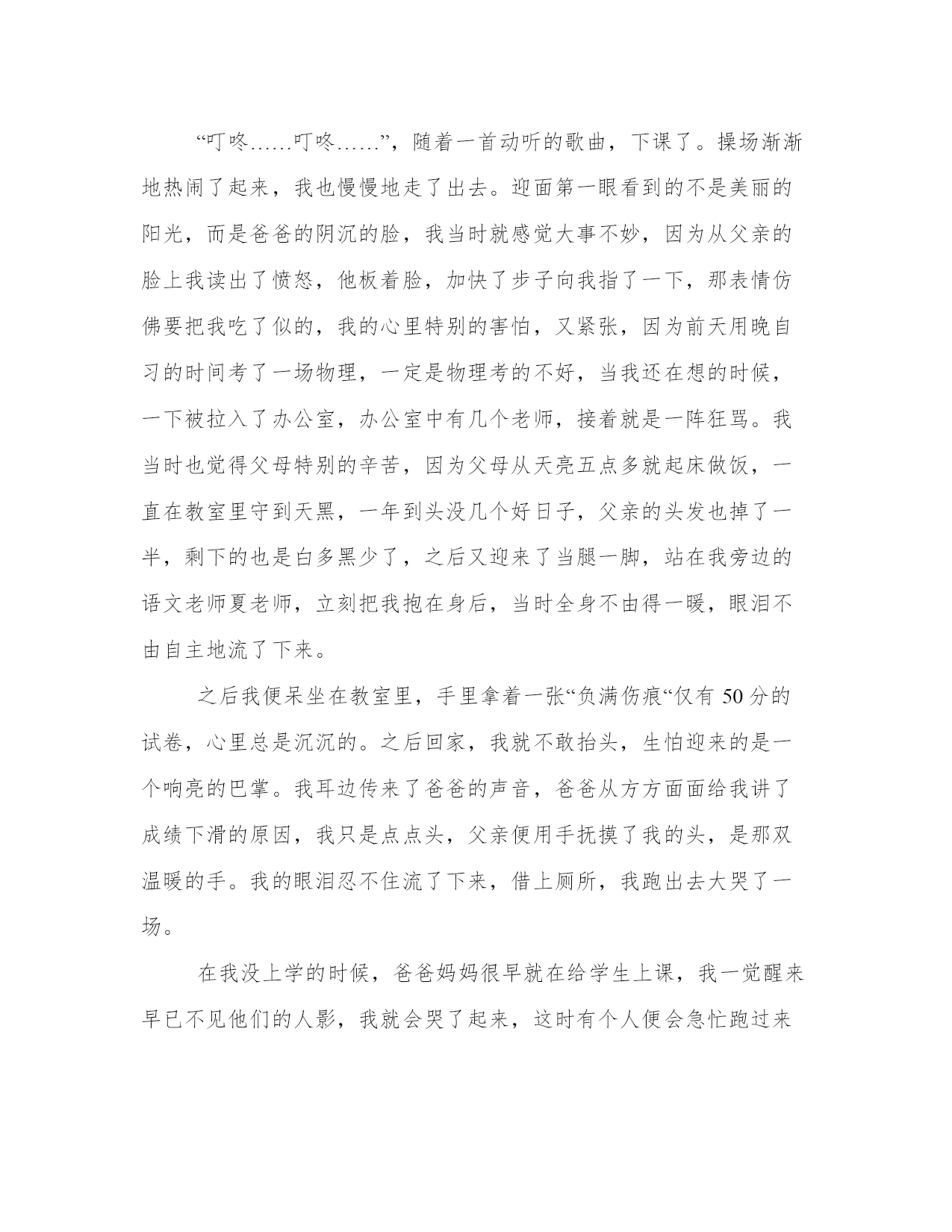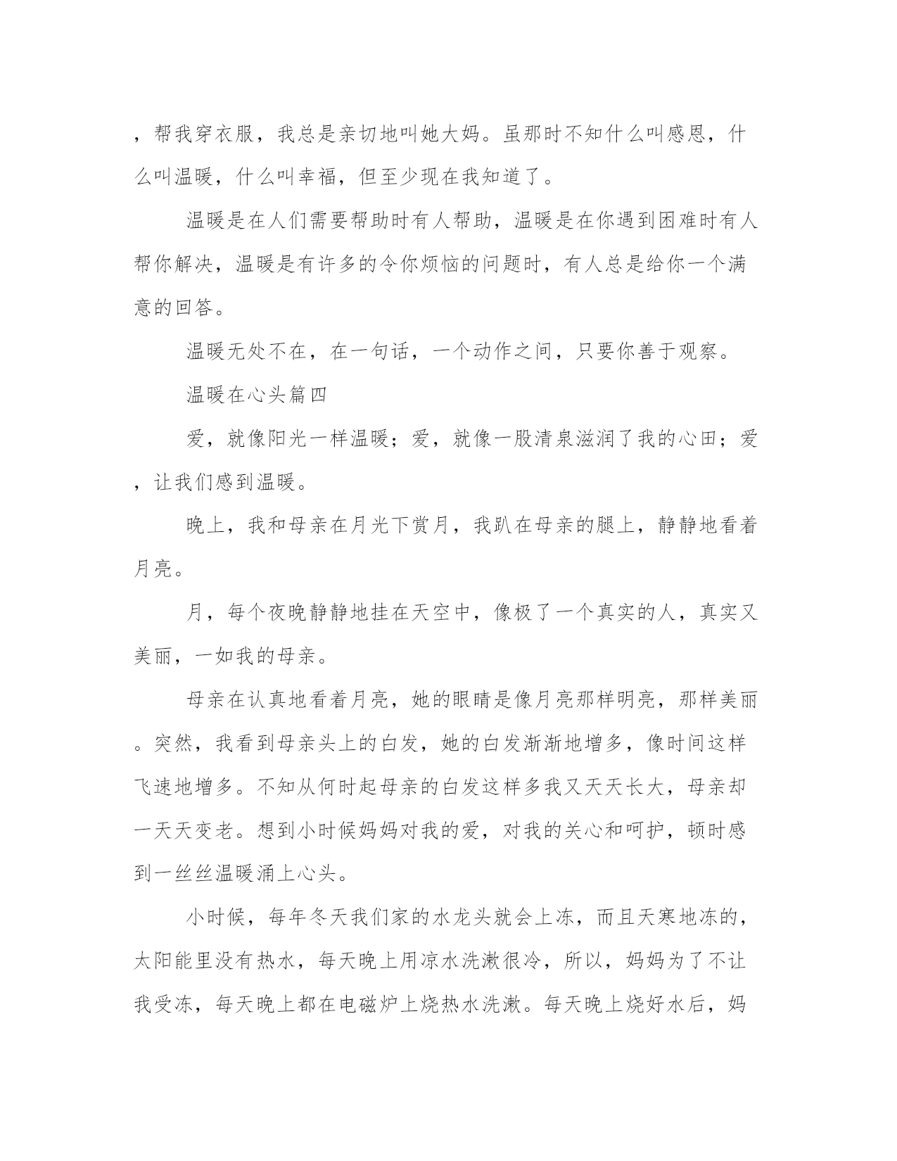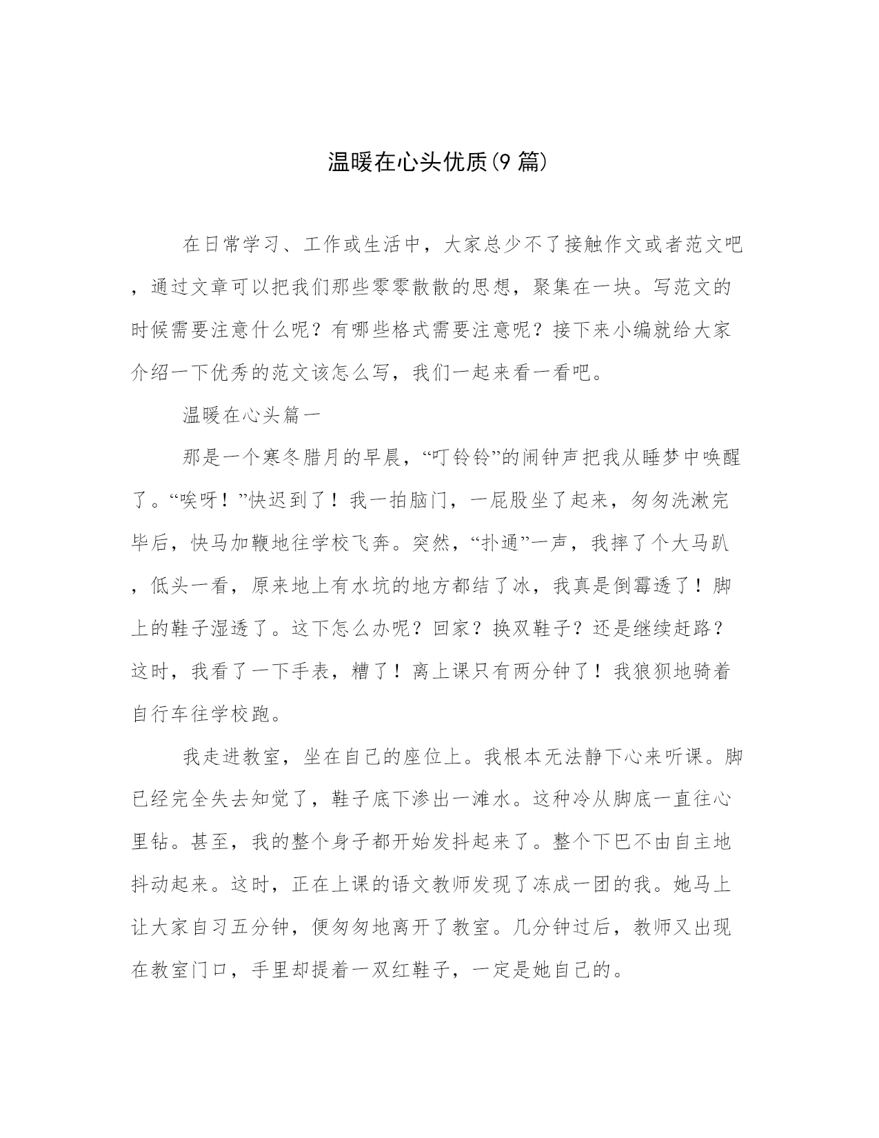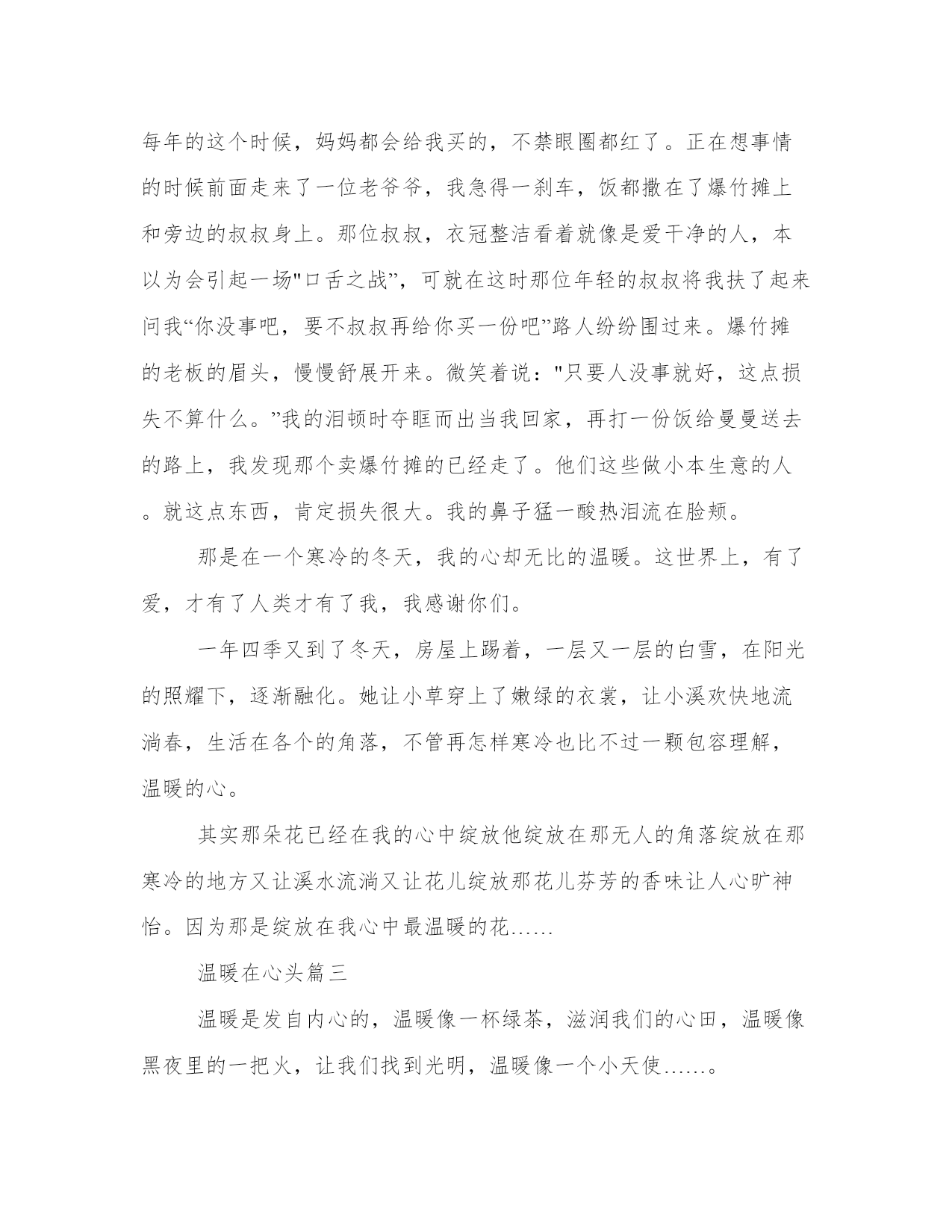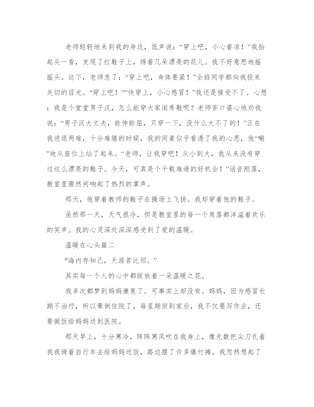 温暖在心头优质(9篇)在日常学习、工作或生活中,大家总少不了接触作文或者范文吧,通过文章可以把我们那些零零散散的思想,聚集在一块。写范文的时候需要注意什么呢?有哪些格式需要注意呢?接下来小编就给大家介绍一下优秀的范文该怎么写,我们一起来看一看吧。温暖在心头篇一那是一个寒冬腊月的早晨,“叮铃铃”的闹钟声把我从睡梦中唤醒了。“唉呀!”快迟到了!我一拍脑门,一屁股坐了起来,匆匆洗漱完毕后,快马加鞭地往学校飞奔。突然,“扑通”一声,我摔了个大马趴,低头一看,原来地上有水坑的地方都结了冰,我真是倒霉透了!脚上的鞋子湿透了。这下怎么办呢?回家?换双鞋子?还是继续赶路?这时,我看了一下手表,糟了!离上课只有两分钟了!我狼狈地骑着自行车往学校跑。我走进教室,坐在自己的座位上。我根本无法静下心来听课。脚已经完全失去知觉了,鞋子底下渗出一滩水。这种冷从脚底一直往心里钻。甚至,我的整个身子都开始发抖起来了。整个下巴不由自主地抖动起来。这时,正在上课的语文教师发现了冻成一团的我。她马上让大家自习五分钟,便匆匆地离开了教室。几分钟过后,教师又出现在教室门口,手里却提着一双红鞋子,一定是她自己的。老师轻轻地来到我的身边,低声说:“穿上吧,小心着凉!”我抬起头一看,发现了红鞋子上,绣着几朵漂亮的花儿。我不好意思地摇摇头。这下,老师急了:“穿上吧,身体要紧!”全班同学都向我投来关切的目光。“穿上吧!”“快穿上,小心感冒!”我还是接受不了。心想:我是个堂堂男子汉,怎么能穿大家闺秀鞋呢?老师苦口婆心地劝我说:“男子汉大丈夫,能伸能屈,只穿一下,没什么大不了的!”正在我进退两难,十分难堪的时候,我的同桌似乎看透了我的心思,他“唰”地从座位上站了起来。“老师,让我穿吧!从小到大,我从来没有穿过这么漂亮的鞋子。今天,可真是个千载难逢的好机会!”话音刚落,教室里骤然间响起了热烈的掌声。那天,他穿着教师的鞋子在操场上飞扬。我却穿着他的鞋子。虽然那一天,天气很冷,但是教室里的每一个角落都洋溢着欢乐的笑声。我的心灵深处深深感受到了爱的温暖。温暖在心头篇二"海内存知己,天涯若比邻。”其实每一个人的心中都绽放着一朵温暖之花。我多次都梦到妈妈康复了。可事实上却没有。妈妈,因为感冒长期不治疗,所以晕倒住院了,每星期回到家后,我不仅要写作业,还要做饭给妈妈送到医院。那天早上,十分寒冷,阵阵寒风吹在我身上,像无数把尖刀扎着我我骑着自行车去给妈妈送饭,路边摆了许多爆竹摊。我忽然想起了每年的这个时候,妈妈都会给我买的,不禁眼圈都红了。正在想事情的时候前面走来了一位老爷爷,我急得一刹车,饭都撒在了爆竹摊上和旁边的叔叔身上。那位叔叔,衣冠整洁看着就像是爱干净的人,本以为会引起一场"口舌之战”,可就在这时那位年轻的叔叔将我扶了起来问我“你没事吧,要不叔叔再给你买一份吧”路人纷纷围过来。爆竹摊的老板的眉头,慢慢舒展开来。微笑着说:"只要人没事就好,这点损失不算什么。”我的泪顿时夺眶而出当我回家,再打一份饭给曼曼送去的路上,我发现那个卖爆竹摊的已经走了。他们这些做小本生意的人。就这点东西,肯定损失很大。我的鼻子猛一酸热泪流在脸颊。那是在一个寒冷的冬天,我的心却无比的温暖。这世界上,有了爱,才有了人类才有了我,我感谢你们。一年四季又到了冬天,房屋上踢着,一层又一层的白雪,在阳光的照耀下,逐渐融化。她让小草穿上了嫩绿的衣裳,让小溪欢快地流淌春,生活在各个的角落,不管再怎样寒冷也比不过一颗包容理解,温暖的心。其实那朵花已经在我的心中绽放他绽放在那无人的角落绽放在那寒冷的地方又让溪水流淌又让花儿绽放那花儿芬芳的香味让人心旷神怡。因为那是绽放在我心中最温暖的花……温暖在心头篇三温暖是发自内心的,温暖像一杯绿茶,滋润我们的心田,温暖像黑夜里的一把火,让我们找到光明,温暖像一个小天使……。“叮咚……叮咚……”,随着一首动听的歌曲,下课了。操场渐渐地热闹了起来,我也慢慢地走了出去。迎面第一眼看到的不是美丽的阳光,而是爸爸的阴沉的脸,我当时就感觉大事不妙,因为从父亲的脸上我读出了愤怒,他板着脸,加快了步子向我指了一下,那表情仿佛要把我吃了似的,我的心里特别的害怕,又紧张,因为前天用晚自习的时间考了一场物理,一定是物理考的不好,当我还在想的时候,一下被拉入了办公室,办公室中有几个老师,接着就是一阵狂骂。我当时也觉得父母特别的辛苦,因为父母从天亮五点多就起床做饭,一直在教室里守到天黑,一年到头没几个好日子,父亲的头发也掉了一半,剩下的也是白多黑少了,之后又迎来了当腿一脚,站在我旁边的语文老师夏老师,立刻把我抱在身后,当时全身不由得一暖,眼泪不由自主地流了下来。之后我便呆坐在教室里,手里拿着一张“负满伤痕“仅有50分的试卷,心里总是沉沉的。之后回家,我就不敢抬头,生怕迎来的是一个响亮的巴掌。我耳边传来了爸爸的声音,爸爸从方方