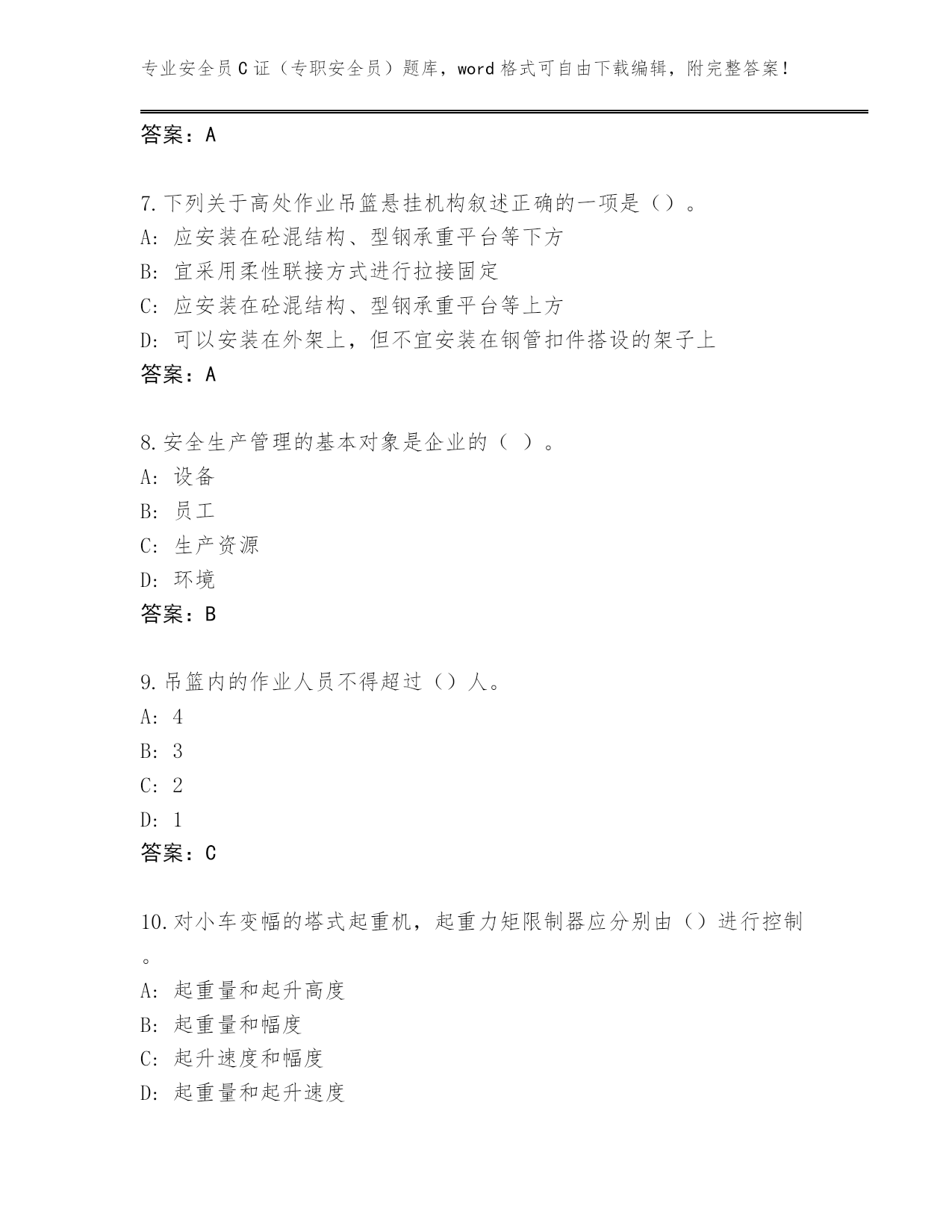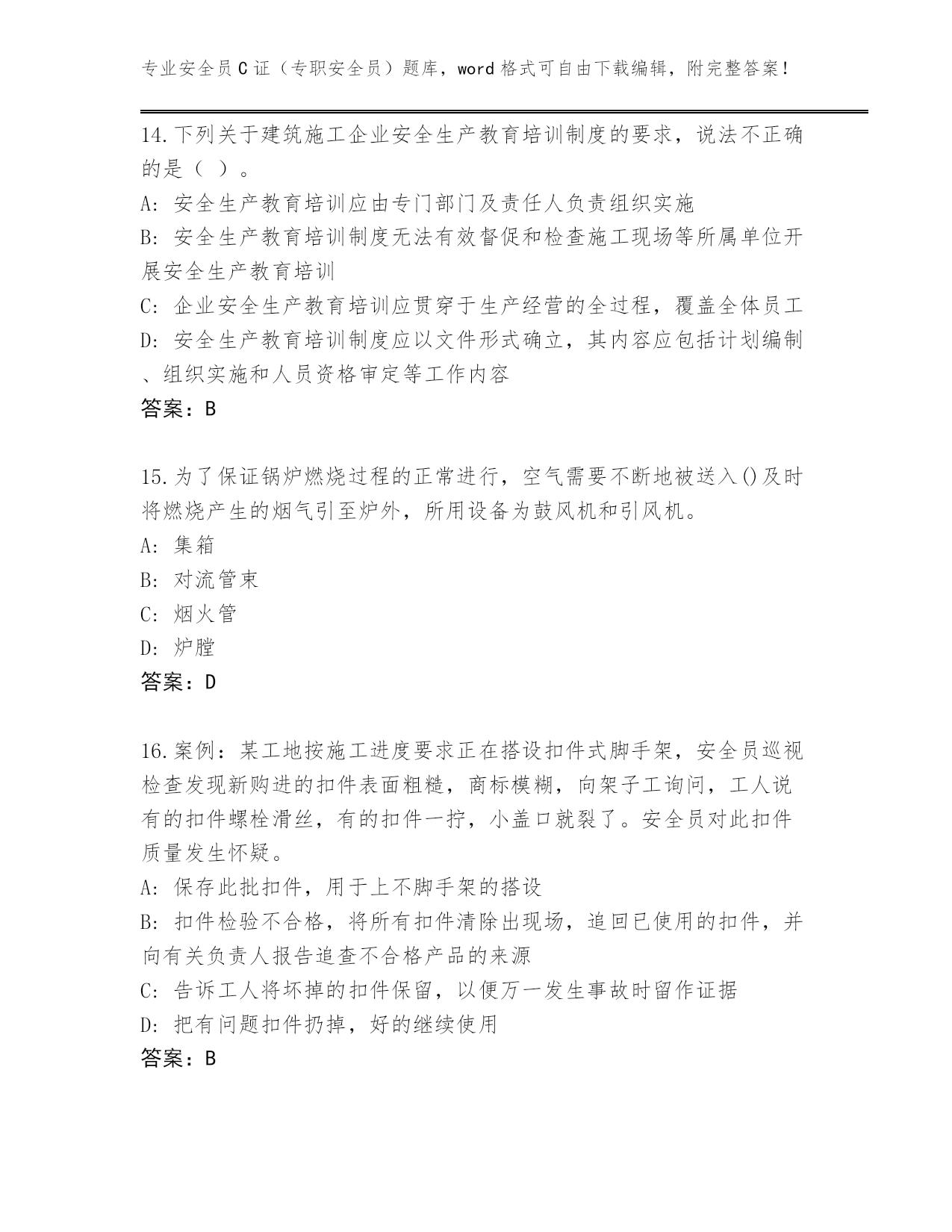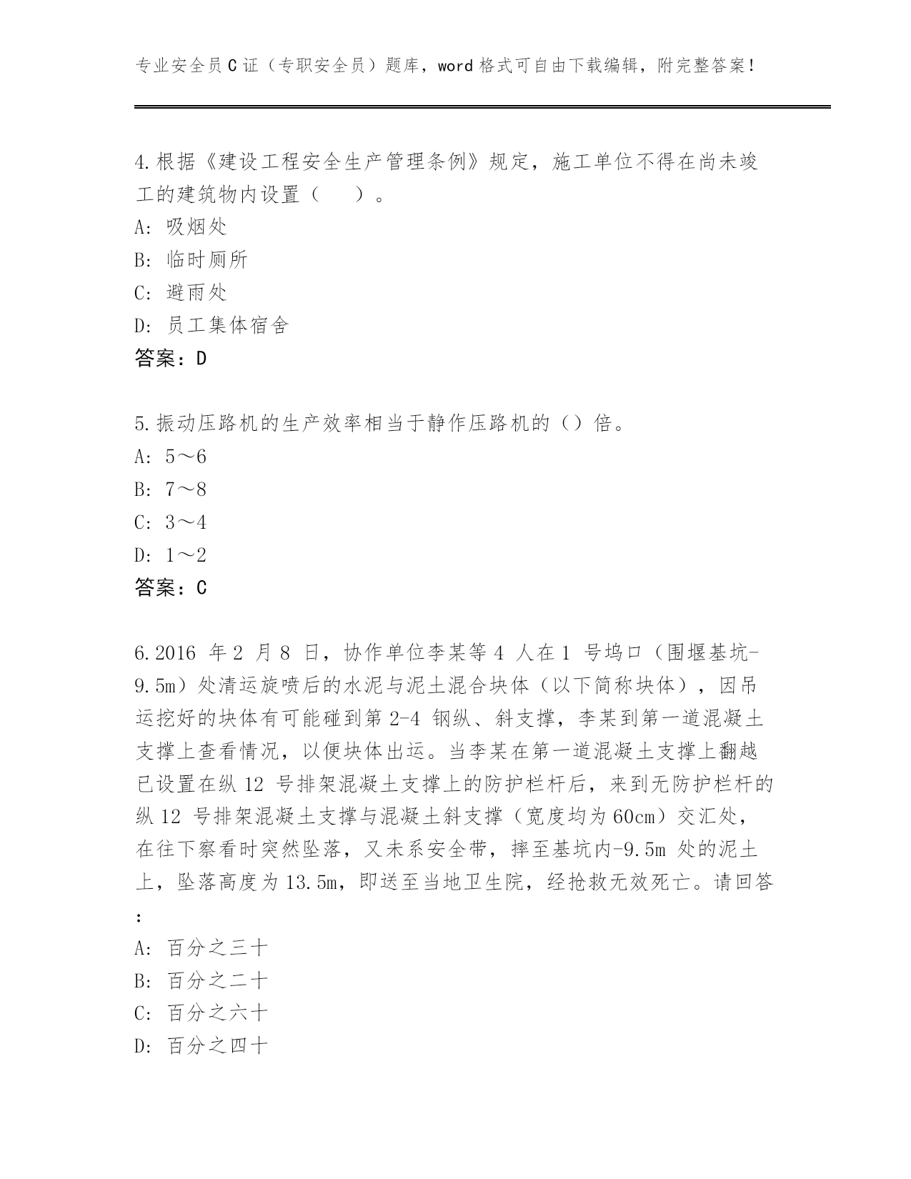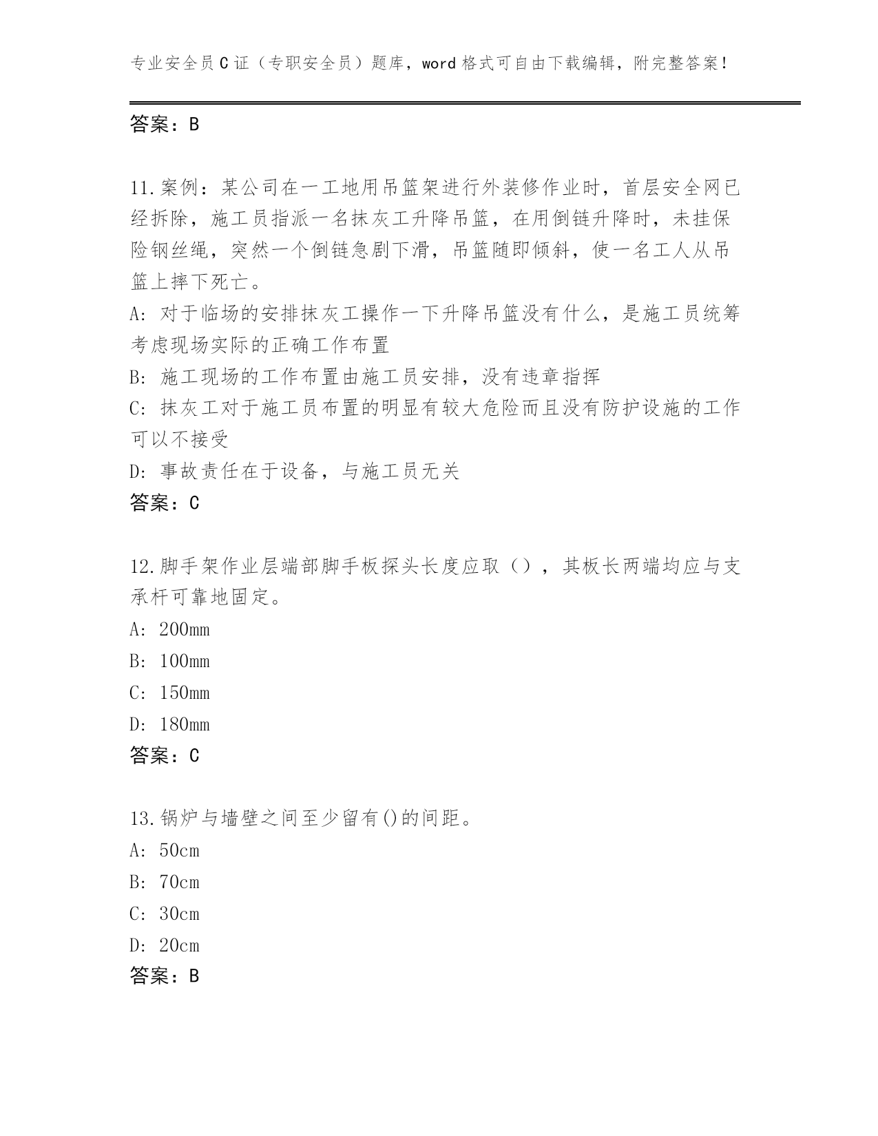 专业安全员C证(专职安全员)题库,word格式可自由下载编辑,附完整答案!2024湖南省炎陵县安全员C证(专职安全员)大全【典型题】第I部分单选题(100题)1.锅炉主要受压部件中起汇集、贮存、净化蒸汽和补充给水作用的是()。A:水冷壁B:集箱C:对流管束D:锅筒答案:D2.“用来传递和承受荷载,是吊笼上下运动的导轨”表述的是施工升降机的()。A:防坠安全器B:标准节C:底架D:导轨架答案:D3.因作业必需临时拆除或变动安全防护设施时,必须经()同意,采取相应的可靠措施,作业后应立即恢复。A:技术员B:安全员C:班长D:施工负责人答案:D4.根据《建设工程安全生产管理条例》规定,施工单位不得在尚未竣工的建筑物内设置()。A:吸烟处B:临时厕所C:避雨处D:员工集体宿舍答案:D5.振动压路机的生产效率相当于静作压路机的()倍。A:5~6B:7~8C:3~4D:1~2答案:C6.2016年2月8日,协作单位李某等4人在1号坞口(围堰基坑-9.5m)处清运旋喷后的水泥与泥土混合块体(以下简称块体),因吊运挖好的块体有可能碰到第2-4钢纵、斜支撑,李某到第一道混凝土支撑上查看情况,以便块体出运。当李某在第一道混凝土支撑上翻越已设置在纵12号排架混凝土支撑上的防护栏杆后,来到无防护栏杆的纵12号排架混凝土支撑与混凝土斜支撑(宽度均为60cm)交汇处,在往下察看时突然坠落,又未系安全带,摔至基坑内-9.5m处的泥土上,坠落高度为13.5m,即送至当地卫生院,经抢救无效死亡。请回答:A:百分之三十B:百分之二十C:百分之六十D:百分之四十答案:A7.下列关于高处作业吊篮悬挂机构叙述正确的一项是()。A:应安装在砼混结构、型钢承重平台等下方B:宜采用柔性联接方式进行拉接固定C:应安装在砼混结构、型钢承重平台等上方D:可以安装在外架上,但不宜安装在钢管扣件搭设的架子上答案:A8.安全生产管理的基本对象是企业的()。A:设备B:员工C:生产资源D:环境答案:B9.吊篮内的作业人员不得超过()人。A:4B:3C:2D:1答案:C10.对小车变幅的塔式起重机,起重力矩限制器应分别由()进行控制。A:起重量和起升高度B:起重量和幅度C:起升速度和幅度D:起重量和起升速度答案:B11.案例:某公司在一工地用吊篮架进行外装修作业时,首层安全网已经拆除,施工员指派一名抹灰工升降吊篮,在用倒链升降时,未挂保险钢丝绳,突然一个倒链急剧下滑,吊篮随即倾斜,使一名工人从吊篮上摔下死亡。A:对于临场的安排抹灰工操作一下升降吊篮没有什么,是施工员统筹考虑现场实际的正确工作布置B:施工现场的工作布置由施工员安排,没有违章指挥C:抹灰工对于施工员布置的明显有较大危险而且没有防护设施的工作可以不接受D:事故责任在于设备,与施工员无关答案:C12.脚手架作业层端部脚手板探头长度应取(),其板长两端均应与支承杆可靠地固定。A:200mmB:100mmC:150mmD:180mm答案:C13.锅炉与墙壁之间至少留有()的间距。A:50cmB:70cmC:30cmD:20cm答案:B14.下列关于建筑施工企业安全生产教育培训制度的要求,说法不正确的是()。A:安全生产教育培训应由专门部门及责任人负责组织实施B:安全生产教育培训制度无法有效督促和检查施工现场等所属单位开展安全生产教育培训C:企业安全生产教育培训应贯穿于生产经营的全过程,覆盖全体员工D:安全生产教育培训制度应以文件形式确立,其内容应包括计划编制、组织实施和人员资格审定等工作内容答案:B15.为了保证锅炉燃烧过程的正常进行,空气需要不断地被送入()及时将燃烧产生的烟气引至炉外,所用设备为鼓风机和引风机。A:集箱B:对流管束C:烟火管D:炉膛答案:D16.案例:某工地按施工进度要求正在搭设扣件式脚手架,安全员巡视检查发现新购进的扣件表面粗糙,商标模糊,向架子工询问,工人说有的扣件螺栓滑丝,有的扣件一拧,小盖口就裂了。安全员对此扣件质量发生怀疑。A:保存此批扣件,用于上不脚手架的搭设B:扣件检验不合格,将所有扣件清除出现场,追回已使用的扣件,并向有关负责人报告追查不合格产品的来源C:告诉工人将坏掉的扣件保留,以便万一发生事故时留作证据D:把有问题扣件扔掉,好的继续使用答案:B17.对接扣件的抗滑承载力设计值为()。A:3.4kNB:3.8kNC:3.2kND:3.6kN答案:C18.横向水平杆(小横杆)的最大长度应为()。A:4000mmB:5000mmC:2200mmD:3500mm答案:C19.塔式起重机主要由()组成。A:基础、塔身和塔臂B:金属结构、工作机构和控制系统C:金属结构、提升机构和安全保护装置D:基础、架体和提升机构答案:B20.临时宿舍的简易楼层高应控制在()以内。A:三层B:四层C:一层D:二层答案:D2