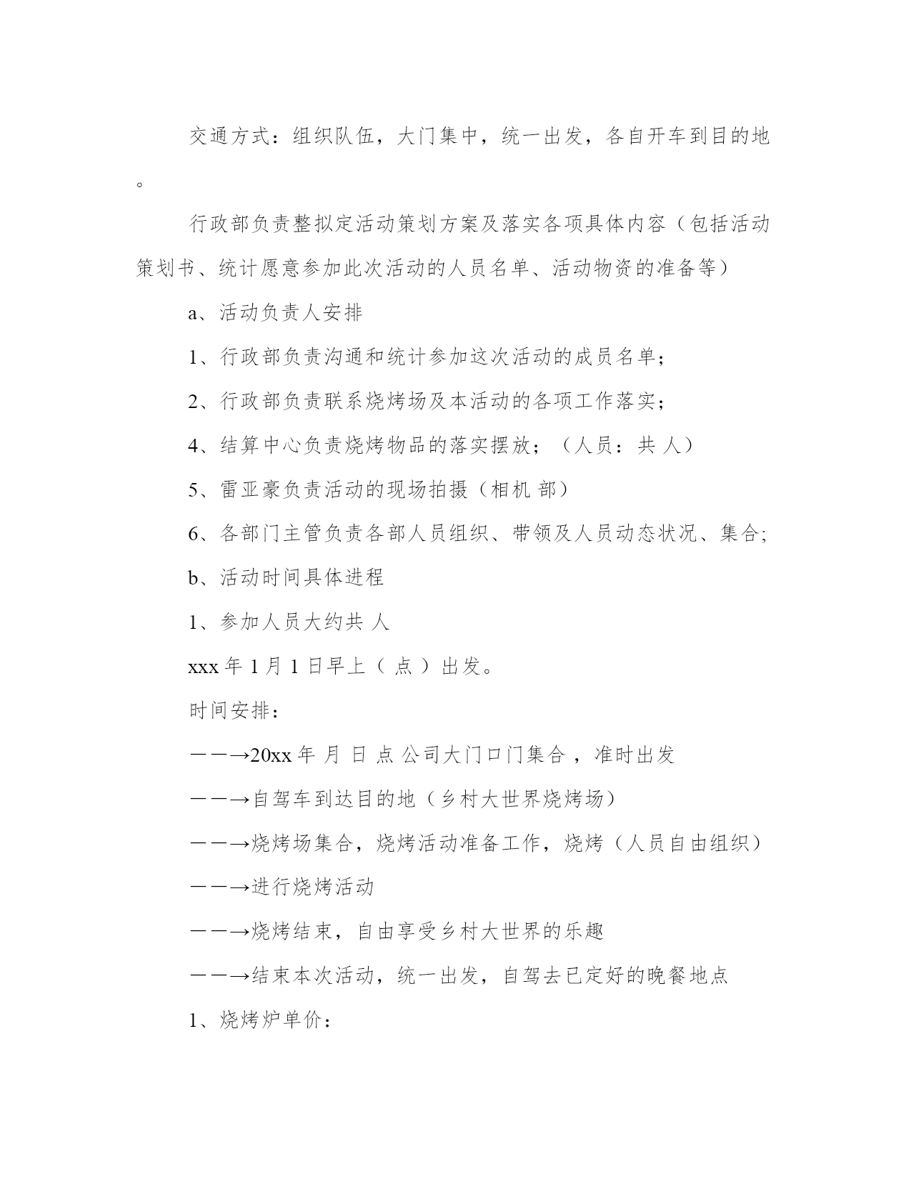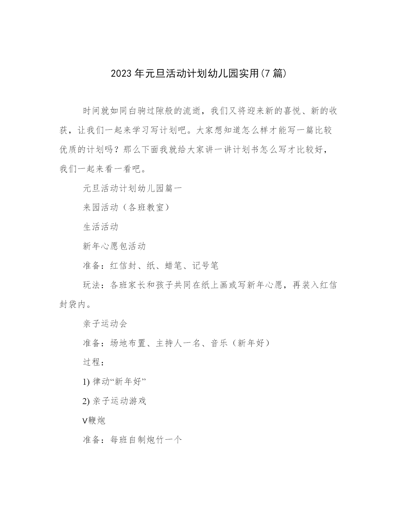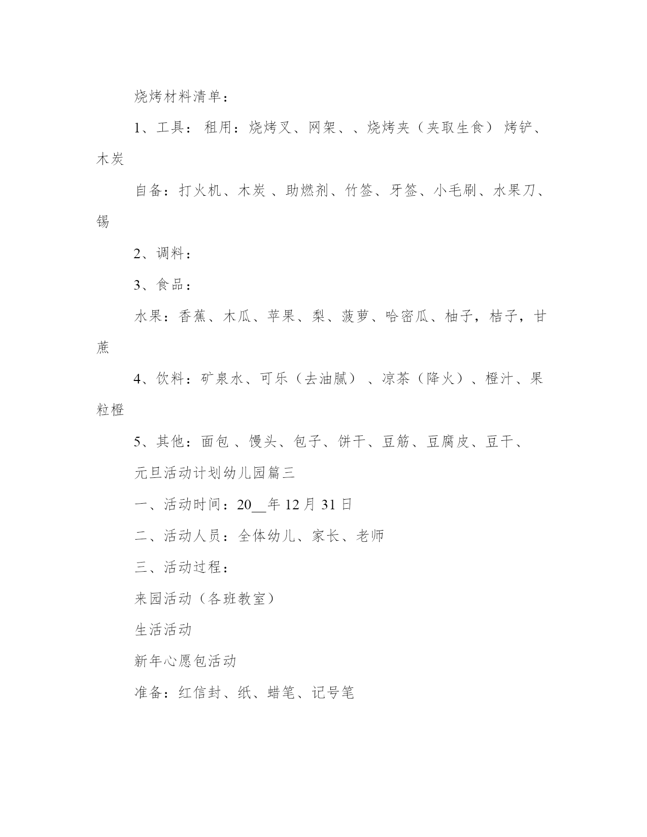 2023年元旦活动计划幼儿园实用(7篇)时间就如同白驹过隙般的流逝,我们又将迎来新的喜悦、新的收获,让我们一起来学习写计划吧。大家想知道怎么样才能写一篇比较优质的计划吗?那么下面我就给大家讲一讲计划书怎么写才比较好,我们一起来看一看吧。元旦活动计划幼儿园篇一来园活动(各班教室)生活活动新年心愿包活动准备:红信封、纸、蜡笔、记号笔玩法:各班家长和孩子共同在纸上画或写新年心愿,再装入红信封袋内。亲子运动会准备:场地布置、主持人一名、音乐(新年好)过程:1)律动“新年好”2)亲子运动游戏∨鞭炮准备:每班自制炮竹一个玩法:分小班组,托班组。每班出6对家长和孩子。将幼儿和家长分成一一对应,面对面排。开始由幼儿手捧“爆竹”由起点跑向自己的家长,当家长接过“爆竹”后,双手上举,口中喊道“砰啪”,就算送到一个。然后孩子再将“爆竹”运回给下一名幼儿手中,看哪对先放完。运彩球准备:彩色的球、圈玩法:适用于小班幼儿,每班10名幼儿,分两对面站立,用圈赶彩球行进走,走至对面交给另一位幼儿,依次往返接力。剥桔子:准备:小桔子50只,椅子3个,垃圾筐每班5对家长和孩子玩法:幼儿从起点跑到终点拿一个桔子,元旦活动计划幼儿园篇二为了增进市场和商户之间的相互了解,增强团队合作精神、营造和谐融洽的集体氛围,值元旦新年之际,市场部组织全体员工和商户前往乡村大世界进行烧烤联谊活动。活动组织:行政部活动地点:乡村大世界活动时间:20xx年1月1日元旦(星期日)参加人员:员工和商户,活动以自愿报名参加为原则。交通方式:组织队伍,大门集中,统一出发,各自开车到目的地。行政部负责整拟定活动策划方案及落实各项具体内容(包括活动策划书、统计愿意参加此次活动的人员名单、活动物资的准备等)a、活动负责人安排1、行政部负责沟通和统计参加这次活动的成员名单;2、行政部负责联系烧烤场及本活动的各项工作落实;4、结算中心负责烧烤物品的落实摆放;(人员:共人)5、雷亚豪负责活动的现场拍摄(相机部)6、各部门主管负责各部人员组织、带领及人员动态状况、集合;b、活动时间具体进程1、参加人员大约共人xxx年1月1日早上(点)出发。时间安排:--→20xx年月日点公司大门口门集合,准时出发--→自驾车到达目的地(乡村大世界烧烤场)--→烧烤场集合,烧烤活动准备工作,烧烤(人员自由组织)--→进行烧烤活动--→烧烤结束,自由享受乡村大世界的乐趣--→结束本次活动,统一出发,自驾去已定好的晚餐地点1、烧烤炉单价:租大炉(人),元/个170人参加,费用预算:1、租炉:2、食品3、其它临时备用金合计:在户外烧烤最重要的是安全,主要注意三方面:防火、防烫伤、食品安全。防火:选择烧烤场地时要远离易燃物。靠近水源。并用水桶容器备好水。放在烤炉旁,以防万一。一旦有隐患。要及时用水扑灭。即使出现险,.也不要紧张。初期的火灾是很容易扑灭,.紧张反而会使事态扩大化。在野外烧烤结束后。要确信火源已经彻底熄灭方可离开现场。防烫伤:在户外烧烤时,烤炉的固定条件差。所以不要在烧烤区打闹嬉戏。烤炉本身温度很高。千万不要触摸。随身准备一些防烫伤的药品也是必要的。食品卫生:在户外烧烤时,人的心情比较放松,有一种强烈的回归自然的感觉,很容易效仿古人的冲动。不等食品完全烤熟就食用,这样很容易发生食品安全问题,食品在户外保存条件较差,所以应及早食用。对暴露在空气中时间较长的食物,要仔细确认其新鲜程度。再决定是否适宜食用。烧烤材料清单:1、工具:租用:烧烤叉、网架、、烧烤夹(夹取生食)烤铲、木炭自备:打火机、木炭、助燃剂、竹签、牙签、小毛刷、水果刀、锡2、调料:3、食品:水果:香蕉、木瓜、苹果、梨、菠萝、哈密瓜、柚子,桔子,甘蔗4、饮料:矿泉水、可乐(去油腻)、凉茶(降火)、橙汁、果粒橙5、其他:面包、馒头、包子、饼干、豆筋、豆腐皮、豆干、元旦活动计划幼儿园篇三一、活动时间:20__年12月31日二、活动人员:全体幼儿、家长、老师三、活动过程:来园活动(各班教室)生活活动新年心愿包活动准备:红信封、纸、蜡笔、记号笔玩法:各班家长和孩子共同在纸上画或写新年心愿,再装入红信封袋内。亲子运动会准备:场地布置、主持人一名、音乐(新年好)过程:1)律动“新年好”2)亲子运动游戏∨鞭炮准备:每班自制炮竹一个玩法:分小班组,托班组。每班出6对家长和孩子。将幼儿和家长分成一一对应,面对面排。开始由幼儿手捧“爆竹”由起点跑向自己的家长,当家长接过“爆竹”后,双手上举,口中喊道“砰啪”,就算送到一个。然后孩子再将“爆竹”运回给下一名幼儿手中,看哪对先放完。运彩球准备:彩色的球、圈玩法:适用于小班幼儿,每班10名幼儿,分两对面站立,用圈赶彩球行进走,走至对面交给另一位幼儿,依次往返接力。剥桔子:准备:小桔子50只,椅子3个,垃圾筐每班5对家长和孩子玩法:幼儿从起点