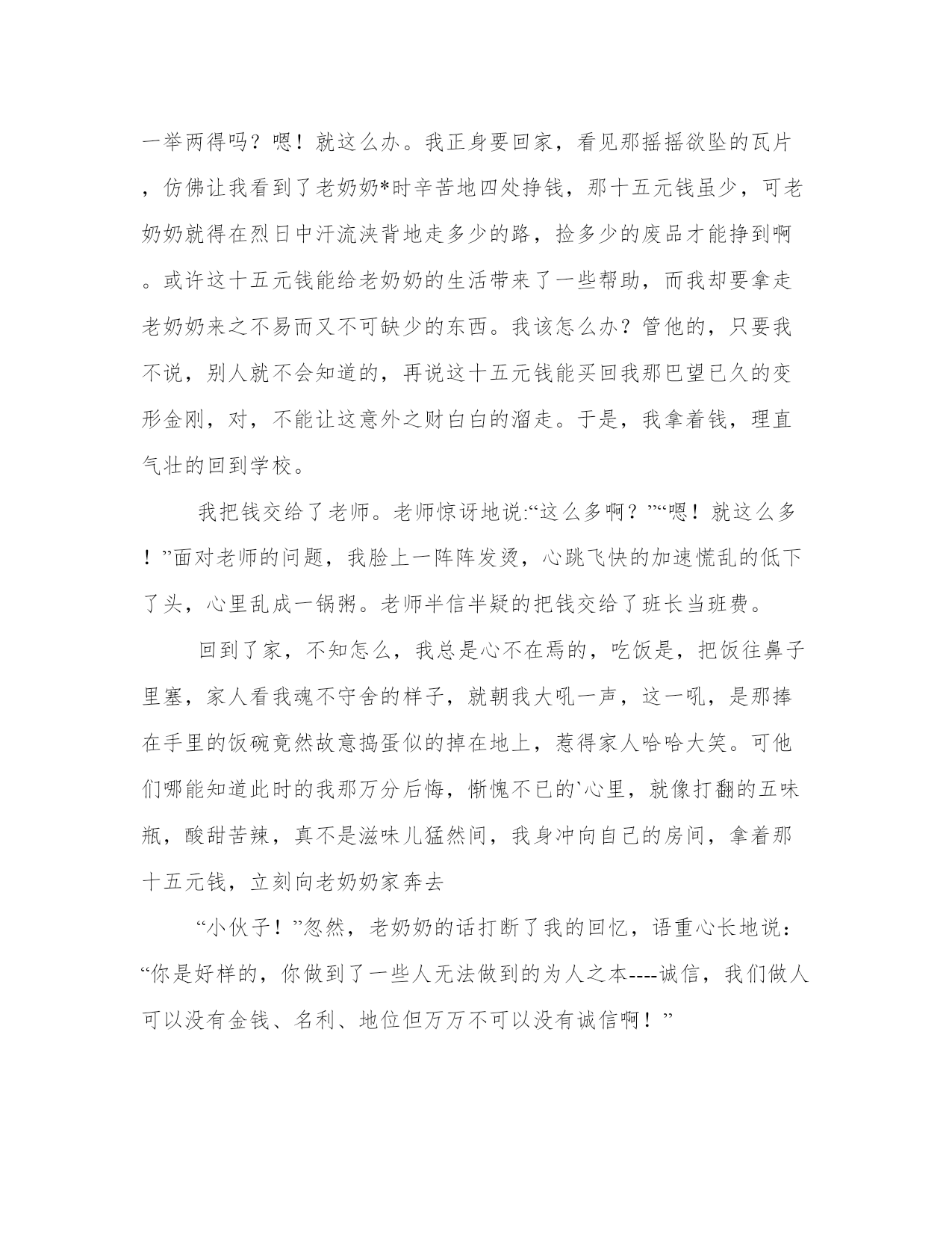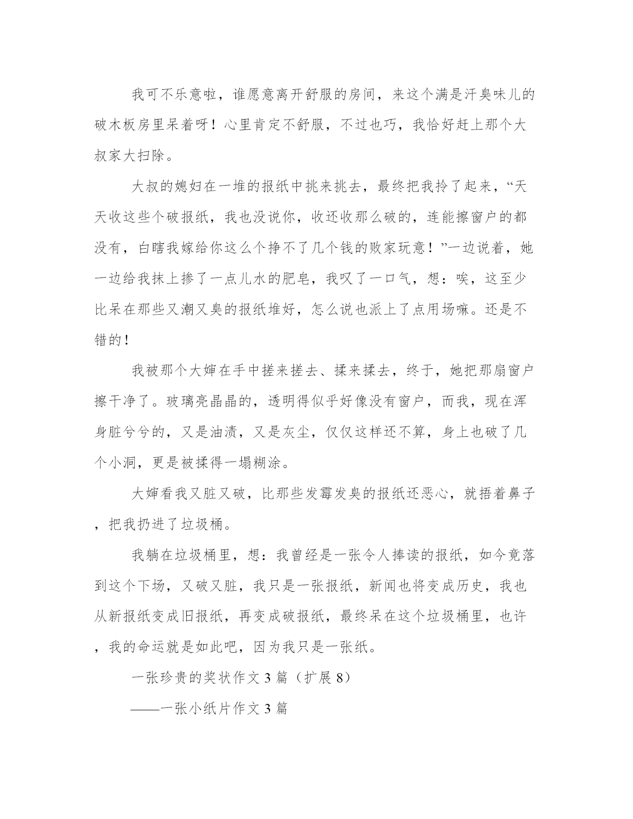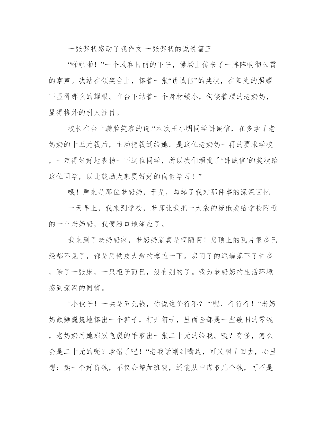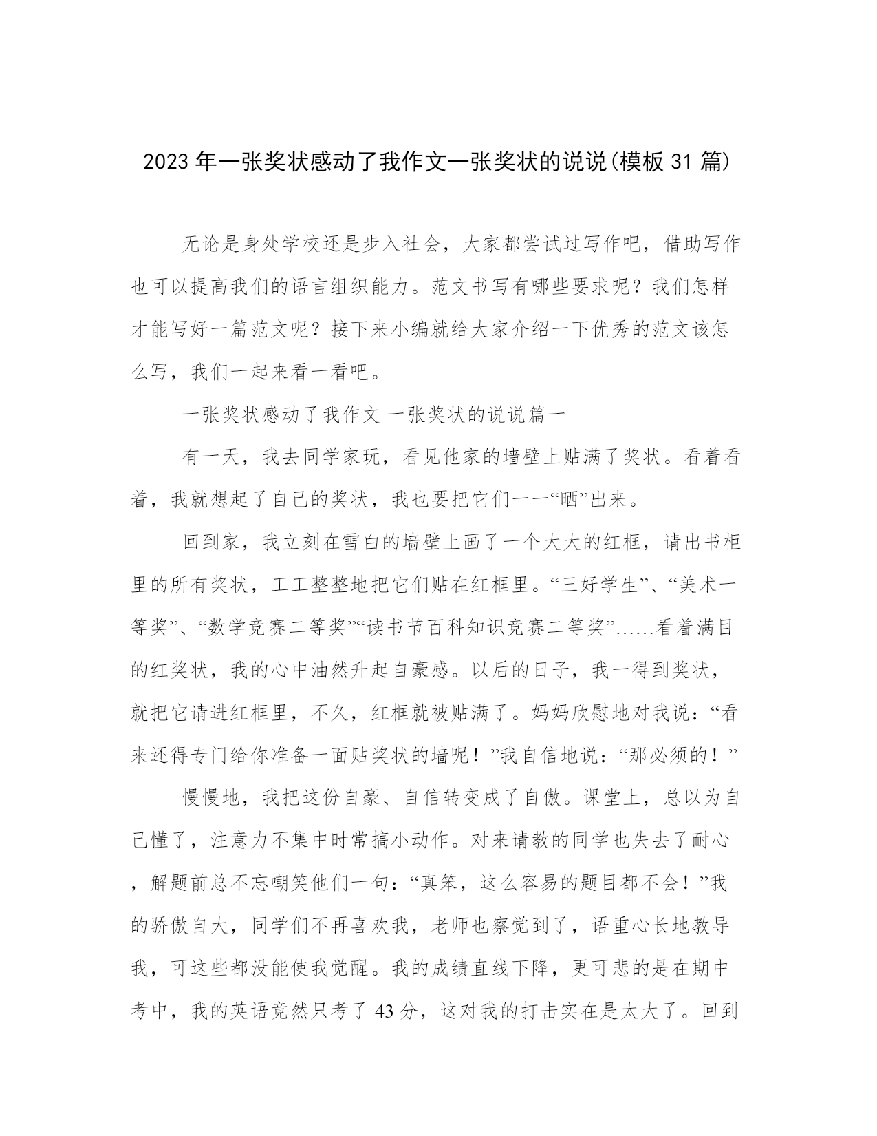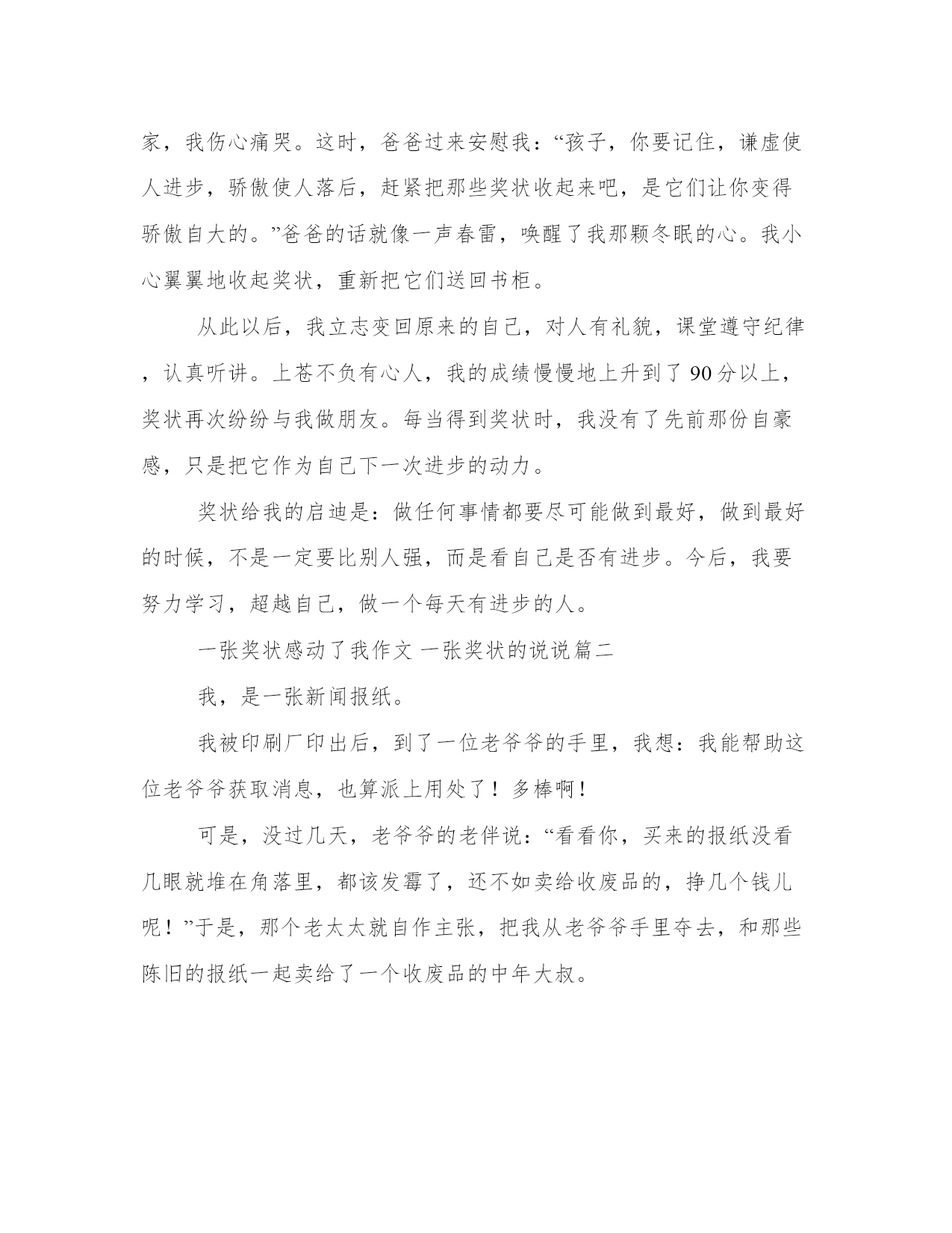 2023年一张奖状感动了我作文一张奖状的说说(模板31篇)无论是身处学校还是步入社会,大家都尝试过写作吧,借助写作也可以提高我们的语言组织能力。范文书写有哪些要求呢?我们怎样才能写好一篇范文呢?接下来小编就给大家介绍一下优秀的范文该怎么写,我们一起来看一看吧。一张奖状感动了我作文一张奖状的说说篇一有一天,我去同学家玩,看见他家的墙壁上贴满了奖状。看着看着,我就想起了自己的奖状,我也要把它们一一“晒”出来。回到家,我立刻在雪白的墙壁上画了一个大大的红框,请出书柜里的所有奖状,工工整整地把它们贴在红框里。“三好学生”、“美术一等奖”、“数学竞赛二等奖”“读书节百科知识竞赛二等奖”……看着满目的红奖状,我的心中油然升起自豪感。以后的日子,我一得到奖状,就把它请进红框里,不久,红框就被贴满了。妈妈欣慰地对我说:“看来还得专门给你准备一面贴奖状的墙呢!”我自信地说:“那必须的!”慢慢地,我把这份自豪、自信转变成了自傲。课堂上,总以为自己懂了,注意力不集中时常搞小动作。对来请教的同学也失去了耐心,解题前总不忘嘲笑他们一句:“真笨,这么容易的题目都不会!”我的骄傲自大,同学们不再喜欢我,老师也察觉到了,语重心长地教导我,可这些都没能使我觉醒。我的成绩直线下降,更可悲的是在期中考中,我的英语竟然只考了43分,这对我的打击实在是太大了。回到家,我伤心痛哭。这时,爸爸过来安慰我:“孩子,你要记住,谦虚使人进步,骄傲使人落后,赶紧把那些奖状收起来吧,是它们让你变得骄傲自大的。”爸爸的话就像一声春雷,唤醒了我那颗冬眠的心。我小心翼翼地收起奖状,重新把它们送回书柜。从此以后,我立志变回原来的自己,对人有礼貌,课堂遵守纪律,认真听讲。上苍不负有心人,我的成绩慢慢地上升到了90分以上,奖状再次纷纷与我做朋友。每当得到奖状时,我没有了先前那份自豪感,只是把它作为自己下一次进步的动力。奖状给我的启迪是:做任何事情都要尽可能做到最好,做到最好的时候,不是一定要比别人强,而是看自己是否有进步。今后,我要努力学习,超越自己,做一个每天有进步的人。一张奖状感动了我作文一张奖状的说说篇二我,是一张新闻报纸。我被印刷厂印出后,到了一位老爷爷的手里,我想:我能帮助这位老爷爷获取消息,也算派上用处了!多棒啊!可是,没过几天,老爷爷的老伴说:“看看你,买来的报纸没看几眼就堆在角落里,都该发霉了,还不如卖给收废品的,挣几个钱儿呢!”于是,那个老太太就自作主张,把我从老爷爷手里夺去,和那些陈旧的报纸一起卖给了一个收废品的中年大叔。我可不乐意啦,谁愿意离开舒服的房间,来这个满是汗臭味儿的破木板房里呆着呀!心里肯定不舒服,不过也巧,我恰好赶上那个大叔家大扫除。大叔的媳妇在一堆的报纸中挑来挑去,最终把我拎了起来,“天天收这些个破报纸,我也没说你,收还收那么破的,连能擦窗户的都没有,白瞎我嫁给你这么个挣不了几个钱的败家玩意!”一边说着,她一边给我抹上掺了一点儿水的肥皂,我叹了一口气,想:唉,这至少比呆在那些又潮又臭的报纸堆好,怎么说也派上了点用场嘛。还是不错的!我被那个大婶在手中搓来搓去、揉来揉去,终于,她把那扇窗户擦干净了。玻璃亮晶晶的,透明得似乎好像没有窗户,而我,现在浑身脏兮兮的,又是油渍,又是灰尘,仅仅这样还不算,身上也破了几个小洞,更是被揉得一塌糊涂。大婶看我又脏又破,比那些发霉发臭的报纸还恶心,就捂着鼻子,把我扔进了垃圾桶。我躺在垃圾桶里,想:我曾经是一张令人捧读的报纸,如今竟落到这个下场,又破又脏,我只是一张报纸,新闻也将变成历史,我也从新报纸变成旧报纸,再变成破报纸,最终呆在这个垃圾桶里,也许,我的命运就是如此吧,因为我只是一张纸。一张珍贵的奖状作文3篇(扩展8)——一张小纸片作文3篇一张奖状感动了我作文一张奖状的说说篇三“啪啪啪!”一个风和日丽的下午,操场上传来了一阵阵响彻云霄的掌声。我站在领奖台上,捧着一张“讲诚信”的奖状,在阳光的照耀下显得那么的耀眼。在台下站着一个身材矮小,佝偻着腰的老奶奶,显得格外的引人注目。校长在台上满脸笑容的说:“本次王小明同学讲诚信,在多拿了老奶奶的十五元钱后,主动把钱还给她。是这位老奶奶一再的要求学校,一定得好好地表扬一下这位同学,所以我们颁发了‘讲诚信’的奖状给这位同学,以此鼓励大家要好好的向他学习!”哦!原来是那位老奶奶,于是,勾起了我对那件事的深深回忆一天早上,我来到学校,老师让我把一大袋的废纸卖给学校附近的一个老奶奶,我便随口地答应了。我来到了老奶奶家,老奶奶家真是简陋啊!房顶上的瓦片很多已经都不见了,都是用铁皮大致的遮盖一下。房间了的泥墙落下了许多,除了一张床,一只柜子而已,没有别的了。我为老奶奶的生活环境感到深深的同情。“小伙子!一共是五元钱,你说这价行不?”“嗯,行行行!”老奶奶颤颤巍巍地捧出一个箱子,打开箱子,里面全部是一些