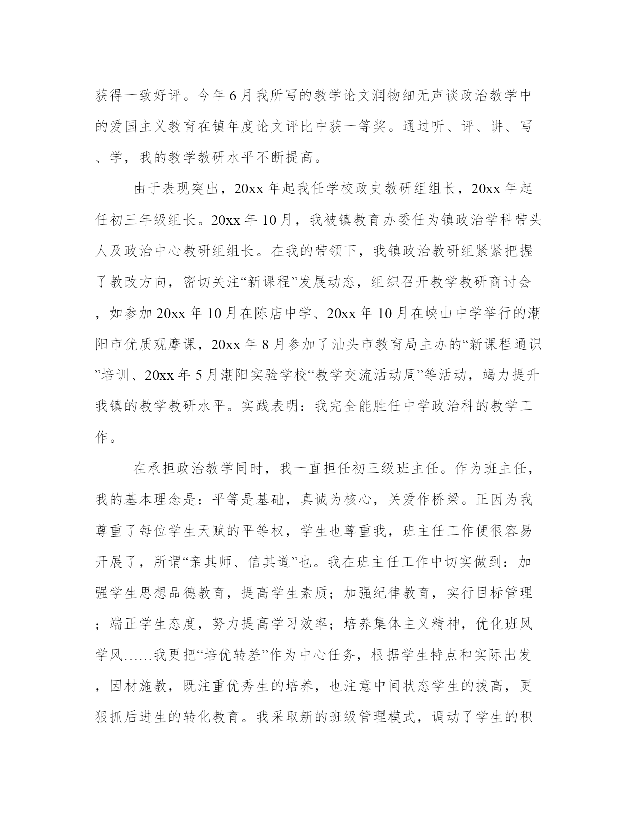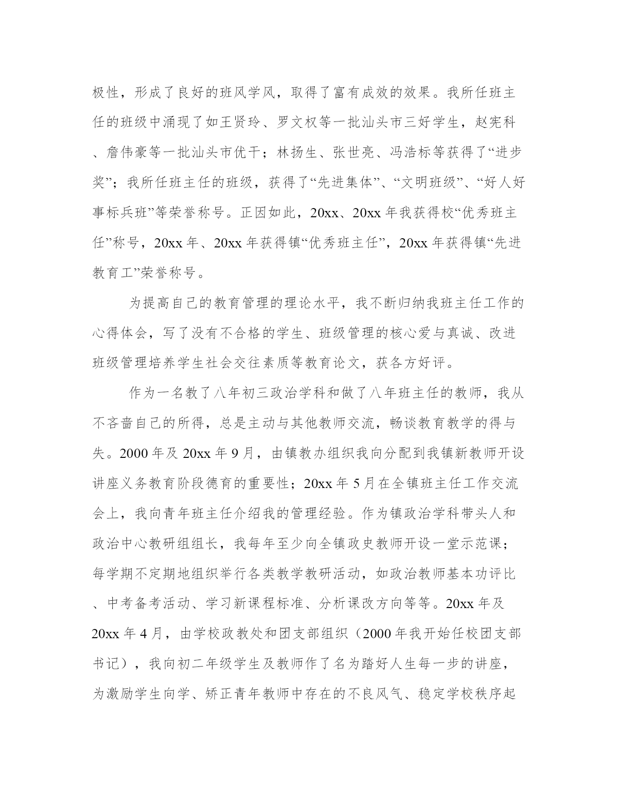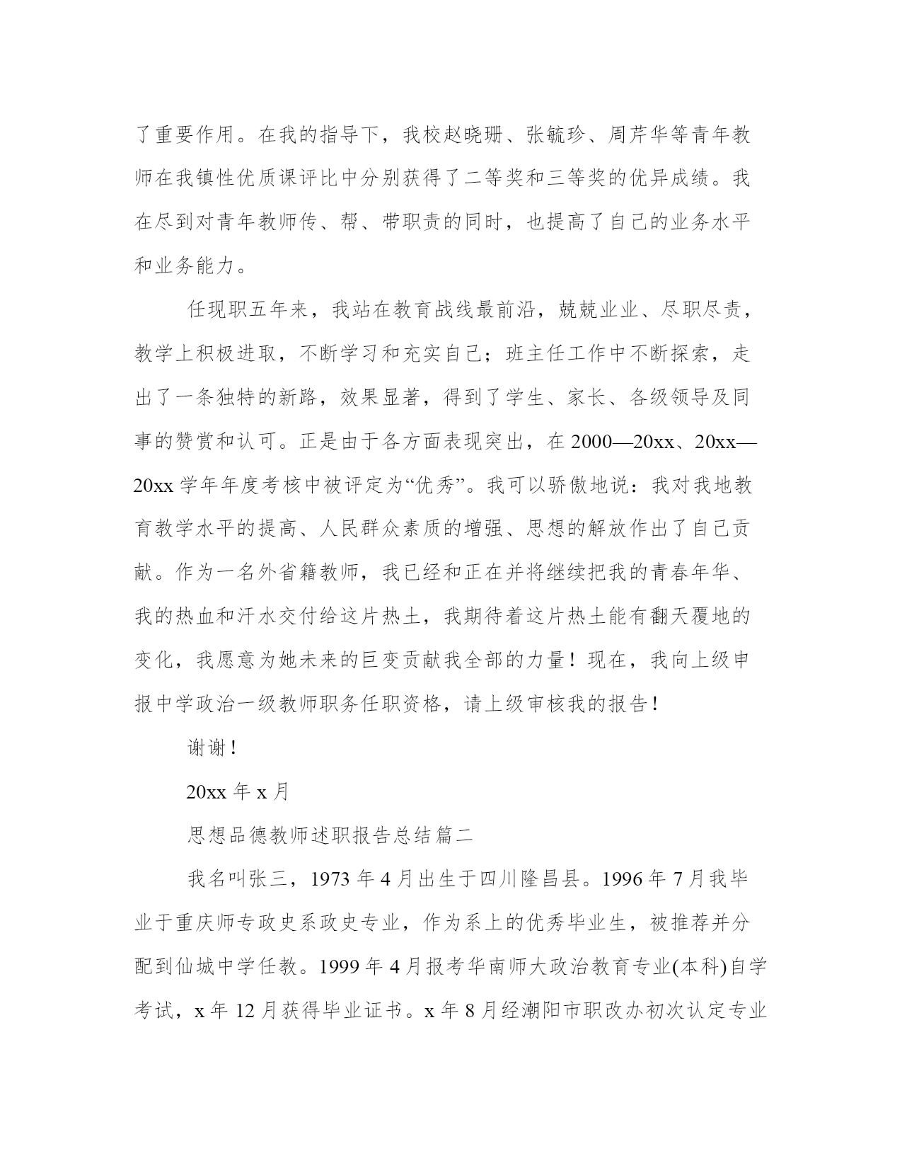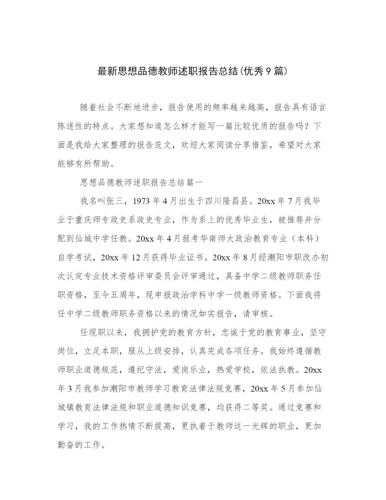 最新思想品德教师述职报告总结(优秀9篇)随着社会不断地进步,报告使用的频率越来越高,报告具有语言陈述性的特点。大家想知道怎么样才能写一篇比较优质的报告吗?下面是我给大家整理的报告范文,欢迎大家阅读分享借鉴,希望对大家能够有所帮助。思想品德教师述职报告总结篇一我名叫张三,1973年4月出生于四川隆昌县。20xx年7月我毕业于重庆师专政史系政史专业,作为系上的优秀毕业生,被推荐并分配到仙城中学任教。20xx年4月报考华南师大政治教育专业(本科)自学考试,20xx年12月获得毕业证书。20xx年8月经潮阳市职改办初次认定专业技术资格评审委员会评审通过,具备中学二级教师职务任职资格,至今五周年,现申报政治学科中学一级教师资格。下面我将任中学二级教师职务资格以来的情况如实报告,请审核。任现职以来,我拥护党的教育方针,忠诚于党的教育事业,坚守岗位,立足本职,服从上级安排,认真完成各项任务。我始终遵循教师职业道德规范,遵纪守法,爱岗乐业,热爱学校,依法执教。20xx年3月我参加潮阳市教师学习教育法律法规竞赛,20xx年5月参加仙城镇教育法律法规和职业道德知识竞赛,均获得二等奖。通过竞赛和学习,我的工作热情不断提高,更执着于教师这一光辉的职业,更加勤奋的工作。思想政治课是教给学生发现问题、分析问题和解决问题的方法的学科这就是我对政治学科的理解。我尽可能以浅显易懂的语言向学生传递信息和知识,将枯燥的政治课本知识转化为生动的课堂语言,努力培养学生的逻辑思维能力和理性思维能力:“授之以鱼,不如授之以渔”也。我深入浅出、活泼幽默的授课风格受到了学生的。任现职以来,我每学期任初三级四个班政治课,每周12节课,教学成绩十分突出,我所任教的班级连续五年保持了全市统考及中考平均分的全镇第一名,合格率保持在80%以上,优秀率约为30%左右,受到了镇教育组的通报表扬。我所任教的学生刘佐梁、刘慈华等人考上了金山中学;赵端标、刘谨英、贝朝雄等数十名同学考上了潮阳师范或潮阳一中;赵庄豪、庄健秀、詹宏源等上百名同学考上了潮阳二中。张毓珍、刘哲尊、周昭雄等学生已从潮阳师范学校毕业任教于本镇,为我市的教育作出了相当大的贡献。此外,我不断参加各级各类的教研活动。20xx年11月和20xx年11参加学校组织的公开课评比,20xx年3月、20xx年4月以及20xx年12月参加镇教办组织的优质课评比均获得一等奖。同时,我利用课余时间总结教学心得,所写论文政治教学中如何化难为易、三步走政治复习方法之我见、活用思想政治课的基本方法和基本原则分别发表在仙城中学教育教学论文集第一、二、三辑上。其中,活用思想政治课的基本方法和基本原则作为我此次申报中教一级的参评论文获得“良好”,并且在今年7月镇教育组组织的论文宣读会议上进行宣读,获得一致好评。今年6月我所写的教学论文润物细无声谈政治教学中的爱国主义教育在镇年度论文评比中获一等奖。通过听、评、讲、写、学,我的教学教研水平不断提高。由于表现突出,20xx年起我任学校政史教研组组长,20xx年起任初三年级组长。20xx年10月,我被镇教育办委任为镇政治学科带头人及政治中心教研组组长。在我的带领下,我镇政治教研组紧紧把握了教改方向,密切关注“新课程”发展动态,组织召开教学教研商讨会,如参加20xx年10月在陈店中学、20xx年10月在峡山中学举行的潮阳市优质观摩课,20xx年8月参加了汕头市教育局主办的“新课程通识”培训、20xx年5月潮阳实验学校“教学交流活动周”等活动,竭力提升我镇的教学教研水平。实践表明:我完全能胜任中学政治科的教学工作。在承担政治教学同时,我一直担任初三级班主任。作为班主任,我的基本理念是:平等是基础,真诚为核心,关爱作桥梁。正因为我尊重了每位学生天赋的平等权,学生也尊重我,班主任工作便很容易开展了,所谓“亲其师、信其道”也。我在班主任工作中切实做到:加强学生思想品德教育,提高学生素质;加强纪律教育,实行目标管理;端正学生态度,努力提高学习效率;培养集体主义精神,优化班风学风……我更把“培优转差”作为中心任务,根据学生特点和实际出发,因材施教,既注重优秀生的培养,也注意中间状态学生的拔高,更狠抓后进生的转化教育。我采取新的班级管理模式,调动了学生的积极性,形成了良好的班风学风,取得了富有成效的效果。我所任班主任的班级中涌现了如王贤玲、罗文权等一批汕头市三好学生,赵宪科、詹伟豪等一批汕头市优干;林扬生、张世亮、冯浩标等获得了“进步奖”;我所任班主任的班级,获得了“先进集体”、“文明班级”、“好人好事标兵班”等荣誉称号。正因如此,20xx、20xx年我获得校“优秀班主任”称号,20xx年、20xx年获得镇“优秀班主任”,20xx年获得镇“先进教育工”荣誉称号。为提高自己的教育管理的理论水平,我不断归纳我班主任工作的心得体会,写了