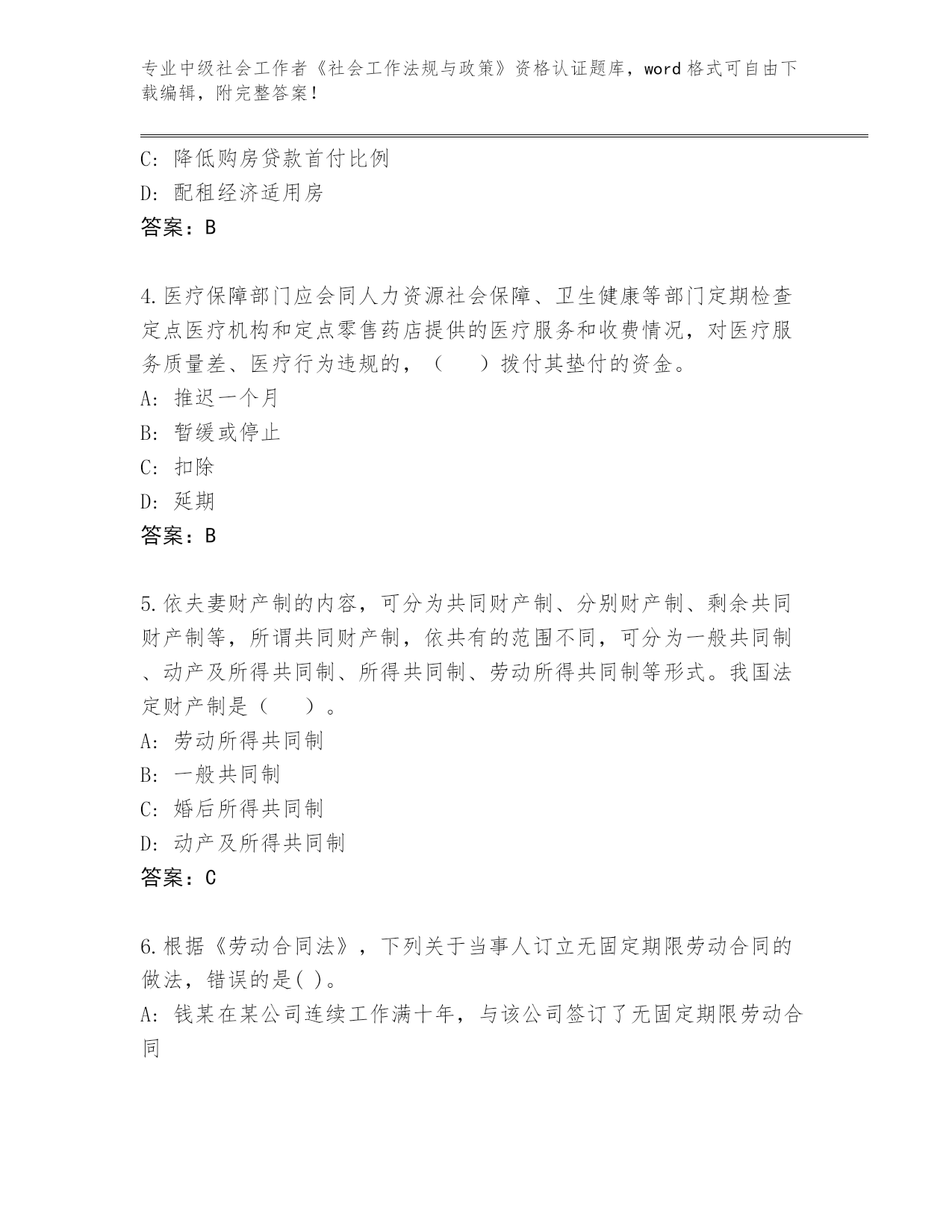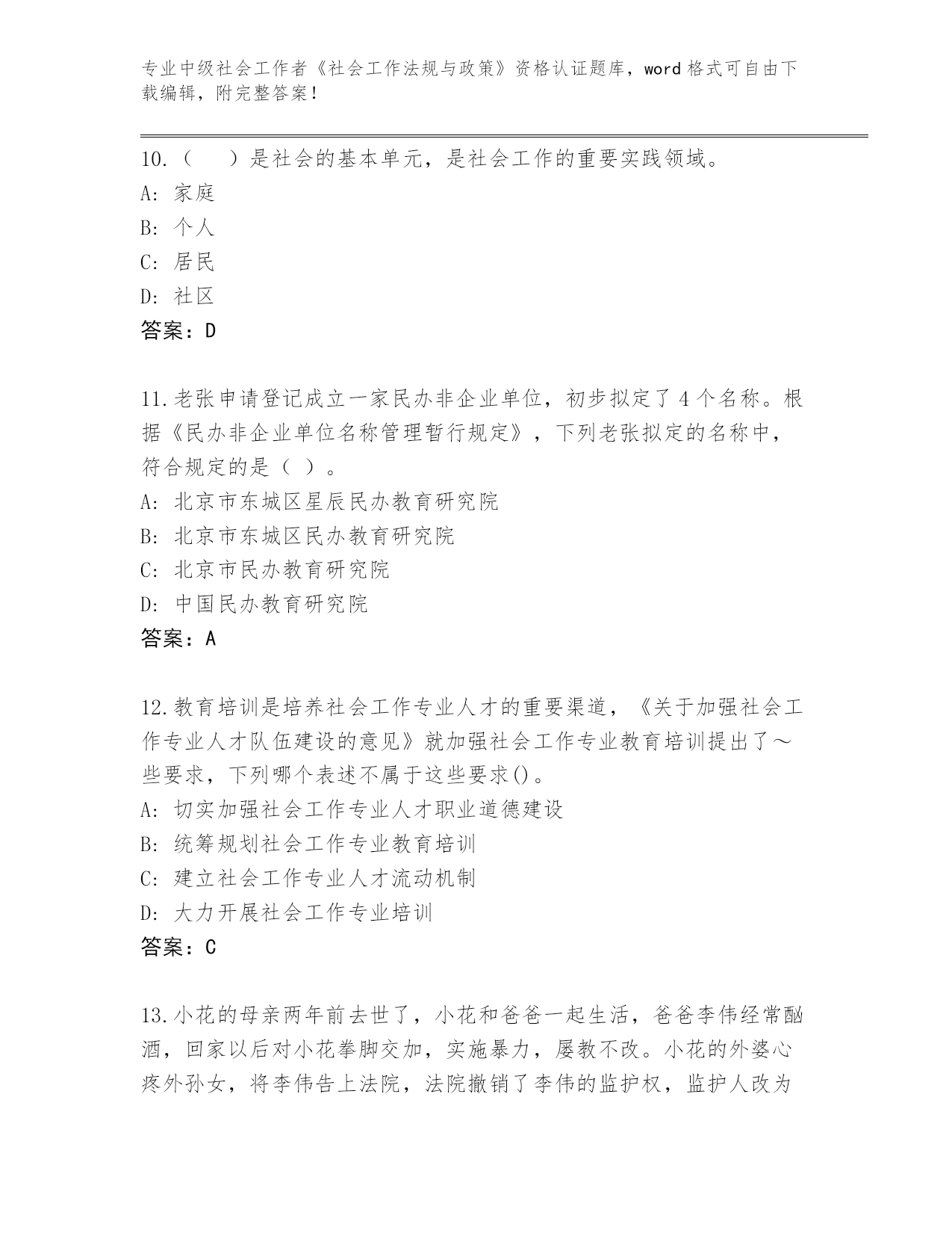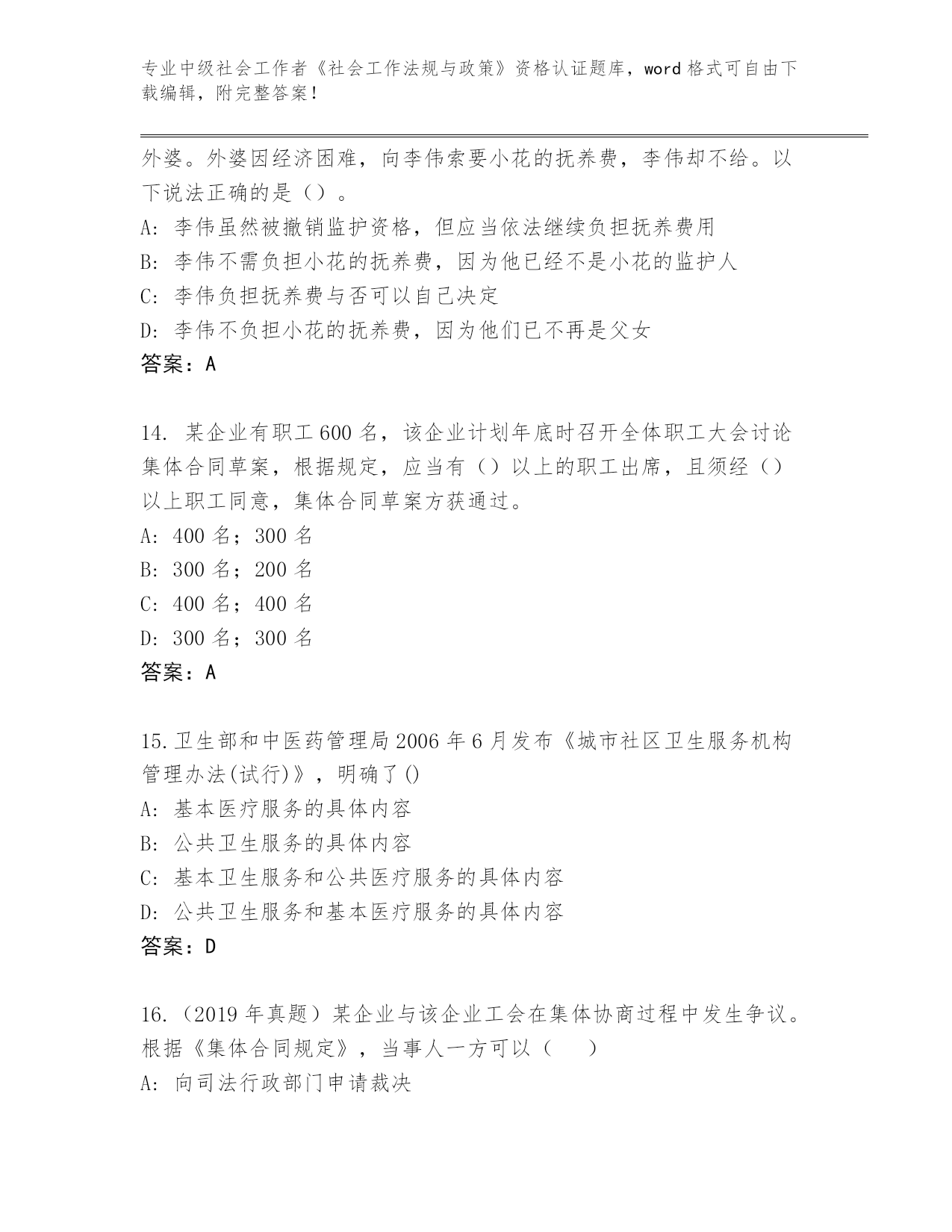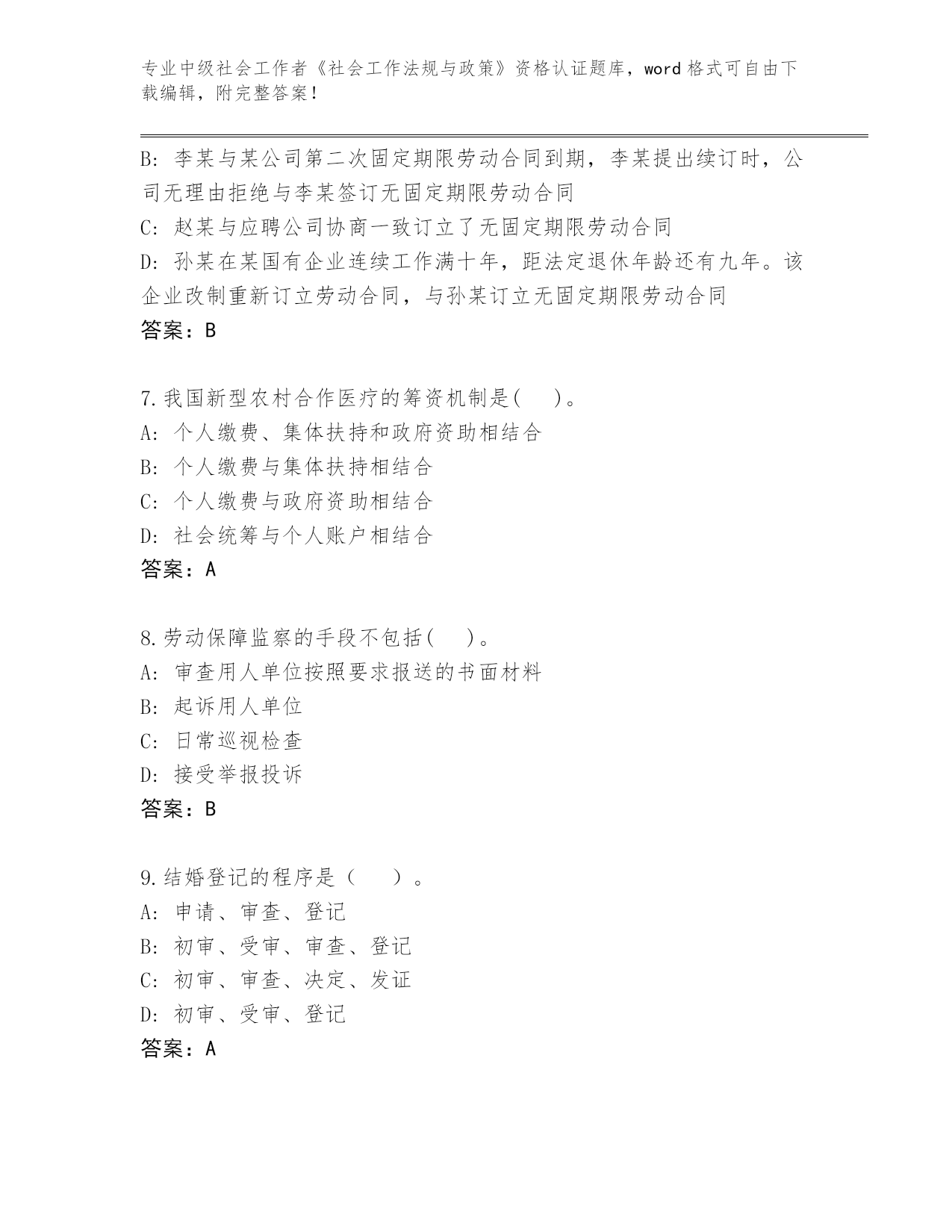 专业中级社会工作者《社会工作法规与政策》资格认证题库,word格式可自由下载编辑,附完整答案!河南省伊川县2024年中级社会工作者《社会工作法规与政策》资格认证真题题库及答案【易错题】第I部分单选题(100题)1.用人单位不得解除劳动合同的情形不包括()。A:患病或者非因工负伤,在规定的医疗期内的B:在本单位连续工作满十年,且距法定退休年龄不足五年的C:在本单位患职业病并被确认丧失或者部分丧失劳动能力的D:疑似职业病病人在诊断或者医学观察期间的答案:B2.为加快推进社会工作及其人才队伍建设,部分地区开展了政府购买社会工作服务。从社会政策主体角度分析,政府在这些社会过程中扮演了()的角色。A:政策制定者B:资源提供者C:政策实施者D:政策调整者答案:B3.(2016年)根据《社会救助暂行办法》,国家对符合规定标准的住房困难的最低生活保障家庭、分散供养的特困人员,给予住房救助。下列关于住房救助方式的说法,正确的是()。A:帮助搭建临时住房B:发放住房租赁补贴C:降低购房贷款首付比例D:配租经济适用房答案:B4.医疗保障部门应会同人力资源社会保障、卫生健康等部门定期检查定点医疗机构和定点零售药店提供的医疗服务和收费情况,对医疗服务质量差、医疗行为违规的,()拨付其垫付的资金。A:推迟一个月B:暂缓或停止C:扣除D:延期答案:B5.依夫妻财产制的内容,可分为共同财产制、分别财产制、剩余共同财产制等,所谓共同财产制,依共有的范围不同,可分为一般共同制、动产及所得共同制、所得共同制、劳动所得共同制等形式。我国法定财产制是()。A:劳动所得共同制B:一般共同制C:婚后所得共同制D:动产及所得共同制答案:C6.根据《劳动合同法》,下列关于当事人订立无固定期限劳动合同的做法,错误的是()。A:钱某在某公司连续工作满十年,与该公司签订了无固定期限劳动合同B:李某与某公司第二次固定期限劳动合同到期,李某提出续订时,公司无理由拒绝与李某签订无固定期限劳动合同C:赵某与应聘公司协商一致订立了无固定期限劳动合同D:孙某在某国有企业连续工作满十年,距法定退休年龄还有九年。该企业改制重新订立劳动合同,与孙某订立无固定期限劳动合同答案:B7.我国新型农村合作医疗的筹资机制是()。A:个人缴费、集体扶持和政府资助相结合B:个人缴费与集体扶持相结合C:个人缴费与政府资助相结合D:社会统筹与个人账户相结合答案:A8.劳动保障监察的手段不包括()。A:审查用人单位按照要求报送的书面材料B:起诉用人单位C:日常巡视检查D:接受举报投诉答案:B9.结婚登记的程序是()。A:申请、审查、登记B:初审、受审、审查、登记C:初审、审查、决定、发证D:初审、受审、登记答案:A10.()是社会的基本单元,是社会工作的重要实践领域。A:家庭B:个人C:居民D:社区答案:D11.老张申请登记成立一家民办非企业单位,初步拟定了4个名称。根据《民办非企业单位名称管理暂行规定》,下列老张拟定的名称中,符合规定的是()。A:北京市东城区星辰民办教育研究院B:北京市东城区民办教育研究院C:北京市民办教育研究院D:中国民办教育研究院答案:A12.教育培训是培养社会工作专业人才的重要渠道,《关于加强社会工作专业人才队伍建设的意见》就加强社会工作专业教育培训提出了~些要求,下列哪个表述不属于这些要求()。A:切实加强社会工作专业人才职业道德建设B:统筹规划社会工作专业教育培训C:建立社会工作专业人才流动机制D:大力开展社会工作专业培训答案:C13.小花的母亲两年前去世了,小花和爸爸一起生活,爸爸李伟经常酗酒,回家以后对小花拳脚交加,实施暴力,屡教不改。小花的外婆心疼外孙女,将李伟告上法院,法院撤销了李伟的监护权,监护人改为外婆。外婆因经济困难,向李伟索要小花的抚养费,李伟却不给。以下说法正确的是()。A:李伟虽然被撤销监护资格,但应当依法继续负担抚养费用B:李伟不需负担小花的抚养费,因为他已经不是小花的监护人C:李伟负担抚养费与否可以自己决定D:李伟不负担小花的抚养费,因为他们已不再是父女答案:A14.某企业有职工600名,该企业计划年底时召开全体职工大会讨论集体合同草案,根据规定,应当有()以上的职工出席,且须经()以上职工同意,集体合同草案方获通过。A:400名;300名B:300名;200名C:400名;400名D:300名;300名答案:A15.卫生部和中医药管理局2006年6月发布《城市社区卫生服务机构管理办法(试行)》,明确了()A:基本医疗服务的具体内容B:公共卫生服务的具体内容C:基本卫生服务和公共医疗服务的具体内容D:公共卫生服务和基本医疗服务的具体内容答案:D16.(2019年真题)某企业与该企业工会在集体协商过程中发生争议。根据《集体合同规定》,当事人一方可以()A:向司法行政部