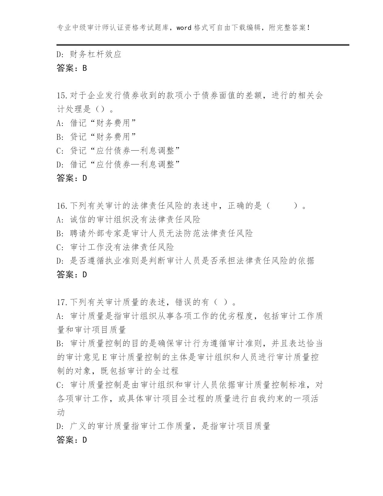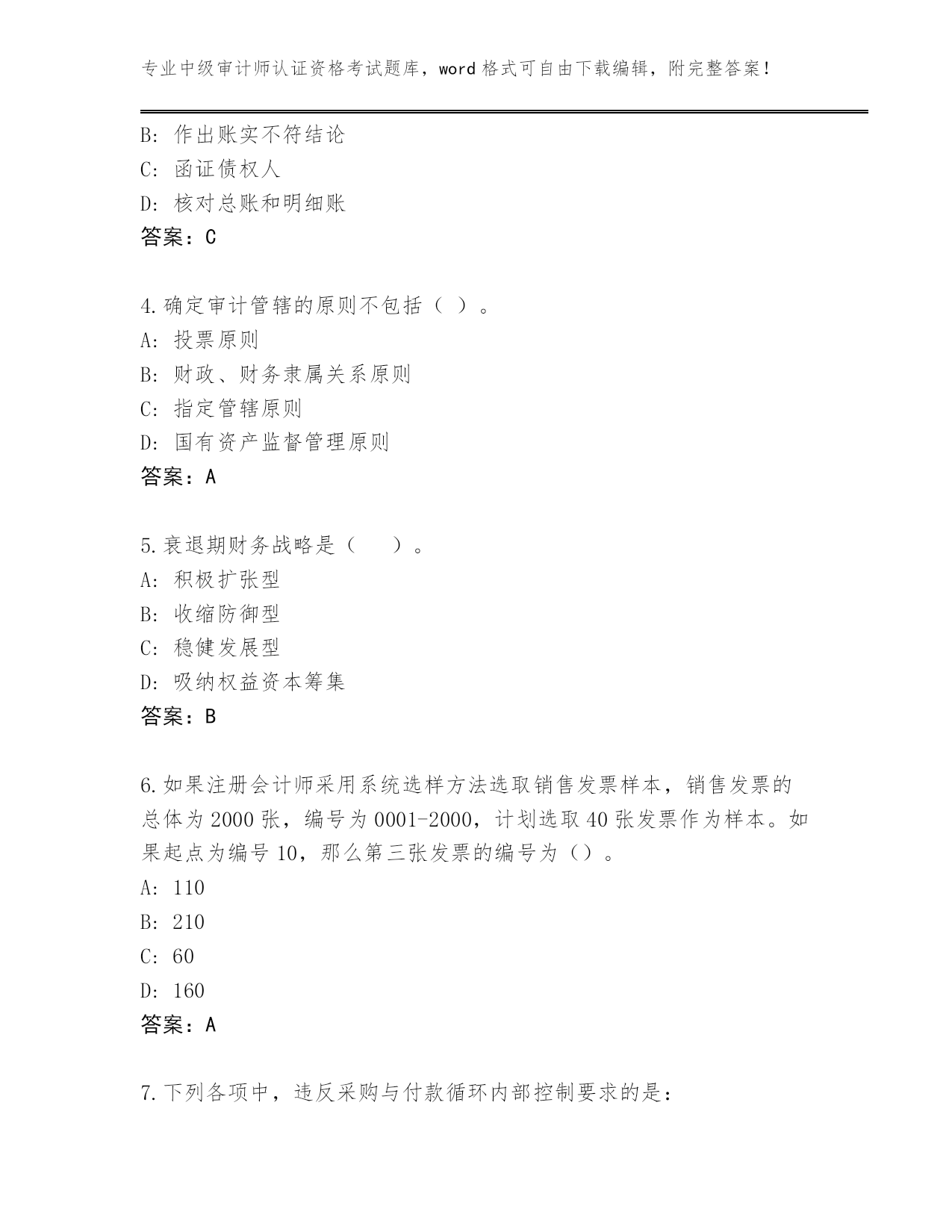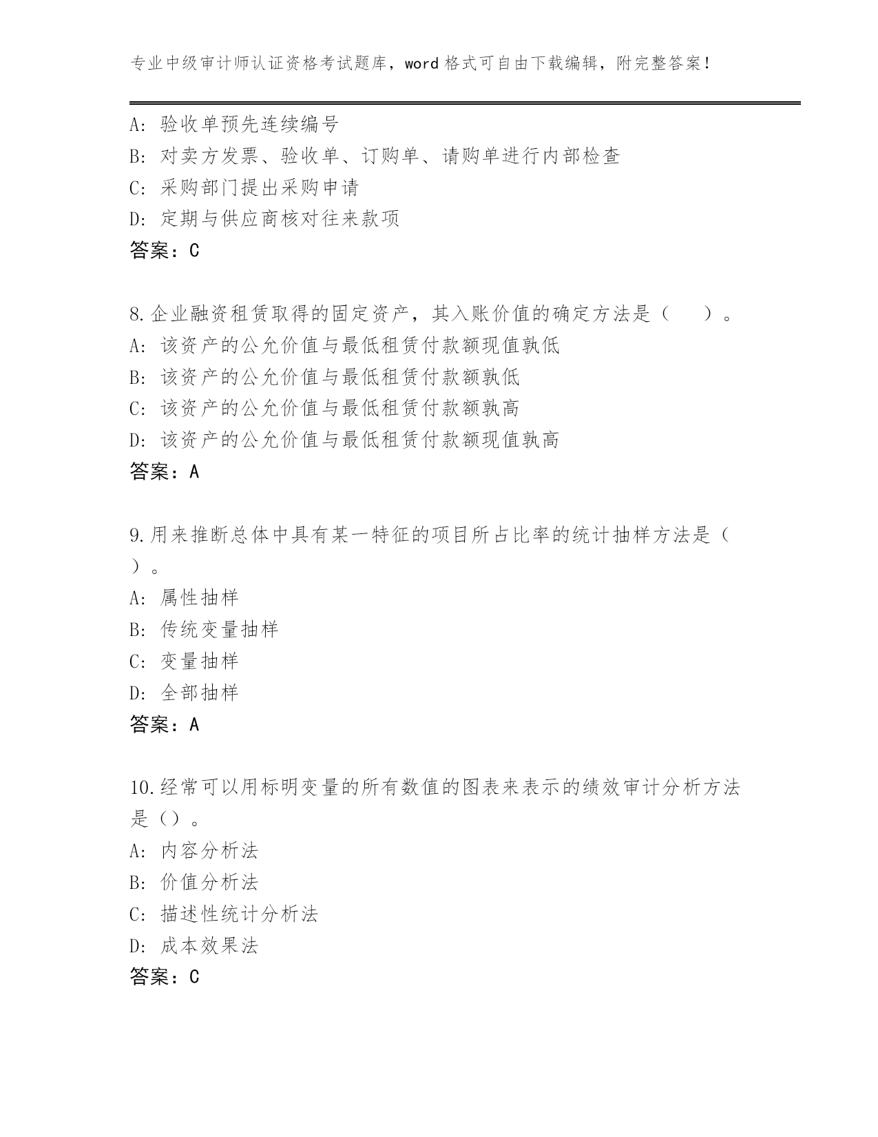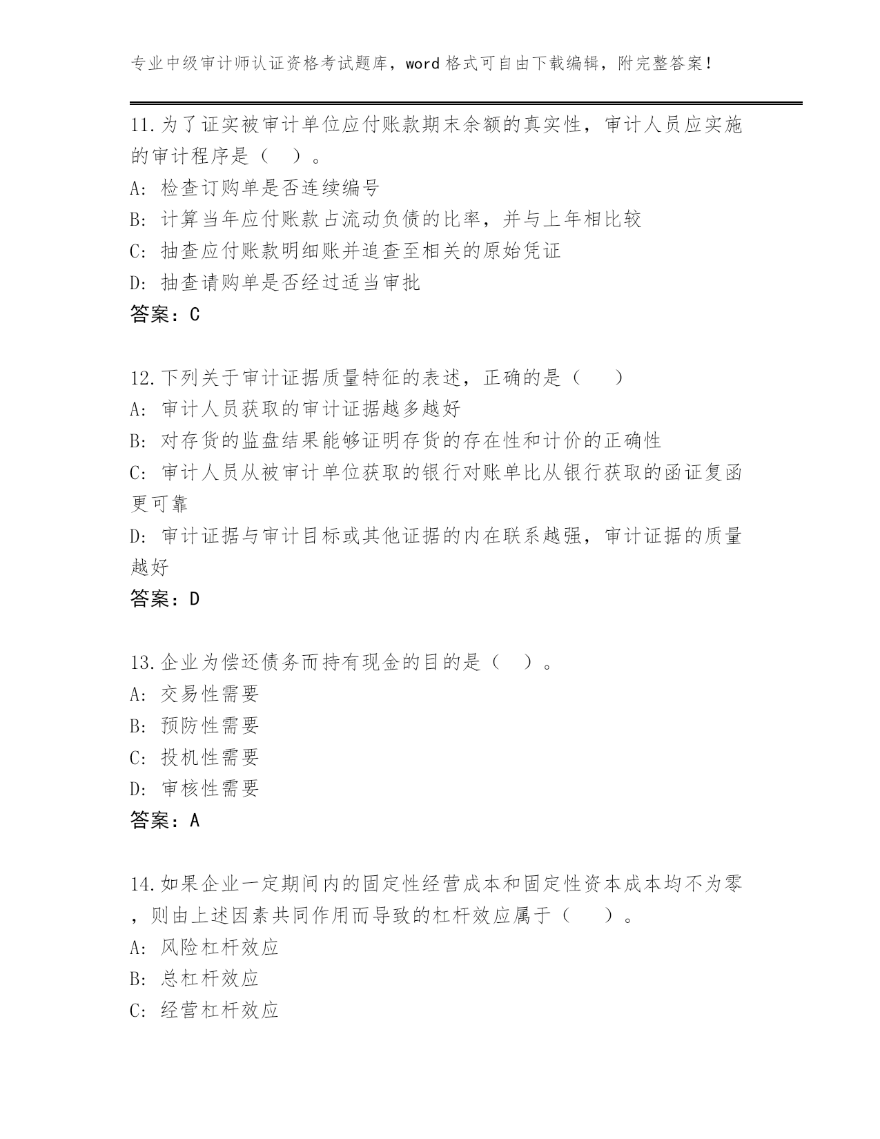 专业中级审计师认证资格考试题库,word格式可自由下载编辑,附完整答案!湖南省隆回县2024年中级审计师认证资格考试真题及参考答案(预热题)第I部分单选题(100题)1.甲公司2011年10月承接了一项安装劳务,合同总收入为1000万元,合同预计总成本为500万元,合同价款已收取,甲公司采用完工百分比法确认劳务收入。2011年已经确认400万的收入,至2012年年底,该劳务的完工进度累计为70%。2012年甲公司应确认的劳务收入为()万元。A:300B:1000C:500D:700答案:A2.下列项目中,属于会计估计的是()。A:借款费用的处理,即是采用资本化,还是采用费用化B:无形资产的摊销方法的改变C:投资性房地产的后续计量,即是采用成本模式,还是采用公允价值模式D:固定资产的预计使用寿命和净残值答案:D3.审计人员发现一笔210万元的应付账款账龄2年,经审阅原始单据、询问被审计单位有关人员,均未能有效证实其真实性,审计人员应进一步采取的措施是()A:要求在报表附注中予以说明B:作出账实不符结论C:函证债权人D:核对总账和明细账答案:C4.确定审计管辖的原则不包括()。A:投票原则B:财政、财务隶属关系原则C:指定管辖原则D:国有资产监督管理原则答案:A5.衰退期财务战略是()。A:积极扩张型B:收缩防御型C:稳健发展型D:吸纳权益资本筹集答案:B6.如果注册会计师采用系统选样方法选取销售发票样本,销售发票的总体为2000张,编号为0001-2000,计划选取40张发票作为样本。如果起点为编号10,那么第三张发票的编号为()。A:110B:210C:60D:160答案:A7.下列各项中,违反采购与付款循环内部控制要求的是:A:验收单预先连续编号B:对卖方发票、验收单、订购单、请购单进行内部检查C:采购部门提出采购申请D:定期与供应商核对往来款项答案:C8.企业融资租赁取得的固定资产,其入账价值的确定方法是()。A:该资产的公允价值与最低租赁付款额现值孰低B:该资产的公允价值与最低租赁付款额孰低C:该资产的公允价值与最低租赁付款额孰高D:该资产的公允价值与最低租赁付款额现值孰高答案:A9.用来推断总体中具有某一特征的项目所占比率的统计抽样方法是()。A:属性抽样B:传统变量抽样C:变量抽样D:全部抽样答案:A10.经常可以用标明变量的所有数值的图表来表示的绩效审计分析方法是()。A:内容分析法B:价值分析法C:描述性统计分析法D:成本效果法答案:C11.为了证实被审计单位应付账款期末余额的真实性,审计人员应实施的审计程序是()。A:检查订购单是否连续编号B:计算当年应付账款占流动负债的比率,并与上年相比较C:抽查应付账款明细账并追查至相关的原始凭证D:抽查请购单是否经过适当审批答案:C12.下列关于审计证据质量特征的表述,正确的是()A:审计人员获取的审计证据越多越好B:对存货的监盘结果能够证明存货的存在性和计价的正确性C:审计人员从被审计单位获取的银行对账单比从银行获取的函证复函更可靠D:审计证据与审计目标或其他证据的内在联系越强,审计证据的质量越好答案:D13.企业为偿还债务而持有现金的目的是()。A:交易性需要B:预防性需要C:投机性需要D:审核性需要答案:A14.如果企业一定期间内的固定性经营成本和固定性资本成本均不为零,则由上述因素共同作用而导致的杠杆效应属于()。A:风险杠杆效应B:总杠杆效应C:经营杠杆效应D:财务杠杆效应答案:B15.对于企业发行债券收到的款项小于债券面值的差额,进行的相关会计处理是()。A:借记“财务费用”B:贷记“财务费用”C:贷记“应付债券—利息调整”D:借记“应付债券—利息调整”答案:D16.下列有关审计的法律责任风险的表述中,正确的是()。A:诚信的审计组织没有法律责任风险B:聘请外部专家是审计人员无法防范法律责任风险C:审计工作没有法律责任风险D:是否遵循执业准则是判断审计人员是否承担法律责任风险的依据答案:D17.下列有关审计质量的表述,错误的有()。A:审计质量是指审计组织从事各项工作的优劣程度,包括审计工作质量和审计项目质量B:审计质量控制的目的是确保审计行为遵循审计准则,并且表达恰当的审计意见E审计质量控制的主体是审计组织和人员进行审计质量控制的对象,既包括审计的全过程C:审计质量控制是由审计组织和审计人员依据审计质量控制标准,对各项审计工作,或具体审计项目全过程的质量进行自我约束的一项活动D:广义的审计质量指审计工作质量,是指审计项目质量答案:D18.某金店是增值税的一般纳税人,2012年3月采取以旧换新方式销售纯金项链10条,每条新项链的不含税销售额为4000元,收购旧项链的不含税金额为每条2000元,该笔业务的销项税额为()元。A:6800B:5200C:3400D: