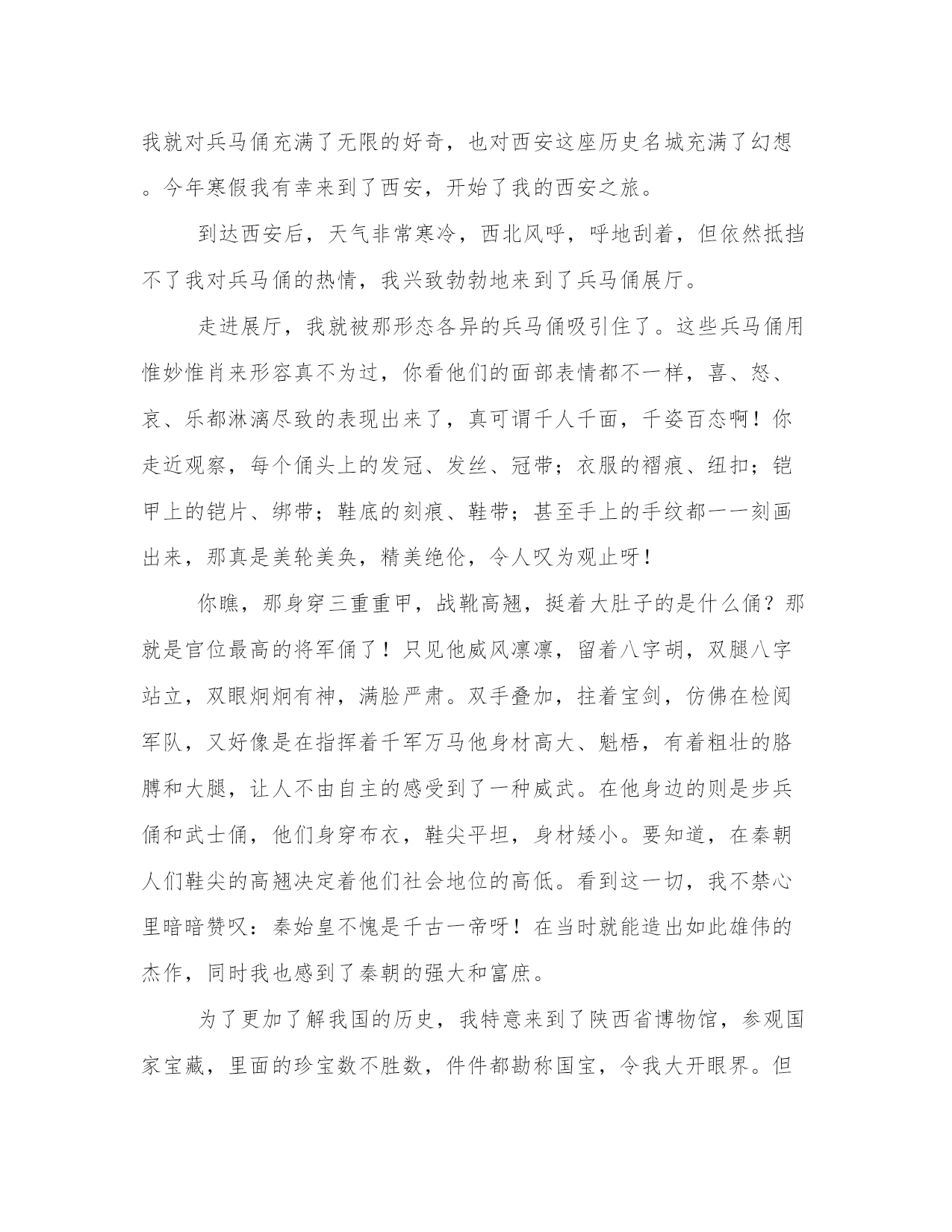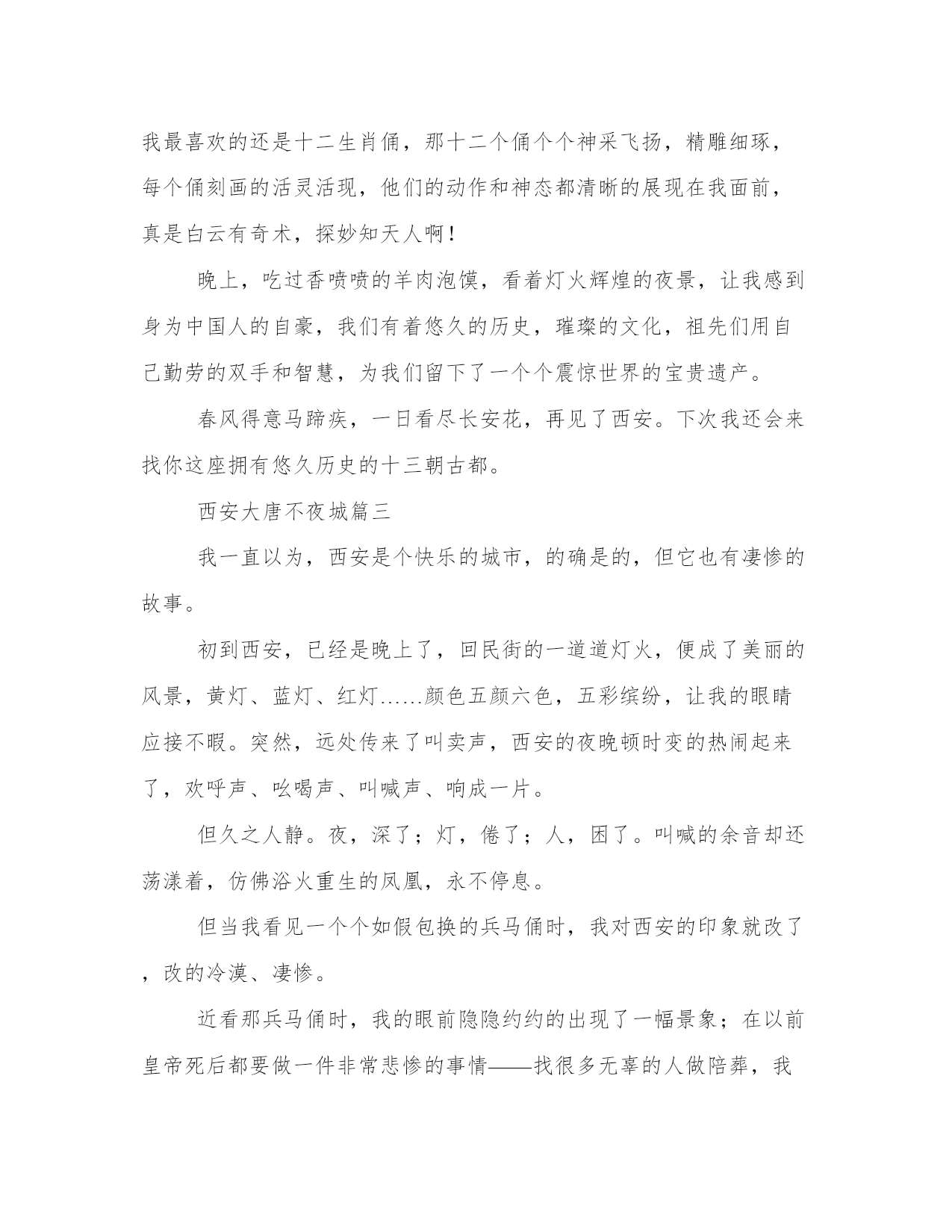 2023年西安大唐不夜城(3篇)在日常学习、工作或生活中,大家总少不了接触作文或者范文吧,通过文章可以把我们那些零零散散的思想,聚集在一块。那么我们该如何写一篇较为完美的范文呢?以下是我为大家搜集的优质范文,仅供参考,一起来看看吧西安大唐不夜城篇一哇,城墙真宽呀,它几乎有15米宽。走呀,走呀。我看见了一座座宏伟的城楼,城墙上还放着几辆大战车呢。走呀,走呀。突然,烈日当空,火辣辣的太阳可把我和爸爸妈妈热坏了。“淇淇,把衣服脱了,鞋子也脱了。““是。那你也脱了,爸爸。”于是,我和爸爸穿着大裤头,光着脚丫子,走在烫乎乎的城墙上。几个非洲黑人阿姨看见了,还冲我们笑了呢。西安大唐不夜城篇二小时候,爸爸常给我讲述兵马俑的故事,他常说,兵马俑拥有悠久的文化历史,它是秦始皇死后陪葬用的偶人,它代表着秦朝最高的陶瓷艺术也代表了秦朝帝国军队的强大,被称赞为世界八大奇迹那时我就对兵马俑充满了无限的好奇,也对西安这座历史名城充满了幻想。今年寒假我有幸来到了西安,开始了我的西安之旅。到达西安后,天气非常寒冷,西北风呼,呼地刮着,但依然抵挡不了我对兵马俑的热情,我兴致勃勃地来到了兵马俑展厅。走进展厅,我就被那形态各异的兵马俑吸引住了。这些兵马俑用惟妙惟肖来形容真不为过,你看他们的面部表情都不一样,喜、怒、哀、乐都淋漓尽致的表现出来了,真可谓千人千面,千姿百态啊!你走近观察,每个俑头上的发冠、发丝、冠带;衣服的褶痕、纽扣;铠甲上的铠片、绑带;鞋底的刻痕、鞋带;甚至手上的手纹都一一刻画出来,那真是美轮美奂,精美绝伦,令人叹为观止呀!你瞧,那身穿三重重甲,战靴高翘,挺着大肚子的是什么俑?那就是官位最高的将军俑了!只见他威风凛凛,留着八字胡,双腿八字站立,双眼炯炯有神,满脸严肃。双手叠加,拄着宝剑,仿佛在检阅军队,又好像是在指挥着千军万马他身材高大、魁梧,有着粗壮的胳膊和大腿,让人不由自主的感受到了一种威武。在他身边的则是步兵俑和武士俑,他们身穿布衣,鞋尖平坦,身材矮小。要知道,在秦朝人们鞋尖的高翘决定着他们社会地位的高低。看到这一切,我不禁心里暗暗赞叹:秦始皇不愧是千古一帝呀!在当时就能造出如此雄伟的杰作,同时我也感到了秦朝的强大和富庶。为了更加了解我国的历史,我特意来到了陕西省博物馆,参观国家宝藏,里面的珍宝数不胜数,件件都勘称国宝,令我大开眼界。但我最喜欢的还是十二生肖俑,那十二个俑个个神采飞扬,精雕细琢,每个俑刻画的活灵活现,他们的动作和神态都清晰的展现在我面前,真是白云有奇术,探妙知天人啊!晚上,吃过香喷喷的羊肉泡馍,看着灯火辉煌的夜景,让我感到身为中国人的自豪,我们有着悠久的历史,璀璨的文化,祖先们用自己勤劳的双手和智慧,为我们留下了一个个震惊世界的宝贵遗产。春风得意马蹄疾,一日看尽长安花,再见了西安。下次我还会来找你这座拥有悠久历史的十三朝古都。西安大唐不夜城篇三我一直以为,西安是个快乐的城市,的确是的,但它也有凄惨的故事。初到西安,已经是晚上了,回民街的一道道灯火,便成了美丽的风景,黄灯、蓝灯、红灯……颜色五颜六色,五彩缤纷,让我的眼睛应接不暇。突然,远处传来了叫卖声,西安的夜晚顿时变的热闹起来了,欢呼声、吆喝声、叫喊声、响成一片。但久之人静。夜,深了;灯,倦了;人,困了。叫喊的余音却还荡漾着,仿佛浴火重生的凤凰,永不停息。但当我看见一个个如假包换的兵马俑时,我对西安的印象就改了,改的冷漠、凄惨。近看那兵马俑时,我的眼前隐隐约约的出现了一幅景象;在以前皇帝死后都要做一件非常悲惨的事情——找很多无辜的人做陪葬,我非常悲愤的想:“唉!以前的皇帝怎能这样,明明是自己一人的事,却要拉着别人一起死,以前到底有没有法律呀!”我看着兵马俑那威严的样子,心里感觉一阵阵剧烈的悲痛,这真是钉在眼前,烙在心里啊!离开西安,每当我想起在西安,陪葬秦始皇的那些壮丽的兵马俑时,我的心还是在隐隐作痛的'感觉!