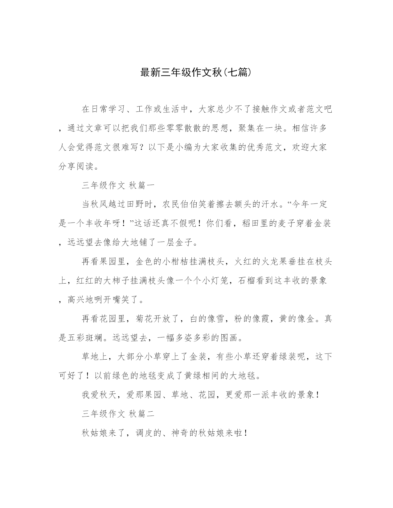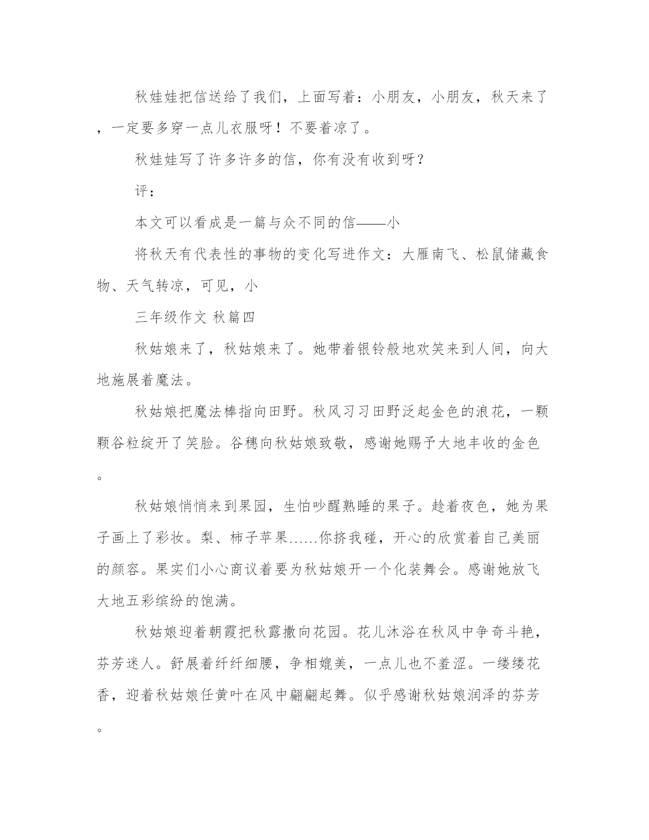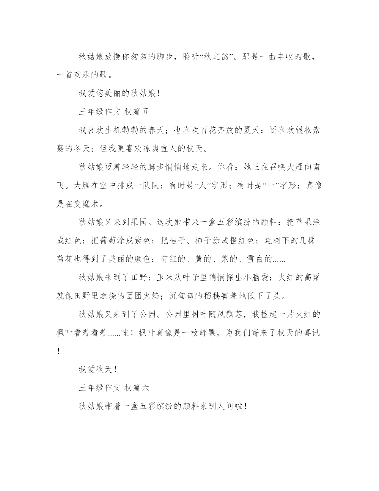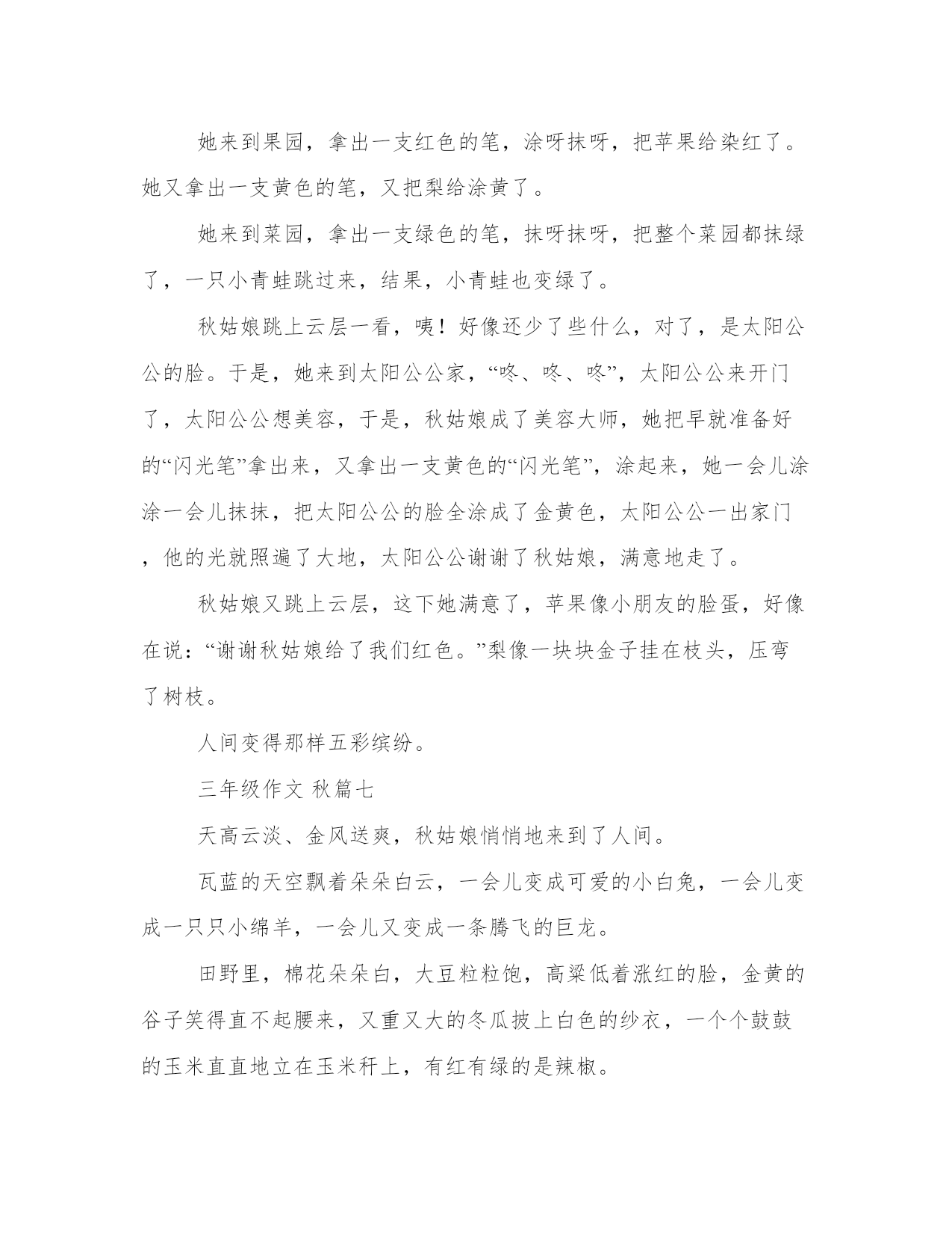 最新三年级作文秋(七篇)在日常学习、工作或生活中,大家总少不了接触作文或者范文吧,通过文章可以把我们那些零零散散的思想,聚集在一块。相信许多人会觉得范文很难写?以下是小编为大家收集的优秀范文,欢迎大家分享阅读。三年级作文秋篇一当秋风越过田野时,农民伯伯笑着擦去额头的汗水。“今年一定是一个丰收年呀!”这话还真不假呢!你们看,稻田里的麦子穿着金装,远远望去像给大地铺了一层金子。再看果园里,金色的小柑桔挂满枝头,火红的火龙果垂挂在枝头上,红红的大柿子挂满枝头像一个个小灯笼,石榴看到这丰收的景象,高兴地咧开嘴笑了。再看花园里,菊花开放了,白的像雪,粉的像霞,黄的像金。真是五彩斑斓。远远望去,一幅多姿多彩的图画。草地上,大部分小草穿上了金装,有些小草还穿着绿装呢,这下可好了!以前绿色的地毯变成了黄绿相间的大地毯。我爱秋天,爱那果园、草地、花园,更爱那一派丰收的景象!三年级作文秋篇二秋姑娘来了,调皮的、神奇的秋姑娘来啦!谁也没想到,她一来就追起了大雁,追呀追呀,一直把大雁追到了南方,才依依不舍地道别。秋姑娘爬到高山上,在山上的寺庙里,她发现有一口大钟,觉得很好玩,她轻轻地碰一下,“当当当”,她一听这奇妙的声音,觉得更好玩了。她停不下来地碰了一下又一下,大钟摇动着身体,发出更响亮的声音,仿佛都可以和雷声比试一下了。秋姑娘跑进果园里,苹果、梨子、香蕉……各种水果一边冲她微笑,一边挣脱树妈妈的怀抱,跳入秋姑娘的裙子里。不一会儿,秋姑娘的裙子就装不下啦。远远望去,秋姑娘就像一棵挂满了各种果子的果树,光看着就已经让人垂涎三尺。最后秋姑娘来到田野,变戏法似的铺下一张金黄的“地毯”,把水果一个个放在“地毯”上,然后开始慢慢地品尝香甜的味道。秋姑娘来了,可是她来也匆匆,去也匆匆。当你还在惊喜感叹,抬眼望时,却只见她那玲珑的背影了……三年级作文秋篇三秋娃娃把信送给了大雁(yàn),上面写着:大雁,大雁,秋天来了,你们应该去南方了。大雁看了后,心想:秋娃娃真是一个好心肠的人呀!于是大雁拍拍翅膀就往南方飞去了。秋娃娃把信送给了松鼠,上面写着:松鼠,松鼠,冬天快来了,你快点去采松果储藏起来过冬吃呀!松鼠看了后,心想:秋娃娃真是一个好人呀!于是它马上就去森林里采松果了。秋娃娃把信送给了我们,上面写着:小朋友,小朋友,秋天来了,一定要多穿一点儿衣服呀!不要着凉了。秋娃娃写了许多许多的信,你有没有收到呀?评:本文可以看成是一篇与众不同的信——小将秋天有代表性的事物的变化写进作文:大雁南飞、松鼠储藏食物、天气转凉,可见,小三年级作文秋篇四秋姑娘来了,秋姑娘来了。她带着银铃般地欢笑来到人间,向大地施展着魔法。秋姑娘把魔法棒指向田野。秋风习习田野泛起金色的浪花,一颗颗谷粒绽开了笑脸。谷穗向秋姑娘致敬,感谢她赐予大地丰收的金色。秋姑娘悄悄来到果园,生怕吵醒熟睡的果子。趁着夜色,她为果子画上了彩妆。梨、柿子苹果……你挤我碰,开心的欣赏着自己美丽的颜容。果实们小心商议着要为秋姑娘开一个化装舞会。感谢她放飞大地五彩缤纷的饱满。秋姑娘迎着朝霞把秋露撒向花园。花儿沐浴在秋风中争奇斗艳,芬芳迷人。舒展着纤纤细腰,争相媲美,一点儿也不羞涩。一缕缕花香,迎着秋姑娘任黄叶在风中翩翩起舞。似乎感谢秋姑娘润泽的芬芳。秋姑娘放慢你匆匆的脚步,聆听“秋之韵”。那是一曲丰收的歌,一首欢乐的歌。我爱您美丽的秋姑娘!三年级作文秋篇五我喜欢生机勃勃的春天;也喜欢百花齐放的夏天;还喜欢银妆素裹的冬天;但我更喜欢凉爽宜人的秋天。秋姑娘迈着轻轻的脚步悄悄地走来。你看:她正在召唤大雁向南飞。大雁在空中排成一队队:有时是“人”字形;有时是“一”字形;真像是在变魔术。秋姑娘又来到果园。这次她带来一盒五彩缤纷的颜料:把苹果涂成红色;把葡萄涂成紫色;把桔子、柿子涂成橙红色;连树下的几株菊花也得到了美丽的颜色:有红的、黄的、紫的、雪白的......秋姑娘来到了田野:玉米从叶子里悄悄探出小脑袋;火红的高粱就像田野里燃烧的团团火焰;沉甸甸的稻穗害羞地低下了头。秋姑娘又来到了公园。公园里树叶随风飘落,我捡起一片火红的枫叶看着看着......哇!枫叶真像是一枚邮票,为我们寄来了秋天的喜讯!我爱秋天!三年级作文秋篇六秋姑娘带着一盒五彩缤纷的颜料来到人间啦!她来到果园,拿出一支红色的笔,涂呀抹呀,把苹果给染红了。她又拿出一支黄色的笔,又把梨给涂黄了。她来到菜园,拿出一支绿色的笔,抹呀抹呀,把整个菜园都抹绿了,一只小青蛙跳过来,结果,小青蛙也变绿了。秋姑娘跳上云层一看,咦!好像还少了些什么,对了,是太阳公公的脸。于是,她来到太阳公公家,“咚、咚、咚”,太阳公公来开门了,太阳公公想美容,于是,秋姑娘成了美容大师,她把早就准备好的“闪光笔”拿出来,又拿出一支黄色的“闪光笔”,涂起来,她一会儿涂涂一会儿抹抹,把太阳公公的脸全涂成了金黄色,太阳公公