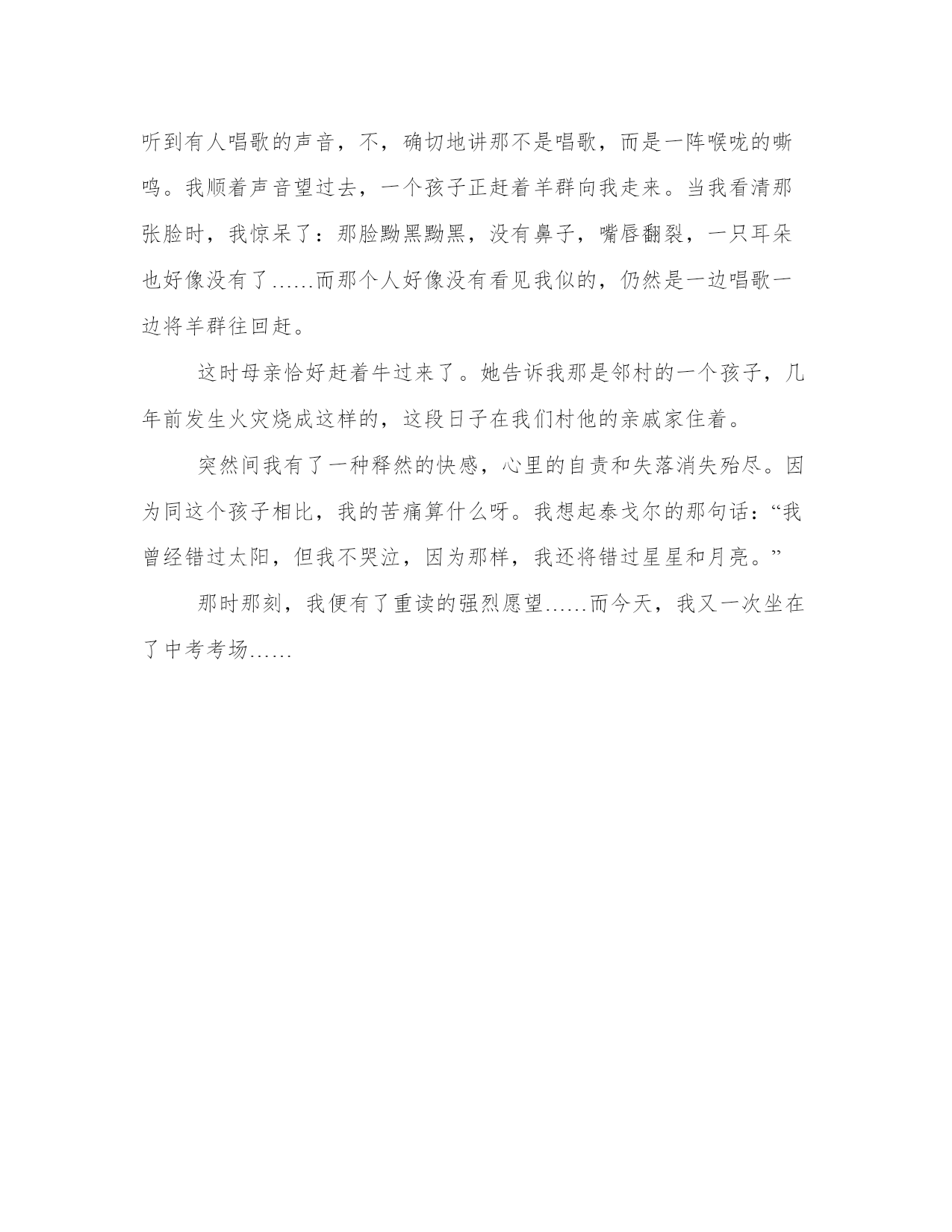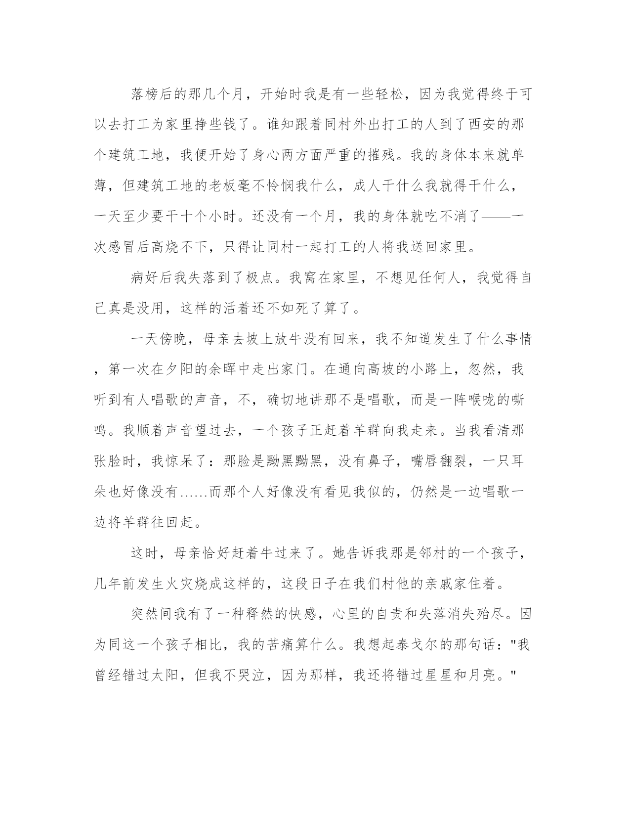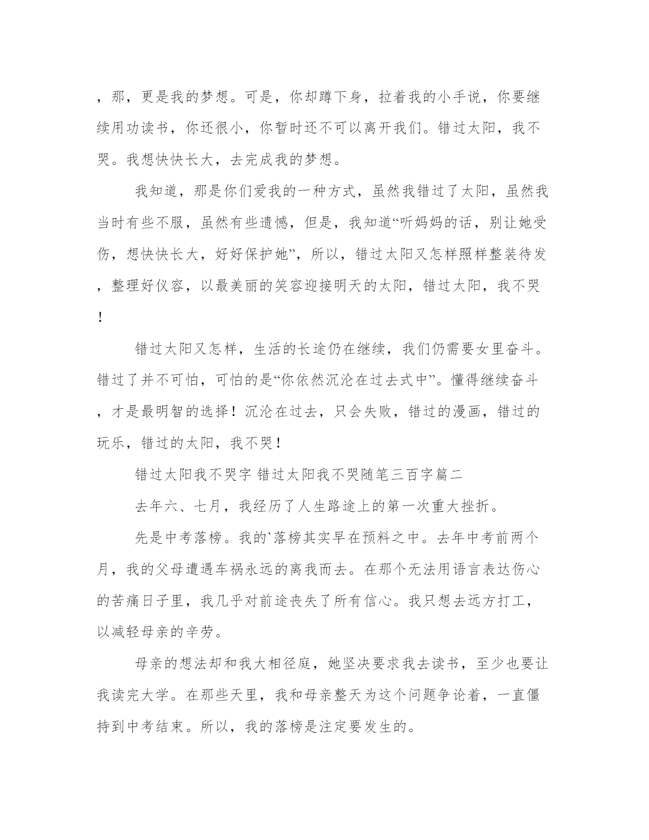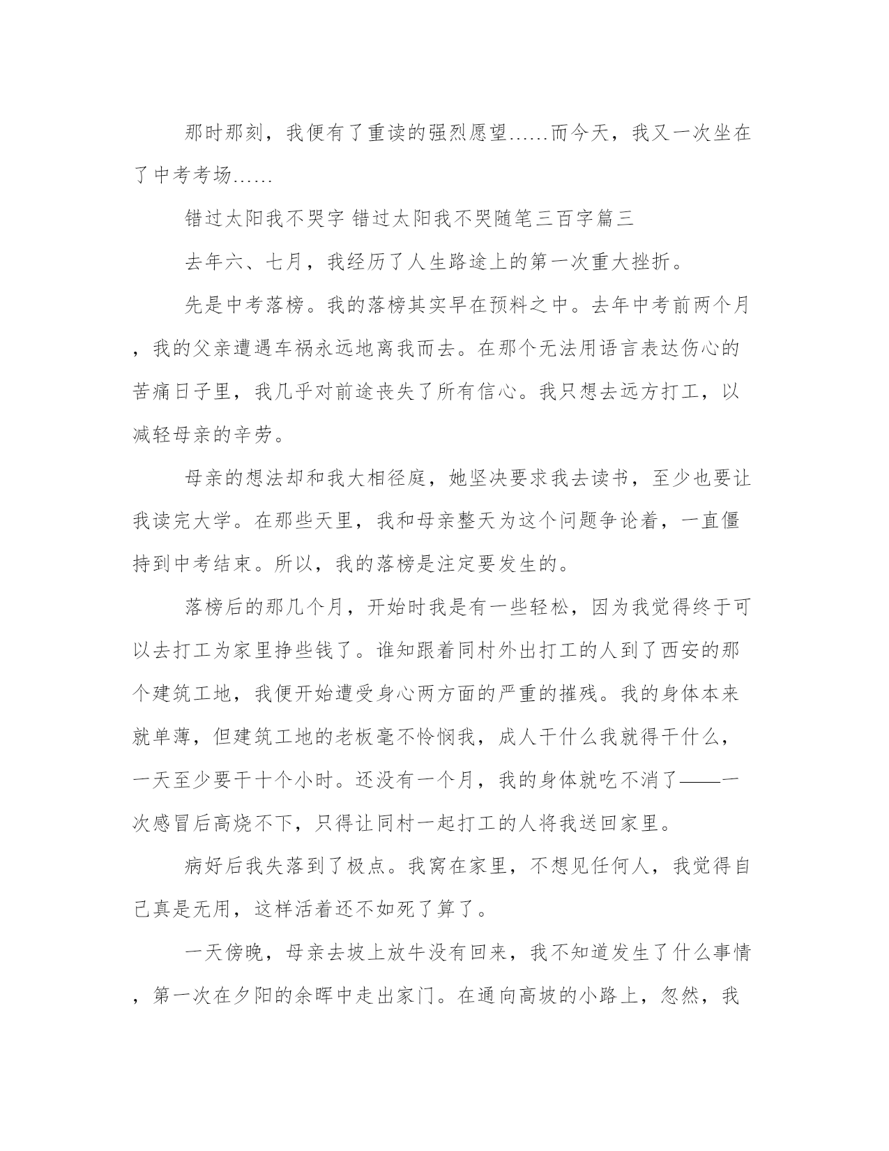 错过太阳我不哭字错过太阳我不哭随笔三百字(3篇)每个人都曾试图在平淡的学习、工作和生活中写一篇文章。写作是培养人的观察、联想、想象、思维和记忆的重要手段。那么我们该如何写一篇较为完美的范文呢?下面是小编为大家收集的优秀范文,供大家参考借鉴,希望可以帮助到有需要的朋友。错过太阳我不哭字错过太阳我不哭随笔三百字篇一春夏秋冬日昼交换,花开花落,时间飞驰,不经意我们错过了。我慌了问你,你还会回来吗?你绷着赤红色的,略带青筋的脸,绝情地说,不。“听妈妈的话,别让她受伤”,小时候,你狠心地剪掉我的辫子,让我留着一个酷酷的男孩发型。你不让我穿裙子,不给我买玩具,你说,你要好好用功读书。好吧,我打小时候,乳牙还没长齐,我就告别玩具,告别玩乐,告别漫画,你给我背上一个书包,我独自去上学堂。别人都在玩乐,而我却要面徒四壁用功读书,错过的太阳,我不哭。“想快快长大”,不知道为什么,我对体育情有独钟,一接触之后,“便疯狂地爱上了它”,“有着我便有着你,这份情永不变”。“因为爱所以爱”,以至于我每天都要求自己:我要更快,更强,更高。男生可以做到的,女生耶可以做到。正是这种对体育的疯狂很执着,入迷。我很快便得到了一个很好的机会,那便是晴天的太阳,那是我的骄傲,那,更是我的梦想。可是,你却蹲下身,拉着我的小手说,你要继续用功读书,你还很小,你暂时还不可以离开我们。错过太阳,我不哭。我想快快长大,去完成我的梦想。我知道,那是你们爱我的一种方式,虽然我错过了太阳,虽然我当时有些不服,虽然有些遗憾,但是,我知道“听妈妈的话,别让她受伤,想快快长大,好好保护她”,所以,错过太阳又怎样照样整装待发,整理好仪容,以最美丽的笑容迎接明天的太阳,错过太阳,我不哭!错过太阳又怎样,生活的长途仍在继续,我们仍需要女里奋斗。错过了并不可怕,可怕的是“你依然沉沦在过去式中”。懂得继续奋斗,才是最明智的选择!沉沦在过去,只会失败,错过的漫画,错过的玩乐,错过的太阳,我不哭!错过太阳我不哭字错过太阳我不哭随笔三百字篇二去年六、七月,我经历了人生路途上的第一次重大挫折。先是中考落榜。我的`落榜其实早在预料之中。去年中考前两个月,我的父母遭遇车祸永远的离我而去。在那个无法用语言表达伤心的苦痛日子里,我几乎对前途丧失了所有信心。我只想去远方打工,以减轻母亲的辛劳。母亲的想法却和我大相径庭,她坚决要求我去读书,至少也要让我读完大学。在那些天里,我和母亲整天为这个问题争论着,一直僵持到中考结束。所以,我的落榜是注定要发生的。落榜后的那几个月,开始时我是有一些轻松,因为我觉得终于可以去打工为家里挣些钱了。谁知跟着同村外出打工的人到了西安的那个建筑工地,我便开始了身心两方面严重的摧残。我的身体本来就单薄,但建筑工地的老板毫不怜悯我什么,成人干什么我就得干什么,一天至少要干十个小时。还没有一个月,我的身体就吃不消了——一次感冒后高烧不下,只得让同村一起打工的人将我送回家里。病好后我失落到了极点。我窝在家里,不想见任何人,我觉得自己真是没用,这样的活着还不如死了算了。一天傍晚,母亲去坡上放牛没有回来,我不知道发生了什么事情,第一次在夕阳的余晖中走出家门。在通向高坡的小路上,忽然,我听到有人唱歌的声音,不,确切地讲那不是唱歌,而是一阵喉咙的嘶鸣。我顺着声音望过去,一个孩子正赶着羊群向我走来。当我看清那张脸时,我惊呆了:那脸是黝黑黝黑,没有鼻子,嘴唇翻裂,一只耳朵也好像没有……而那个人好像没有看见我似的,仍然是一边唱歌一边将羊群往回赶。这时,母亲恰好赶着牛过来了。她告诉我那是邻村的一个孩子,几年前发生火灾烧成这样的,这段日子在我们村他的亲戚家住着。突然间我有了一种释然的快感,心里的自责和失落消失殆尽。因为同这一个孩子相比,我的苦痛算什么。我想起泰戈尔的那句话:"我曾经错过太阳,但我不哭泣,因为那样,我还将错过星星和月亮。"那时那刻,我便有了重读的强烈愿望……而今天,我又一次坐在了中考考场……错过太阳我不哭字错过太阳我不哭随笔三百字篇三去年六、七月,我经历了人生路途上的第一次重大挫折。先是中考落榜。我的落榜其实早在预料之中。去年中考前两个月,我的父亲遭遇车祸永远地离我而去。在那个无法用语言表达伤心的苦痛日子里,我几乎对前途丧失了所有信心。我只想去远方打工,以减轻母亲的辛劳。母亲的想法却和我大相径庭,她坚决要求我去读书,至少也要让我读完大学。在那些天里,我和母亲整天为这个问题争论着,一直僵持到中考结束。所以,我的落榜是注定要发生的。落榜后的那几个月,开始时我是有一些轻松,因为我觉得终于可以去打工为家里挣些钱了。谁知跟着同村外出打工的人到了西安的那个建筑工地,我便开始遭受身心两方面的严重的摧残。我的身体本来就单薄,但建筑工地的老板毫不怜悯我,成人干什么我就得干什么,一天至少要干十个小时。还没有一个月,我的身体就