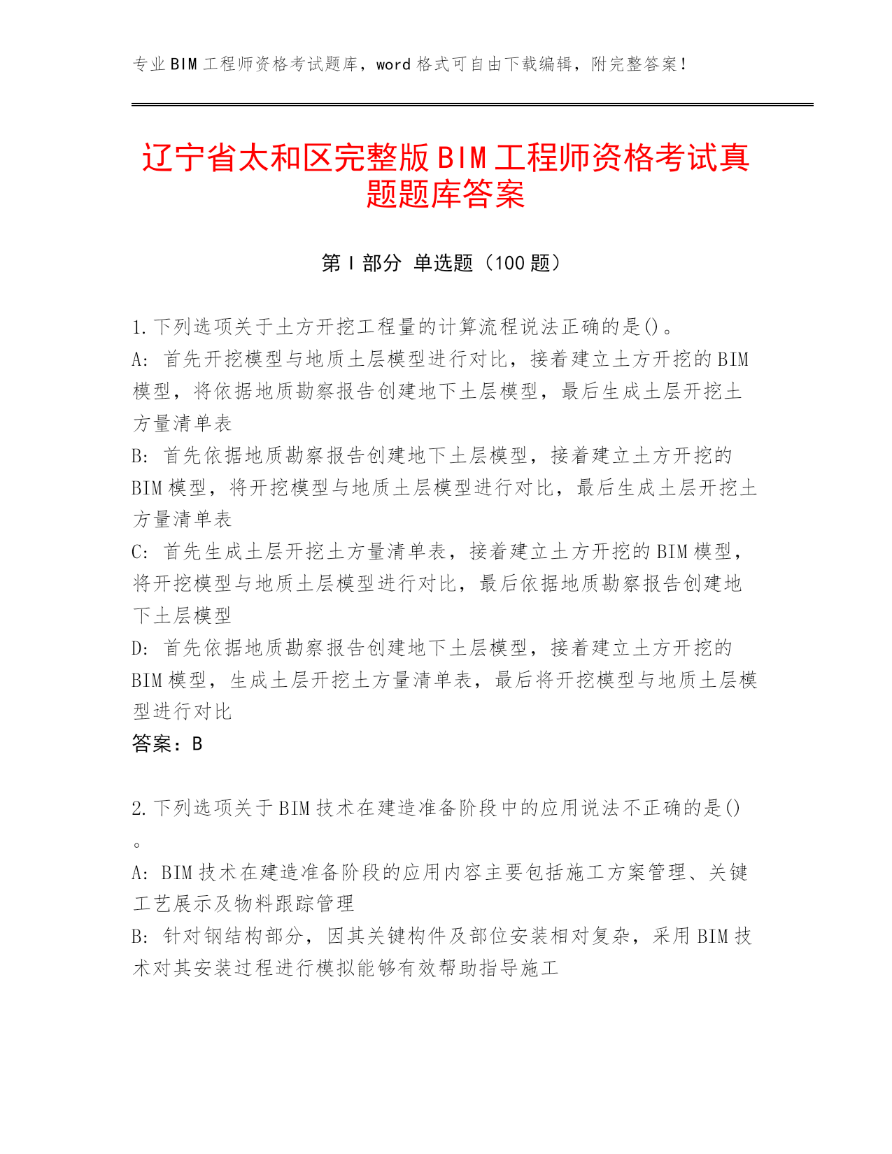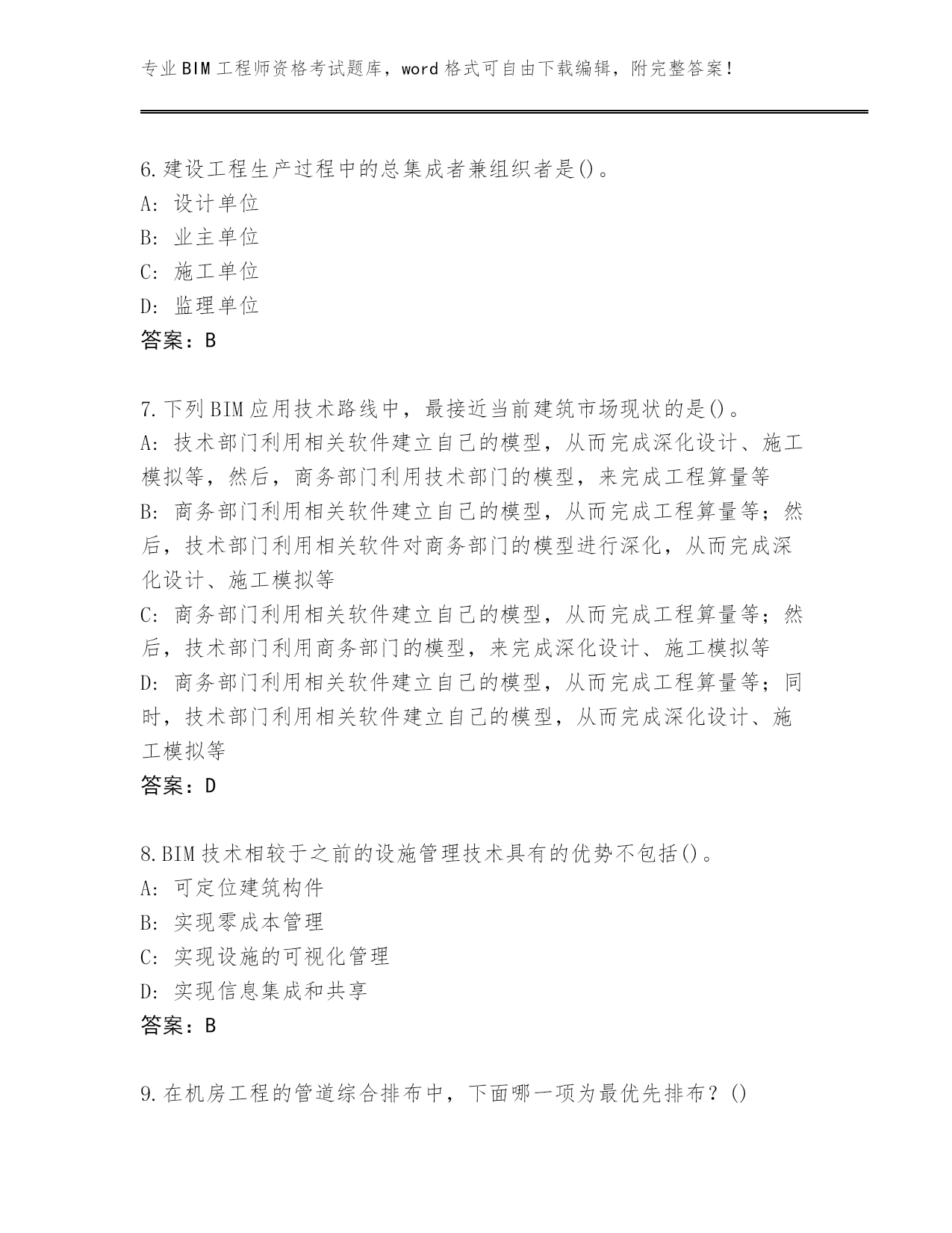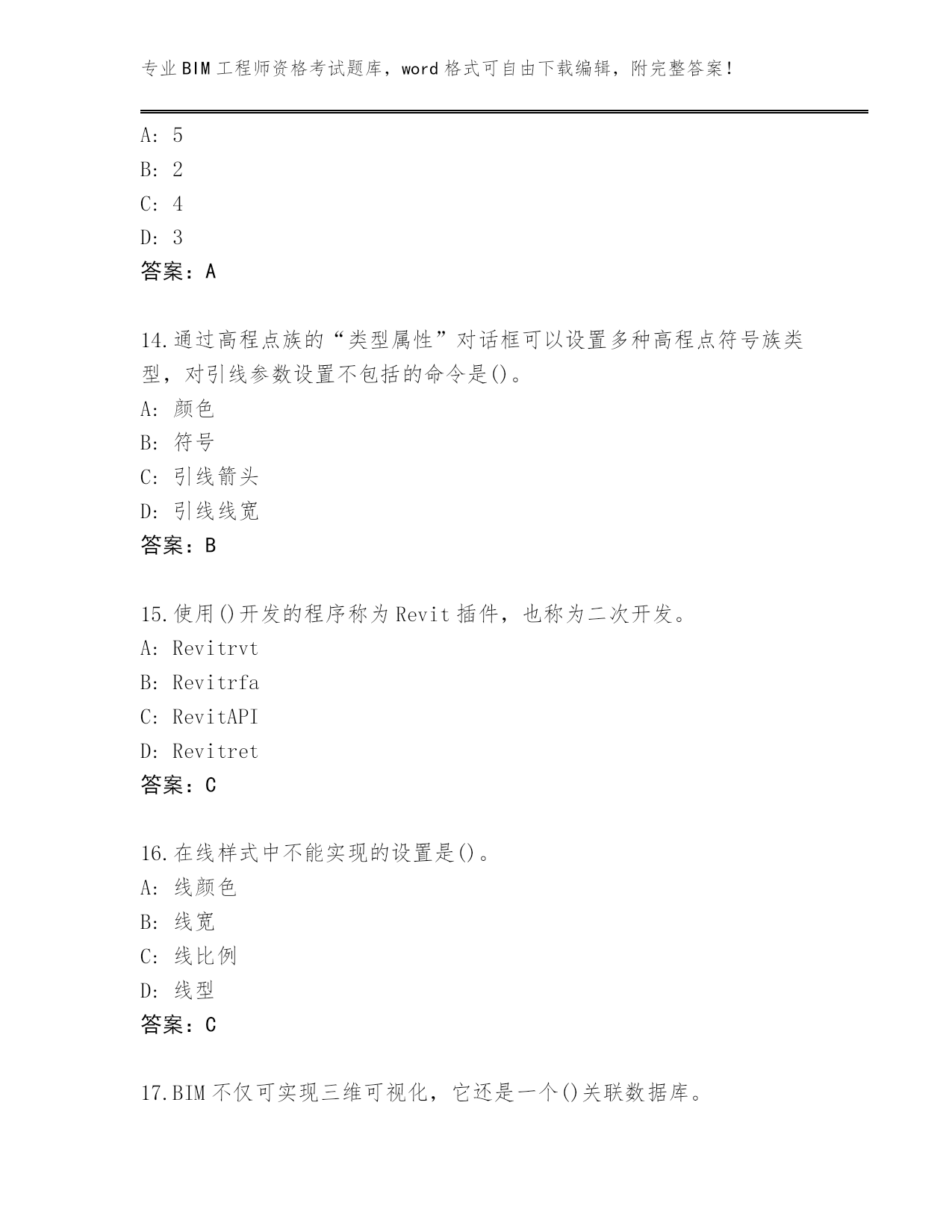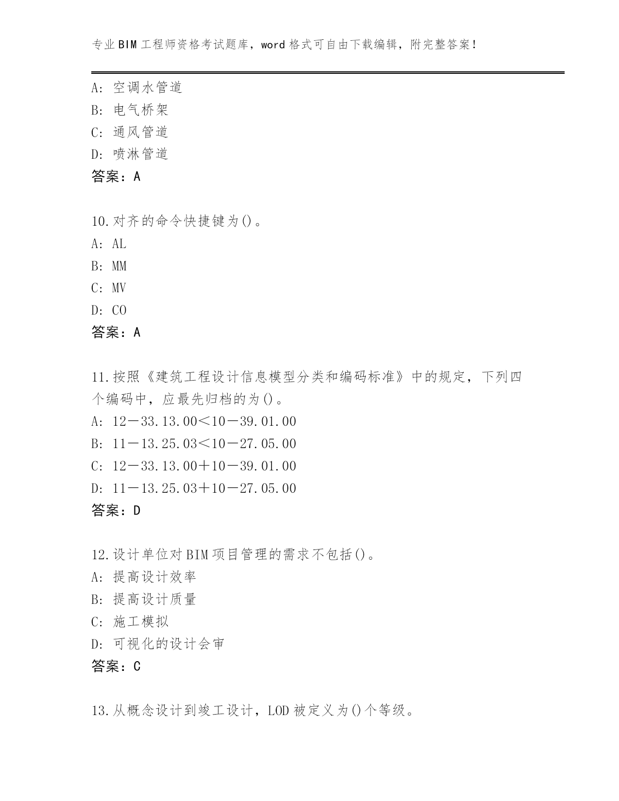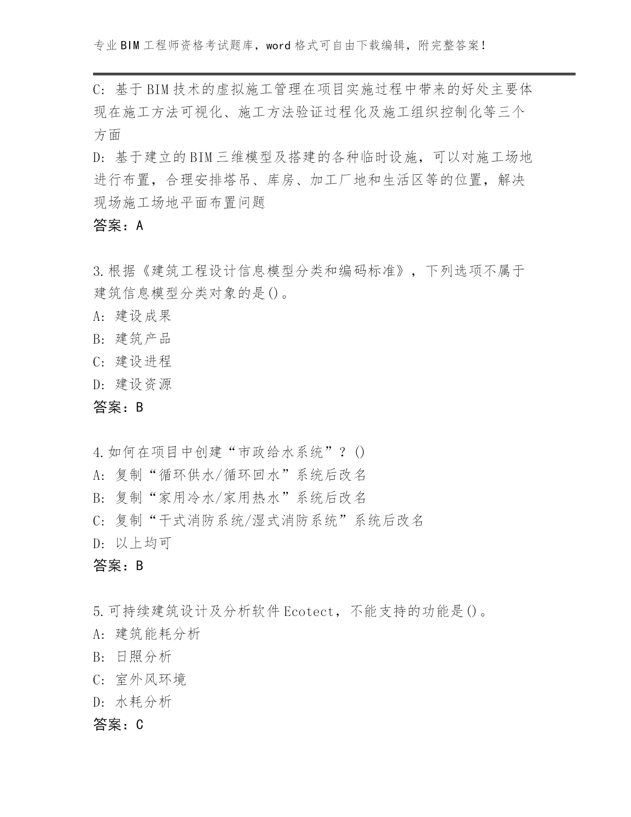 专业BIM工程师资格考试题库,word格式可自由下载编辑,附完整答案!辽宁省太和区完整版BIM工程师资格考试真题题库答案第I部分单选题(100题)1.下列选项关于土方开挖工程量的计算流程说法正确的是()。A:首先开挖模型与地质土层模型进行对比,接着建立土方开挖的BIM模型,将依据地质勘察报告创建地下土层模型,最后生成土层开挖土方量清单表B:首先依据地质勘察报告创建地下土层模型,接着建立土方开挖的BIM模型,将开挖模型与地质土层模型进行对比,最后生成土层开挖土方量清单表C:首先生成土层开挖土方量清单表,接着建立土方开挖的BIM模型,将开挖模型与地质土层模型进行对比,最后依据地质勘察报告创建地下土层模型D:首先依据地质勘察报告创建地下土层模型,接着建立土方开挖的BIM模型,生成土层开挖土方量清单表,最后将开挖模型与地质土层模型进行对比答案:B2.下列选项关于BIM技术在建造准备阶段中的应用说法不正确的是()。A:BIM技术在建造准备阶段的应用内容主要包括施工方案管理、关键工艺展示及物料跟踪管理B:针对钢结构部分,因其关键构件及部位安装相对复杂,采用BIM技术对其安装过程进行模拟能够有效帮助指导施工C:基于BIM技术的虚拟施工管理在项目实施过程中带来的好处主要体现在施工方法可视化、施工方法验证过程化及施工组织控制化等三个方面D:基于建立的BIM三维模型及搭建的各种临时设施,可以对施工场地进行布置,合理安排塔吊、库房、加工厂地和生活区等的位置,解决现场施工场地平面布置问题答案:A3.根据《建筑工程设计信息模型分类和编码标准》,下列选项不属于建筑信息模型分类对象的是()。A:建设成果B:建筑产品C:建设进程D:建设资源答案:B4.如何在项目中创建“市政给水系统”?()A:复制“循环供水/循环回水”系统后改名B:复制“家用冷水/家用热水”系统后改名C:复制“干式消防系统/湿式消防系统”系统后改名D:以上均可答案:B5.可持续建筑设计及分析软件Ecotect,不能支持的功能是()。A:建筑能耗分析B:日照分析C:室外风环境D:水耗分析答案:C6.建设工程生产过程中的总集成者兼组织者是()。A:设计单位B:业主单位C:施工单位D:监理单位答案:B7.下列BIM应用技术路线中,最接近当前建筑市场现状的是()。A:技术部门利用相关软件建立自己的模型,从而完成深化设计、施工模拟等,然后,商务部门利用技术部门的模型,来完成工程算量等B:商务部门利用相关软件建立自己的模型,从而完成工程算量等;然后,技术部门利用相关软件对商务部门的模型进行深化,从而完成深化设计、施工模拟等C:商务部门利用相关软件建立自己的模型,从而完成工程算量等;然后,技术部门利用商务部门的模型,来完成深化设计、施工模拟等D:商务部门利用相关软件建立自己的模型,从而完成工程算量等;同时,技术部门利用相关软件建立自己的模型,从而完成深化设计、施工模拟等答案:D8.BIM技术相较于之前的设施管理技术具有的优势不包括()。A:可定位建筑构件B:实现零成本管理C:实现设施的可视化管理D:实现信息集成和共享答案:B9.在机房工程的管道综合排布中,下面哪一项为最优先排布?()A:空调水管道B:电气桥架C:通风管道D:喷淋管道答案:A10.对齐的命令快捷键为()。A:ALB:MMC:MVD:CO答案:A11.按照《建筑工程设计信息模型分类和编码标准》中的规定,下列四个编码中,应最先归档的为()。A:12-33.13.00<10-39.01.00B:11-13.25.03<10-27.05.00C:12-33.13.00+10-39.01.00D:11-13.25.03+10-27.05.00答案:D12.设计单位对BIM项目管理的需求不包括()。A:提高设计效率B:提高设计质量C:施工模拟D:可视化的设计会审答案:C13.从概念设计到竣工设计,LOD被定义为()个等级。A:5B:2C:4D:3答案:A14.通过高程点族的“类型属性”对话框可以设置多种高程点符号族类型,对引线参数设置不包括的命令是()。A:颜色B:符号C:引线箭头D:引线线宽答案:B15.使用()开发的程序称为Revit插件,也称为二次开发。A:RevitrvtB:RevitrfaC:RevitAPID:Revitret答案:C16.在线样式中不能实现的设置是()。A:线颜色B:线宽C:线比例D:线型答案:C17.BIM不仅可实现三维可视化,它还是一个()关联数据库。A:4B:3DC:5DD:6D答案:D18.以下不属于冲突检查的工作的是()。A:建筑与结构专业B:设备内部各专业C:设备与室外装修D:结构与设备专业答案:C19.下列是Revit提供的规程的是?()A:卫浴B:暖通C:给排水D:设备答案:A20.BIM的概念()。A:以