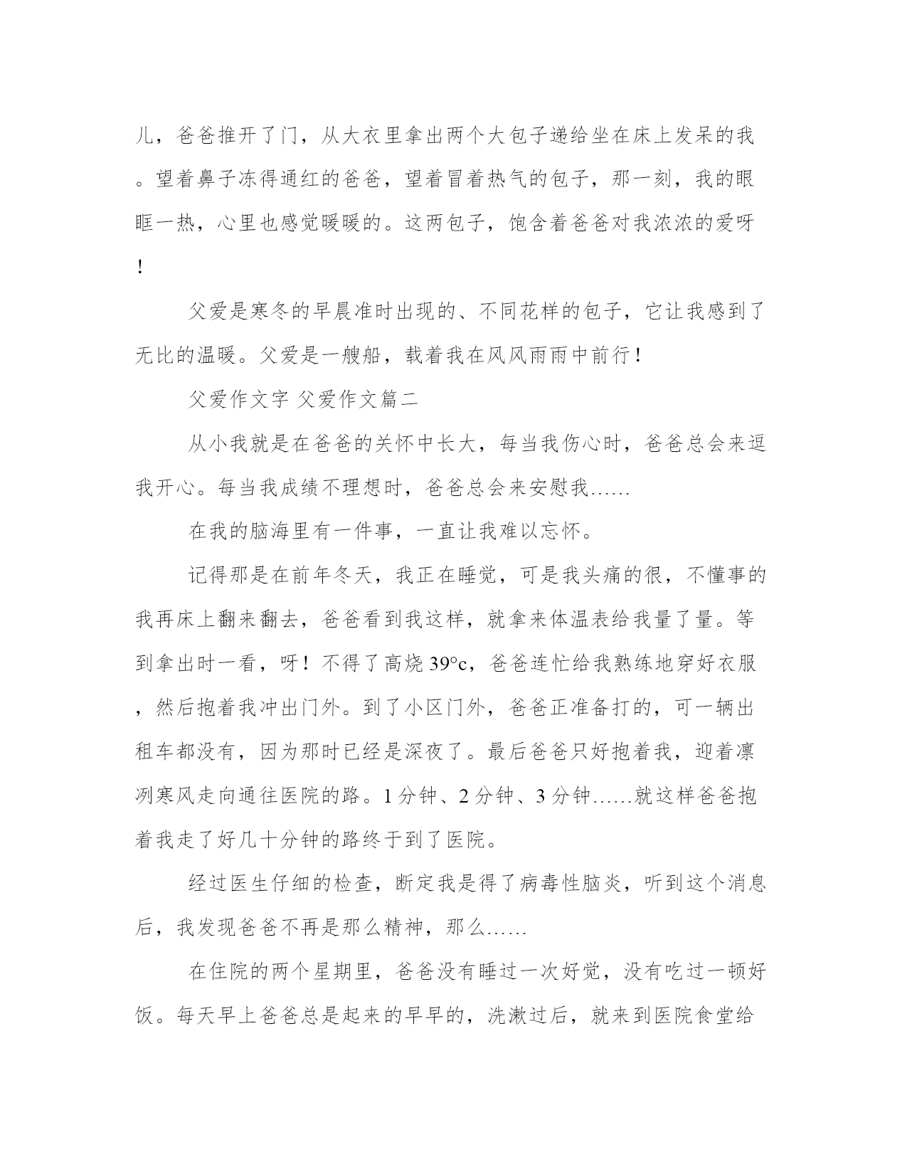 最新父爱作文字父爱作文大全每个人都曾试图在平淡的学习、工作和生活中写一篇文章。写作是培养人的观察、联想、想象、思维和记忆的重要手段。范文怎么写才能发挥它最大的作用呢?这里我整理了一些优秀的范文,希望对大家有所帮助,下面我们就来了解一下吧。父爱作文字父爱作文篇一一年年底,邻里乡亲都送了许多年糕给我们家,足足塞满了冰箱的一个抽屉。没办法的妈妈为了尽快将它们解决掉,一日三餐都给我们吃年糕汤。这样的.伙食,大人们还行,我就不乐意了,但妈妈根本就不听我的意见,天天照样煮着年糕汤。一天早上,我一想到起床后迎接我的又是妈妈煮的年糕汤,就赖在床上不起来了。可是,没想到的是,就在这时房间门被推开了,推开门的不是妈妈,而是爸爸。爸爸提着两个热气腾腾的包子,默默走到我的床边,“快点儿吃,别让它凉了。”虽然爸爸说这话很平淡,但是他的话语就如同那热腾腾的包子一样吸引着我、诱惑了我。从那以后,爸爸每天都会给我买包子,怕我吃腻了,每天买的还是不同馅儿的。一天,外面下起了雪,我知道爸爸今天不会再去给我买包子了。我坐在床上透过窗子看着外面的雪景,正踌躇着要不要起床时,突然,我看到了一个穿着绿色军大衣的人朝我家跑来了,是爸爸!不一会儿,爸爸推开了门,从大衣里拿出两个大包子递给坐在床上发呆的我。望着鼻子冻得通红的爸爸,望着冒着热气的包子,那一刻,我的眼眶一热,心里也感觉暖暖的。这两包子,饱含着爸爸对我浓浓的爱呀!父爱是寒冬的早晨准时出现的、不同花样的包子,它让我感到了无比的温暖。父爱是一艘船,载着我在风风雨雨中前行!父爱作文字父爱作文篇二从小我就是在爸爸的关怀中长大,每当我伤心时,爸爸总会来逗我开心。每当我成绩不理想时,爸爸总会来安慰我……在我的脑海里有一件事,一直让我难以忘怀。记得那是在前年冬天,我正在睡觉,可是我头痛的很,不懂事的我再床上翻来翻去,爸爸看到我这样,就拿来体温表给我量了量。等到拿出时一看,呀!不得了高烧39°c,爸爸连忙给我熟练地穿好衣服,然后抱着我冲出门外。到了小区门外,爸爸正准备打的,可一辆出租车都没有,因为那时已经是深夜了。最后爸爸只好抱着我,迎着凛冽寒风走向通往医院的路。1分钟、2分钟、3分钟……就这样爸爸抱着我走了好几十分钟的路终于到了医院。经过医生仔细的检查,断定我是得了病毒性脑炎,听到这个消息后,我发现爸爸不再是那么精神,那么……在住院的两个星期里,爸爸没有睡过一次好觉,没有吃过一顿好饭。每天早上爸爸总是起来的早早的,洗漱过后,就来到医院食堂给我买好了早餐,等我一醒来时就可以吃到美味的早餐。每当到了晚上时,爸爸也要把我安顿好,才肯睡觉;但到那时都已经是深夜了,睡不了几个小时,就又要起来给我买早餐。过了漫长的十几天,我终于康复出院了。可爸爸却因为照顾我,白发又增加了几根,皱纹有多出了几条。虽然说世上只有妈妈好,而我却觉得爸爸比妈妈爱我爱的更深,他让我感觉到丝丝的父爱,幽幽的情。