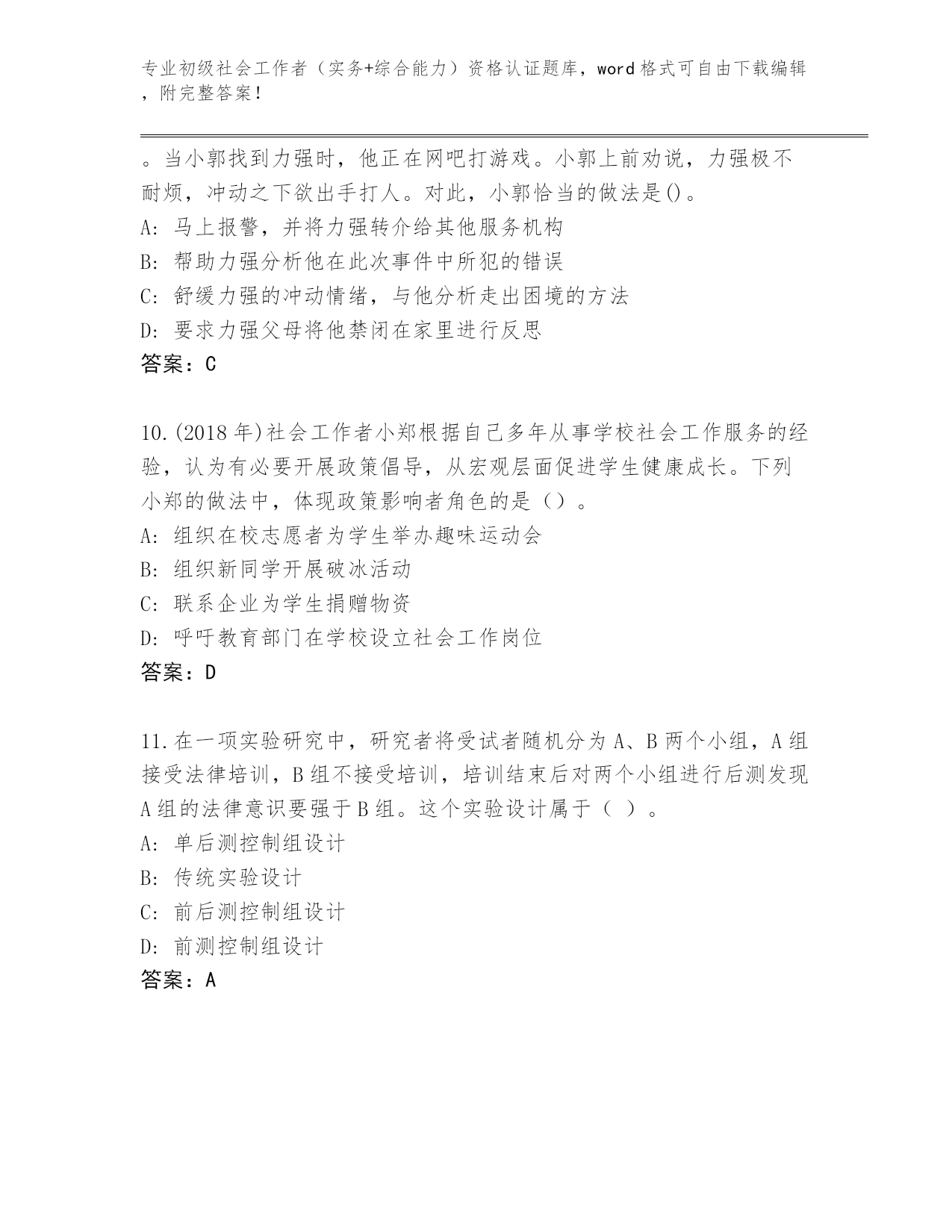 专业初级社会工作者(实务+综合能力)资格认证题库,word格式可自由下载编辑,附完整答案!江苏省连云区2024年初级社会工作者(实务+综合能力)资格认证题库【综合题】第I部分单选题(100题)1.某中学对高二学生进行文理科分班后,部分学生出现了学习成绩下降、情绪波动、同学关系生疏等现象。针对这种情况,社会工作者应该选择的介入方式是()学校社会工作。A:变迁型B:治疗型C:社区型D:康复型答案:B2.新冠肺炎疫情防控常态化以来,社会工作者小王发现,某社区的很多老年人由于不会使用智能技术,在购物、出行和就医时遇到诸多不便。许多老年人说“我们老了,跟不上时代了,学不会这些新东西啊!小王计划设计协助老人跨越,数字鸿沟,的服务项目以解决老年人的上述问题。为此,小王除了需要对造成老年人问题的客观因素进行预估外,还应对造成老年人问题的主观因素加以识别。小王下列做法中属于主观因素识别的是()。A:了解老年人为解决问题所做的努力B:询问老年人问题发生的时间和地点C:分析老年人处理问题采用的办法D:了解老年人对自己问题的看法答案:D3.某社会工作服务机构总干事在每周一主持召开由各部门负责人参加的例会上,A:协调B:培训C:评估D:授权答案:A4.社会政策是指政府在一定社会价值的指导下,为达到某种社会性的目标而采取的社会性行动的总和。一般而言,社会政策又被称为“社会福利政策”,下面对其最合适的解释是()。A:社会政策以社会关照、社会补偿为原则满足人们的实际需要B:社会政策能够解决问题,维护社会稳定C:社会政策将社会服务与社会管理紧密结合在一起D:社会政策具有社会目标与经济目标相协调的特征答案:A5.可能会出现两极情感反应,即一方面对即将到来的分离产生失落、难过等负面情绪,另一方面也充满兴奋、希望和成就感等正面情绪。以上描述的是社会工作实务通用过程的()阶段。A:计划B:接案C:结案D:预估答案:C6.(2019年)56岁的乔阿姨一直没有工作,主要依靠丈夫的收入生活。两个月前,乔阿姨的丈夫突发心脏病入院治疗,花光了家里所有的积蓄。乔阿姨家的生活难以为继,丈夫的后续治疗也无法维持,乔阿姨为此感到十分焦虑,向社会工作者小魏求助。为帮助乔阿姨的丈夫获得稳定的后续治疗,小魏首先应该()。A:评估乔阿姨家适合申请哪类社会救助项目B:为乔阿姨的丈夫提供个案辅导C:帮助乔阿姨稳定情绪D:帮乔阿姨向有关部门提出低保申请答案:A7.“三人行,必有吾师焉”体现出的人类需要类型是()。A:审美的需要B:学习的需要C:自尊的需要D:爱的需要答案:B8.在社区中,当大部分居民感觉到某些需要与期望不能满足,并把它们说出来时,那便是居民的()。这种需要可能是主观的感受,也可能是基于客观事实而体会出的感受。A:比较性需要B:表达性需要C:规范性需要D:感觉性需要答案:D9.力强15岁,是学校里面的“小霸王”,因对同学有暴力行为,被学校勒令退学。父母找到社会工作者小郭,希望能够帮助力强重返学校。当小郭找到力强时,他正在网吧打游戏。小郭上前劝说,力强极不耐烦,冲动之下欲出手打人。对此,小郭恰当的做法是()。A:马上报警,并将力强转介给其他服务机构B:帮助力强分析他在此次事件中所犯的错误C:舒缓力强的冲动情绪,与他分析走出困境的方法D:要求力强父母将他禁闭在家里进行反思答案:C10.(2018年)社会工作者小郑根据自己多年从事学校社会工作服务的经验,认为有必要开展政策倡导,从宏观层面促进学生健康成长。下列小郑的做法中,体现政策影响者角色的是()。A:组织在校志愿者为学生举办趣味运动会B:组织新同学开展破冰活动C:联系企业为学生捐赠物资D:呼吁教育部门在学校设立社会工作岗位答案:D11.在一项实验研究中,研究者将受试者随机分为A、B两个小组,A组接受法律培训,B组不接受培训,培训结束后对两个小组进行后测发现A组的法律意识要强于B组。这个实验设计属于()。A:单后测控制组设计B:传统实验设计C:前后测控制组设计D:前测控制组设计答案:A12.三个月前杜先生在一次意外事故后被截肢,精神受到很大打击,最近自杀未遂,家人打电话求助社会工作者。社会工作者首先应该()。A:提供居家服务B:联系安装假肢C:进行危机干预D:鉴定残疾等级答案:C13.婴儿轻度腹泻的治疗中正确的是A:用抗生素治疗B:用脱脂奶喂养C:禁食D:使用抗病毒药物答案:B14.11岁男孩,确诊为胰岛素依赖性糖尿病,自测血糖及尿糖,近3个月以来,血糖尿糖均比较正常,今测血红蛋白HbAlc为15%,最适当的判断是A:胰岛素剂量偏高B:糖尿病控制满意C:血糖尿糖测试欠准确D:食物中脂肪含量过高答案:C15.某社会福利机构收养了50名儿童,采用“大孩子帮助小孩子”的管理方式,但在实施过程中却出现了大孩子欺负小孩子的情况。社会工作者计划采取小组