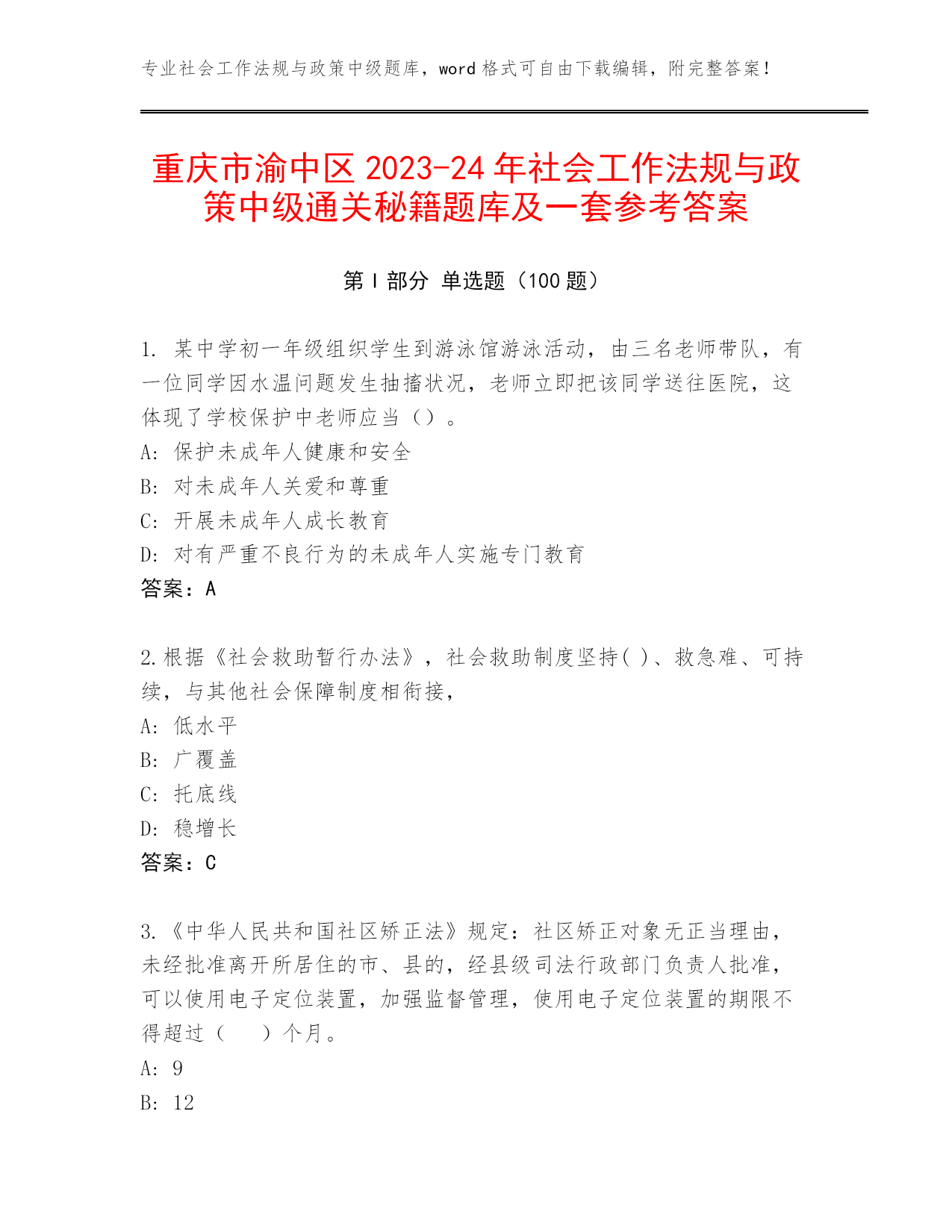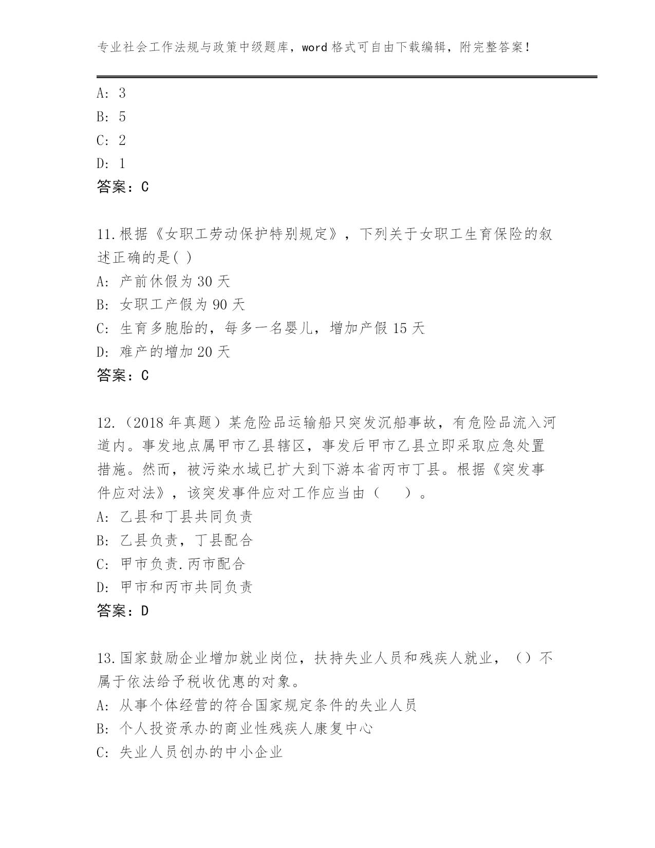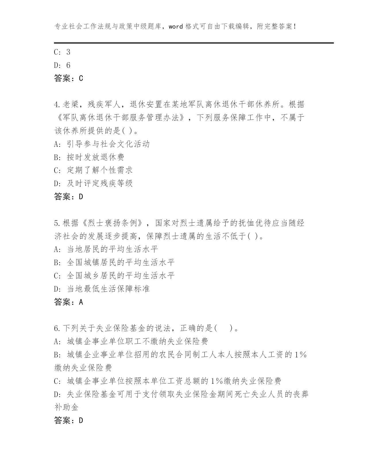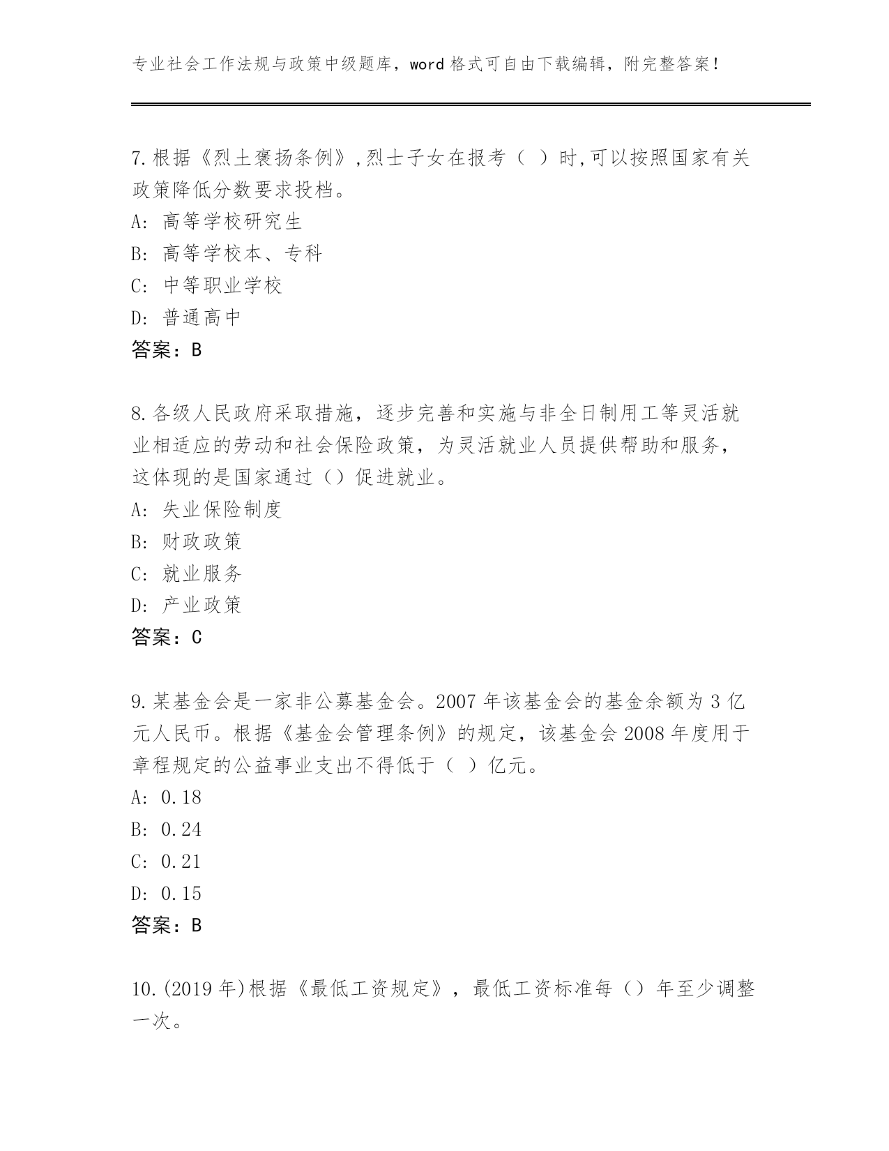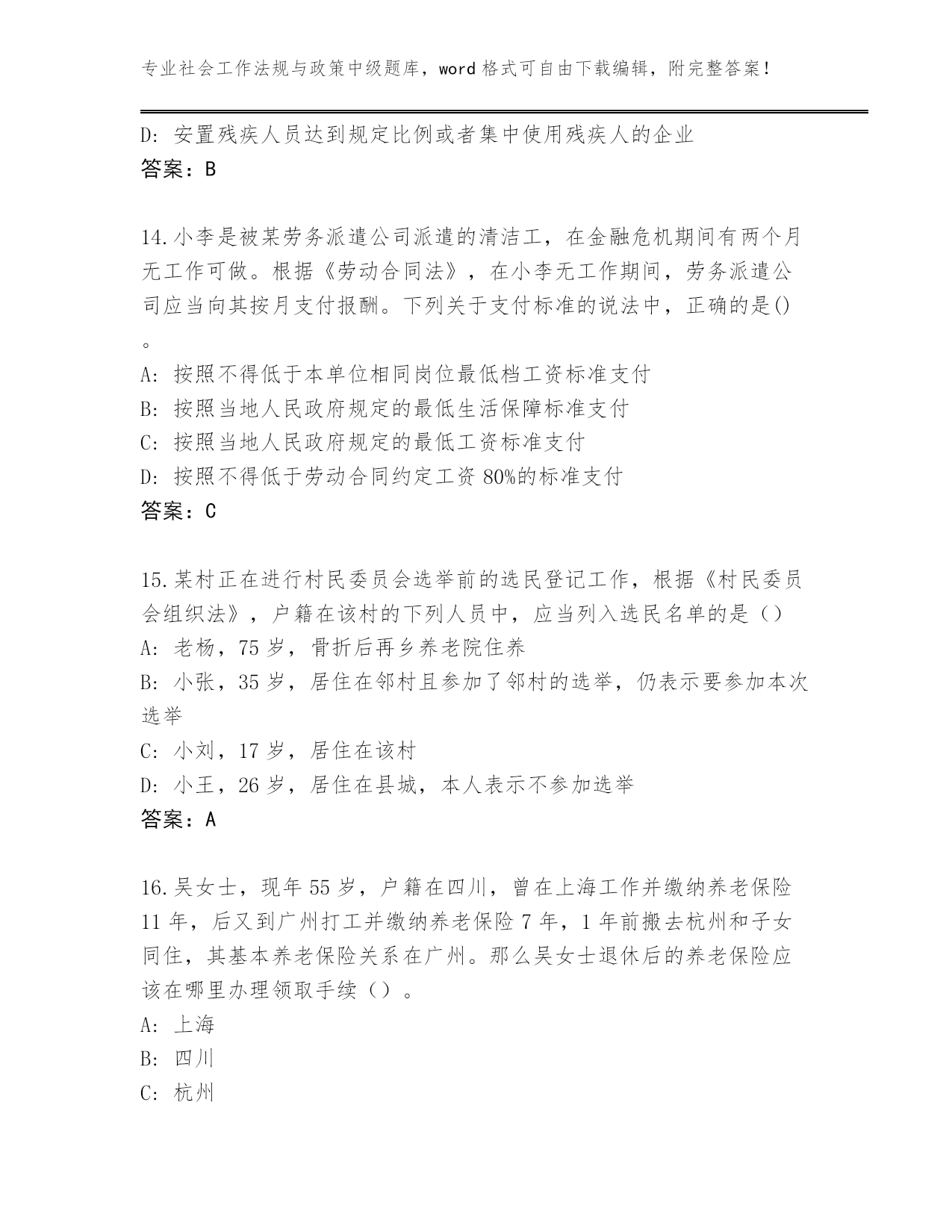 专业社会工作法规与政策中级题库,word格式可自由下载编辑,附完整答案!重庆市渝中区2023-24年社会工作法规与政策中级通关秘籍题库及一套参考答案第I部分单选题(100题)1.某中学初一年级组织学生到游泳馆游泳活动,由三名老师带队,有一位同学因水温问题发生抽搐状况,老师立即把该同学送往医院,这体现了学校保护中老师应当()。A:保护未成年人健康和安全B:对未成年人关爱和尊重C:开展未成年人成长教育D:对有严重不良行为的未成年人实施专门教育答案:A2.根据《社会救助暂行办法》,社会救助制度坚持()、救急难、可持续,与其他社会保障制度相衔接,A:低水平B:广覆盖C:托底线D:稳增长答案:C3.《中华人民共和国社区矫正法》规定:社区矫正对象无正当理由,未经批准离开所居住的市、县的,经县级司法行政部门负责人批准,可以使用电子定位装置,加强监督管理,使用电子定位装置的期限不得超过()个月。A:9B:12C:3D:6答案:C4.老梁,残疾军人,退休安置在某地军队离休退休干部休养所。根据《军队离休退休干部服务管理办法》,下列服务保障工作中,不属于该休养所提供的是()。A:引导参与社会文化活动B:按时发放退休费C:定期了解个性需求D:及时评定残疾等级答案:D5.根据《烈士褒扬条例》,国家对烈士遗属给予的抚恤优待应当随经济社会的发展逐步提高,保障烈士遗属的生活不低于()。A:当地居民的平均生活水平B:全国城镇居民的平均生活水平C:全国城乡居民的平均生活水平D:当地最低生活保障标准答案:A6.下列关于失业保险基金的说法,正确的是()。A:城镇企事业单位职工不缴纳失业保险费B:城镇企业事业单位招用的农民合同制工人本人按照本人工资的1%缴纳失业保险费C:城镇企事业单位按照本单位工资总额的1%缴纳失业保险费D:失业保险基金可用于支付领取失业保险金期间死亡失业人员的丧葬补助金答案:D7.根据《烈土褒扬条例》,烈士子女在报考()时,可以按照国家有关政策降低分数要求投档。A:高等学校研究生B:高等学校本、专科C:中等职业学校D:普通高中答案:B8.各级人民政府采取措施,逐步完善和实施与非全日制用工等灵活就业相适应的劳动和社会保险政策,为灵活就业人员提供帮助和服务,这体现的是国家通过()促进就业。A:失业保险制度B:财政政策C:就业服务D:产业政策答案:C9.某基金会是一家非公募基金会。2007年该基金会的基金余额为3亿元人民币。根据《基金会管理条例》的规定,该基金会2008年度用于章程规定的公益事业支出不得低于()亿元。A:0.18B:0.24C:0.21D:0.15答案:B10.(2019年)根据《最低工资规定》,最低工资标准每()年至少调整一次。A:3B:5C:2D:1答案:C11.根据《女职工劳动保护特别规定》,下列关于女职工生育保险的叙述正确的是()A:产前休假为30天B:女职工产假为90天C:生育多胞胎的,每多一名婴儿,增加产假15天D:难产的增加20天答案:C12.(2018年真题)某危险品运输船只突发沉船事故,有危险品流入河道内。事发地点属甲市乙县辖区,事发后甲市乙县立即采取应急处置措施。然而,被污染水域已扩大到下游本省丙市丁县。根据《突发事件应对法》,该突发事件应对工作应当由()。A:乙县和丁县共同负责B:乙县负责,丁县配合C:甲市负责.丙市配合D:甲市和丙市共同负责答案:D13.国家鼓励企业增加就业岗位,扶持失业人员和残疾人就业,()不属于依法给予税收优惠的对象。A:从事个体经营的符合国家规定条件的失业人员B:个人投资承办的商业性残疾人康复中心C:失业人员创办的中小企业D:安置残疾人员达到规定比例或者集中使用残疾人的企业答案:B14.小李是被某劳务派遣公司派遣的清洁工,在金融危机期间有两个月无工作可做。根据《劳动合同法》,在小李无工作期间,劳务派遣公司应当向其按月支付报酬。下列关于支付标准的说法中,正确的是()。A:按照不得低于本单位相同岗位最低档工资标准支付B:按照当地人民政府规定的最低生活保障标准支付C:按照当地人民政府规定的最低工资标准支付D:按照不得低于劳动合同约定工资80%的标准支付答案:C15.某村正在进行村民委员会选举前的选民登记工作,根据《村民委员会组织法》,户籍在该村的下列人员中,应当列入选民名单的是()A:老杨,75岁,骨折后再乡养老院住养B:小张,35岁,居住在邻村且参加了邻村的选举,仍表示要参加本次选举C:小刘,17岁,居住在该村D:小王,26岁,居住在县城,本人表示不参加选举答案:A16.吴女士,现年55岁,户籍在四川,曾在上海工作并缴纳养老保险11年,后又到广州打工并缴纳养老保险7年,1年前搬去杭州和子女同住,其基本养老保险关系在广州。那么吴女士退休后的养老保险应该在哪里办理领取手续()。A:上海B:四川C:杭州
