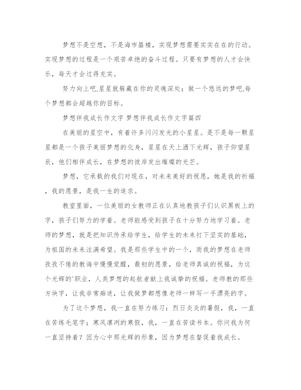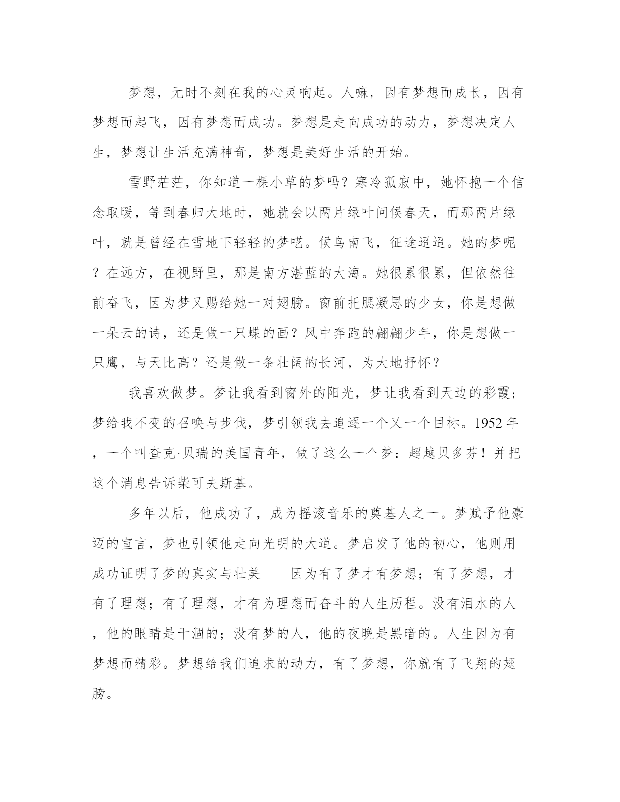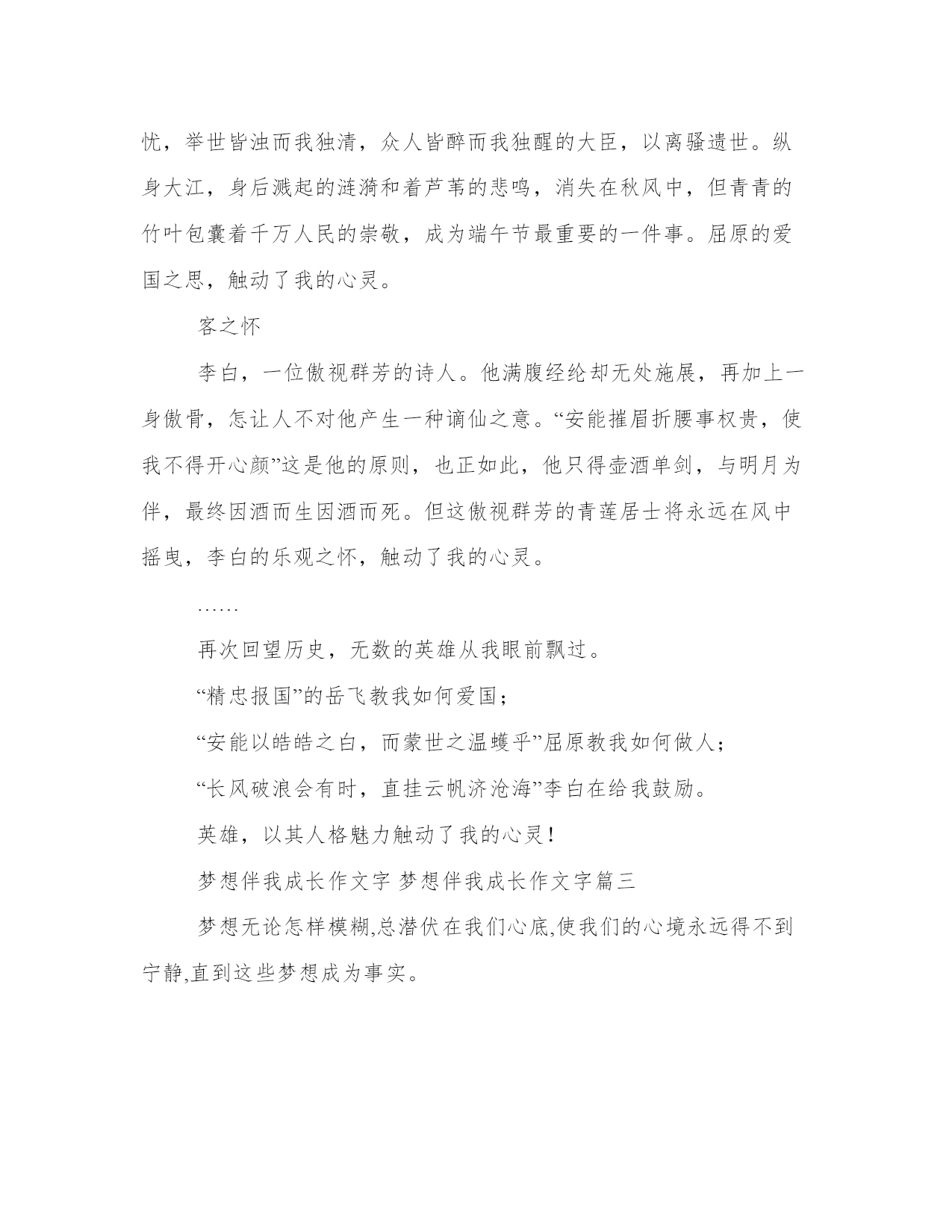 梦想伴我成长作文字梦想伴我成长作文字十二篇(通用)无论是身处学校还是步入社会,大家都尝试过写作吧,借助写作也可以提高我们的语言组织能力。相信许多人会觉得范文很难写?以下是小编为大家收集的优秀范文,欢迎大家分享阅读。梦想伴我成长作文字梦想伴我成长作文字篇一我小的时候,体弱多病,妈妈经常带我去一家医院看医生。五岁那年,我又生病了,给我看病的是一位阿姨,那位阿姨亲切地问我哪不舒服,接着让我把嘴巴张开给我看看嗓子,又用听诊器给我听听肚子。这位医生阿姨做着这一切动作的时候都非常和蔼可亲,至今还深深的印在我的脑海里。当时我心里就想,长大了一定也要像那位阿姨一样,做个慈善的医生为每一个生病的小朋友看病。在我的记忆里,每次医生开的那些药,基本都是大同小异。以致于我都记住什么药治什么病了。记得有一次,我独自一个人在家,玩着玩着,头感觉非常疼,于是我就拿体温计量了量,38度,"糟糕",发烧了,我就给妈妈打电话,刚拿起话筒,我犹豫了一下,妈妈整天那么忙,烦心事那么多,我还是不告诉了,今天我就自己当回"医生"吧。于是我就开始找家里的常备药,发烧时用的药,按照以前喝的剂量用温开水喝了下去。我又拿来凉毛巾敷在额头上,躺在沙发上休息了一会,过了很长时间,我又拿出体温计量了一下,结果温度真的降下去了。我心里真高兴,我可以给自己当回医生了。我当医生的梦想是因为从小体质弱经常吃药,所以我长大了一定把医学这方面搞清楚。我知道,当医生有好多的学问,我现在只有好好学习,才能实现我的这个梦想,有了这个梦想,才能为之奋斗。梦想伴我成长作文字梦想伴我成长作文字篇二跌倒时,英雄之志给我阳光般的援助。失落时,英雄之思给我清风般的慰藉。冲动时,英雄之怀给我天空般的胸襟。将之志岳飞,一位永垂不朽的将军,自当年汤阴少年意气风发到手持一杆红樱征战南北,收复我大宋河山的雄心壮志。“三十功名尘与土,八千里路云和月”这是他的激昂,“壮士饥餐胡虏肉,笑谈渴饮匈奴血。”这是他的豪迈。可惜无奈于宋帝十二道金牌紧逼,使得直捣黄龙的壮志泯灭,一生精忠报国,却不料被那奸臣贼子所害。以莫须有的罪名被送上不归路,但精忠报国四字将永垂不朽,岳飞的报国之志,触动了我的心灵。臣之思屈原,一位高洁傲岸的大臣,回忆往昔,仰天长叹:“楚王昏庸,佞臣当道。”无奈啊!居庙堂,不能为民解难,谪乡野,不能替君分忧,举世皆浊而我独清,众人皆醉而我独醒的大臣,以离骚遗世。纵身大江,身后溅起的涟漪和着芦苇的悲鸣,消失在秋风中,但青青的竹叶包囊着千万人民的崇敬,成为端午节最重要的一件事。屈原的爱国之思,触动了我的心灵。客之怀李白,一位傲视群芳的诗人。他满腹经纶却无处施展,再加上一身傲骨,怎让人不对他产生一种谪仙之意。“安能摧眉折腰事权贵,使我不得开心颜”这是他的原则,也正如此,他只得壶酒单剑,与明月为伴,最终因酒而生因酒而死。但这傲视群芳的青莲居士将永远在风中摇曳,李白的乐观之怀,触动了我的心灵。……再次回望历史,无数的英雄从我眼前飘过。“精忠报国”的岳飞教我如何爱国;“安能以皓皓之白,而蒙世之温蠖乎”屈原教我如何做人;“长风破浪会有时,直挂云帆济沧海”李白在给我鼓励。英雄,以其人格魅力触动了我的心灵!梦想伴我成长作文字梦想伴我成长作文字篇三梦想无论怎样模糊,总潜伏在我们心底,使我们的心境永远得不到宁静,直到这些梦想成为事实。梦想,无时不刻在我的心灵响起。人嘛,因有梦想而成长,因有梦想而起飞,因有梦想而成功。梦想是走向成功的动力,梦想决定人生,梦想让生活充满神奇,梦想是美好生活的开始。雪野茫茫,你知道一棵小草的梦吗?寒冷孤寂中,她怀抱一个信念取暖,等到春归大地时,她就会以两片绿叶问候春天,而那两片绿叶,就是曾经在雪地下轻轻的梦呓。候鸟南飞,征途迢迢。她的梦呢?在远方,在视野里,那是南方湛蓝的大海。她很累很累,但依然往前奋飞,因为梦又赐给她一对翅膀。窗前托腮凝思的少女,你是想做一朵云的诗,还是做一只蝶的画?风中奔跑的翩翩少年,你是想做一只鹰,与天比高?还是做一条壮阔的长河,为大地抒怀?我喜欢做梦。梦让我看到窗外的阳光,梦让我看到天边的彩霞;梦给我不变的召唤与步伐,梦引领我去追逐一个又一个目标。1952年,一个叫查克·贝瑞的美国青年,做了这么一个梦:超越贝多芬!并把这个消息告诉柴可夫斯基。多年以后,他成功了,成为摇滚音乐的奠基人之一。梦赋予他豪迈的宣言,梦也引领他走向光明的大道。梦启发了他的初心,他则用成功证明了梦的真实与壮美——因为有了梦才有梦想;有了梦想,才有了理想;有了理想,才有为理想而奋斗的人生历程。没有泪水的人,他的眼睛是干涸的;没有梦的人,他的夜晚是黑暗的。人生因为有梦想而精彩。梦想给我们追求的动力,有了梦想,你就有了飞翔的翅膀。梦想不是空想,不是海市蜃楼,实现梦想需要实实在在的行动。实现梦想的过程是一个艰苦卓绝的奋斗过程。只
