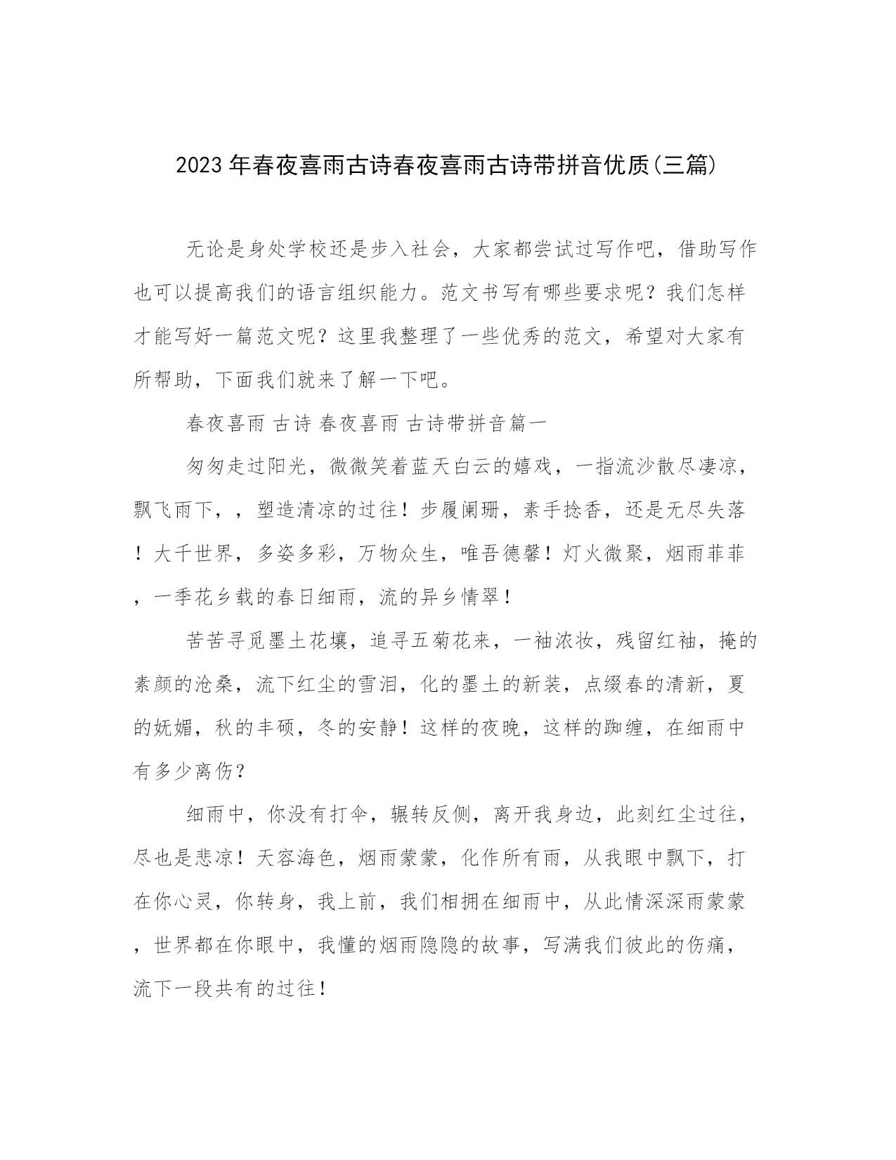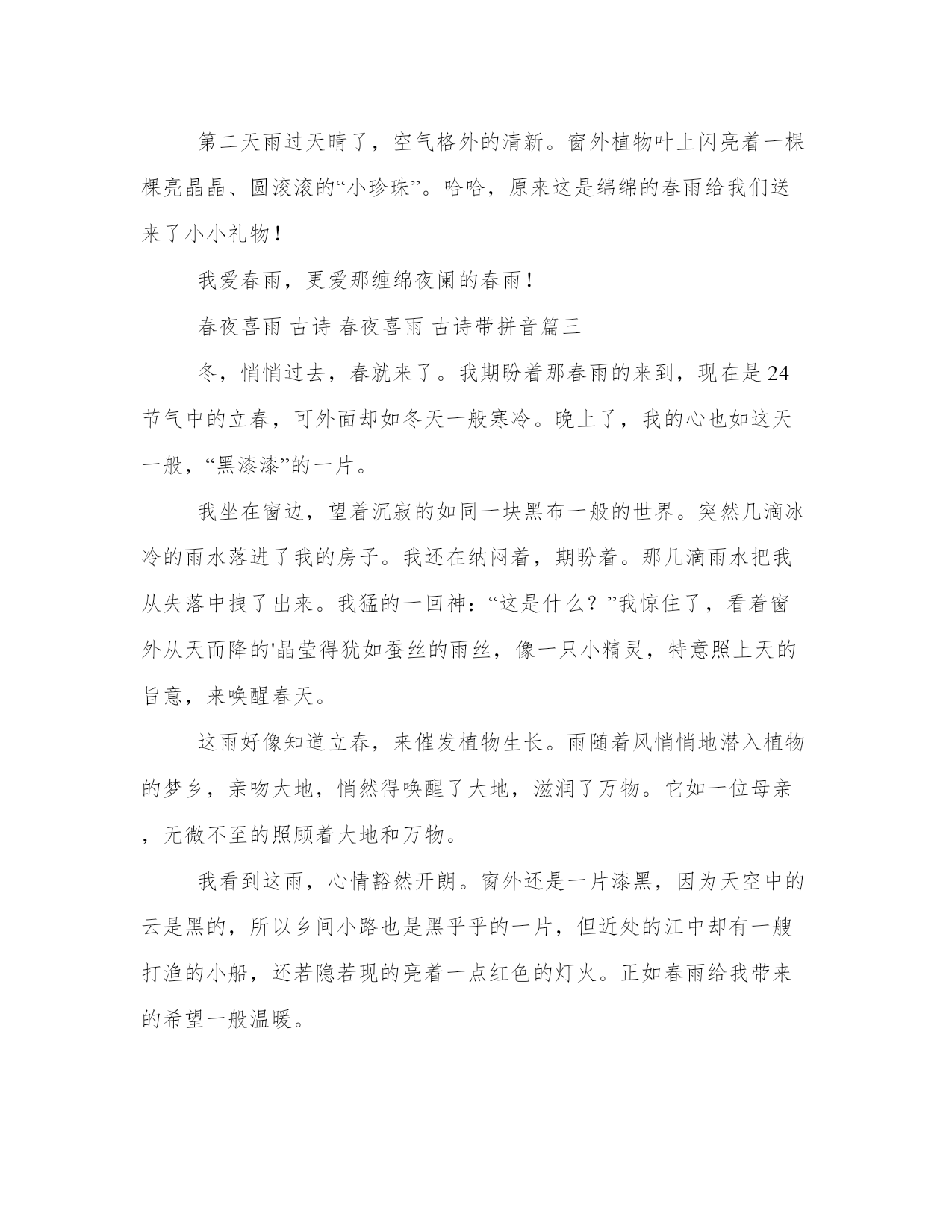 2023年春夜喜雨古诗春夜喜雨古诗带拼音优质(三篇)无论是身处学校还是步入社会,大家都尝试过写作吧,借助写作也可以提高我们的语言组织能力。范文书写有哪些要求呢?我们怎样才能写好一篇范文呢?这里我整理了一些优秀的范文,希望对大家有所帮助,下面我们就来了解一下吧。春夜喜雨古诗春夜喜雨古诗带拼音篇一匆匆走过阳光,微微笑着蓝天白云的嬉戏,一指流沙散尽凄凉,飘飞雨下,,塑造清凉的过往!步履阑珊,素手捻香,还是无尽失落!大千世界,多姿多彩,万物众生,唯吾德馨!灯火微聚,烟雨菲菲,一季花乡载的春日细雨,流的异乡情翠!苦苦寻觅墨土花壤,追寻五菊花来,一袖浓妆,残留红袖,掩的素颜的沧桑,流下红尘的雪泪,化的墨土的新装,点缀春的清新,夏的妩媚,秋的丰硕,冬的安静!这样的夜晚,这样的踟缠,在细雨中有多少离伤?细雨中,你没有打伞,辗转反侧,离开我身边,此刻红尘过往,尽也是悲凉!天容海色,烟雨蒙蒙,化作所有雨,从我眼中飘下,打在你心灵,你转身,我上前,我们相拥在细雨中,从此情深深雨蒙蒙,世界都在你眼中,我懂的烟雨隐隐的故事,写满我们彼此的伤痛,流下一段共有的过往!一站路牌又过,似是而非的过客,在我眼中飘过,唯独记忆一个多情善感的你,从此用文字细绣今生!梦回午夜,清茶淡墨,萦绕在耳旁,浅映在眼帘,轻轻你走了,留下独自伤情的我,与夕阳共眠,与日月同辉!华丽转身,潇洒红尘,看潮起潮落,心依然坚强!春夜爱上雨,梦回今生情!不眠的夜,等待在雨中,踟缠在雨中,细品流年雨落,倾听自然之声,读懂春季青丝,丈量生命长度!春夜喜雨古诗春夜喜雨古诗带拼音篇二春天的夜空中,一大片一大片乌云飘过来,要下雨啦。先是微风乍起,然后从黝黑的天上牛毛细雨洒下来。空中,到处是细雨如许多美丽的银丝一般飘洒。雨,从房檐上落下来,像是断了线的珠帘一样。叮叮咚咚的水声轻轻地扣动我的心弦,我的心神如同春夜一样缠绵。我悄然地来到庭院里,没打伞,让春雨沐浴着我的身躯,让春雨滋润着我的心田。微凉的风吹斜了软软的雨丝,飘落在树枝上,淋湿了树,浸润了花;飘落在水池里,融入了池,甜蜜了鱼;飘落在庭院外的马路上,淅淅沥沥,像许多多才多艺的孩子在唱歌……“沙沙沙!”这是小雨在歌唱!“嗖嗖嗖!”这是小树小花在生长。一场春雨潇潇,将完成她的使命。“快留下吧,我们舍不得你,舍不得这舒服的雨浴啊!”这是小生命的心声!第二天雨过天晴了,空气格外的清新。窗外植物叶上闪亮着一棵棵亮晶晶、圆滚滚的“小珍珠”。哈哈,原来这是绵绵的春雨给我们送来了小小礼物!我爱春雨,更爱那缠绵夜阑的春雨!春夜喜雨古诗春夜喜雨古诗带拼音篇三冬,悄悄过去,春就来了。我期盼着那春雨的来到,现在是24节气中的立春,可外面却如冬天一般寒冷。晚上了,我的心也如这天一般,“黑漆漆”的一片。我坐在窗边,望着沉寂的如同一块黑布一般的世界。突然几滴冰冷的雨水落进了我的房子。我还在纳闷着,期盼着。那几滴雨水把我从失落中拽了出来。我猛的一回神:“这是什么?”我惊住了,看着窗外从天而降的'晶莹得犹如蚕丝的雨丝,像一只小精灵,特意照上天的旨意,来唤醒春天。这雨好像知道立春,来催发植物生长。雨随着风悄悄地潜入植物的梦乡,亲吻大地,悄然得唤醒了大地,滋润了万物。它如一位母亲,无微不至的照顾着大地和万物。我看到这雨,心情豁然开朗。窗外还是一片漆黑,因为天空中的云是黑的,所以乡间小路也是黑乎乎的一片,但近处的江中却有一艘打渔的小船,还若隐若现的亮着一点红色的灯火。正如春雨给我带来的希望一般温暖。我看着这雨,心想:明天锦官城里,定是一片万紫千红。那被雨水打湿的花,娇羞羞的垂下了头那温馨的粉色桃花开了定很好看。我想着……想着……就在窗边睡着了。