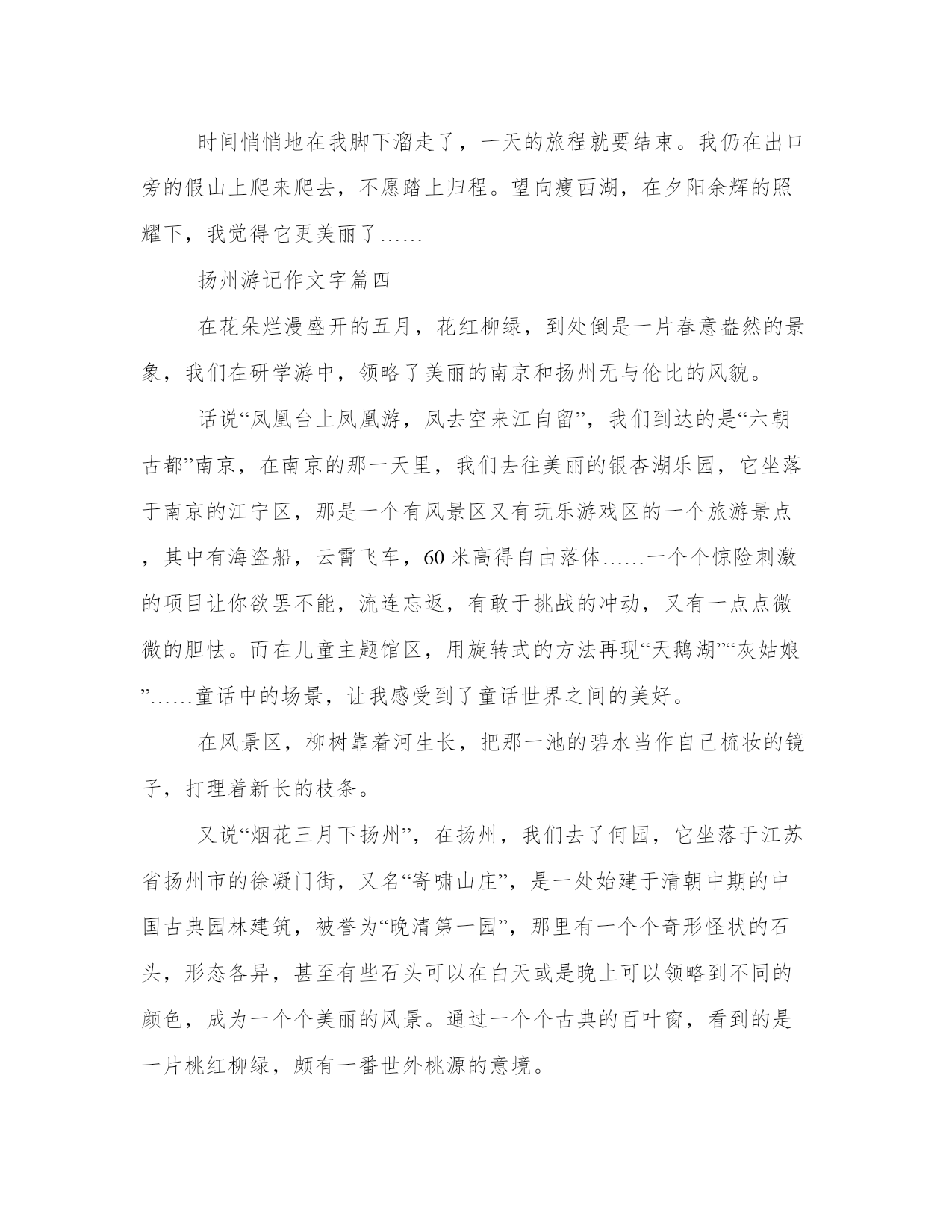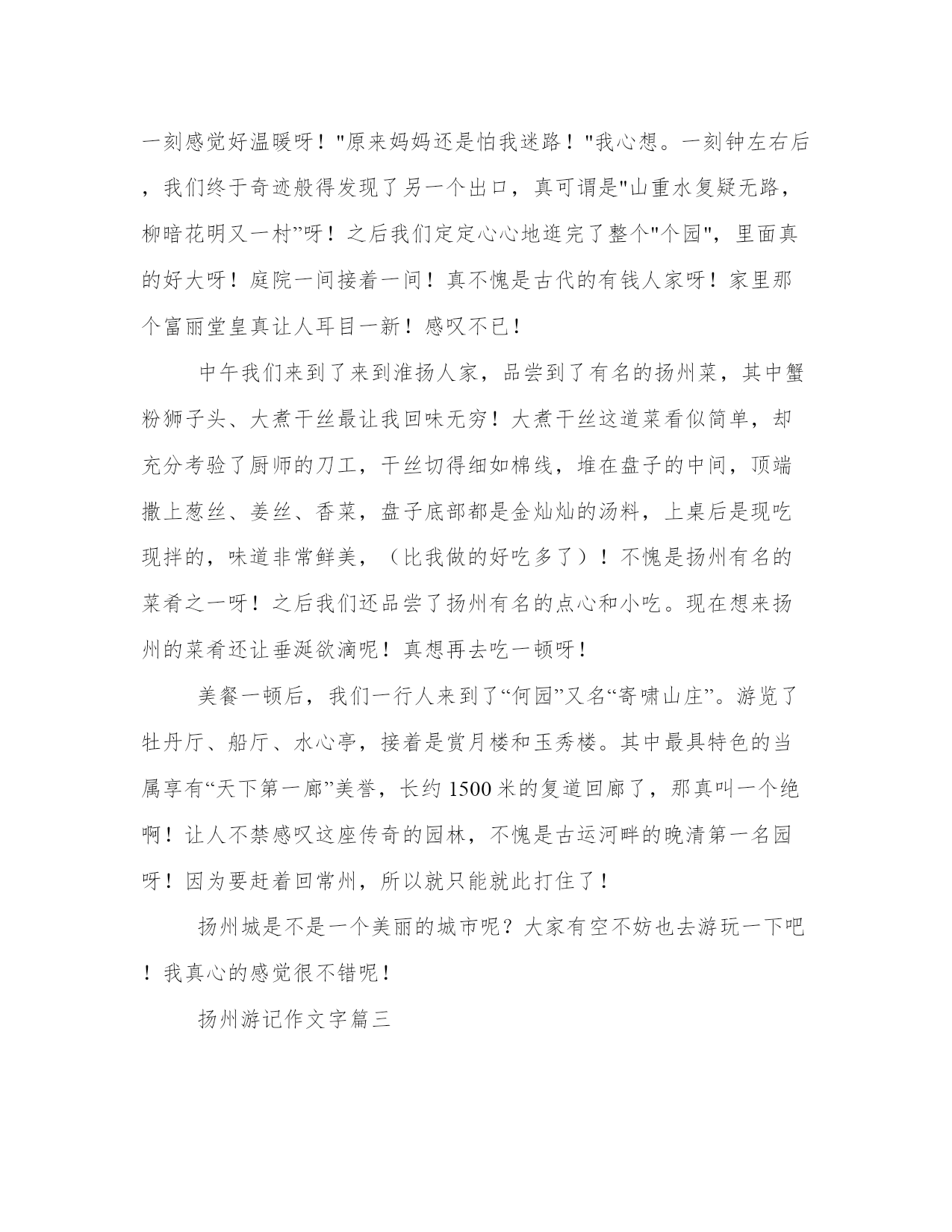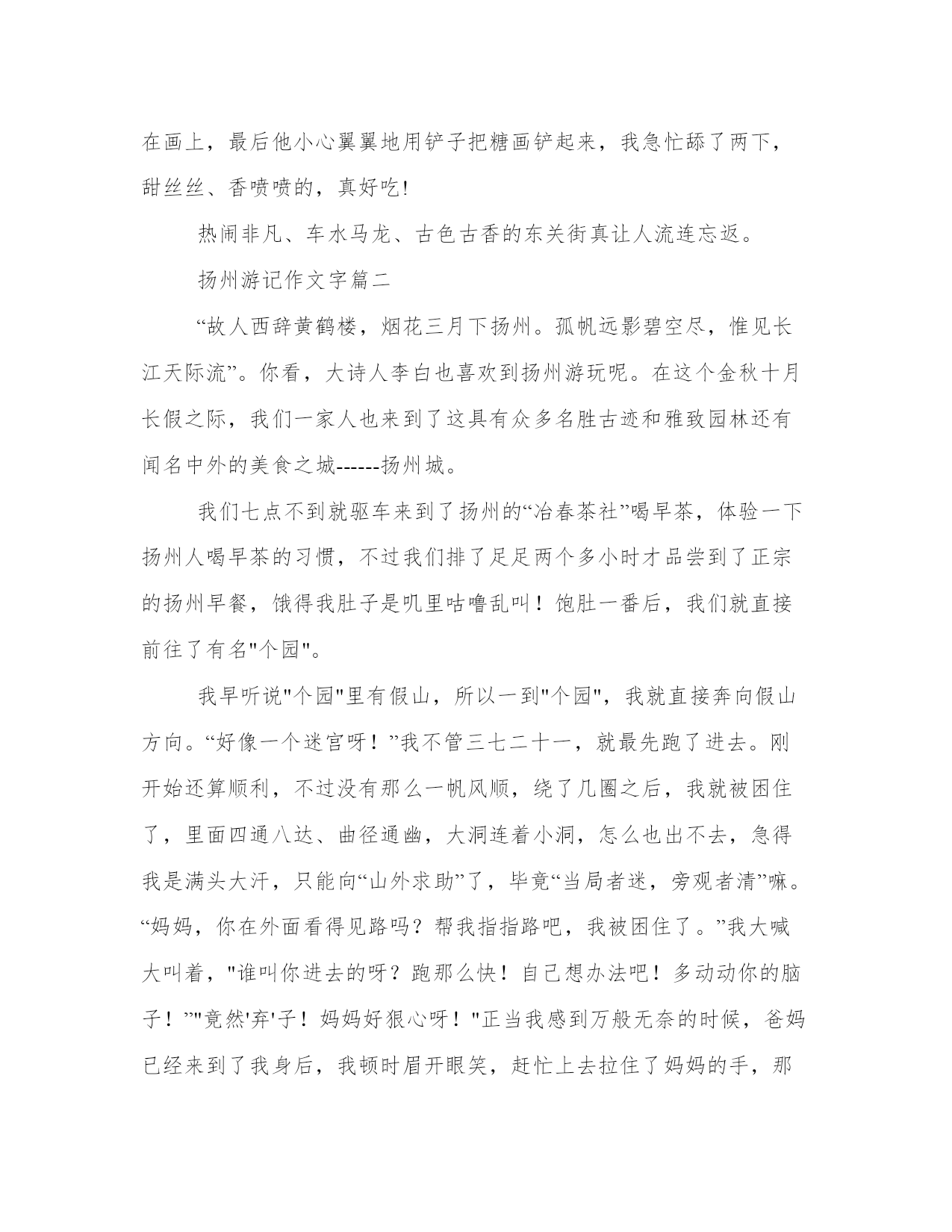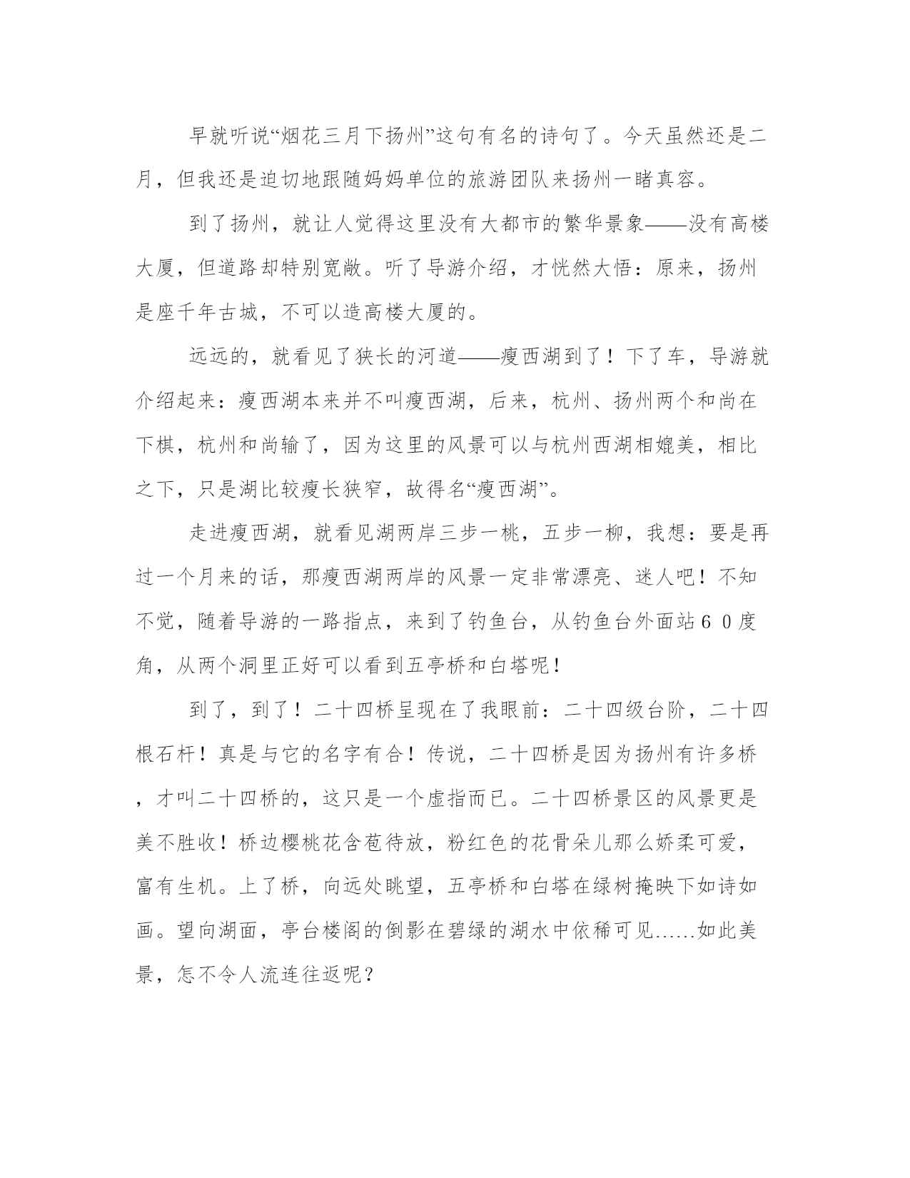 扬州游记作文字(四篇)人的记忆力会随着岁月的流逝而衰退,写作可以弥补记忆的不足,将曾经的人生经历和感悟记录下来,也便于保存一份美好的回忆。写范文的时候需要注意什么呢?有哪些格式需要注意呢?接下来小编就给大家介绍一下优秀的范文该怎么写,我们一起来看一看吧。扬州游记作文字篇一东关街上人来人往,非常热闹,最有特点的还是路两边的小吃。有卖面人的、有卖芝麻糖的、有卖烧饼的……琳琅满目的小吃让人看得眼花缭乱。忽然我看见一群人围在一个路边的摊子边,我凑过去一看,呀!原来是一位老爷爷正在用糖做各种画,我不禁问道:“老爷爷,这个叫什么?”“叫糖画。”老爷爷回答。“我也想要一个。”只见老爷爷拿了一个勺子,在烧着的圆锅里舀了一勺糖,再在一个方形的冷板上轻轻画出一个弯弯的虾身,然后他在虾身的前面绕了几下,呀!画出一对钳子,接着他又在两个钳子之间抖了两下,两条长长的胡须就出现在我眼前,然后又飞快地在虾身的下面来回绕了几下,这次画出的是一只尾巴。不一会儿,一只栩栩如生、活蹦乱跳的大虾就出现在我眼前。只见老爷爷又用一根木棒沾了点糖,然后用力压在画上,最后他小心翼翼地用铲子把糖画铲起来,我急忙舔了两下,甜丝丝、香喷喷的,真好吃!热闹非凡、车水马龙、古色古香的东关街真让人流连忘返。扬州游记作文字篇二“故人西辞黄鹤楼,烟花三月下扬州。孤帆远影碧空尽,惟见长江天际流”。你看,大诗人李白也喜欢到扬州游玩呢。在这个金秋十月长假之际,我们一家人也来到了这具有众多名胜古迹和雅致园林还有闻名中外的美食之城------扬州城。我们七点不到就驱车来到了扬州的“冶春茶社”喝早茶,体验一下扬州人喝早茶的习惯,不过我们排了足足两个多小时才品尝到了正宗的扬州早餐,饿得我肚子是叽里咕噜乱叫!饱肚一番后,我们就直接前往了有名"个园"。我早听说"个园"里有假山,所以一到"个园",我就直接奔向假山方向。“好像一个迷宫呀!”我不管三七二十一,就最先跑了进去。刚开始还算顺利,不过没有那么一帆风顺,绕了几圈之后,我就被困住了,里面四通八达、曲径通幽,大洞连着小洞,怎么也出不去,急得我是满头大汗,只能向“山外求助”了,毕竟“当局者迷,旁观者清”嘛。“妈妈,你在外面看得见路吗?帮我指指路吧,我被困住了。”我大喊大叫着,"谁叫你进去的呀?跑那么快!自己想办法吧!多动动你的脑子!”"竟然'弃'子!妈妈好狠心呀!"正当我感到万般无奈的时候,爸妈已经来到了我身后,我顿时眉开眼笑,赶忙上去拉住了妈妈的手,那一刻感觉好温暖呀!"原来妈妈还是怕我迷路!"我心想。一刻钟左右后,我们终于奇迹般得发现了另一个出口,真可谓是"山重水复疑无路,柳暗花明又一村”呀!之后我们定定心心地逛完了整个"个园",里面真的好大呀!庭院一间接着一间!真不愧是古代的有钱人家呀!家里那个富丽堂皇真让人耳目一新!感叹不已!中午我们来到了来到淮扬人家,品尝到了有名的扬州菜,其中蟹粉狮子头、大煮干丝最让我回味无穷!大煮干丝这道菜看似简单,却充分考验了厨师的刀工,干丝切得细如棉线,堆在盘子的中间,顶端撒上葱丝、姜丝、香菜,盘子底部都是金灿灿的汤料,上桌后是现吃现拌的,味道非常鲜美,(比我做的好吃多了)!不愧是扬州有名的菜肴之一呀!之后我们还品尝了扬州有名的点心和小吃。现在想来扬州的菜肴还让垂涎欲滴呢!真想再去吃一顿呀!美餐一顿后,我们一行人来到了“何园”又名“寄啸山庄”。游览了牡丹厅、船厅、水心亭,接着是赏月楼和玉秀楼。其中最具特色的当属享有“天下第一廊”美誉,长约1500米的复道回廊了,那真叫一个绝啊!让人不禁感叹这座传奇的园林,不愧是古运河畔的晚清第一名园呀!因为要赶着回常州,所以就只能就此打住了!扬州城是不是一个美丽的城市呢?大家有空不妨也去游玩一下吧!我真心的感觉很不错呢!扬州游记作文字篇三早就听说“烟花三月下扬州”这句有名的诗句了。今天虽然还是二月,但我还是迫切地跟随妈妈单位的旅游团队来扬州一睹真容。到了扬州,就让人觉得这里没有大都市的繁华景象——没有高楼大厦,但道路却特别宽敞。听了导游介绍,才恍然大悟:原来,扬州是座千年古城,不可以造高楼大厦的。远远的,就看见了狭长的河道——瘦西湖到了!下了车,导游就介绍起来:瘦西湖本来并不叫瘦西湖,后来,杭州、扬州两个和尚在下棋,杭州和尚输了,因为这里的风景可以与杭州西湖相媲美,相比之下,只是湖比较瘦长狭窄,故得名“瘦西湖”。走进瘦西湖,就看见湖两岸三步一桃,五步一柳,我想:要是再过一个月来的话,那瘦西湖两岸的风景一定非常漂亮、迷人吧!不知不觉,随着导游的一路指点,来到了钓鱼台,从钓鱼台外面站60度角,从两个洞里正好可以看到五亭桥和白塔呢!到了,到了!二十四桥呈现在了我眼前:二十四级台阶,二十四根石杆!真是与它的名字有合!传说,二十四桥是因为扬州有许多桥,才叫二十四桥的,这只是一个虚指而已。二十四桥景区的风