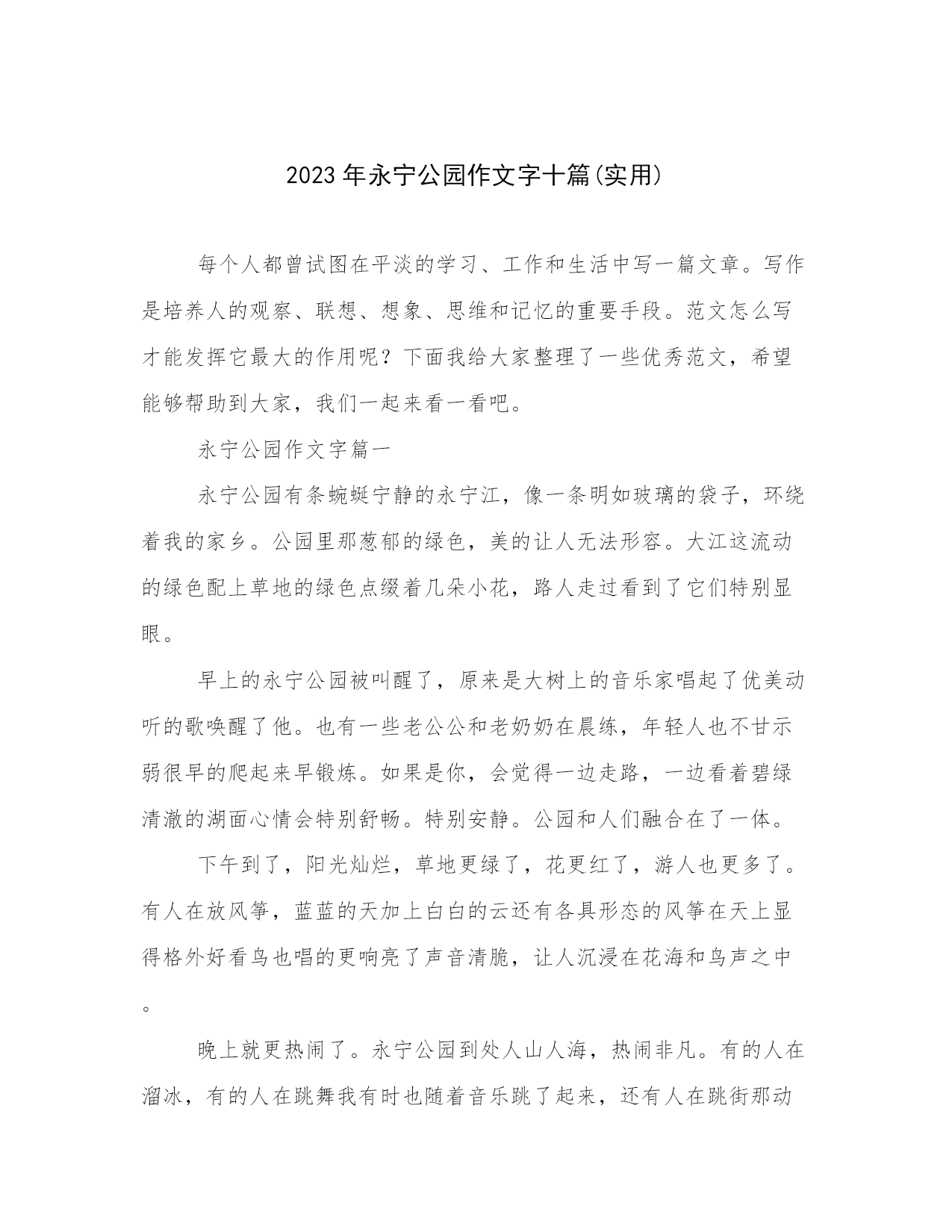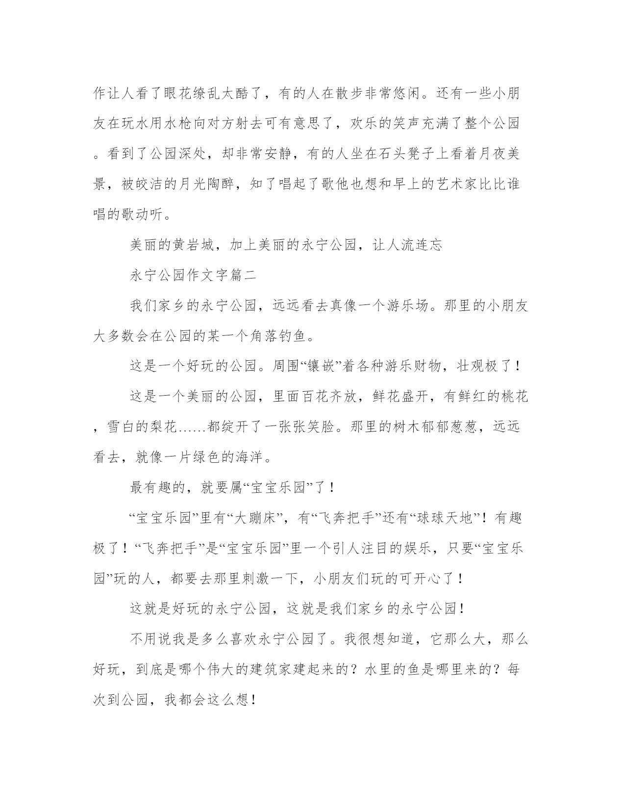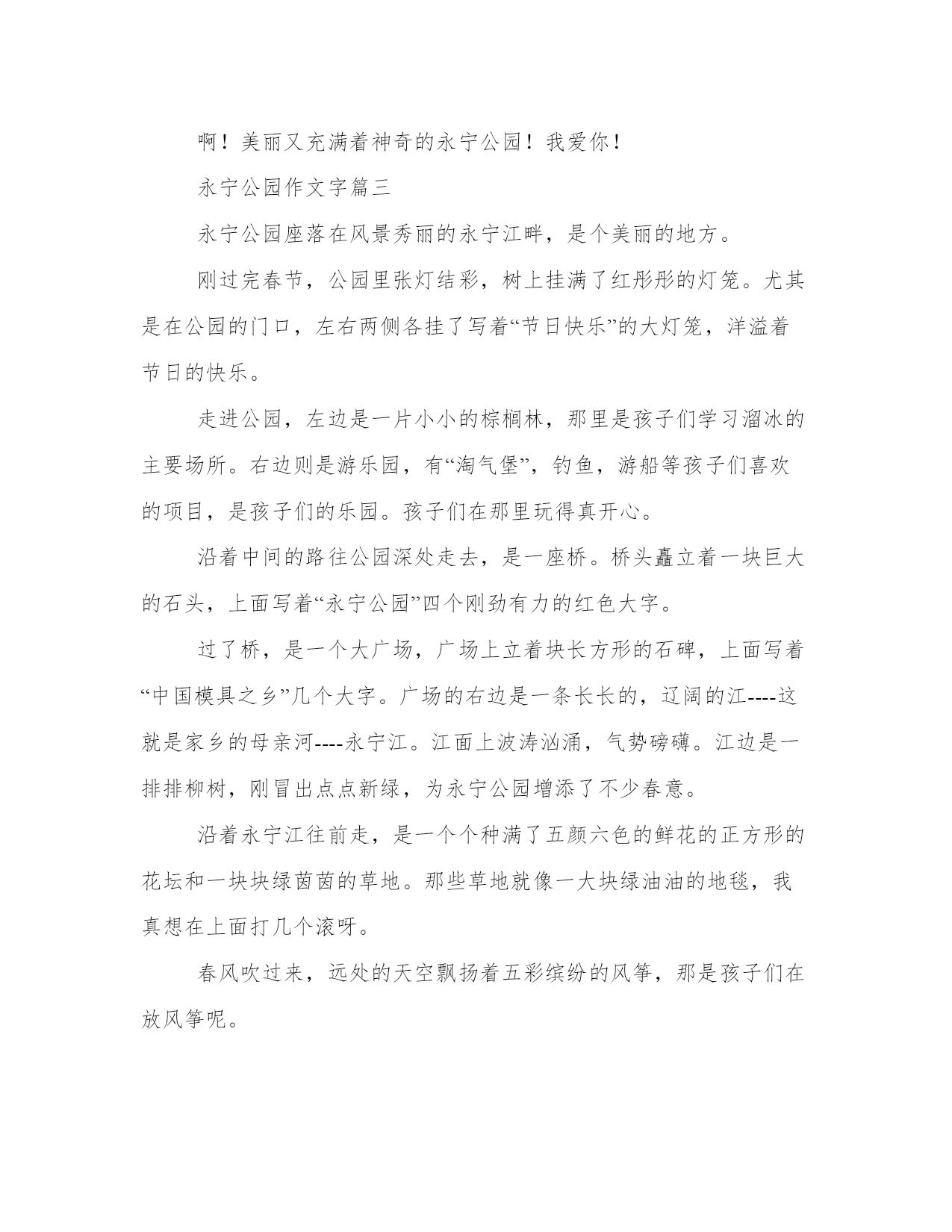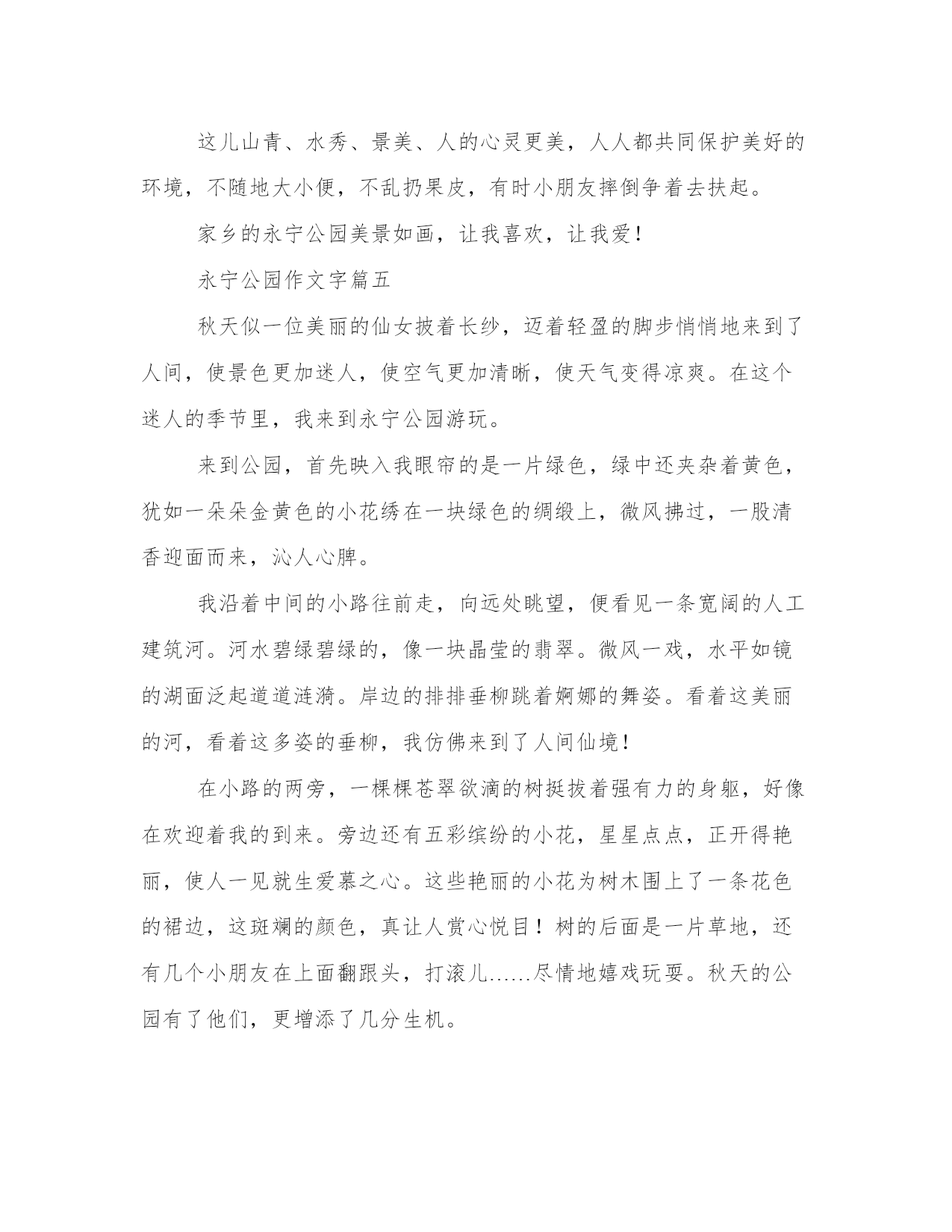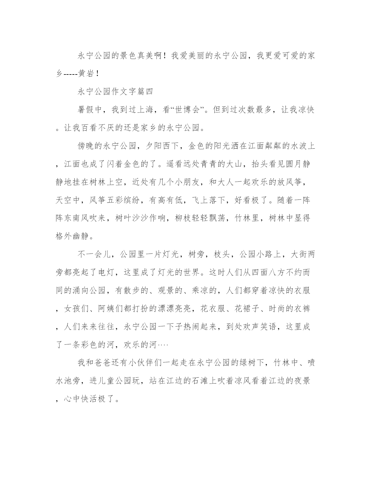 2023年永宁公园作文字十篇(实用)每个人都曾试图在平淡的学习、工作和生活中写一篇文章。写作是培养人的观察、联想、想象、思维和记忆的重要手段。范文怎么写才能发挥它最大的作用呢?下面我给大家整理了一些优秀范文,希望能够帮助到大家,我们一起来看一看吧。永宁公园作文字篇一永宁公园有条蜿蜒宁静的永宁江,像一条明如玻璃的袋子,环绕着我的家乡。公园里那葱郁的绿色,美的让人无法形容。大江这流动的绿色配上草地的绿色点缀着几朵小花,路人走过看到了它们特别显眼。早上的永宁公园被叫醒了,原来是大树上的音乐家唱起了优美动听的歌唤醒了他。也有一些老公公和老奶奶在晨练,年轻人也不甘示弱很早的爬起来早锻炼。如果是你,会觉得一边走路,一边看着碧绿清澈的湖面心情会特别舒畅。特别安静。公园和人们融合在了一体。下午到了,阳光灿烂,草地更绿了,花更红了,游人也更多了。有人在放风筝,蓝蓝的天加上白白的云还有各具形态的风筝在天上显得格外好看鸟也唱的更响亮了声音清脆,让人沉浸在花海和鸟声之中。晚上就更热闹了。永宁公园到处人山人海,热闹非凡。有的人在溜冰,有的人在跳舞我有时也随着音乐跳了起来,还有人在跳街那动作让人看了眼花缭乱太酷了,有的人在散步非常悠闲。还有一些小朋友在玩水用水枪向对方射去可有意思了,欢乐的笑声充满了整个公园。看到了公园深处,却非常安静,有的人坐在石头凳子上看着月夜美景,被皎洁的月光陶醉,知了唱起了歌他也想和早上的艺术家比比谁唱的歌动听。美丽的黄岩城,加上美丽的永宁公园,让人流连忘永宁公园作文字篇二我们家乡的永宁公园,远远看去真像一个游乐场。那里的小朋友大多数会在公园的某一个角落钓鱼。这是一个好玩的公园。周围“镶嵌”着各种游乐财物,壮观极了!这是一个美丽的公园,里面百花齐放,鲜花盛开,有鲜红的桃花,雪白的梨花……都绽开了一张张笑脸。那里的树木郁郁葱葱,远远看去,就像一片绿色的海洋。最有趣的,就要属“宝宝乐园”了!“宝宝乐园”里有“大蹦床”,有“飞奔把手”还有“球球天地”!有趣极了!“飞奔把手”是“宝宝乐园”里一个引人注目的娱乐,只要“宝宝乐园”玩的人,都要去那里刺激一下,小朋友们玩的可开心了!这就是好玩的永宁公园,这就是我们家乡的永宁公园!不用说我是多么喜欢永宁公园了。我很想知道,它那么大,那么好玩,到底是哪个伟大的建筑家建起来的?水里的鱼是哪里来的?每次到公园,我都会这么想!啊!美丽又充满着神奇的永宁公园!我爱你!永宁公园作文字篇三永宁公园座落在风景秀丽的永宁江畔,是个美丽的地方。刚过完春节,公园里张灯结彩,树上挂满了红彤彤的灯笼。尤其是在公园的门口,左右两侧各挂了写着“节日快乐”的大灯笼,洋溢着节日的快乐。走进公园,左边是一片小小的棕榈林,那里是孩子们学习溜冰的主要场所。右边则是游乐园,有“淘气堡”,钓鱼,游船等孩子们喜欢的项目,是孩子们的乐园。孩子们在那里玩得真开心。沿着中间的路往公园深处走去,是一座桥。桥头矗立着一块巨大的石头,上面写着“永宁公园”四个刚劲有力的红色大字。过了桥,是一个大广场,广场上立着块长方形的石碑,上面写着“中国模具之乡”几个大字。广场的右边是一条长长的,辽阔的江----这就是家乡的母亲河----永宁江。江面上波涛汹涌,气势磅礴。江边是一排排柳树,刚冒出点点新绿,为永宁公园增添了不少春意。沿着永宁江往前走,是一个个种满了五颜六色的鲜花的正方形的花坛和一块块绿茵茵的草地。那些草地就像一大块绿油油的地毯,我真想在上面打几个滚呀。春风吹过来,远处的天空飘扬着五彩缤纷的风筝,那是孩子们在放风筝呢。永宁公园的景色真美啊!我爱美丽的永宁公园,我更爱可爱的家乡-----黄岩!永宁公园作文字篇四暑假中,我到过上海,看“世博会”。但到过次数最多,让我凉快。让我百看不厌的还是家乡的永宁公园。傍晚的永宁公园,夕阳西下,金色的阳光洒在江面粼粼的水波上,江面也成了闪着金色的了。遥看远处青青的大山,抬头看见圆月静静地挂在树林上空,近处有几个小朋友,和大人一起欢乐的放风筝,天空中,风筝五彩缤纷,有高有低,飞上落下,好看极了。随着一阵阵东南风吹来,树叶沙沙作响,柳枝轻轻飘荡,竹林里,树林中显得格外幽静。不一会儿,公园里一片灯光,树旁,枝头,公园小路上,大街两旁都亮起了电灯,这里成了灯光的世界。这时人们从四面八方不约而同的涌向公园,有散步的、观景的、乘凉的,人们都穿着凉快的衣服,女孩们、阿姨们都打扮的漂漂亮亮,花衣服、花裙子、时尚的衣裤,人们来来往往,永宁公园一下子热闹起来,到处欢声笑语,这里成了一条彩色的河,欢乐的河····我和爸爸还有小伙伴们一起走在永宁公园的绿树下,竹林中、喷水池旁,进儿童公园玩,站在江边的石滩上吹着凉风看着江边的夜景,心中快活极了。这儿山青、水秀、景美、人的心灵更美,人人都共同保护美好的环境,不随地大小便,不乱扔果皮,有时小朋友摔倒争着去