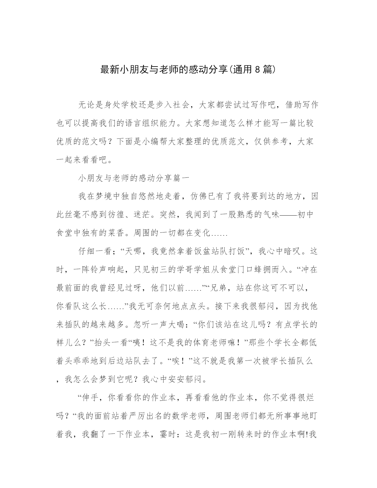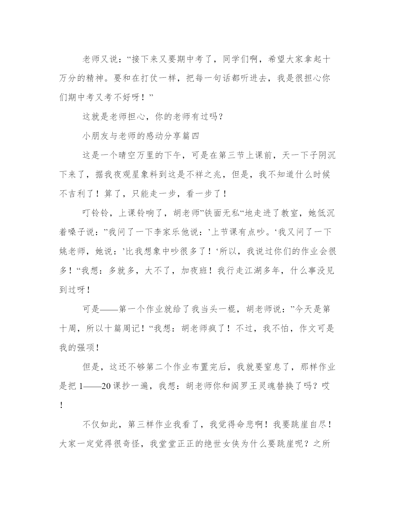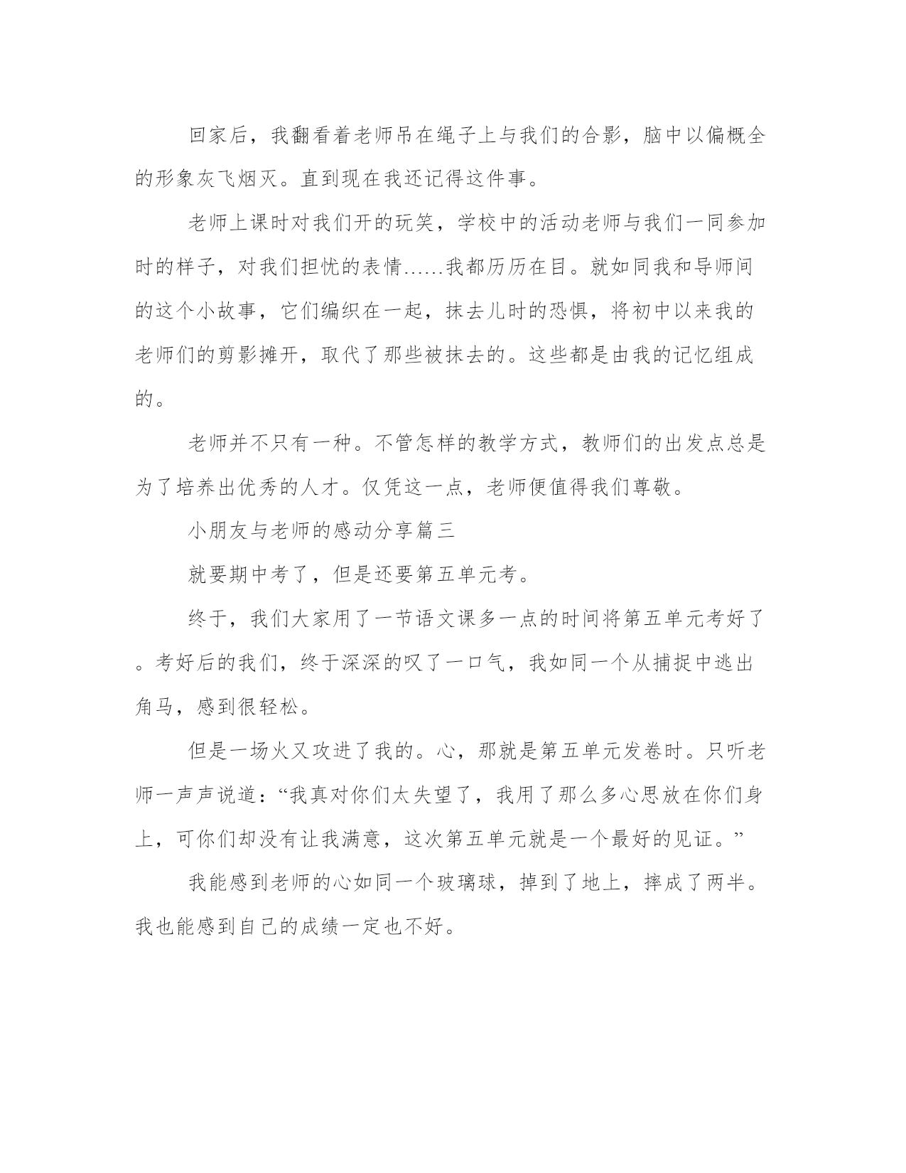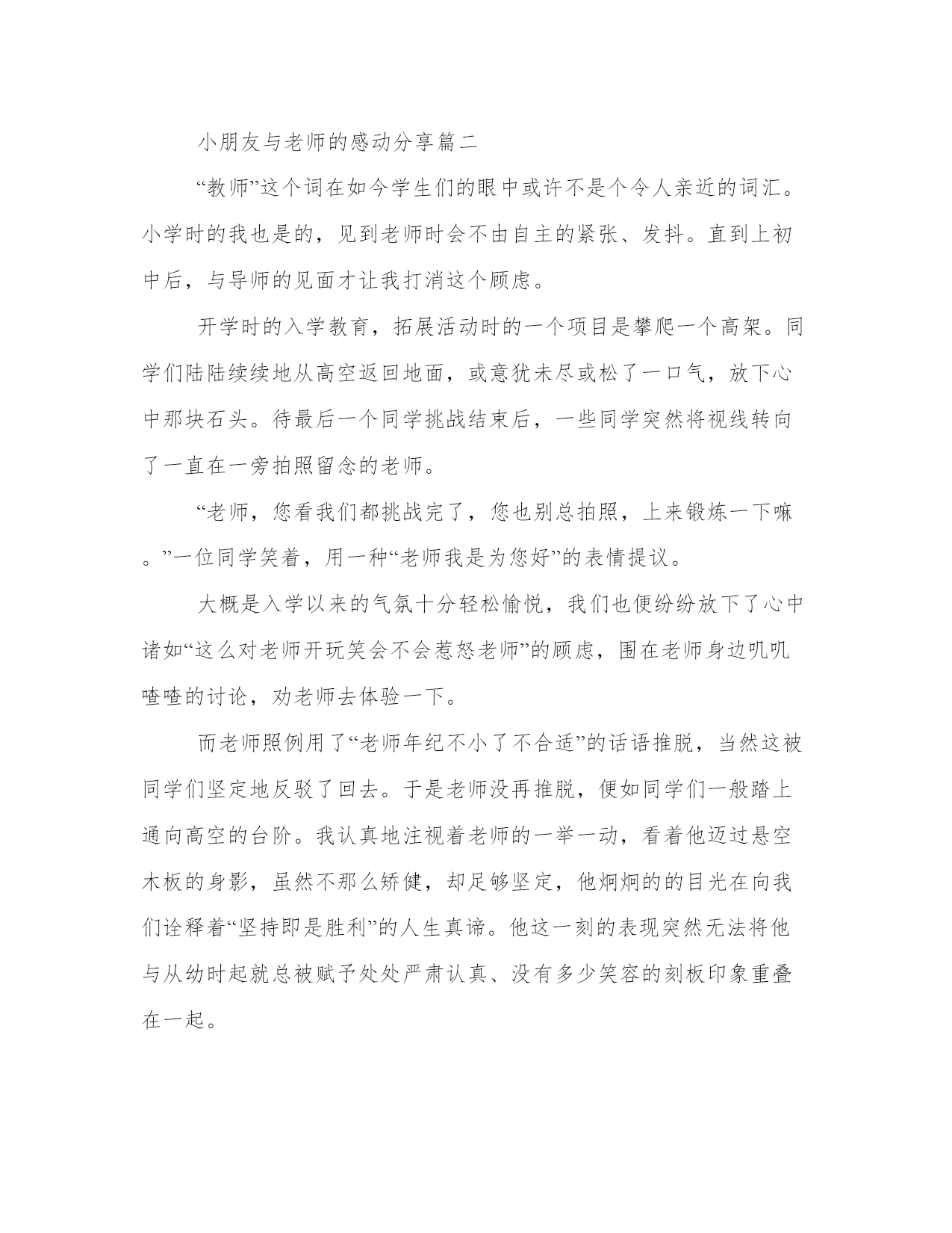 最新小朋友与老师的感动分享(通用8篇)无论是身处学校还是步入社会,大家都尝试过写作吧,借助写作也可以提高我们的语言组织能力。大家想知道怎么样才能写一篇比较优质的范文吗?下面是小编帮大家整理的优质范文,仅供参考,大家一起来看看吧。小朋友与老师的感动分享篇一我在梦境中独自悠然地走着,仿佛已有了我将要到达的地方,因此丝毫不感到彷徨、迷茫。突然,我闻到了一股熟悉的气味——初中食堂中独有的菜香。周围的一切都在变化……仔细一看;“天哪,我竟然拿着饭盆站队打饭”,我心中暗叹。这时,一阵铃声响起,只见初三的学哥学姐从食堂门口蜂拥而入。“冲在最前面的我曾经见过呀,他们以前……”“兄弟,站在你这可不可以,你看队这么长……”我无可奈何地点点头。接下来我很郁闷,因为找他来插队的越来越多。忽听一声大喝:“你们该站在这儿吗?有点学长的样儿么?”抬头一看“咦!这不是我的体育老师嘛!”那些个学长全都低着头乖乖地到后边站队去了。“唉!”这不就是我第一次被学长插队么,我怎么会梦到它呢?我心中安安郁闷。“伸手,你看看你的作业本,再看看他的作业本,你不觉得很烂吗?“我的面前站着严厉出名的数学老师,周围老师们都无所事事地盯着我,我翻了一下作业本,霎时:这是我初一刚转来时的作业本啊!我暗中叫冤:”我那是因为不熟悉你要求的格式,才导致作业本看起来较乱的。”但我还是伸出了左手,听着老师打出“啪啪”的声响。接下来几天,天天如此。不是因为作业本太乱,就是因为差得太多。大约一周后,我的作业本再次未发,我胆战心惊地等着数学老师的点名。铃声响起,数学老师如往常一样站在讲台上。“下面我念几个作业完成情况比较好的学生和一些比较差的。当在较好的学生中听到我的名字时,我长长的舒了一口气。这时我不禁想起一个月前回母校看望数学老师时她说的一句话:“其实我打你们不是目的,目的是让你们学会。”“叮铃铃……”,一阵铃声再次响起,我睁开惺忪的睡眼,望了望窗外依旧黑乎乎的天空,比昨晚又多了些许星辰。我起身向外走去……“敬爱的老师,我的知识、品德乃至一言一行,都受之于你们。我过往的一切,如今都变成了我美好的回忆,我还经常想想它来汲取汲取教训、缅怀缅怀过去。我从没有刻意记过你们的名字,但你们的模样,神情我都牢牢地印在了心里。你们的敬业、正义、善良等等一切优良品德我都会继续传承和发扬下去!”迎着秋日独有的晨风,我站在高中校园的操场上,仰望一下空中稀疏的恒星,享受一下此刻的舒松,整理一下被情感宣泄的思绪。立正、踏步、跑步走……我又踏上新的征程。小朋友与老师的感动分享篇二“教师”这个词在如今学生们的眼中或许不是个令人亲近的词汇。小学时的我也是的,见到老师时会不由自主的紧张、发抖。直到上初中后,与导师的见面才让我打消这个顾虑。开学时的入学教育,拓展活动时的一个项目是攀爬一个高架。同学们陆陆续续地从高空返回地面,或意犹未尽或松了一口气,放下心中那块石头。待最后一个同学挑战结束后,一些同学突然将视线转向了一直在一旁拍照留念的老师。“老师,您看我们都挑战完了,您也别总拍照,上来锻炼一下嘛。”一位同学笑着,用一种“老师我是为您好”的表情提议。大概是入学以来的气氛十分轻松愉悦,我们也便纷纷放下了心中诸如“这么对老师开玩笑会不会惹怒老师”的顾虑,围在老师身边叽叽喳喳的讨论,劝老师去体验一下。而老师照例用了“老师年纪不小了不合适”的话语推脱,当然这被同学们坚定地反驳了回去。于是老师没再推脱,便如同学们一般踏上通向高空的台阶。我认真地注视着老师的一举一动,看着他迈过悬空木板的身影,虽然不那么矫健,却足够坚定,他炯炯的的目光在向我们诠释着“坚持即是胜利”的人生真谛。他这一刻的表现突然无法将他与从幼时起就总被赋予处处严肃认真、没有多少笑容的刻板印象重叠在一起。回家后,我翻看着老师吊在绳子上与我们的合影,脑中以偏概全的形象灰飞烟灭。直到现在我还记得这件事。老师上课时对我们开的玩笑,学校中的活动老师与我们一同参加时的样子,对我们担忧的表情……我都历历在目。就如同我和导师间的这个小故事,它们编织在一起,抹去儿时的恐惧,将初中以来我的老师们的剪影摊开,取代了那些被抹去的。这些都是由我的记忆组成的。老师并不只有一种。不管怎样的教学方式,教师们的出发点总是为了培养出优秀的人才。仅凭这一点,老师便值得我们尊敬。小朋友与老师的感动分享篇三就要期中考了,但是还要第五单元考。终于,我们大家用了一节语文课多一点的时间将第五单元考好了。考好后的我们,终于深深的叹了一口气,我如同一个从捕捉中逃出角马,感到很轻松。但是一场火又攻进了我的。心,那就是第五单元发卷时。只听老师一声声说道:“我真对你们太失望了,我用了那么多心思放在你们身上,可你们却没有让我满意,这次第五单元就是一个最好的见证。”我能感到老师的心如同一个玻璃球,掉到了地上,摔成了两半。我也能感到自己的成绩