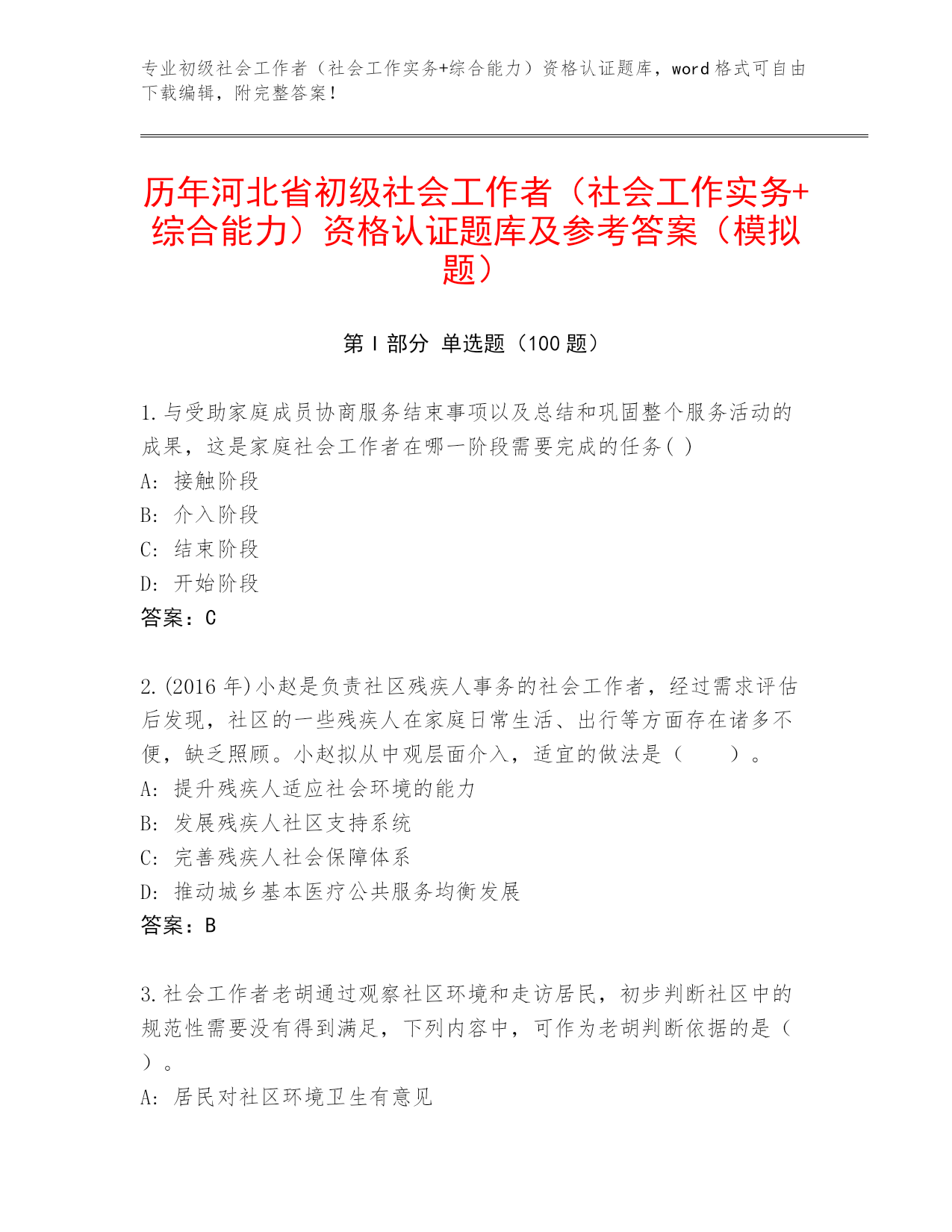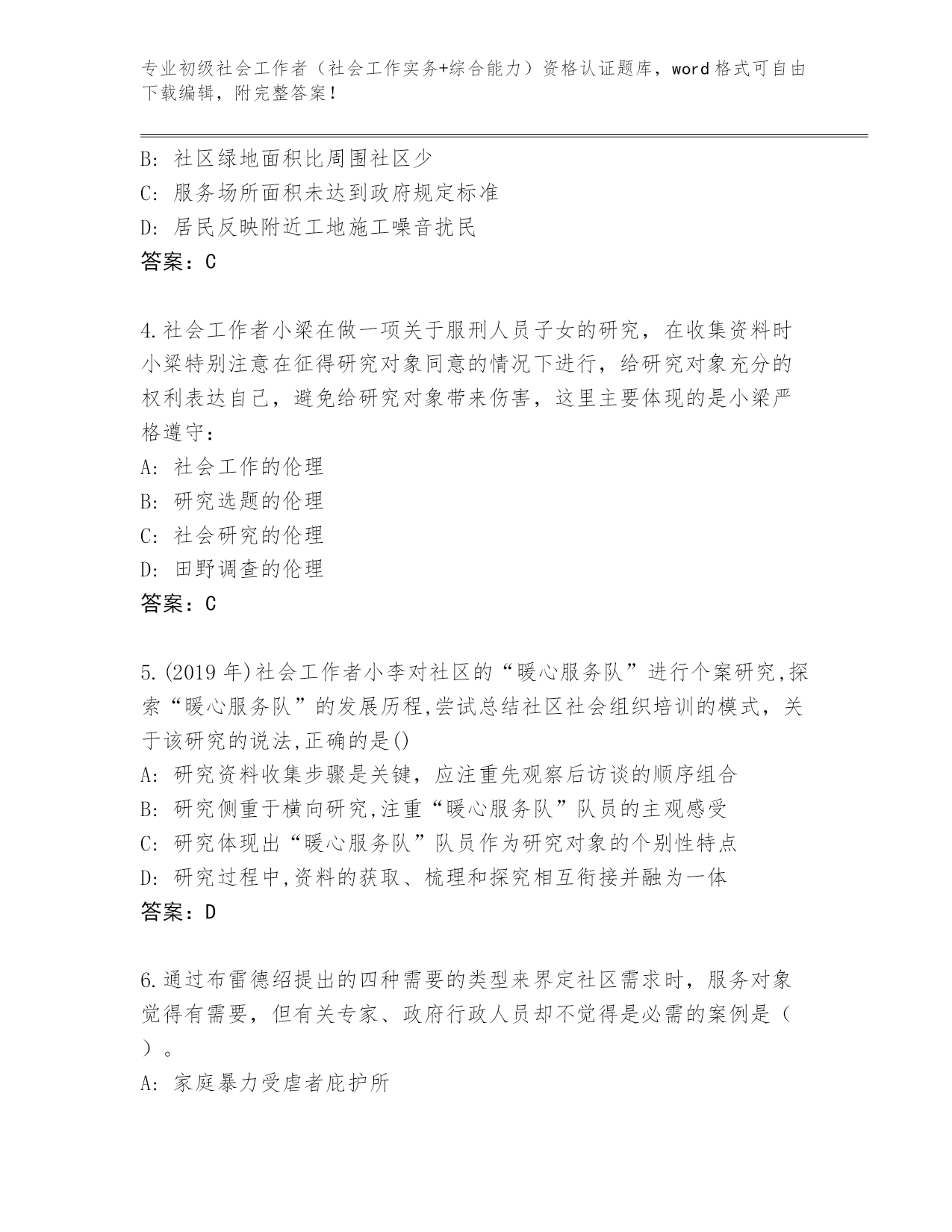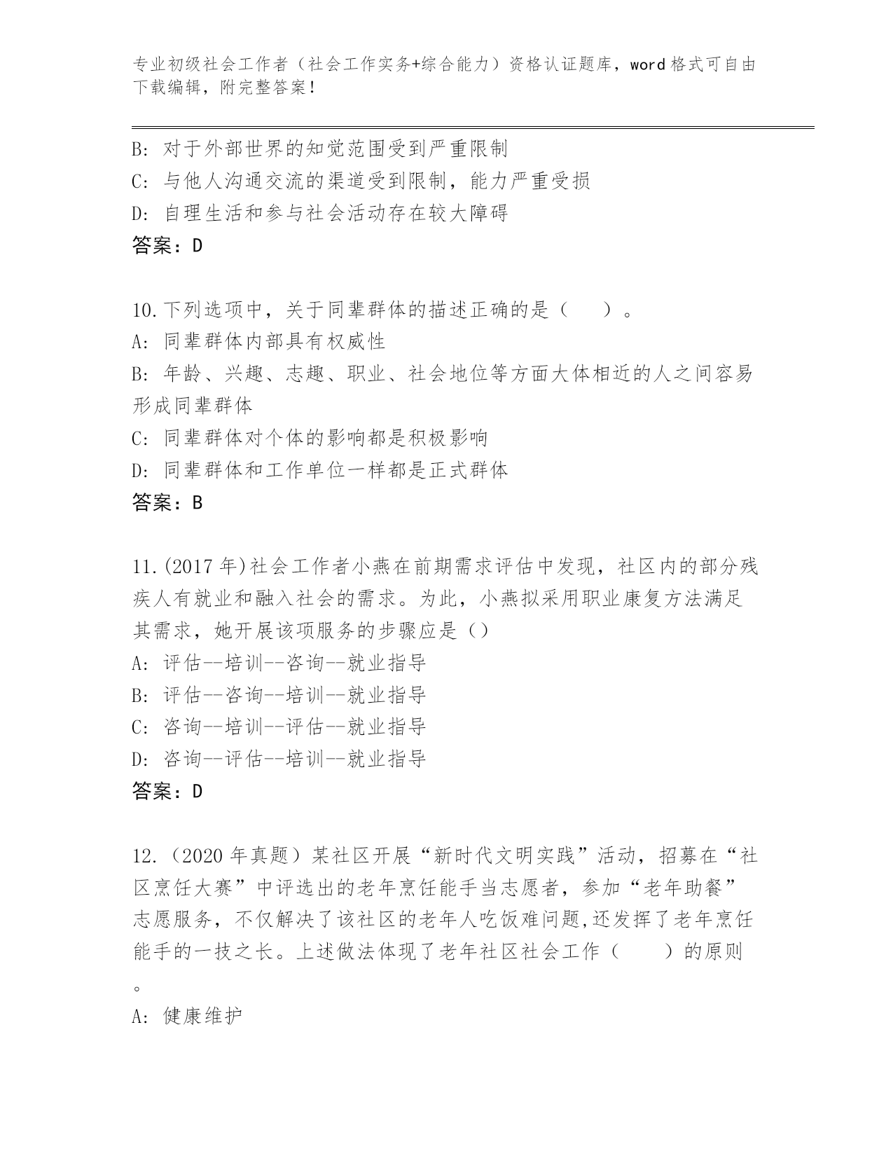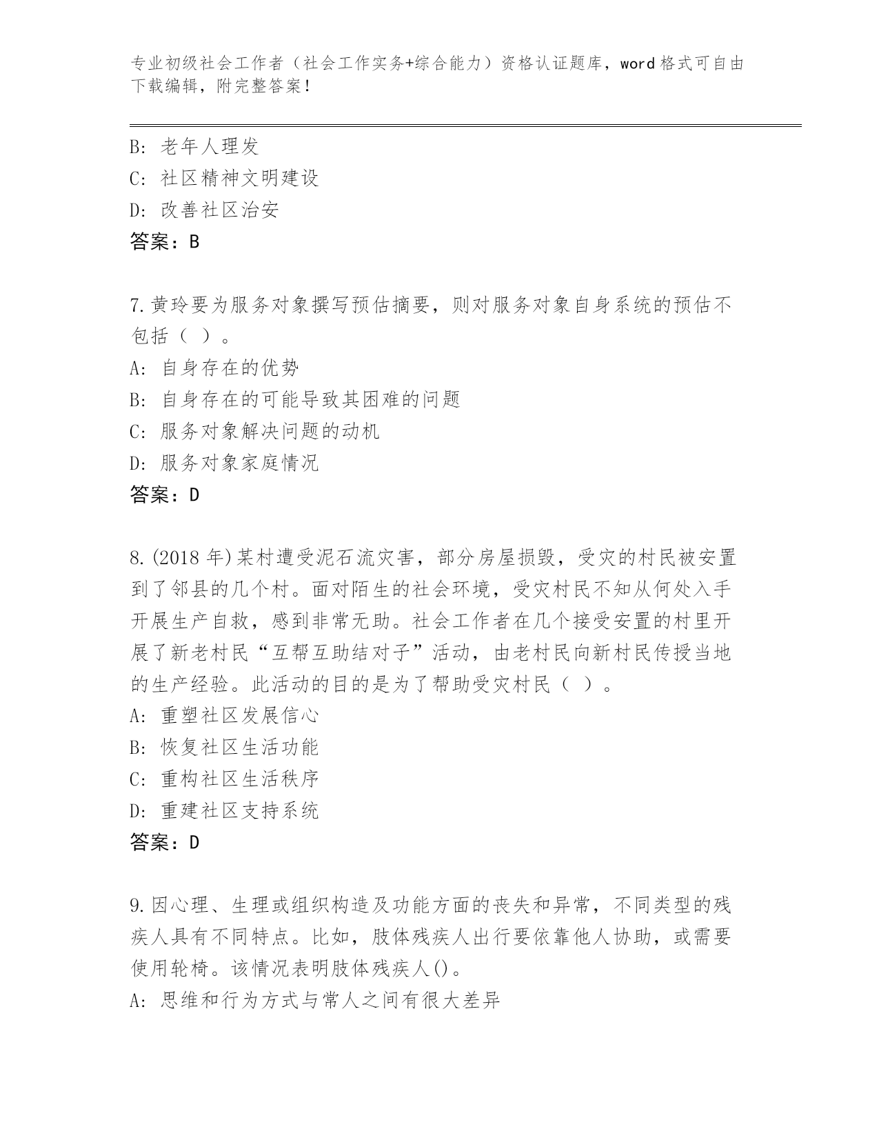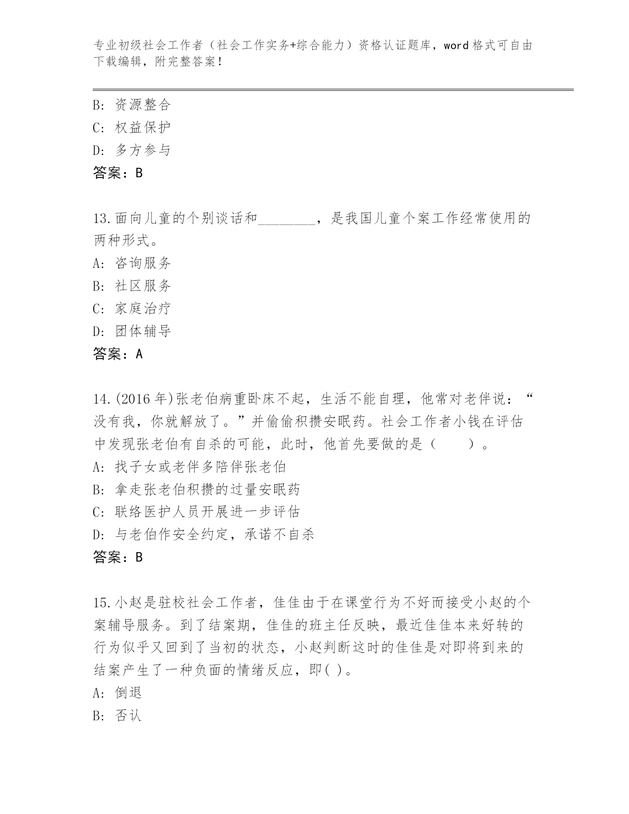 专业初级社会工作者(社会工作实务+综合能力)资格认证题库,word格式可自由下载编辑,附完整答案!历年河北省初级社会工作者(社会工作实务+综合能力)资格认证题库及参考答案(模拟题)第I部分单选题(100题)1.与受助家庭成员协商服务结束事项以及总结和巩固整个服务活动的成果,这是家庭社会工作者在哪一阶段需要完成的任务()A:接触阶段B:介入阶段C:结束阶段D:开始阶段答案:C2.(2016年)小赵是负责社区残疾人事务的社会工作者,经过需求评估后发现,社区的一些残疾人在家庭日常生活、出行等方面存在诸多不便,缺乏照顾。小赵拟从中观层面介入,适宜的做法是()。A:提升残疾人适应社会环境的能力B:发展残疾人社区支持系统C:完善残疾人社会保障体系D:推动城乡基本医疗公共服务均衡发展答案:B3.社会工作者老胡通过观察社区环境和走访居民,初步判断社区中的规范性需要没有得到满足,下列内容中,可作为老胡判断依据的是()。A:居民对社区环境卫生有意见B:社区绿地面积比周围社区少C:服务场所面积未达到政府规定标准D:居民反映附近工地施工噪音扰民答案:C4.社会工作者小梁在做一项关于服刑人员子女的研究,在收集资料时小粱特别注意在征得研究对象同意的情况下进行,给研究对象充分的权利表达自己,避免给研究对象带来伤害,这里主要体现的是小梁严格遵守:A:社会工作的伦理B:研究选题的伦理C:社会研究的伦理D:田野调查的伦理答案:C5.(2019年)社会工作者小李对社区的“暖心服务队”进行个案研究,探索“暖心服务队”的发展历程,尝试总结社区社会组织培训的模式,关于该研究的说法,正确的是()A:研究资料收集步骤是关键,应注重先观察后访谈的顺序组合B:研究侧重于横向研究,注重“暖心服务队”队员的主观感受C:研究体现出“暖心服务队”队员作为研究对象的个别性特点D:研究过程中,资料的获取、梳理和探究相互衔接并融为一体答案:D6.通过布雷德绍提出的四种需要的类型来界定社区需求时,服务对象觉得有需要,但有关专家、政府行政人员却不觉得是必需的案例是()。A:家庭暴力受虐者庇护所B:老年人理发C:社区精神文明建设D:改善社区治安答案:B7.黄玲要为服务对象撰写预估摘要,则对服务对象自身系统的预估不包括()。A:自身存在的优势B:自身存在的可能导致其困难的问题C:服务对象解决问题的动机D:服务对象家庭情况答案:D8.(2018年)某村遭受泥石流灾害,部分房屋损毁,受灾的村民被安置到了邻县的几个村。面对陌生的社会环境,受灾村民不知从何处入手开展生产自救,感到非常无助。社会工作者在几个接受安置的村里开展了新老村民“互帮互助结对子”活动,由老村民向新村民传授当地的生产经验。此活动的目的是为了帮助受灾村民()。A:重塑社区发展信心B:恢复社区生活功能C:重构社区生活秩序D:重建社区支持系统答案:D9.因心理、生理或组织构造及功能方面的丧失和异常,不同类型的残疾人具有不同特点。比如,肢体残疾人出行要依靠他人协助,或需要使用轮椅。该情况表明肢体残疾人()。A:思维和行为方式与常人之间有很大差异B:对于外部世界的知觉范围受到严重限制C:与他人沟通交流的渠道受到限制,能力严重受损D:自理生活和参与社会活动存在较大障碍答案:D10.下列选项中,关于同辈群体的描述正确的是()。A:同辈群体内部具有权威性B:年龄、兴趣、志趣、职业、社会地位等方面大体相近的人之间容易形成同辈群体C:同辈群体对个体的影响都是积极影响D:同辈群体和工作单位一样都是正式群体答案:B11.(2017年)社会工作者小燕在前期需求评估中发现,社区内的部分残疾人有就业和融入社会的需求。为此,小燕拟采用职业康复方法满足其需求,她开展该项服务的步骤应是()A:评估--培训--咨询--就业指导B:评估--咨询--培训--就业指导C:咨询--培训--评估--就业指导D:咨询--评估--培训--就业指导答案:D12.(2020年真题)某社区开展“新时代文明实践”活动,招募在“社区烹饪大赛”中评选出的老年烹饪能手当志愿者,参加“老年助餐”志愿服务,不仅解决了该社区的老年人吃饭难问题,还发挥了老年烹饪能手的一技之长。上述做法体现了老年社区社会工作()的原则。A:健康维护B:资源整合C:权益保护D:多方参与答案:B13.面向儿童的个别谈话和________,是我国儿童个案工作经常使用的两种形式。A:咨询服务B:社区服务C:家庭治疗D:团体辅导答案:A14.(2016年)张老伯病重卧床不起,生活不能自理,他常对老伴说:“没有我,你就解放了。”并偷偷积攒安眠药。社会工作者小钱在评估中发现张老伯有自杀的可能,此时,他首先要做的是()。A:找子女或老伴多陪伴张老伯B:拿走张老伯积攒的过量安眠药C:联络医护人员开展进一步评估D:与老伯作安全约定,承诺不自杀答案: