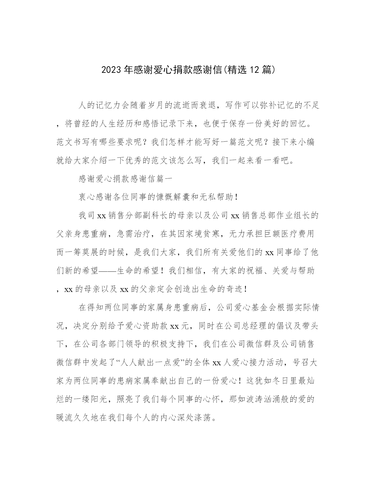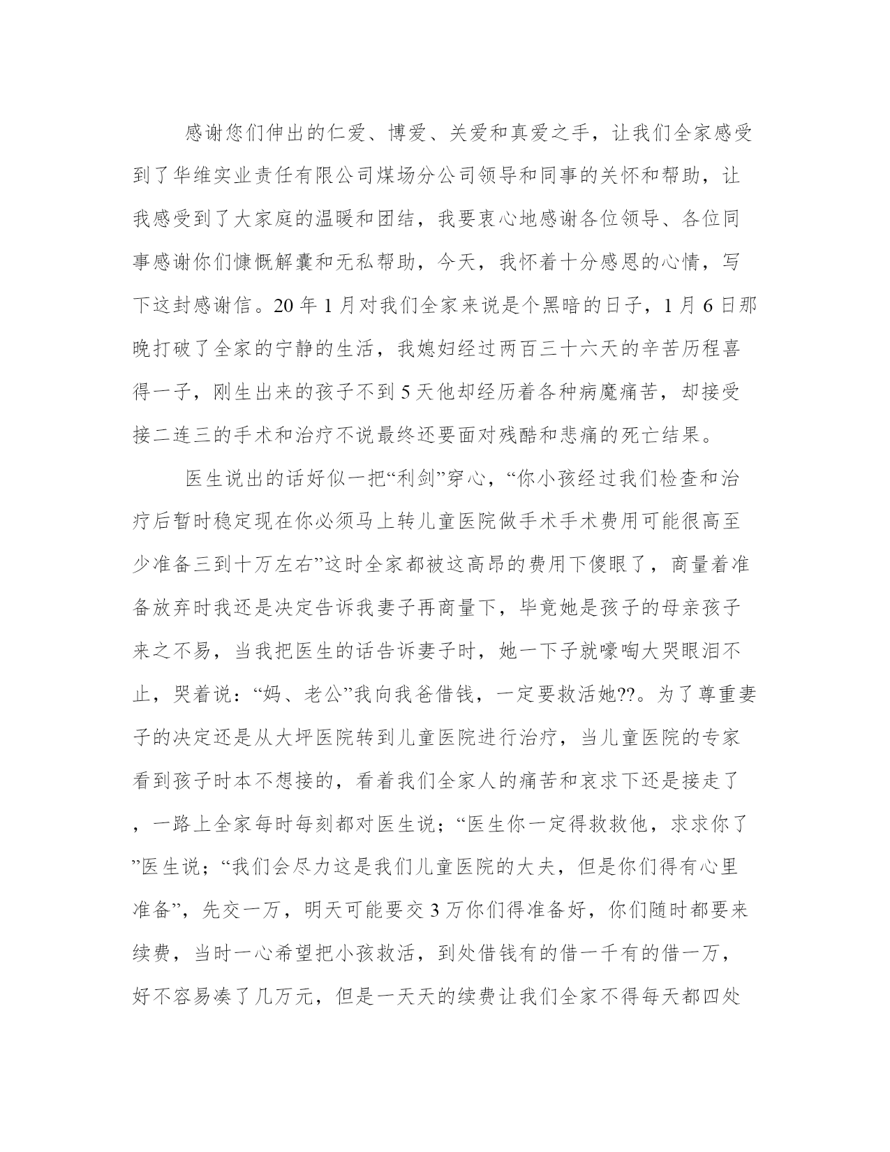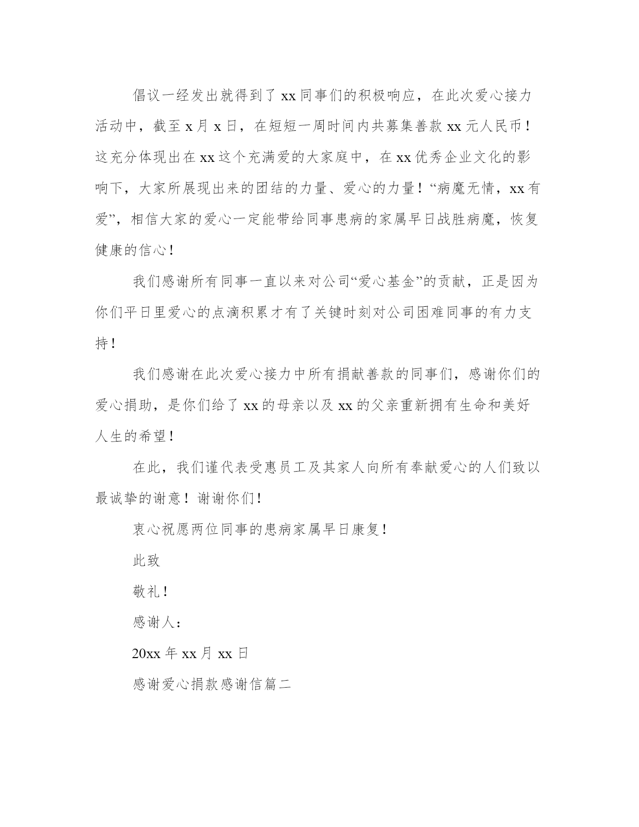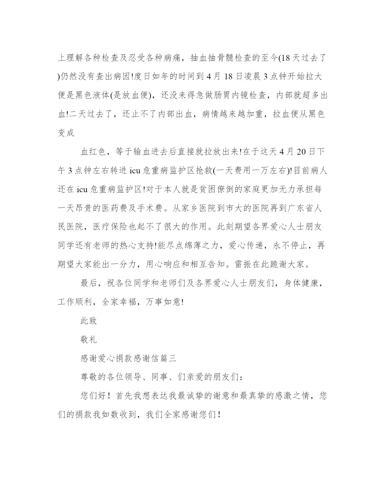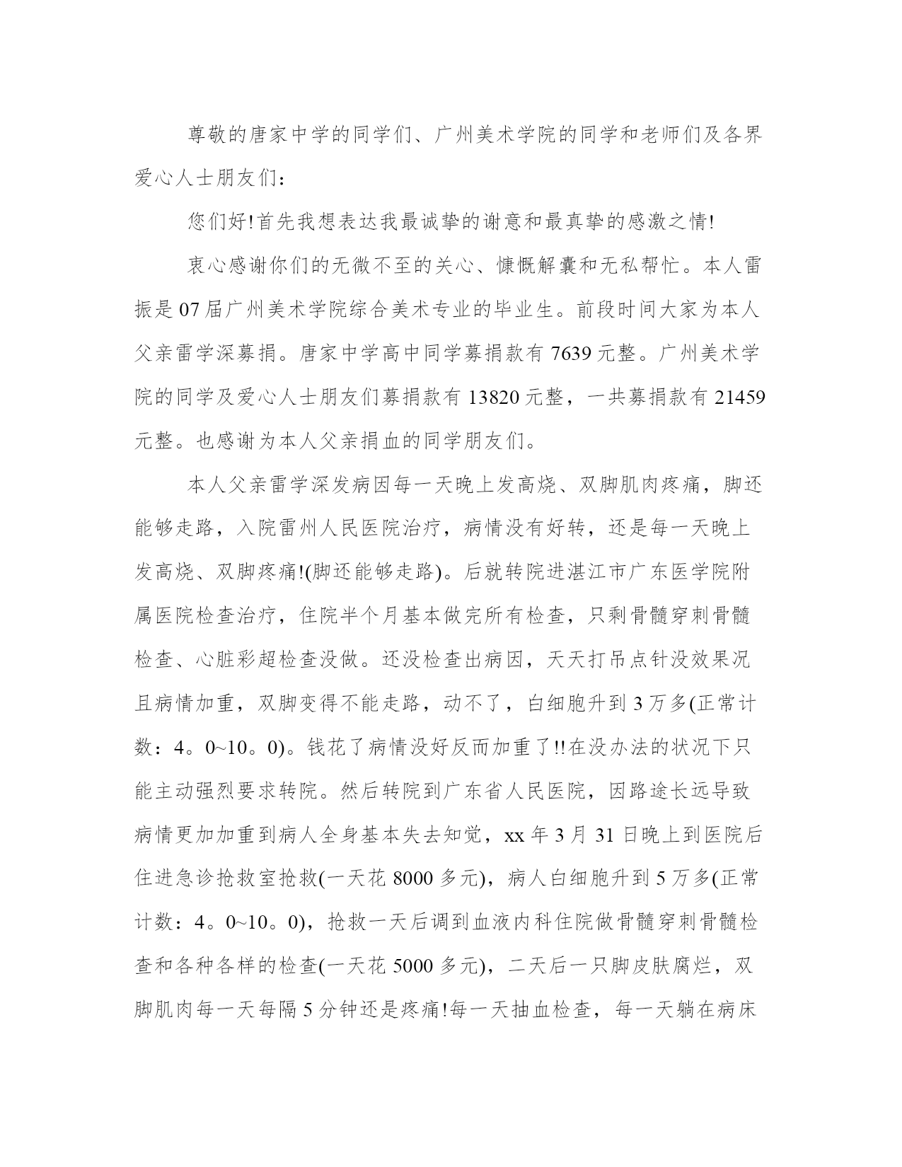 2023年感谢爱心捐款感谢信(精选12篇)人的记忆力会随着岁月的流逝而衰退,写作可以弥补记忆的不足,将曾经的人生经历和感悟记录下来,也便于保存一份美好的回忆。范文书写有哪些要求呢?我们怎样才能写好一篇范文呢?接下来小编就给大家介绍一下优秀的范文该怎么写,我们一起来看一看吧。感谢爱心捐款感谢信篇一衷心感谢各位同事的慷慨解囊和无私帮助!我司xx销售分部副科长的母亲以及公司xx销售总部作业组长的父亲身患重病,急需治疗,在其因家境贫寒,无力承担巨额医疗费用而一筹莫展的时候,是我们大家,我们所有关爱他们的xx同事给了他们新的希望——生命的希望!我们相信,有大家的祝福、关爱与帮助,xx的母亲以及xx的父亲定会创造出生命的奇迹!在得知两位同事的家属身患重病后,公司爱心基金会根据实际情况,决定分别给予爱心资助款xx元,同时在公司总经理的倡议及带头下,在公司各部门领导的积极支持下,我们在公司微信群及公司销售微信群中发起了“人人献出一点爱”的全体xx人爱心接力活动,号召大家为两位同事的患病家属奉献出自己的一份爱心!这犹如冬日里最灿烂的一缕阳光,照亮了我们每个同事的心怀,那如波涛汹涌般的爱的暖流久久地在我们每个人的内心深处涤荡。倡议一经发出就得到了xx同事们的积极响应,在此次爱心接力活动中,截至x月x日,在短短一周时间内共募集善款xx元人民币!这充分体现出在xx这个充满爱的大家庭中,在xx优秀企业文化的影响下,大家所展现出来的团结的力量、爱心的力量!“病魔无情,xx有爱”,相信大家的爱心一定能带给同事患病的家属早日战胜病魔,恢复健康的信心!我们感谢所有同事一直以来对公司“爱心基金”的贡献,正是因为你们平日里爱心的点滴积累才有了关键时刻对公司困难同事的有力支持!我们感谢在此次爱心接力中所有捐献善款的同事们,感谢你们的爱心捐助,是你们给了xx的母亲以及xx的父亲重新拥有生命和美好人生的希望!在此,我们谨代表受惠员工及其家人向所有奉献爱心的人们致以最诚挚的谢意!谢谢你们!衷心祝愿两位同事的患病家属早日康复!此致敬礼!感谢人:20xx年xx月xx日感谢爱心捐款感谢信篇二尊敬的唐家中学的同学们、广州美术学院的同学和老师们及各界爱心人士朋友们:您们好!首先我想表达我最诚挚的谢意和最真挚的感激之情!衷心感谢你们的无微不至的关心、慷慨解囊和无私帮忙。本人雷振是07届广州美术学院综合美术专业的毕业生。前段时间大家为本人父亲雷学深募捐。唐家中学高中同学募捐款有7639元整。广州美术学院的同学及爱心人士朋友们募捐款有13820元整,一共募捐款有21459元整。也感谢为本人父亲捐血的同学朋友们。本人父亲雷学深发病因每一天晚上发高烧、双脚肌肉疼痛,脚还能够走路,入院雷州人民医院治疗,病情没有好转,还是每一天晚上发高烧、双脚疼痛!(脚还能够走路)。后就转院进湛江市广东医学院附属医院检查治疗,住院半个月基本做完所有检查,只剩骨髓穿刺骨髓检查、心脏彩超检查没做。还没检查出病因,天天打吊点针没效果况且病情加重,双脚变得不能走路,动不了,白细胞升到3万多(正常计数:4。0~10。0)。钱花了病情没好反而加重了!!在没办法的状况下只能主动强烈要求转院。然后转院到广东省人民医院,因路途长远导致病情更加加重到病人全身基本失去知觉,xx年3月31日晚上到医院后住进急诊抢救室抢救(一天花8000多元),病人白细胞升到5万多(正常计数:4。0~10。0),抢救一天后调到血液内科住院做骨髓穿刺骨髓检查和各种各样的检查(一天花5000多元),二天后一只脚皮肤腐烂,双脚肌肉每一天每隔5分钟还是疼痛!每一天抽血检查,每一天躺在病床上理解各种检查及忍受各种病痛,抽血抽骨髓检查的至今(18天过去了)仍然没有查出病因!度日如年的时间到4月18日凌晨3点钟开始拉大便是黑色液体(是放血便),还没来得急做肠胃内镜检查,内部就超多出血!二天过去了,还止不了内部出血,病情越来越加重,拉血便从黑色变成血红色,等于输血进去后直接就拉放出来!在于这天4月20日下午3点钟左右转进icu危重病监护区抢救(一天费用一万左右)!目前病人还在icu危重病监护区!对于本人就是贫困僚倒的家庭更加无力承担每一天昂贵的医药费及手术费。从家乡医院到市大的医院再到广东省人民医院,医疗保险也起不了很大的作用。此刻期望各界爱心人士朋友同学还有老师的热心支持!能尽点绵薄之力,爱心传递,永不停止,再期望大家能出一分力,用心响应和相互告知。雷振在此跪谢大家。最后,祝各位同学和老师们及各界爱心人士朋友们,身体健康,工作顺利,全家幸福,万事如意!此致敬礼感谢爱心捐款感谢信篇三尊敬的各位领导、同事、们亲爱的朋友们:您们好!首先我想表达我最诚挚的谢意和最真挚的感激之情,您们的捐款我如数收到,我们全家感谢您们!感谢您们伸出的仁爱、博爱、关爱和真爱之手,让我们全家感受
