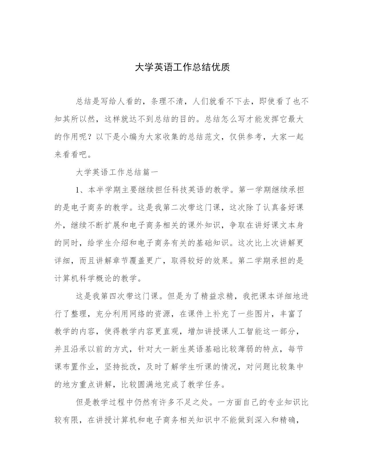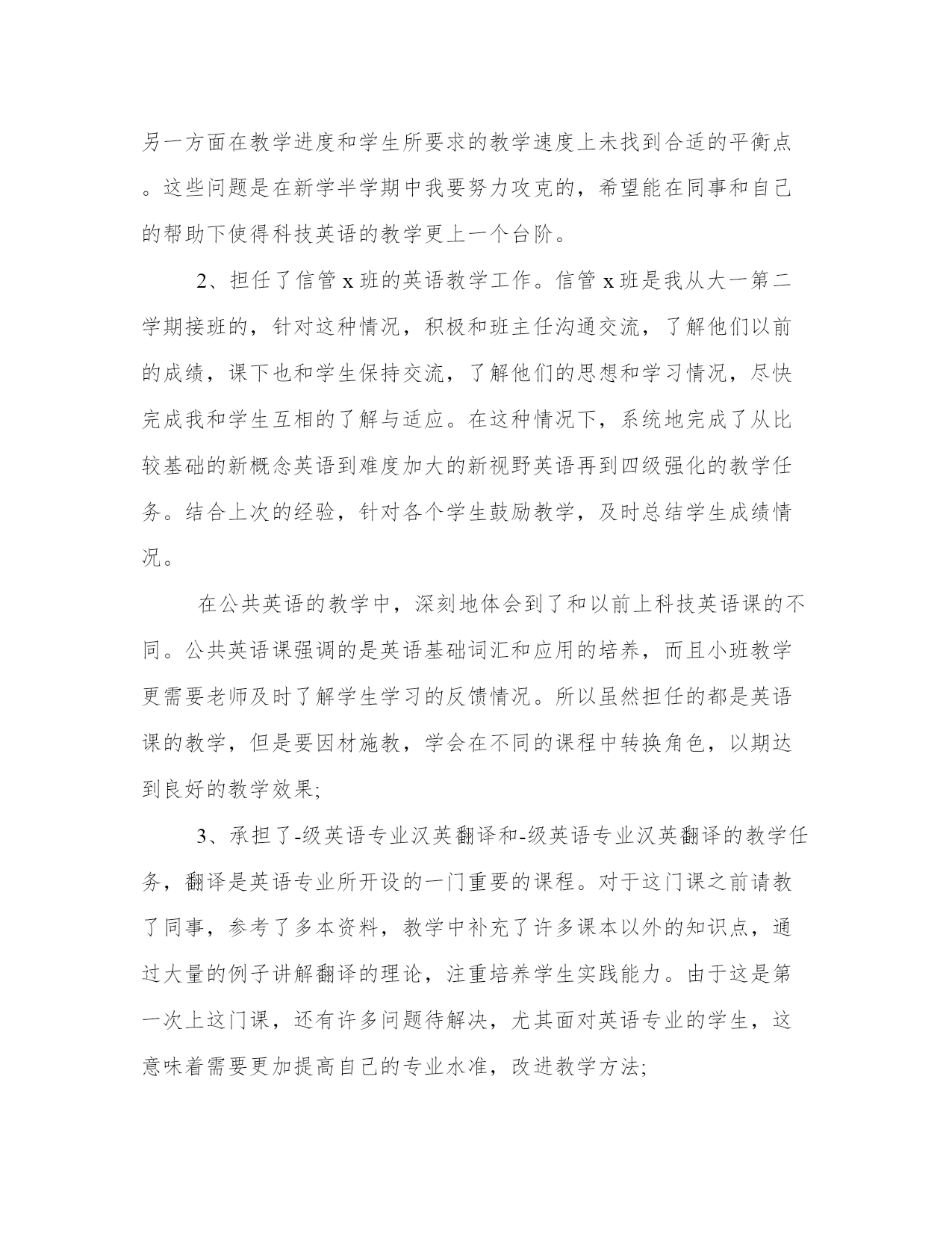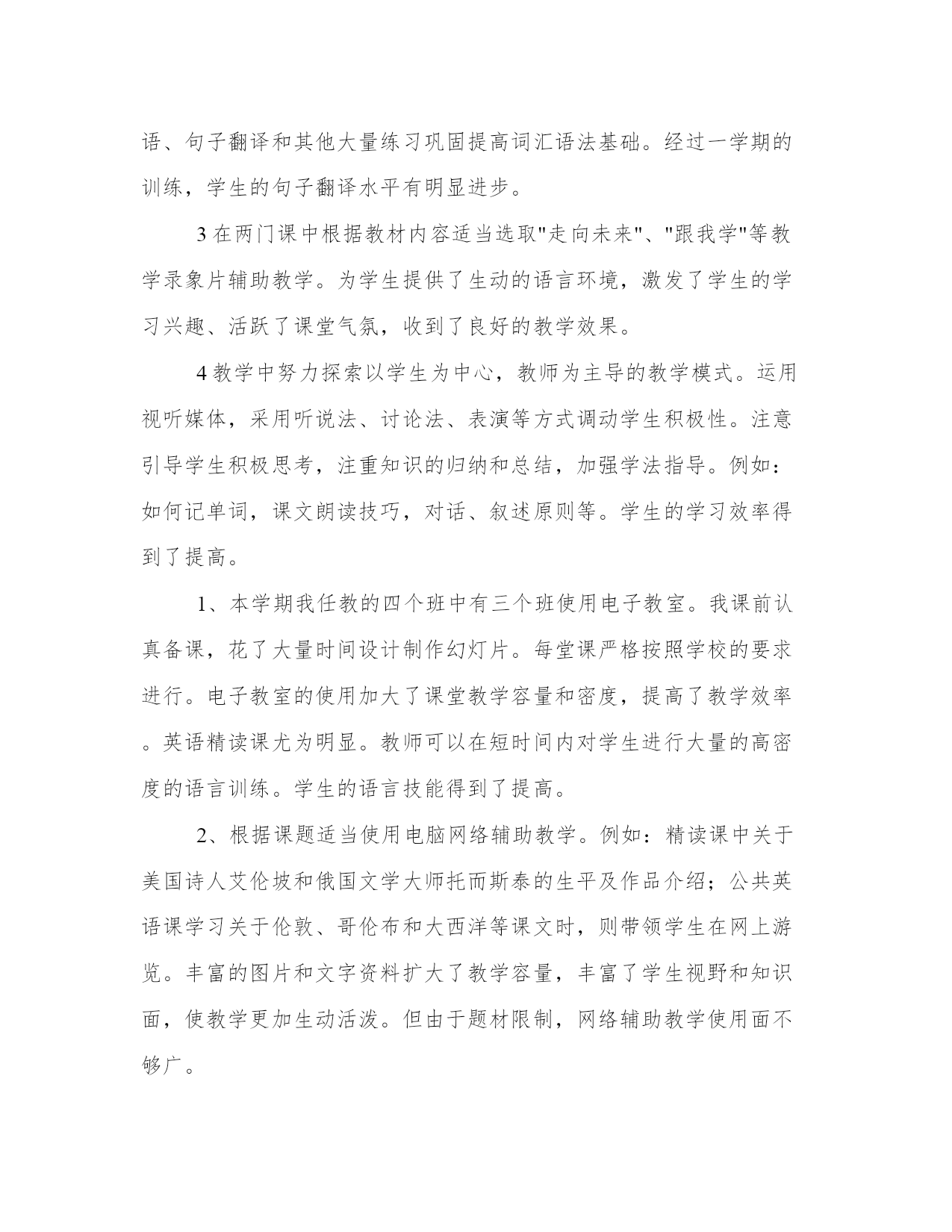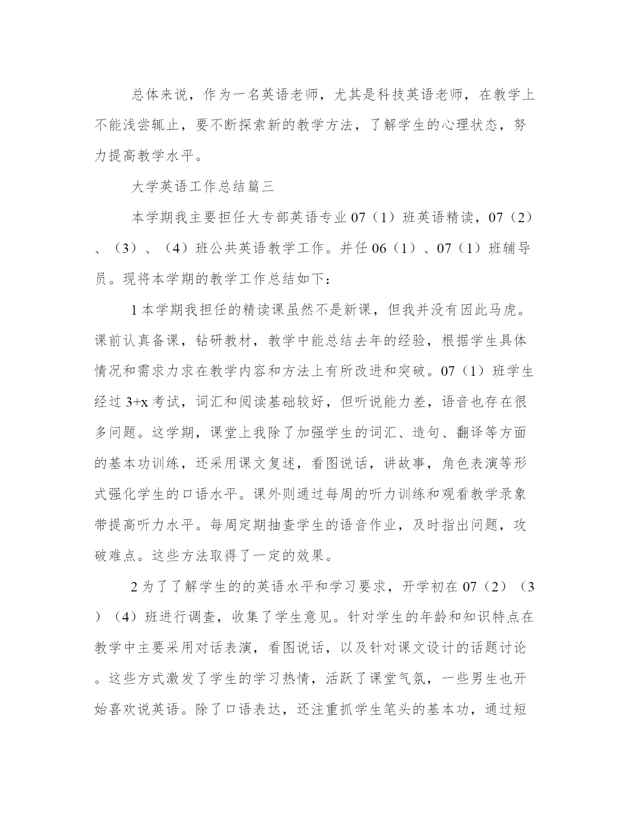 大学英语工作总结优质总结是写给人看的,条理不清,人们就看不下去,即使看了也不知其所以然,这样就达不到总结的目的。总结怎么写才能发挥它最大的作用呢?以下是小编为大家收集的总结范文,仅供参考,大家一起来看看吧。大学英语工作总结篇一1、本半学期主要继续担任科技英语的教学。第一学期继续承担的是电子商务的教学。这是我第二次带这门课,这次除了认真备好课外,继续不断扩展和电子商务相关的课外知识,争取在讲好课文本身的同时,给学生介绍和电子商务有关的基础知识。这次比上次讲解更详细,而且讲解章节覆盖更广,取得较好的效果。第二学期承担的是计算机科学概论的教学。这是我第四次带这门课。但是为了精益求精,我把课本详细地进行了整理,充分利用网络的资源,在课件上补充了一些图片,丰富了教学的内容,使得教学内容更直观,增加讲授课人工智能这一部分,并且沿承以前的方式,针对大一新生英语基础比较薄弱的特点,每节课布置作业,坚持批改,及时了解学生听课的情况,对问题比较集中的地方重点讲解,比较圆满地完成了教学任务。但是教学过程中仍然有许多不足之处。一方面自己的专业知识比较有限,在讲授计算机和电子商务相关知识中不能做到深入和精确,另一方面在教学进度和学生所要求的教学速度上未找到合适的平衡点。这些问题是在新学半学期中我要努力攻克的,希望能在同事和自己的帮助下使得科技英语的教学更上一个台阶。2、担任了信管x班的英语教学工作。信管x班是我从大一第二学期接班的,针对这种情况,积极和班主任沟通交流,了解他们以前的成绩,课下也和学生保持交流,了解他们的思想和学习情况,尽快完成我和学生互相的了解与适应。在这种情况下,系统地完成了从比较基础的新概念英语到难度加大的新视野英语再到四级强化的教学任务。结合上次的经验,针对各个学生鼓励教学,及时总结学生成绩情况。在公共英语的教学中,深刻地体会到了和以前上科技英语课的不同。公共英语课强调的是英语基础词汇和应用的培养,而且小班教学更需要老师及时了解学生学习的反馈情况。所以虽然担任的都是英语课的教学,但是要因材施教,学会在不同的课程中转换角色,以期达到良好的教学效果;3、承担了-级英语专业汉英翻译和-级英语专业汉英翻译的教学任务,翻译是英语专业所开设的一门重要的课程。对于这门课之前请教了同事,参考了多本资料,教学中补充了许多课本以外的知识点,通过大量的例子讲解翻译的理论,注重培养学生实践能力。由于这是第一次上这门课,还有许多问题待解决,尤其面对英语专业的学生,这意味着需要更加提高自己的专业水准,改进教学方法;总体来说,作为一名英语老师,尤其是科技英语老师,在教学上不能浅尝辄止,要不断探索新的教学方法,了解学生的心理状态,努力提高教学水平。大学英语工作总结篇三本学期我主要担任大专部英语专业07(1)班英语精读,07(2)、(3)、(4)班公共英语教学工作。并任06(1)、07(1)班辅导员。现将本学期的教学工作总结如下:1本学期我担任的精读课虽然不是新课,但我并没有因此马虎。课前认真备课,钻研教材,教学中能总结去年的经验,根据学生具体情况和需求力求在教学内容和方法上有所改进和突破。07(1)班学生经过3+x考试,词汇和阅读基础较好,但听说能力差,语音也存在很多问题。这学期,课堂上我除了加强学生的词汇、造句、翻译等方面的基本功训练,还采用课文复述,看图说话,讲故事,角色表演等形式强化学生的口语水平。课外则通过每周的听力训练和观看教学录象带提高听力水平。每周定期抽查学生的语音作业,及时指出问题,攻破难点。这些方法取得了一定的效果。2为了了解学生的的英语水平和学习要求,开学初在07(2)(3)(4)班进行调查,收集了学生意见。针对学生的年龄和知识特点在教学中主要采用对话表演,看图说话,以及针对课文设计的话题讨论。这些方式激发了学生的学习热情,活跃了课堂气氛,一些男生也开始喜欢说英语。除了口语表达,还注重抓学生笔头的基本功,通过短语、句子翻译和其他大量练习巩固提高词汇语法基础。经过一学期的训练,学生的句子翻译水平有明显进步。3在两门课中根据教材内容适当选取"走向未来"、"跟我学"等教学录象片辅助教学。为学生提供了生动的语言环境,激发了学生的学习兴趣、活跃了课堂气氛,收到了良好的教学效果。4教学中努力探索以学生为中心,教师为主导的教学模式。运用视听媒体,采用听说法、讨论法、表演等方式调动学生积极性。注意引导学生积极思考,注重知识的归纳和总结,加强学法指导。例如:如何记单词,课文朗读技巧,对话、叙述原则等。学生的学习效率得到了提高。1、本学期我任教的四个班中有三个班使用电子教室。我课前认真备课,花了大量时间设计制作幻灯片。每堂课严格按照学校的要求进行。电子教室的使用加大了课堂教学容量和密度,提高了教学效率。英语精读课尤为明显。教师可以在短时间内对学生进行大量的高密度