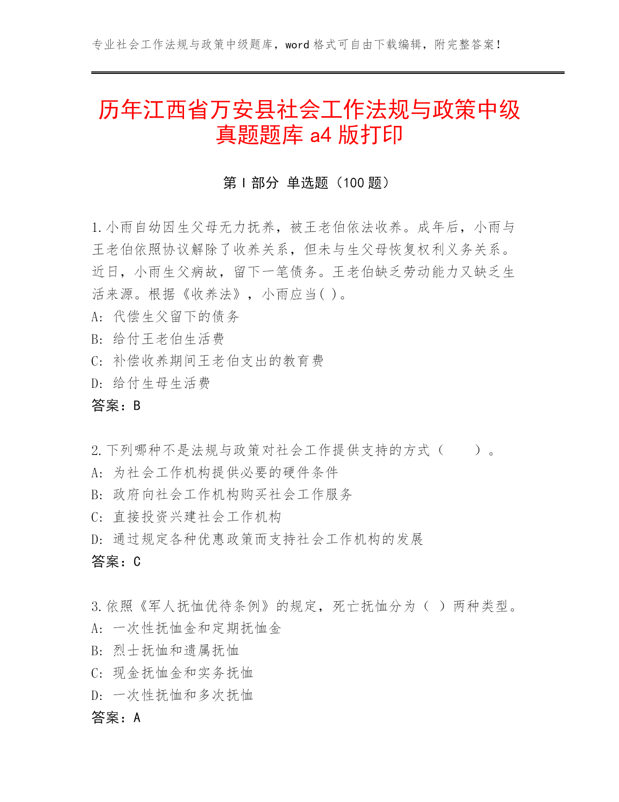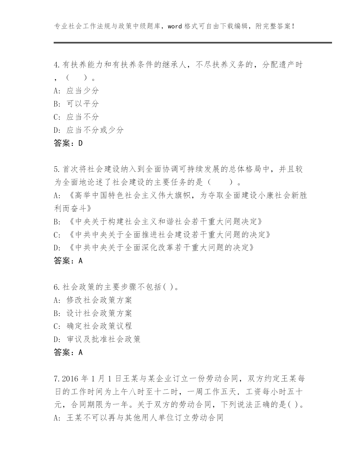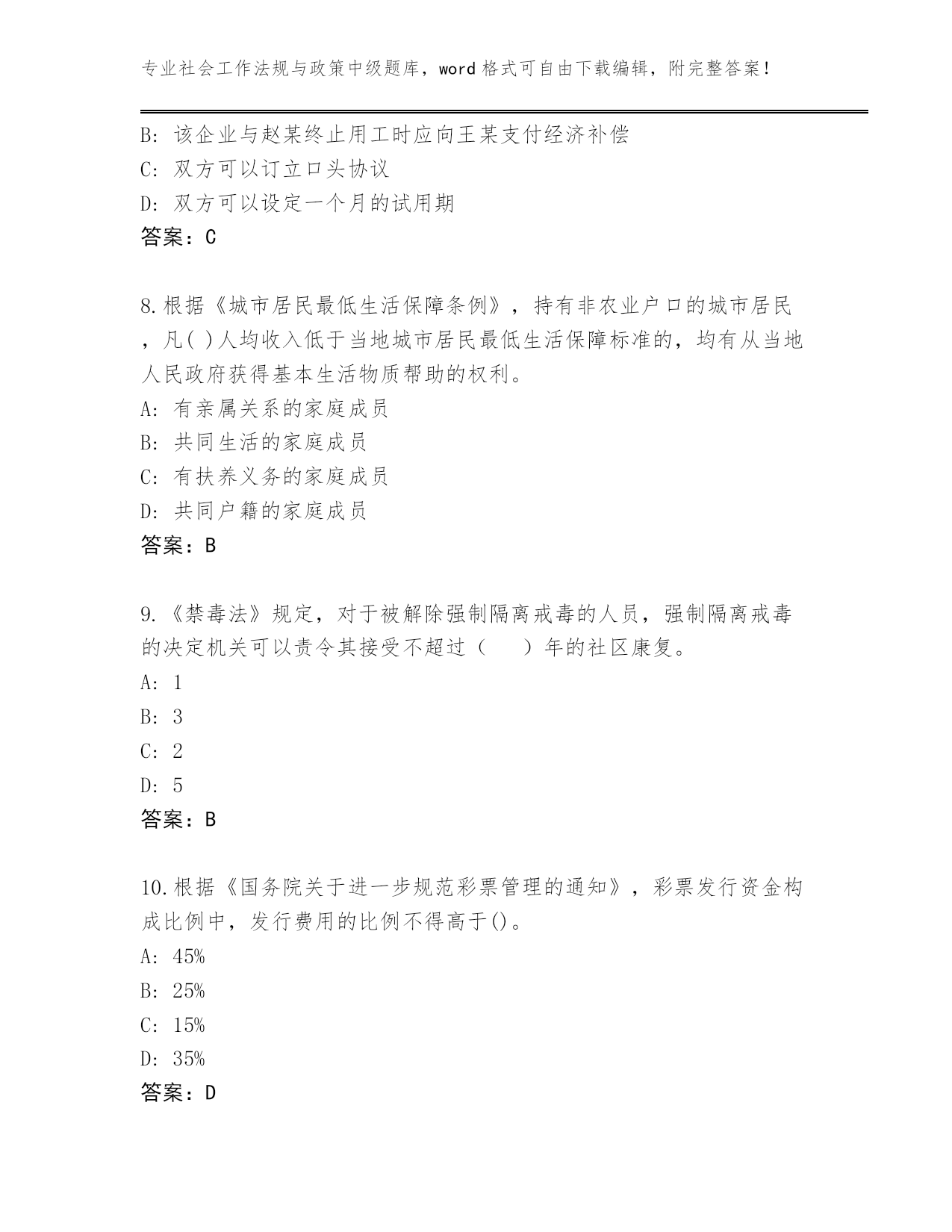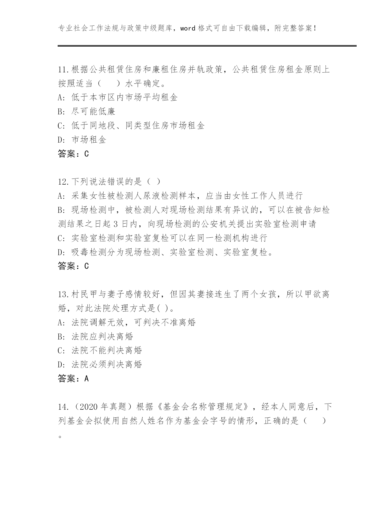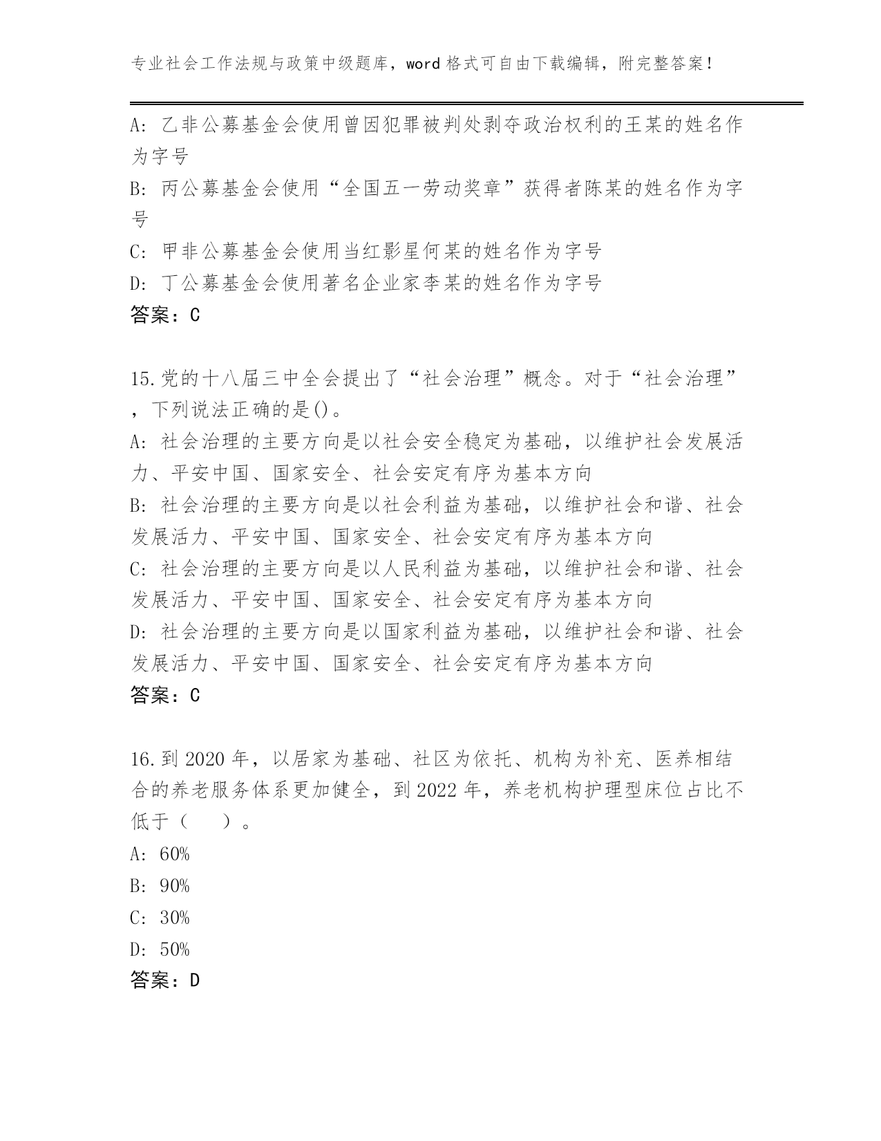 专业社会工作法规与政策中级题库,word格式可自由下载编辑,附完整答案!历年江西省万安县社会工作法规与政策中级真题题库a4版打印第I部分单选题(100题)1.小雨自幼因生父母无力抚养,被王老伯依法收养。成年后,小雨与王老伯依照协议解除了收养关系,但未与生父母恢复权利义务关系。近日,小雨生父病故,留下一笔债务。王老伯缺乏劳动能力又缺乏生活来源。根据《收养法》,小雨应当()。A:代偿生父留下的债务B:给付王老伯生活费C:补偿收养期间王老伯支出的教育费D:给付生母生活费答案:B2.下列哪种不是法规与政策对社会工作提供支持的方式()。A:为社会工作机构提供必要的硬件条件B:政府向社会工作机构购买社会工作服务C:直接投资兴建社会工作机构D:通过规定各种优惠政策而支持社会工作机构的发展答案:C3.依照《军人抚恤优待条例》的规定,死亡抚恤分为()两种类型。A:一次性抚恤金和定期抚恤金B:烈士抚恤和遗属抚恤C:现金抚恤金和实务抚恤D:一次性抚恤和多次抚恤答案:A4.有扶养能力和有扶养条件的继承人,不尽扶养义务的,分配遗产时,()。A:应当少分B:可以平分C:应当不分D:应当不分或少分答案:D5.首次将社会建设纳入到全面协调可持续发展的总体格局中,并且较为全面地论述了社会建设的主要任务的是()。A:《高举中国特色社会主义伟大旗帜,为夺取全面建设小康社会新胜利而奋斗》B:《中央关于构建社会主义和谐社会若干重大问题决定》C:《中共中央关于全面推进社会建设若干重大问题的决定》D:《中共中央关于全面深化改革若干重大问题的决定》答案:A6.社会政策的主要步骤不包括()。A:修改社会政策方案B:设计社会政策方案C:确定社会政策议程D:审议及批准社会政策答案:A7.2016年1月1日王某与某企业订立一份劳动合同,双方约定王某每日的工作时间为上午八时至十二时,一周工作五天.工资每小时五十元,合同期限为一年。关于双方的劳动合同,下列说法正确的是()。A:王某不可以再与其他用人单位订立劳动合同B:该企业与赵某终止用工时应向王某支付经济补偿C:双方可以订立口头协议D:双方可以设定一个月的试用期答案:C8.根据《城市居民最低生活保障条例》,持有非农业户口的城市居民,凡()人均收入低于当地城市居民最低生活保障标准的,均有从当地人民政府获得基本生活物质帮助的权利。A:有亲属关系的家庭成员B:共同生活的家庭成员C:有扶养义务的家庭成员D:共同户籍的家庭成员答案:B9.《禁毒法》规定,对于被解除强制隔离戒毒的人员,强制隔离戒毒的决定机关可以责令其接受不超过()年的社区康复。A:1B:3C:2D:5答案:B10.根据《国务院关于进一步规范彩票管理的通知》,彩票发行资金构成比例中,发行费用的比例不得高于()。A:45%B:25%C:15%D:35%答案:D11.根据公共租赁住房和廉租住房并轨政策,公共租赁住房租金原则上按照适当()水平确定。A:低于本市区内市场平均租金B:尽可能低廉C:低于同地段、同类型住房市场租金D:市场租金答案:C12.下列说法错误的是()A:采集女性被检测人尿液检测样本,应当由女性工作人员进行B:现场检测中,被检测人对现场检测结果有异议的,可以在被告知检测结果之日起3日内,向现场检测的公安机关提出实验室检测申请C:实验室检测和实验室复检可以在同一检测机构进行D:吸毒检测分为现场检测、实验室检测、实验室复检。答案:C13.村民甲与妻子感情较好,但因其妻接连生了两个女孩,所以甲欲离婚,对此法院处理方式是()。A:法院调解无效,可判决不准离婚B:法院应判决离婚C:法院不能判决离婚D:法院必须判决离婚答案:A14.(2020年真题)根据《基金会名称管理规定》,经本人同意后,下列基金会拟使用自然人姓名作为基金会字号的情形,正确的是()。A:乙非公募基金会使用曾因犯罪被判处剥夺政治权利的王某的姓名作为字号B:丙公募基金会使用“全国五一劳动奖章”获得者陈某的姓名作为字号C:甲非公募基金会使用当红影星何某的姓名作为字号D:丁公募基金会使用著名企业家李某的姓名作为字号答案:C15.党的十八届三中全会提出了“社会治理”概念。对于“社会治理”,下列说法正确的是()。A:社会治理的主要方向是以社会安全稳定为基础,以维护社会发展活力、平安中国、国家安全、社会安定有序为基本方向B:社会治理的主要方向是以社会利益为基础,以维护社会和谐、社会发展活力、平安中国、国家安全、社会安定有序为基本方向C:社会治理的主要方向是以人民利益为基础,以维护社会和谐、社会发展活力、平安中国、国家安全、社会安定有序为基本方向D:社会治理的主要方向是以国家利益为基础,以维护社会和谐、社会发展活力、平安中国、国家安全、社会安定有序为基本方向答案:C16.到2020年,以居家为基础、社区为依托、机构为补充、医养相结