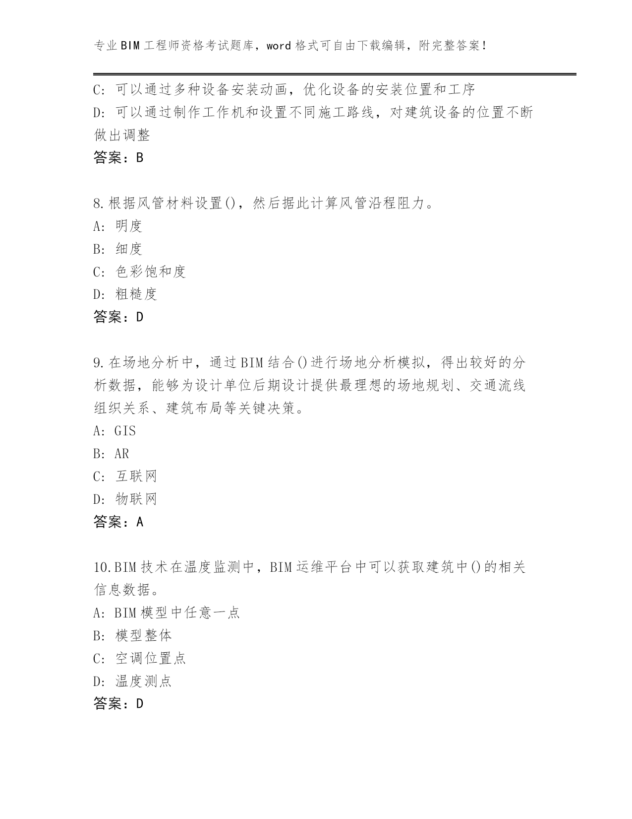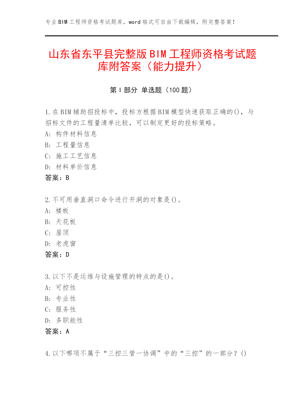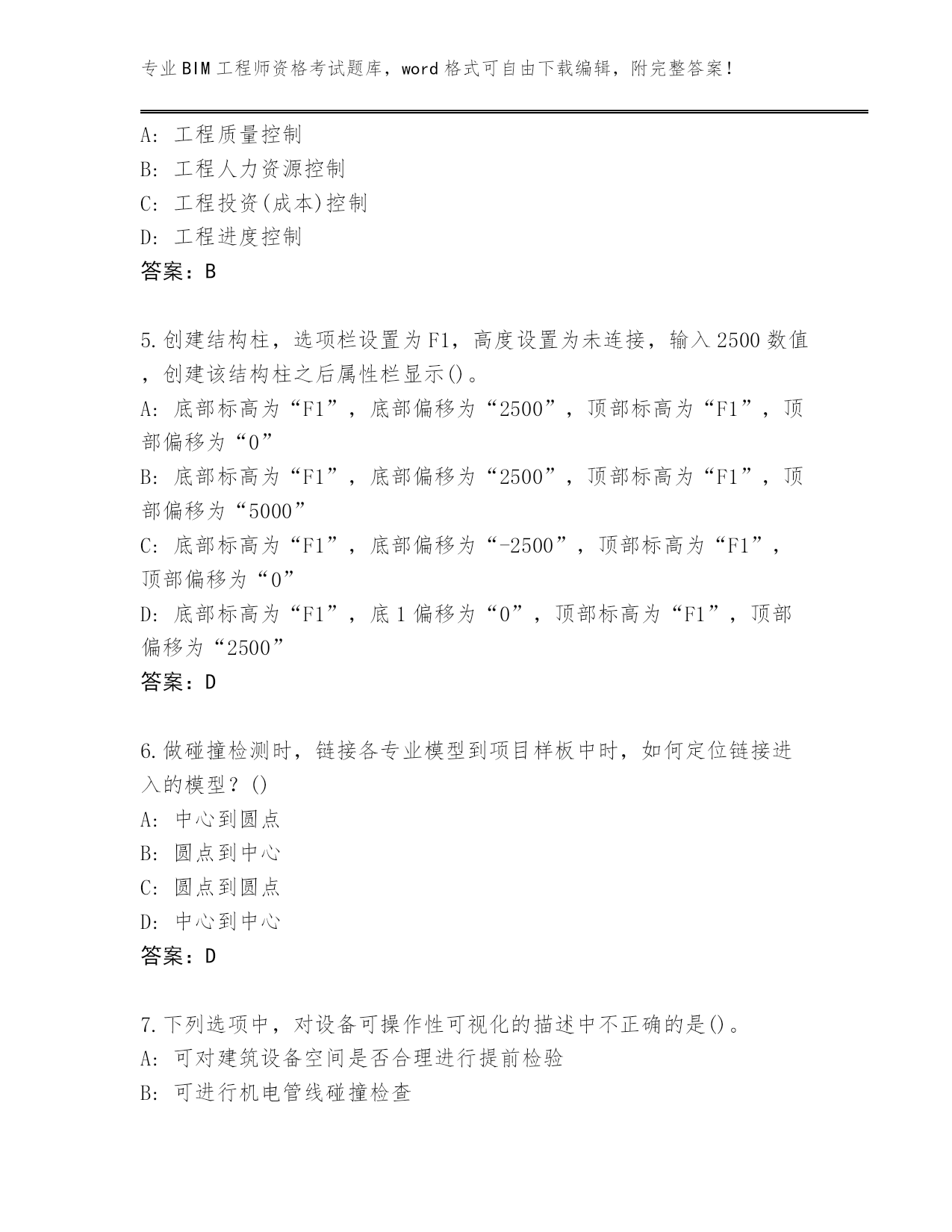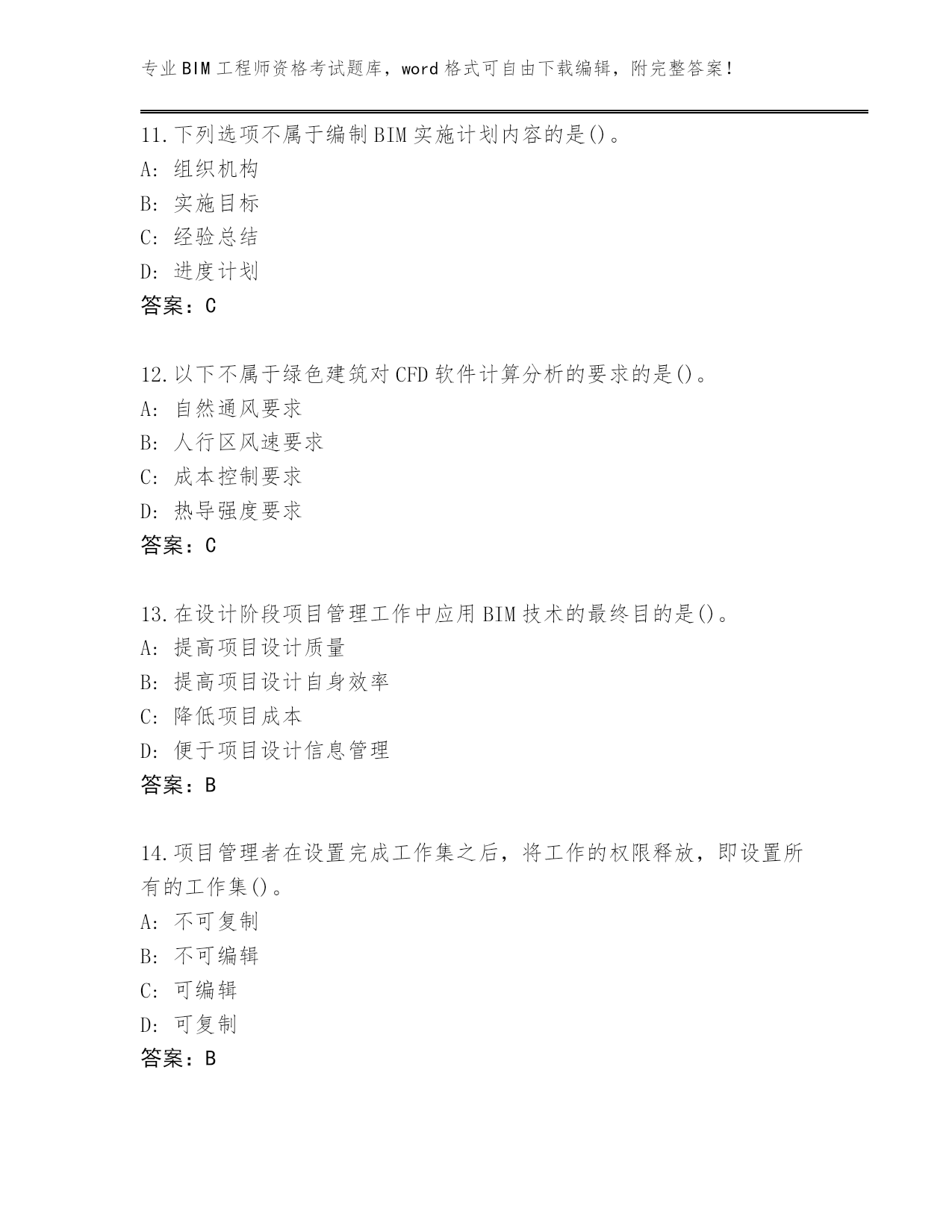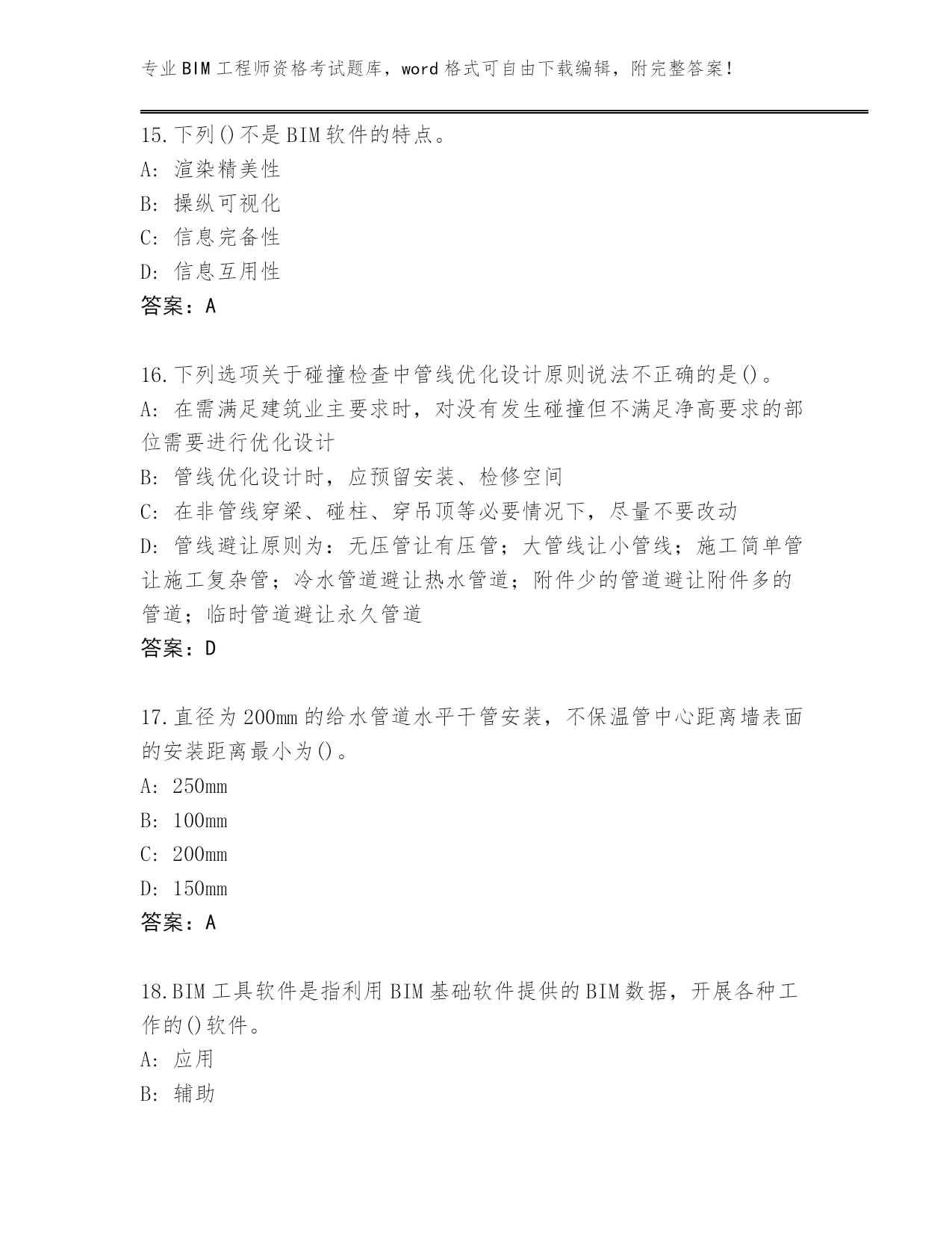 专业BIM工程师资格考试题库,word格式可自由下载编辑,附完整答案!山东省东平县完整版BIM工程师资格考试题库附答案(能力提升)第I部分单选题(100题)1.在BIM辅助招投标中,投标方根据BIM模型快速获取正确的(),与招标文件的工程量清单比较,可以制定更好的投标策略。A:构件材料信息B:工程量信息C:施工工艺信息D:材料单价信息答案:B2.不可用垂直洞口命令进行开洞的对象是()。A:楼板B:天花板C:屋顶D:老虎窗答案:D3.以下不是运维与设施管理的特点的是()。A:可控性B:专业性C:服务性D:多职能性答案:A4.以下哪项不属于“三控三管一协调”中的“三控”的一部分?()A:工程质量控制B:工程人力资源控制C:工程投资(成本)控制D:工程进度控制答案:B5.创建结构柱,选项栏设置为F1,高度设置为未连接,输入2500数值,创建该结构柱之后属性栏显示()。A:底部标高为“F1”,底部偏移为“2500”,顶部标高为“F1”,顶部偏移为“0”B:底部标高为“F1”,底部偏移为“2500”,顶部标高为“F1”,顶部偏移为“5000”C:底部标高为“F1”,底部偏移为“-2500”,顶部标高为“F1”,顶部偏移为“0”D:底部标高为“F1”,底1偏移为“0”,顶部标高为“F1”,顶部偏移为“2500”答案:D6.做碰撞检测时,链接各专业模型到项目样板中时,如何定位链接进入的模型?()A:中心到圆点B:圆点到中心C:圆点到圆点D:中心到中心答案:D7.下列选项中,对设备可操作性可视化的描述中不正确的是()。A:可对建筑设备空间是否合理进行提前检验B:可进行机电管线碰撞检查C:可以通过多种设备安装动画,优化设备的安装位置和工序D:可以通过制作工作机和设置不同施工路线,对建筑设备的位置不断做出调整答案:B8.根据风管材料设置(),然后据此计算风管沿程阻力。A:明度B:细度C:色彩饱和度D:粗糙度答案:D9.在场地分析中,通过BIM结合()进行场地分析模拟,得出较好的分析数据,能够为设计单位后期设计提供最理想的场地规划、交通流线组织关系、建筑布局等关键决策。A:GISB:ARC:互联网D:物联网答案:A10.BIM技术在温度监测中,BIM运维平台中可以获取建筑中()的相关信息数据。A:BIM模型中任意一点B:模型整体C:空调位置点D:温度测点答案:D11.下列选项不属于编制BIM实施计划内容的是()。A:组织机构B:实施目标C:经验总结D:进度计划答案:C12.以下不属于绿色建筑对CFD软件计算分析的要求的是()。A:自然通风要求B:人行区风速要求C:成本控制要求D:热导强度要求答案:C13.在设计阶段项目管理工作中应用BIM技术的最终目的是()。A:提高项目设计质量B:提高项目设计自身效率C:降低项目成本D:便于项目设计信息管理答案:B14.项目管理者在设置完成工作集之后,将工作的权限释放,即设置所有的工作集()。A:不可复制B:不可编辑C:可编辑D:可复制答案:B15.下列()不是BIM软件的特点。A:渲染精美性B:操纵可视化C:信息完备性D:信息互用性答案:A16.下列选项关于碰撞检查中管线优化设计原则说法不正确的是()。A:在需满足建筑业主要求时,对没有发生碰撞但不满足净高要求的部位需要进行优化设计B:管线优化设计时,应预留安装、检修空间C:在非管线穿梁、碰柱、穿吊顶等必要情况下,尽量不要改动D:管线避让原则为:无压管让有压管;大管线让小管线;施工简单管让施工复杂管;冷水管道避让热水管道;附件少的管道避让附件多的管道;临时管道避让永久管道答案:D17.直径为200mm的给水管道水平干管安装,不保温管中心距离墙表面的安装距离最小为()。A:250mmB:100mmC:200mmD:150mm答案:A18.BIM工具软件是指利用BIM基础软件提供的BIM数据,开展各种工作的()软件。A:应用B:辅助C:建模D:存储答案:A19.下列选项中属于BIM操作人员岗位职责的是()。A:BIM产品设计B:BIM战略制定C:BIM建模D:BIM项目管理答案:C20.建筑全生命周期是指从()、规划与设计、建造与运输、运行与维护直到拆除与处理(废弃、再循环和再利用等)的全循环过程。A:审批B:初步设计C:材料与构件生产D:分析与准备答案:C21.建设项目决策阶段,()为主要责任和协调方,负责收集来自各方的信息,确定初步方案并反馈给业主单位。A:咨询单位B:PLMTC:施工单位D:设计单位答案:B22.设施管理简称()。A:PMB:CMC:DMD:FM答案:D23.关于管线综合工作中的一般避让原则,错误的是?()A:小管让大管B:自流管道避让其他管道C:造价低的管道让造价高的管道D:利用梁间的空隙答案:B24.关于模型拆分原则表述错误的是()。A:按
