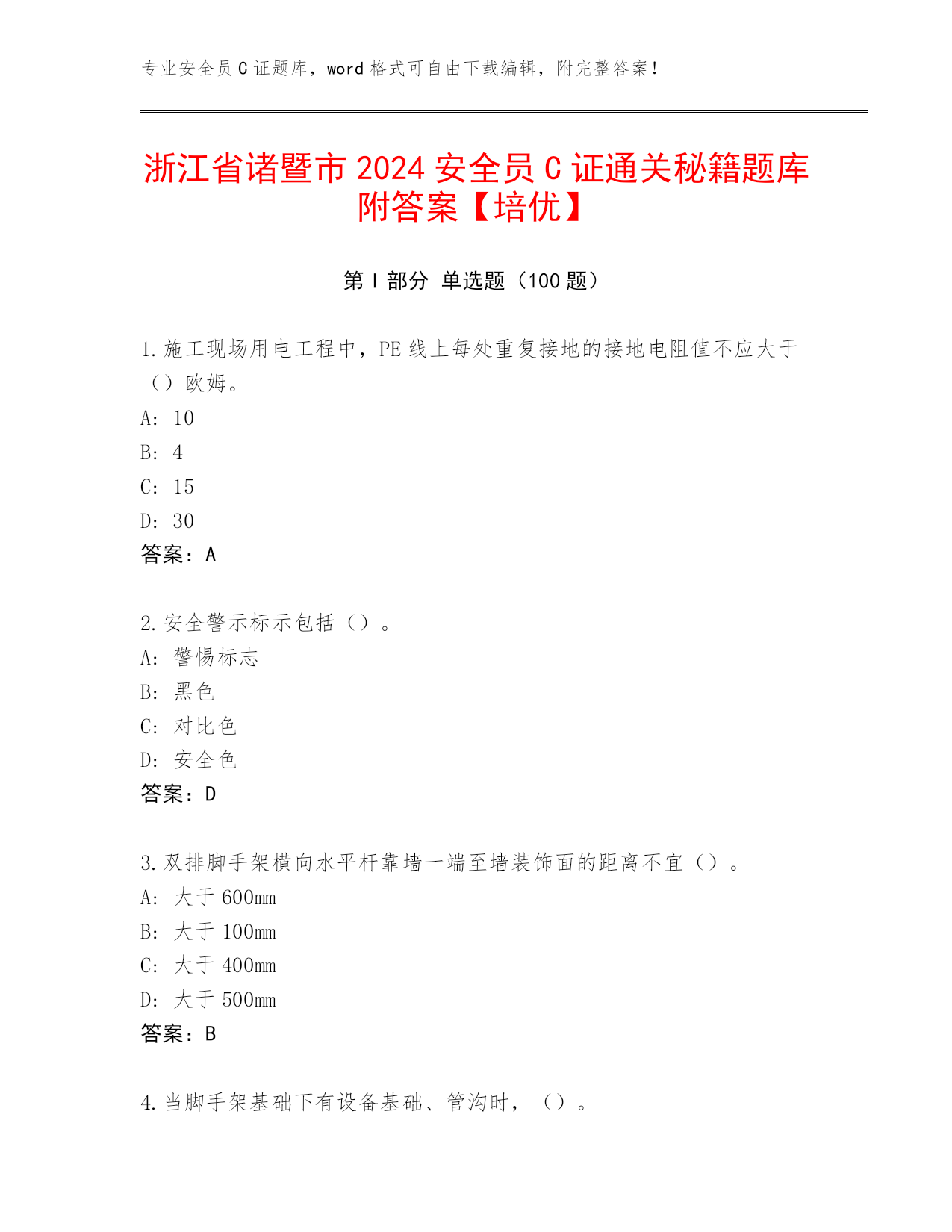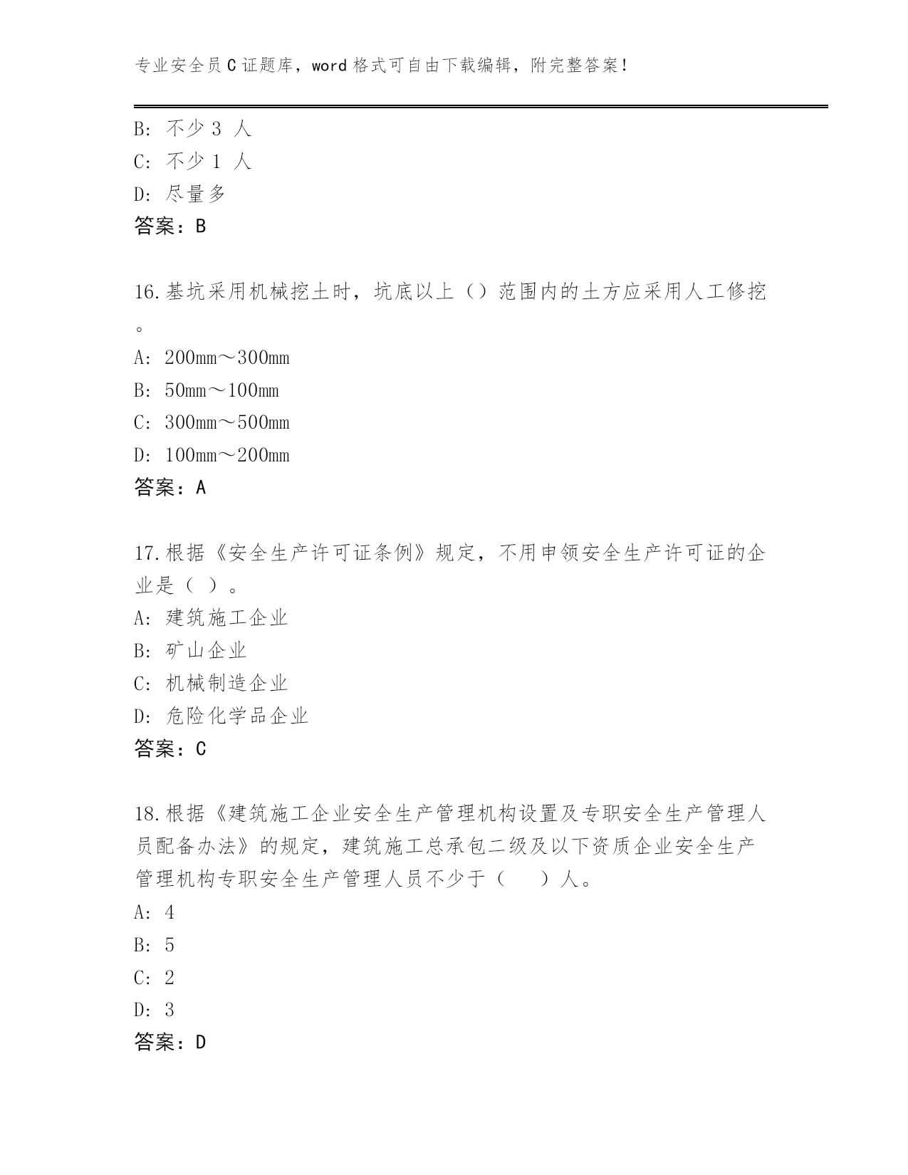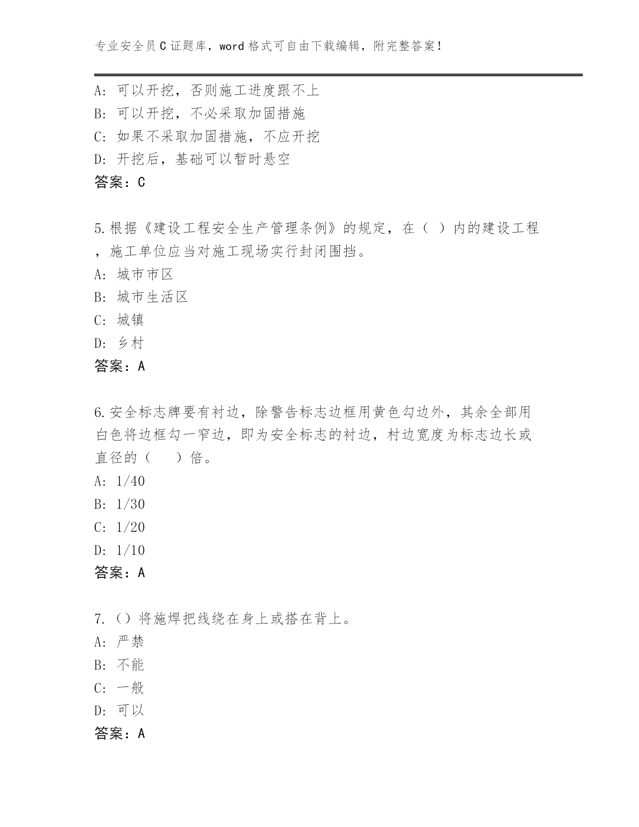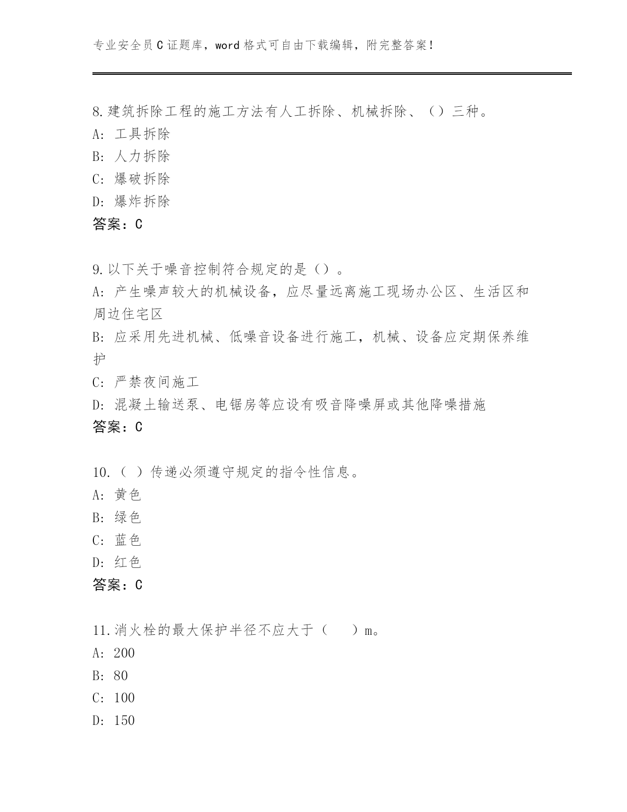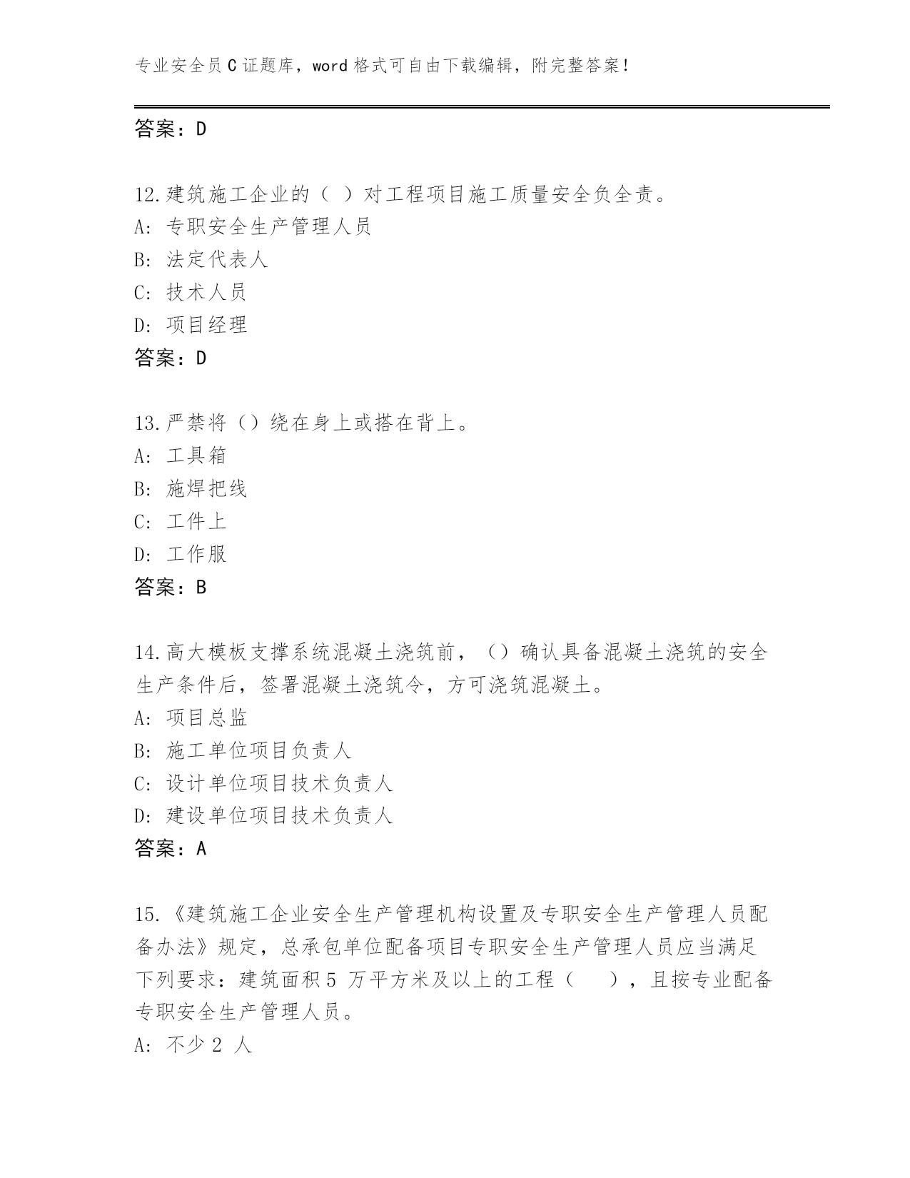 专业安全员C证题库,word格式可自由下载编辑,附完整答案!浙江省诸暨市2024安全员C证通关秘籍题库附答案【培优】第I部分单选题(100题)1.施工现场用电工程中,PE线上每处重复接地的接地电阻值不应大于()欧姆。A:10B:4C:15D:30答案:A2.安全警示标示包括()。A:警惕标志B:黑色C:对比色D:安全色答案:D3.双排脚手架横向水平杆靠墙一端至墙装饰面的距离不宜()。A:大于600mmB:大于100mmC:大于400mmD:大于500mm答案:B4.当脚手架基础下有设备基础、管沟时,()。A:可以开挖,否则施工进度跟不上B:可以开挖,不必采取加固措施C:如果不采取加固措施,不应开挖D:开挖后,基础可以暂时悬空答案:C5.根据《建设工程安全生产管理条例》的规定,在()内的建设工程,施工单位应当对施工现场实行封闭围挡。A:城市市区B:城市生活区C:城镇D:乡村答案:A6.安全标志牌要有衬边,除警告标志边框用黄色勾边外,其余全部用白色将边框勾一窄边,即为安全标志的衬边,村边宽度为标志边长或直径的()倍。A:1/40B:1/30C:1/20D:1/10答案:A7.()将施焊把线绕在身上或搭在背上。A:严禁B:不能C:一般D:可以答案:A8.建筑拆除工程的施工方法有人工拆除、机械拆除、()三种。A:工具拆除B:人力拆除C:爆破拆除D:爆炸拆除答案:C9.以下关于噪音控制符合规定的是()。A:产生噪声较大的机械设备,应尽量远离施工现场办公区、生活区和周边住宅区B:应采用先进机械、低噪音设备进行施工,机械、设备应定期保养维护C:严禁夜间施工D:混凝土输送泵、电锯房等应设有吸音降噪屏或其他降噪措施答案:C10.()传递必须遵守规定的指令性信息。A:黄色B:绿色C:蓝色D:红色答案:C11.消火栓的最大保护半径不应大于()m。A:200B:80C:100D:150答案:D12.建筑施工企业的()对工程项目施工质量安全负全责。A:专职安全生产管理人员B:法定代表人C:技术人员D:项目经理答案:D13.严禁将()绕在身上或搭在背上。A:工具箱B:施焊把线C:工件上D:工作服答案:B14.高大模板支撑系统混凝土浇筑前,()确认具备混凝土浇筑的安全生产条件后,签署混凝土浇筑令,方可浇筑混凝土。A:项目总监B:施工单位项目负责人C:设计单位项目技术负责人D:建设单位项目技术负责人答案:A15.《建筑施工企业安全生产管理机构设置及专职安全生产管理人员配备办法》规定,总承包单位配备项目专职安全生产管理人员应当满足下列要求:建筑面积5万平方米及以上的工程(),且按专业配备专职安全生产管理人员。A:不少2人B:不少3人C:不少1人D:尽量多答案:B16.基坑采用机械挖土时,坑底以上()范围内的土方应采用人工修挖。A:200mm~300mmB:50mm~100mmC:300mm~500mmD:100mm~200mm答案:A17.根据《安全生产许可证条例》规定,不用申领安全生产许可证的企业是()。A:建筑施工企业B:矿山企业C:机械制造企业D:危险化学品企业答案:C18.根据《建筑施工企业安全生产管理机构设置及专职安全生产管理人员配备办法》的规定,建筑施工总承包二级及以下资质企业安全生产管理机构专职安全生产管理人员不少于()人。A:4B:5C:2D:3答案:D19.表示提示人们特别注意的意思的是()。A:红色与白色相间条纹B:绿色与白色相间条纹C:蓝色与白色相间条纹D:黄色与黑色相间条纹答案:D20.高处作业吊篮检查评分表中保证项目是()。A:吊篮稳定B:防护C:安全装置D:交底与验收答案:C21.附着式升降脚手架安装后应组织专门验收,验收由总承包单位组织,下面()可以不参加验收。A:租凭单位B:监理单位C:安装单位D:建设单位答案:D22.斜支撑与侧模的夹角不应小于()度。A:30B:35C:40D:45答案:D23.拆除工程必须制定生产安全事故应急救援(),成立组织机构,并应配备抢险救援器材。A:队伍B:部门C:人员D:预案答案:D24.从业人员发现事故隐患或者其他不安全因素,应当立即向()或者本单位负责人报告;接到报告的人员应当及时予以处理。A:设计人员B:建设单位人员C:现场安全生产管理人员D:监理人员答案:C25.火灾等级划分为()。A:三类B:五类C:二类D:四类答案:D26.建筑施工安全检查评定符合以下要求:分项检查评分表示零分,汇总表得分值应在70分及以上。此等级应为()。A:合格B:优良C:及格D:不合格答案:A27.总配电箱中漏电保护器的额定漏电动作电流I△和额定漏电动作时间T△的选择要求是()。A:I△=30mA,T△>0.1B:I△>30mA,T△=0.1sC:I△>30mA,T△>0.1SD:I△>30mA,T△>0.1S,