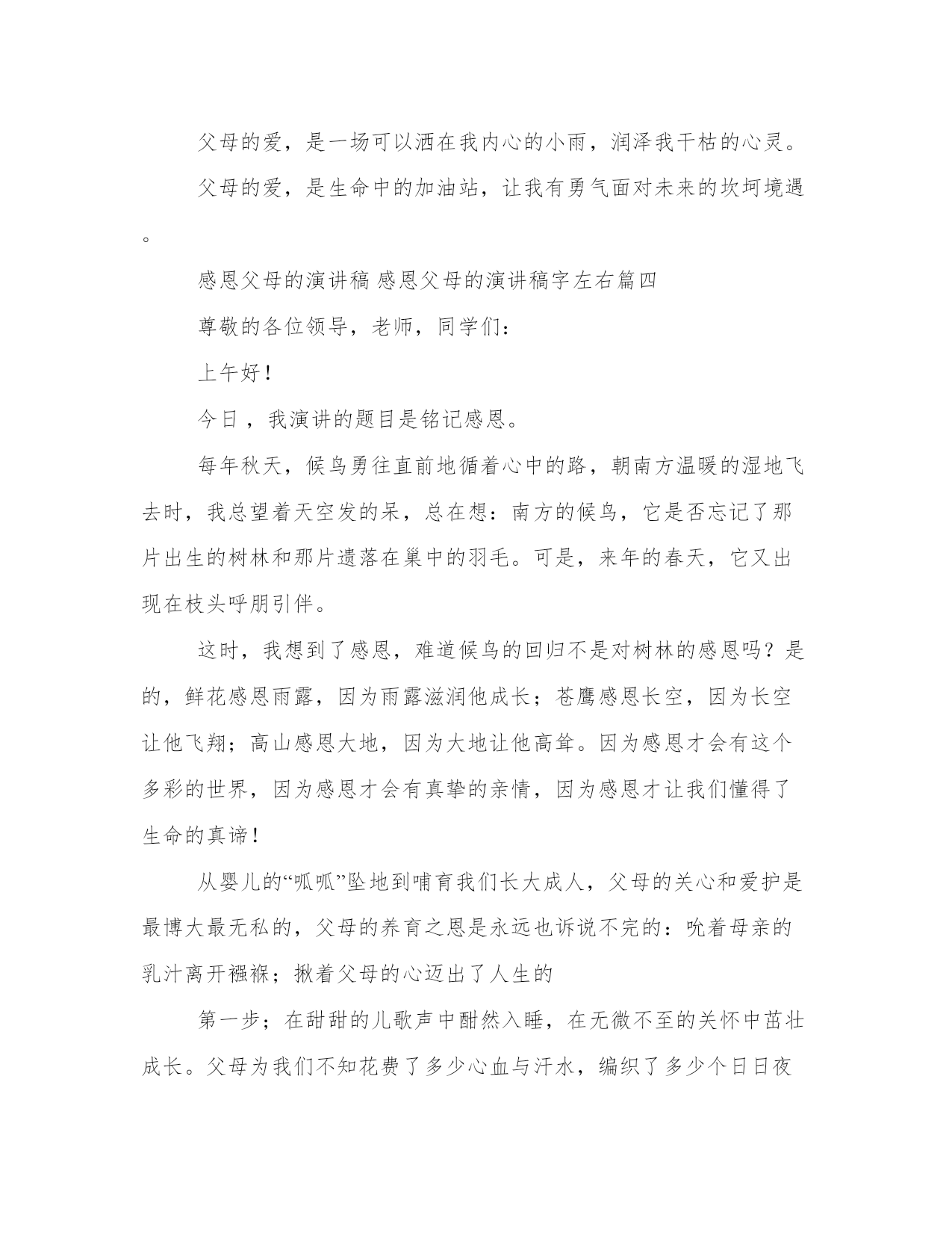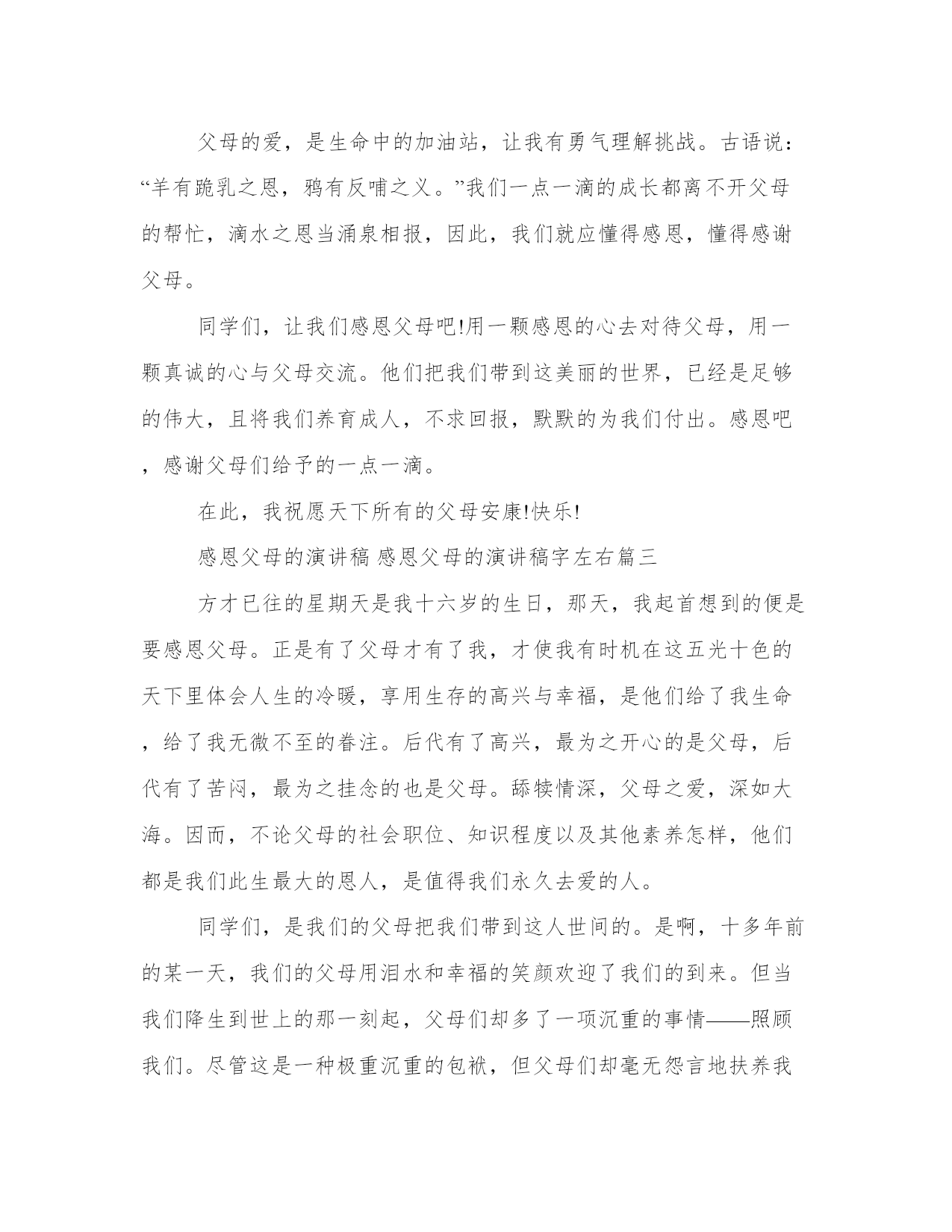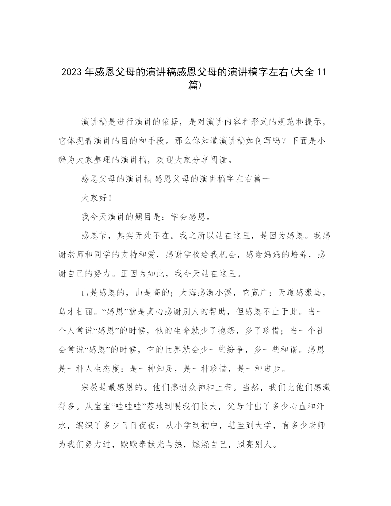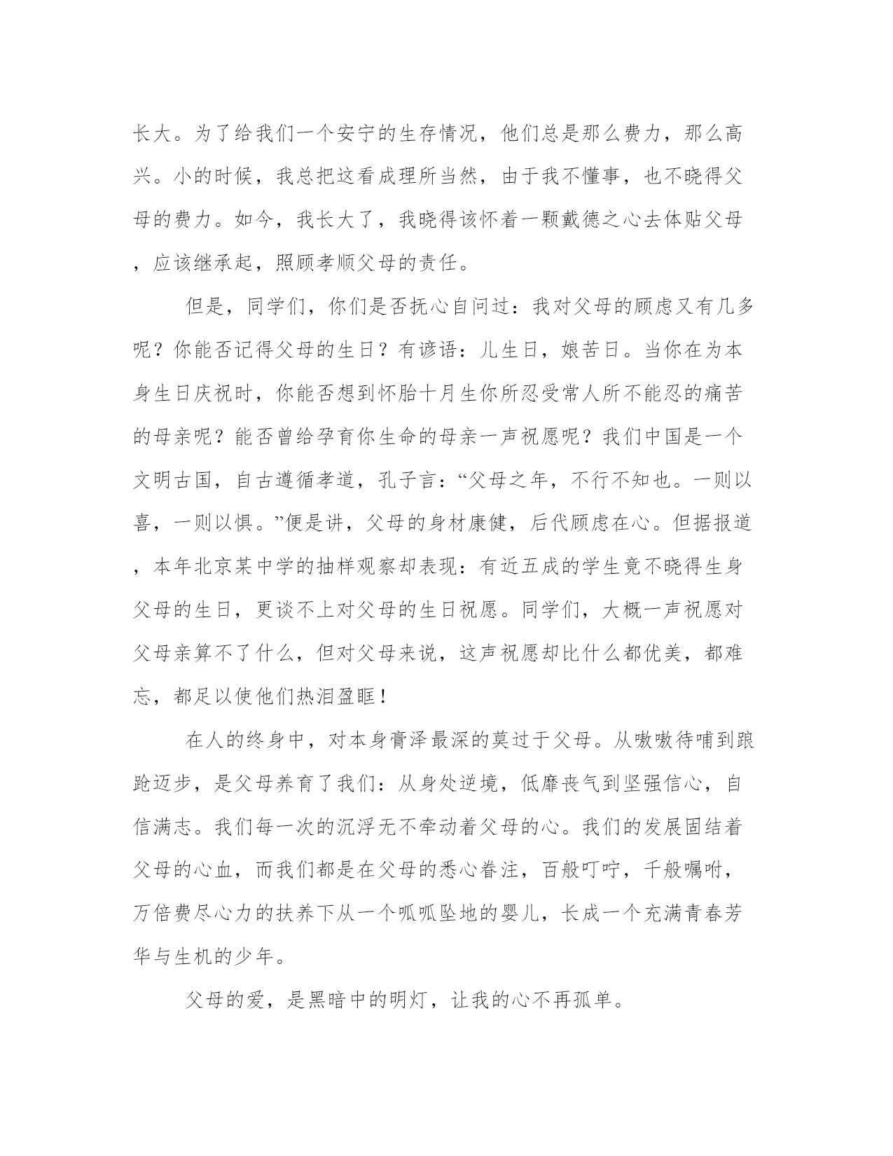 2023年感恩父母的演讲稿感恩父母的演讲稿字左右(大全11篇)演讲稿是进行演讲的依据,是对演讲内容和形式的规范和提示,它体现着演讲的目的和手段。那么你知道演讲稿如何写吗?下面是小编为大家整理的演讲稿,欢迎大家分享阅读。感恩父母的演讲稿感恩父母的演讲稿字左右篇一大家好!我今天演讲的题目是:学会感恩。感恩节,其实无处不在。我之所以站在这里,是因为感恩。我感谢老师和同学的支持和爱,感谢学校给我机会,感谢妈妈的培养,感谢自己的努力。正因为如此,我今天站在这里。山是感恩的,山是高的;大海感激小溪,它宽广;天道感激鸟,鸟才壮丽。“感恩”就是真心感谢别人的帮助,但感恩不止于此。当一个人常说“感恩”的时候,他的生命就少了抱怨,多了珍惜;当一个社会常说“感恩”的时候,它的世界就会少一些纷争,多一些和谐。感恩是一种人生态度:是一种知足,是一种珍惜,是一种进步。宗教是最感恩的。他们感谢众神和上帝。当然,我们比他们感激得多。从宝宝“哇哇哇”落地到喂我们长大,父母付出了多少心血和汗水,编织了多少日日夜夜;从小学到初中,甚至到大学,有多少老师为我们努力过,默默奉献光与热,燃烧自己,照亮别人。感激,让我知道“天下父母心尤贵”;感恩,让我知道“向祖先屈膝的快感”;感恩,让我领略阳光的魅力;感恩让我明白了勇敢和勇敢意味着什么。感激,让我明白了鸟语花香…蓝天…让感恩被传达,相信我们的未来会更光明,世界会变得更美好。我今天的演讲到此结束。谢谢!感恩父母的演讲稿感恩父母的演讲稿字左右篇二落叶在空中盘旋,谱写着一曲感恩的乐章,那是大树对滋养它的大地的感恩;白云在蔚蓝的天空中飘荡,绘画着那一幅幅感人的画面,那是白云对哺育它的蓝天的感恩。因为感恩才会有这个多彩的社会,因为感恩才会有真挚的亲情,因为感恩才让我们懂得了生命的真谛。感恩,是一个人与生俱来的一种本性,是一个人不可磨灭的良知。感恩让生活中弥漫着温馨的气息,爱的味道。在人的一生中,对自我恩情最深的莫过于父母。从嗷嗷待哺到蹒跚迈步,是父母养育了我们:从身处困境,低靡困惑到坚定信念踌躇满志,我们每一次的沉浮无不牵动着父母的心。我们的成长凝结着父母的心血,而我们每个人都是在父母的悉心关怀,百般爱护,千倍叮嘱,万倍辛苦的抚养下从一个呱呱坠地的婴儿渐渐长成一个散发青春与活力的少年。父母的爱,是黑暗中的明灯,让我的心不再孤独。父母的爱,是一场能够洒在我心田的细雨,滋润我干涸的心灵。父母的爱,是生命中的加油站,让我有勇气理解挑战。古语说:“羊有跪乳之恩,鸦有反哺之义。”我们一点一滴的成长都离不开父母的帮忙,滴水之恩当涌泉相报,因此,我们就应懂得感恩,懂得感谢父母。同学们,让我们感恩父母吧!用一颗感恩的心去对待父母,用一颗真诚的心与父母交流。他们把我们带到这美丽的世界,已经是足够的伟大,且将我们养育成人,不求回报,默默的为我们付出。感恩吧,感谢父母们给予的一点一滴。在此,我祝愿天下所有的父母安康!快乐!感恩父母的演讲稿感恩父母的演讲稿字左右篇三方才已往的星期天是我十六岁的生日,那天,我起首想到的便是要感恩父母。正是有了父母才有了我,才使我有时机在这五光十色的天下里体会人生的冷暖,享用生存的高兴与幸福,是他们给了我生命,给了我无微不至的眷注。后代有了高兴,最为之开心的是父母,后代有了苦闷,最为之挂念的也是父母。舔犊情深,父母之爱,深如大海。因而,不论父母的社会职位、知识程度以及其他素养怎样,他们都是我们此生最大的恩人,是值得我们永久去爱的人。同学们,是我们的父母把我们带到这人世间的。是啊,十多年前的某一天,我们的父母用泪水和幸福的笑颜欢迎了我们的到来。但当我们降生到世上的那一刻起,父母们却多了一项沉重的事情——照顾我们。尽管这是一种极重沉重的包袱,但父母们却毫无怨言地扶养我长大。为了给我们一个安宁的生存情况,他们总是那么费力,那么高兴。小的时候,我总把这看成理所当然,由于我不懂事,也不晓得父母的费力。如今,我长大了,我晓得该怀着一颗戴德之心去体贴父母,应该继承起,照顾孝顺父母的责任。但是,同学们,你们是否抚心自问过:我对父母的顾虑又有几多呢?你能否记得父母的生日?有谚语:儿生日,娘苦日。当你在为本身生日庆祝时,你能否想到怀胎十月生你所忍受常人所不能忍的痛苦的母亲呢?能否曾给孕育你生命的母亲一声祝愿呢?我们中国是一个文明古国,自古遵循孝道,孔子言:“父母之年,不行不知也。一则以喜,一则以惧。”便是讲,父母的身材康健,后代顾虑在心。但据报道,本年北京某中学的抽样观察却表现:有近五成的学生竟不晓得生身父母的生日,更谈不上对父母的生日祝愿。同学们,大概一声祝愿对父母亲算不了什么,但对父母来说,这声祝愿却比什么都优美,都难忘,都足以使他们热泪盈眶!在人的终身中,对本身膏泽最深的莫过于父母。从嗷嗷待哺到踉跄迈步,是父母养育了我们:从身处逆境,低靡