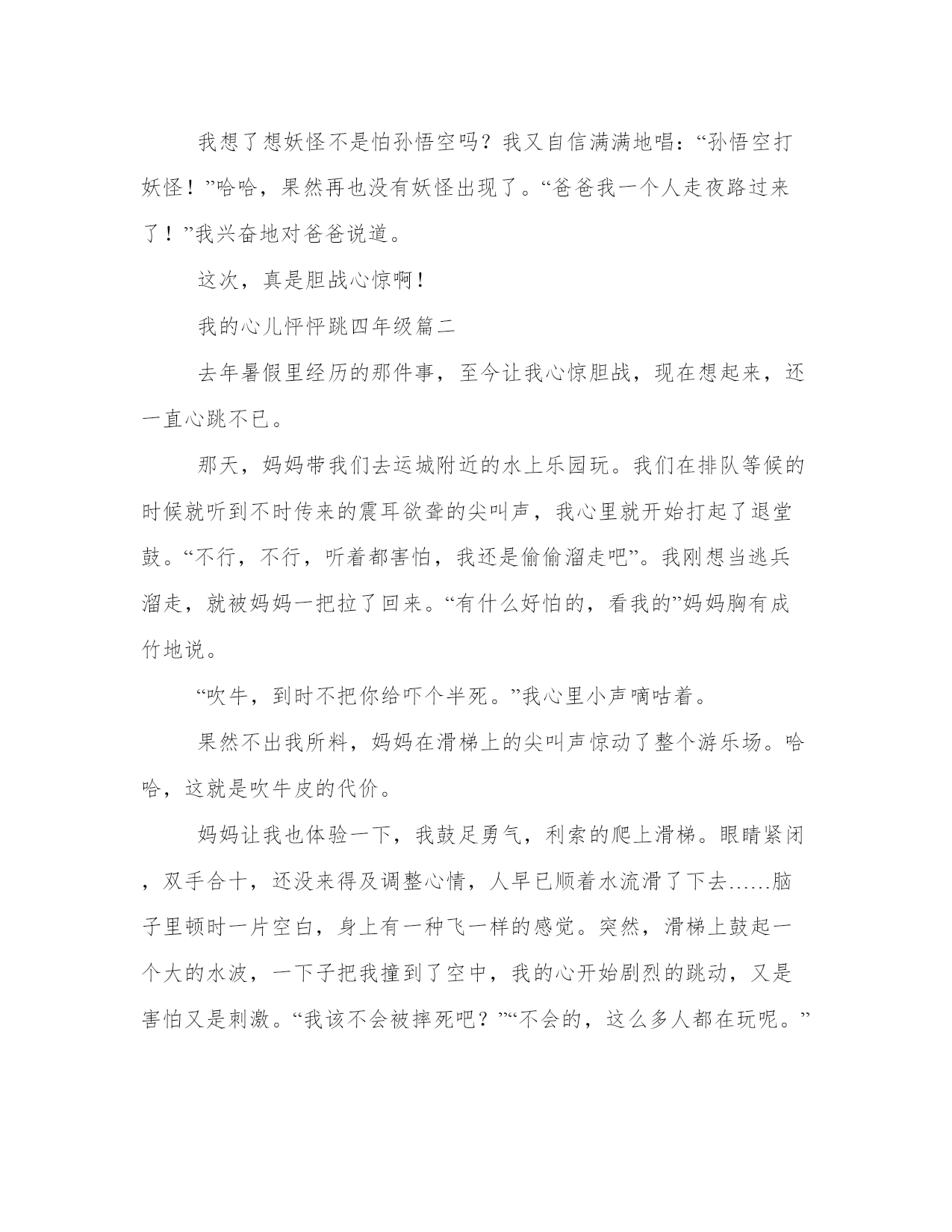我的心儿怦怦跳四年级实用无论是身处学校还是步入社会,大家都尝试过写作吧,借助写作也可以提高我们的语言组织能力。写范文的时候需要注意什么呢?有哪些格式需要注意呢?这里我整理了一些优秀的范文,希望对大家有所帮助,下面我们就来了解一下吧。我的心儿怦怦跳四年级篇一我拿起手电筒,往外面走去。外面好像有人把星空的灯关掉了,天空一下就黑了。我把手电筒打开了,就出现了一条阳光大路。我信心满满的,一边哼着小调,一边往前走。“胡雪儿,我想要吃掉你。”突然,从黑暗传出来的声音。又一阵风吹来,她似乎用指甲勾住我的头发。我吓得腿都软了,心中嘀咕着:不会有鬼吧?我加快脚步,赶紧往前跑。突然间,我一想到妹妹最怕的就是脸谱,说不定怪物也怕。于是我大声唱起:“紫色的天王、手托宝塔、绿色的妖……妖怪,斗……斗夜叉!”“啊!”我猛地一转头,发出尖叫,“这不就是绿色的妖怪吗?我胆战心惊的拿起手电筒,照在“妖怪”身上,仔仔细细地看了一遍。原来只是一片绿色的树叶啊!我心中的石头总算是放下来。我想了想妖怪不是怕孙悟空吗?我又自信满满地唱:“孙悟空打妖怪!”哈哈,果然再也没有妖怪出现了。“爸爸我一个人走夜路过来了!”我兴奋地对爸爸说道。这次,真是胆战心惊啊!我的心儿怦怦跳四年级篇二去年暑假里经历的那件事,至今让我心惊胆战,现在想起来,还一直心跳不已。那天,妈妈带我们去运城附近的水上乐园玩。我们在排队等候的时候就听到不时传来的震耳欲聋的尖叫声,我心里就开始打起了退堂鼓。“不行,不行,听着都害怕,我还是偷偷溜走吧”。我刚想当逃兵溜走,就被妈妈一把拉了回来。“有什么好怕的,看我的”妈妈胸有成竹地说。“吹牛,到时不把你给吓个半死。”我心里小声嘀咕着。果然不出我所料,妈妈在滑梯上的尖叫声惊动了整个游乐场。哈哈,这就是吹牛皮的代价。妈妈让我也体验一下,我鼓足勇气,利索的爬上滑梯。眼睛紧闭,双手合十,还没来得及调整心情,人早已顺着水流滑了下去……脑子里顿时一片空白,身上有一种飞一样的感觉。突然,滑梯上鼓起一个大的水波,一下子把我撞到了空中,我的心开始剧烈的跳动,又是害怕又是刺激。“我该不会被摔死吧?”“不会的,这么多人都在玩呢。”我安慰自己,可越安慰越害怕。就这样,扑通一声,我又重新落回到了水面上,身上早已冒出了一身冷汗。同学们,你们有过心儿怦怦跳的感觉吗?那种感觉可真不好受,至今想起来,我的手里还捏着一把汗。