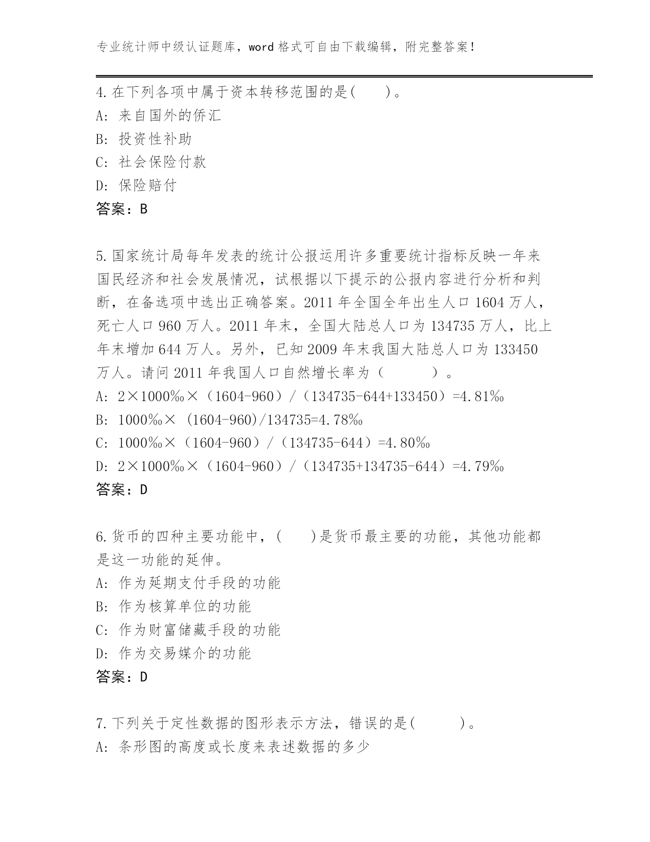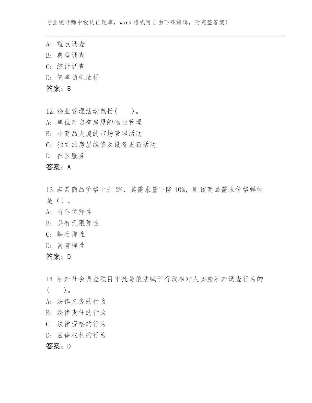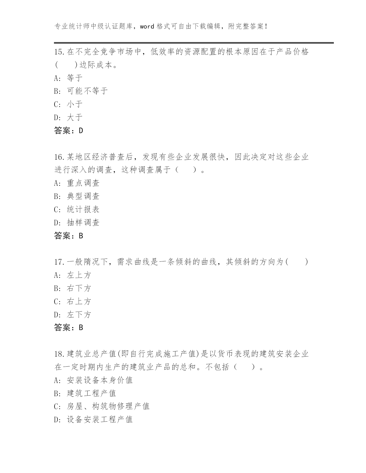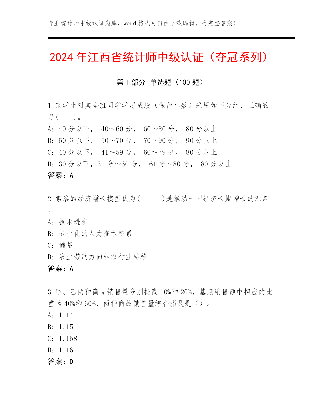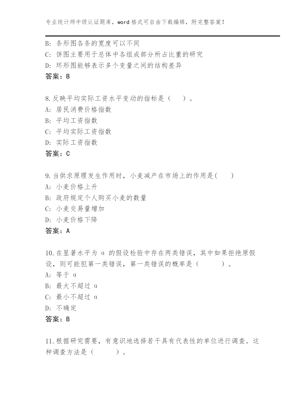 专业统计师中级认证题库,word格式可自由下载编辑,附完整答案!2024年江西省统计师中级认证(夺冠系列)第I部分单选题(100题)1.某学生对其全班同学学习成绩(保留小数)采用如下分组,正确的是()。A:40分以下,40~60分,60~80分,80分以上B:50分以下,50~70分,70~90分,90分以上C:40分以下,41~59分,60~79分,80分以上D:30分以下,31分~60分,61分~80分,80分以上答案:A2.索洛的经济增长模型认为()是推动一国经济长期增长的源泉。A:技术进步B:专业化的人力资本积累C:储蓄D:农业劳动力向非农行业转移答案:A3.甲、乙两种商品销售量分别提高10%和20%,基期销售额中相应的比重为40%和60%,两种商品销售量综合指数是()。A:1.14B:1.15C:1.158D:1.16答案:D4.在下列各项中属于资本转移范围的是()。A:来自国外的侨汇B:投资性补助C:社会保险付款D:保险赔付答案:B5.国家统计局每年发表的统计公报运用许多重要统计指标反映一年来国民经济和社会发展情况,试根据以下提示的公报内容进行分析和判断,在备选项中选出正确答案。2011年全国全年出生人口1604万人,死亡人口960万人。2011年末,全国大陆总人口为134735万人,比上年末增加644万人。另外,已知2009年末我国大陆总人口为133450万人。请问2011年我国人口自然增长率为()。A:2×1000‰×(1604-960)/(134735-644+133450)=4.81‰B:1000‰×(1604-960)/134735=4.78‰C:1000‰×(1604-960)/(134735-644)=4.80‰D:2×1000‰×(1604-960)/(134735+134735-644)=4.79‰答案:D6.货币的四种主要功能中,()是货币最主要的功能,其他功能都是这一功能的延伸。A:作为延期支付手段的功能B:作为核算单位的功能C:作为财富储藏手段的功能D:作为交易媒介的功能答案:D7.下列关于定性数据的图形表示方法,错误的是()。A:条形图的高度或长度来表述数据的多少B:条形图各条的宽度可以不同C:饼图主要用于总体中各组成部分所占比重的研究D:环形图能够表示多个变量之间的结构差异答案:B8.反映平均实际工资水平变动的指标是()。A:居民消费价格指数B:平均工资指数C:平均实际工资指数D:实际工资指数答案:C9.当供求原理发生作用时,小麦减产在市场上的作用是()A:小麦价格上升B:政府规定个人购买小麦的数量C:小麦交易量增加D:小麦价格下降答案:A10.在显著水平为α的假设检验中存在两类错误,其中如果拒绝原假设,则可能犯第一类错误,第一类错误的概率是()。A:等于αB:最大不超过αC:最小不超过αD:不确定答案:B11.根据研究需要,有意识地选择若干具有代表性的单位进行调查。这种调查方法是()。A:重点调查B:典型调查C:统计调查D:简单随机抽样答案:B12.物业管理活动包括()。A:单位对自有房屋的物业管理B:小商品大厦的市场管理活动C:独立的房屋维修及设备更新活动D:社区服务答案:A13.若某商品价格上升2%,其需求量下降10%,则该商品需求价格弹性是()。A:有单位弹性B:具有无限弹性C:缺乏弹性D:富有弹性答案:D14.涉外社会调查项目审批是依法赋予行政相对人实施涉外调查行为的()。A:法律义务的行为B:法律责任的行为C:法律资格的行为D:法律权利的行为答案:D15.在不完全竞争市场中,低效率的资源配置的根本原因在于产品价格()边际成本。A:等于B:可能不等于C:小于D:大于答案:D16.某地区经济普查后,发现有些企业发展很快,因此决定对这些企业进行深入的调查,这种调查属于()。A:重点调查B:典型调查C:统计报表D:抽样调查答案:B17.一般隋况下,需求曲线是一条倾斜的曲线,其倾斜的方向为()A:左上方B:右下方C:右上方D:左下方答案:B18.建筑业总产值(即自行完成施工产值)是以货币表现的建筑安装企业在一定时期内生产的建筑业产品的总和。不包括()。A:安装设备本身价值B:建筑工程产值C:房屋、构筑物修理产值D:设备安装工程产值答案:A19.会计科目按照提供核算指标的详细程度可以分为()两类。A:资产类科目和负债类科目B:所有者权益科目和负债科目C:总分类科目和明细分类科目D:成本类科目和损益类科目答案:C20.生成定量数据的频数分布表时,首先要对数据(.)。A:分类B:确定组距C:确定组频数D:分组答案:D21.我国1992年糖产量为831万吨,1993年比1992年减产60万吨,1994年比1992年减产239万吨,1995年糖产量为559万吨,1996年比1995年增产81万吨