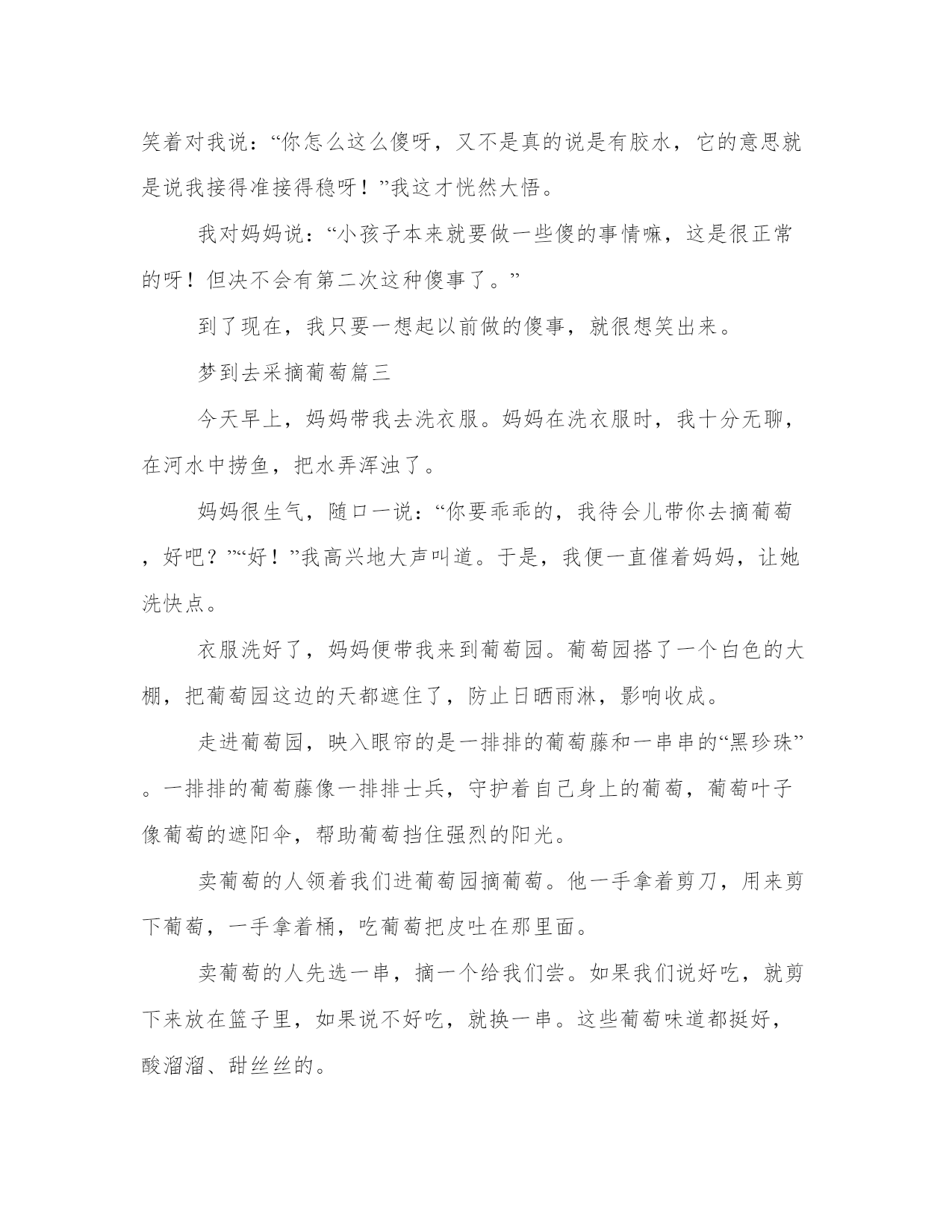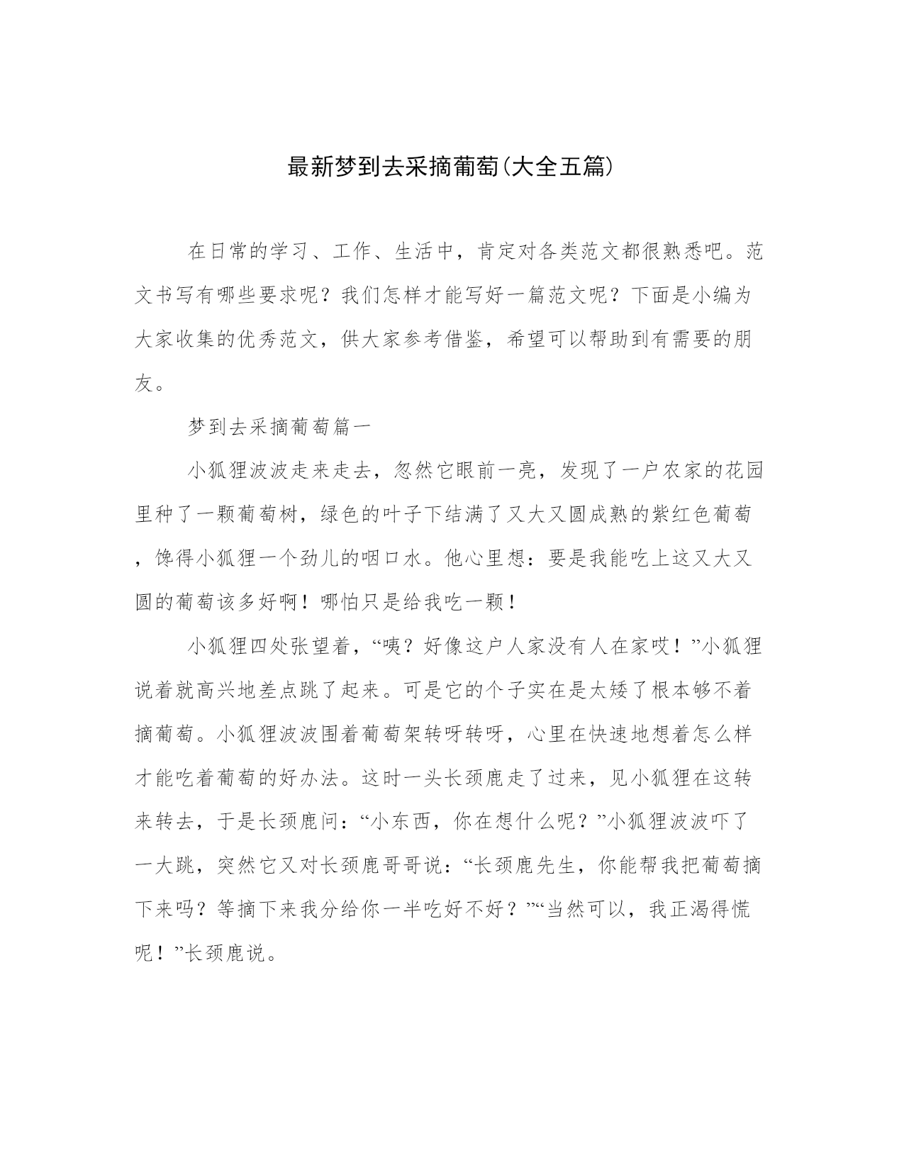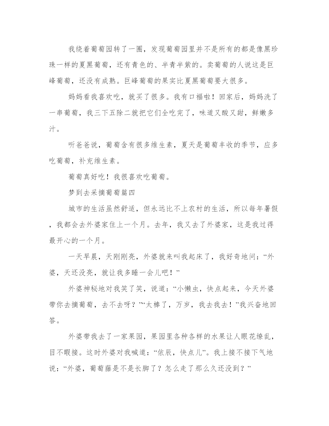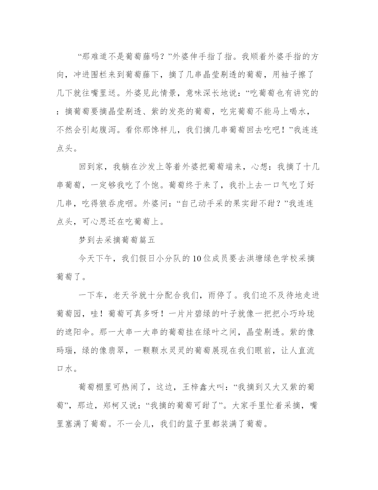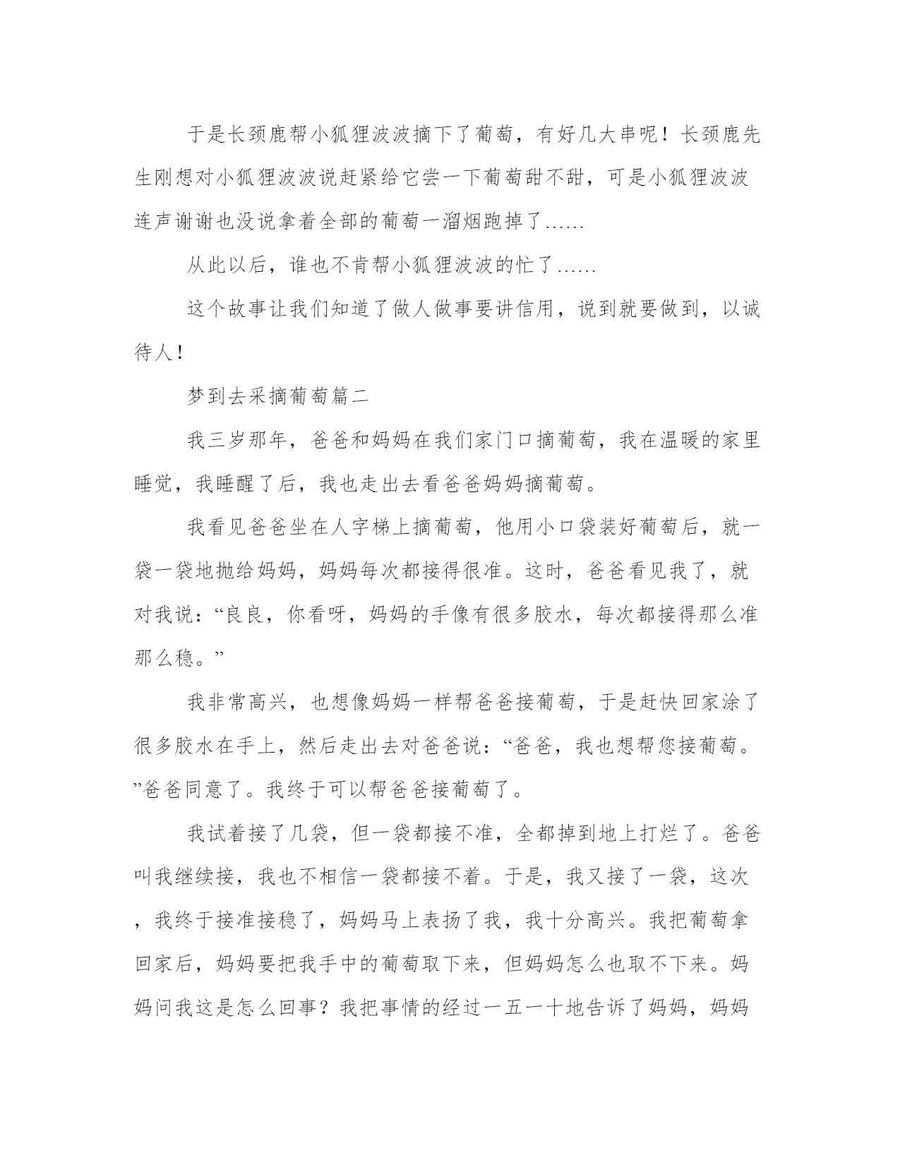 最新梦到去采摘葡萄(大全五篇)在日常的学习、工作、生活中,肯定对各类范文都很熟悉吧。范文书写有哪些要求呢?我们怎样才能写好一篇范文呢?下面是小编为大家收集的优秀范文,供大家参考借鉴,希望可以帮助到有需要的朋友。梦到去采摘葡萄篇一小狐狸波波走来走去,忽然它眼前一亮,发现了一户农家的花园里种了一颗葡萄树,绿色的叶子下结满了又大又圆成熟的紫红色葡萄,馋得小狐狸一个劲儿的咽口水。他心里想:要是我能吃上这又大又圆的葡萄该多好啊!哪怕只是给我吃一颗!小狐狸四处张望着,“咦?好像这户人家没有人在家哎!”小狐狸说着就高兴地差点跳了起来。可是它的个子实在是太矮了根本够不着摘葡萄。小狐狸波波围着葡萄架转呀转呀,心里在快速地想着怎么样才能吃着葡萄的好办法。这时一头长颈鹿走了过来,见小狐狸在这转来转去,于是长颈鹿问:“小东西,你在想什么呢?”小狐狸波波吓了一大跳,突然它又对长颈鹿哥哥说:“长颈鹿先生,你能帮我把葡萄摘下来吗?等摘下来我分给你一半吃好不好?”“当然可以,我正渴得慌呢!”长颈鹿说。于是长颈鹿帮小狐狸波波摘下了葡萄,有好几大串呢!长颈鹿先生刚想对小狐狸波波说赶紧给它尝一下葡萄甜不甜,可是小狐狸波波连声谢谢也没说拿着全部的葡萄一溜烟跑掉了……从此以后,谁也不肯帮小狐狸波波的忙了……这个故事让我们知道了做人做事要讲信用,说到就要做到,以诚待人!梦到去采摘葡萄篇二我三岁那年,爸爸和妈妈在我们家门口摘葡萄,我在温暖的家里睡觉,我睡醒了后,我也走出去看爸爸妈妈摘葡萄。我看见爸爸坐在人字梯上摘葡萄,他用小口袋装好葡萄后,就一袋一袋地抛给妈妈,妈妈每次都接得很准。这时,爸爸看见我了,就对我说:“良良,你看呀,妈妈的手像有很多胶水,每次都接得那么准那么稳。”我非常高兴,也想像妈妈一样帮爸爸接葡萄,于是赶快回家涂了很多胶水在手上,然后走出去对爸爸说:“爸爸,我也想帮您接葡萄。”爸爸同意了。我终于可以帮爸爸接葡萄了。我试着接了几袋,但一袋都接不准,全都掉到地上打烂了。爸爸叫我继续接,我也不相信一袋都接不着。于是,我又接了一袋,这次,我终于接准接稳了,妈妈马上表扬了我,我十分高兴。我把葡萄拿回家后,妈妈要把我手中的葡萄取下来,但妈妈怎么也取不下来。妈妈问我这是怎么回事?我把事情的经过一五一十地告诉了妈妈,妈妈笑着对我说:“你怎么这么傻呀,又不是真的说是有胶水,它的意思就是说我接得准接得稳呀!”我这才恍然大悟。我对妈妈说:“小孩子本来就要做一些傻的事情嘛,这是很正常的呀!但决不会有第二次这种傻事了。”到了现在,我只要一想起以前做的傻事,就很想笑出来。梦到去采摘葡萄篇三今天早上,妈妈带我去洗衣服。妈妈在洗衣服时,我十分无聊,在河水中捞鱼,把水弄浑浊了。妈妈很生气,随口一说:“你要乖乖的,我待会儿带你去摘葡萄,好吧?”“好!”我高兴地大声叫道。于是,我便一直催着妈妈,让她洗快点。衣服洗好了,妈妈便带我来到葡萄园。葡萄园搭了一个白色的大棚,把葡萄园这边的天都遮住了,防止日晒雨淋,影响收成。走进葡萄园,映入眼帘的是一排排的葡萄藤和一串串的“黑珍珠”。一排排的葡萄藤像一排排士兵,守护着自己身上的葡萄,葡萄叶子像葡萄的遮阳伞,帮助葡萄挡住强烈的阳光。卖葡萄的人领着我们进葡萄园摘葡萄。他一手拿着剪刀,用来剪下葡萄,一手拿着桶,吃葡萄把皮吐在那里面。卖葡萄的人先选一串,摘一个给我们尝。如果我们说好吃,就剪下来放在篮子里,如果说不好吃,就换一串。这些葡萄味道都挺好,酸溜溜、甜丝丝的。我绕着葡萄园转了一圈,发现葡萄园里并不是所有的都是像黑珍珠一样的夏黑葡萄,还有青色的、半青半紫的。卖葡萄的人说这是巨峰葡萄,还没有成熟。巨峰葡萄的果实比夏黑葡萄要大很多。妈妈看我喜欢吃,就买了很多。我有口福啦!回家后,妈妈洗了一串葡萄,我三下五除二就把它们全吃完了,味道又酸又甜,鲜嫩多汁。听爸爸说,葡萄含有很多维生素,夏天是葡萄丰收的季节,应多吃葡萄,补充维生素。葡萄真好吃!我很喜欢吃葡萄。梦到去采摘葡萄篇四城市的生活虽然舒适,但永远比不上农村的生活,所以每年暑假,我都会去外婆家住上一个月。去年,我又去了外婆家,这是我过得最开心的一个月。一天早晨,天刚刚亮,外婆就来叫我起床了,我好奇地问:“外婆,天还没亮,就让我多睡一会儿吧!”外婆神秘地对我笑了笑,说道:“小懒虫,快点起来,今天外婆带你去摘葡萄,去不去呀?”“太棒了,万岁,我去我去!”我兴奋地回答。外婆带我去了一家果园,果园里各种各样的水果让人眼花缭乱,目不暇接。这时外婆对我喊道:“依辰,快点儿”。我上接不接下气地说:“外婆,葡萄藤是不是长脚了?怎么走了那么久还没到?”“那难道不是葡萄藤吗?”外婆伸手指了指。我顺着外婆手指的方向,冲进围栏来到葡萄藤下,摘了几串晶莹剔透的葡萄,用袖子擦了几下就往嘴里送。外婆见此情景,意味深长地说:“吃葡萄也有讲究的:摘葡