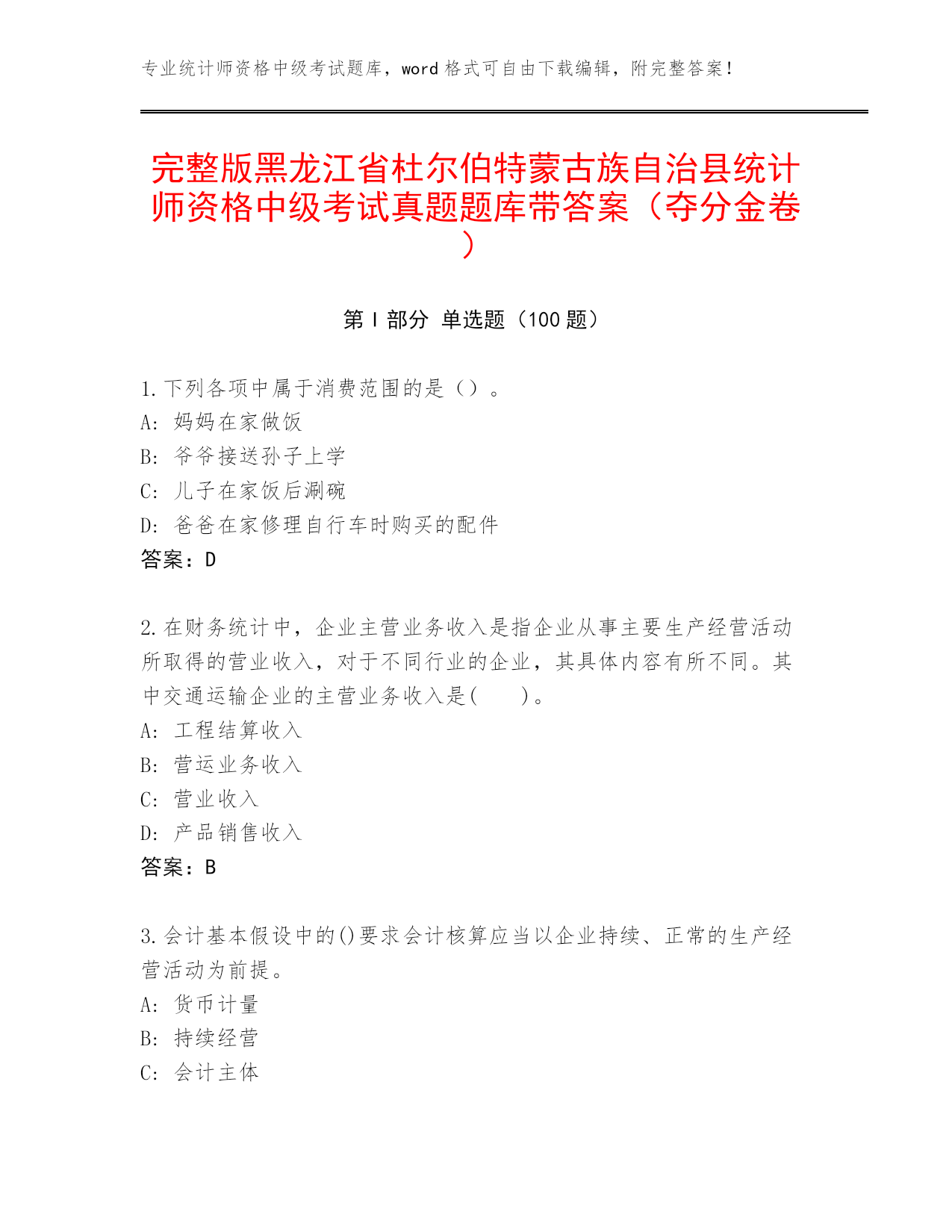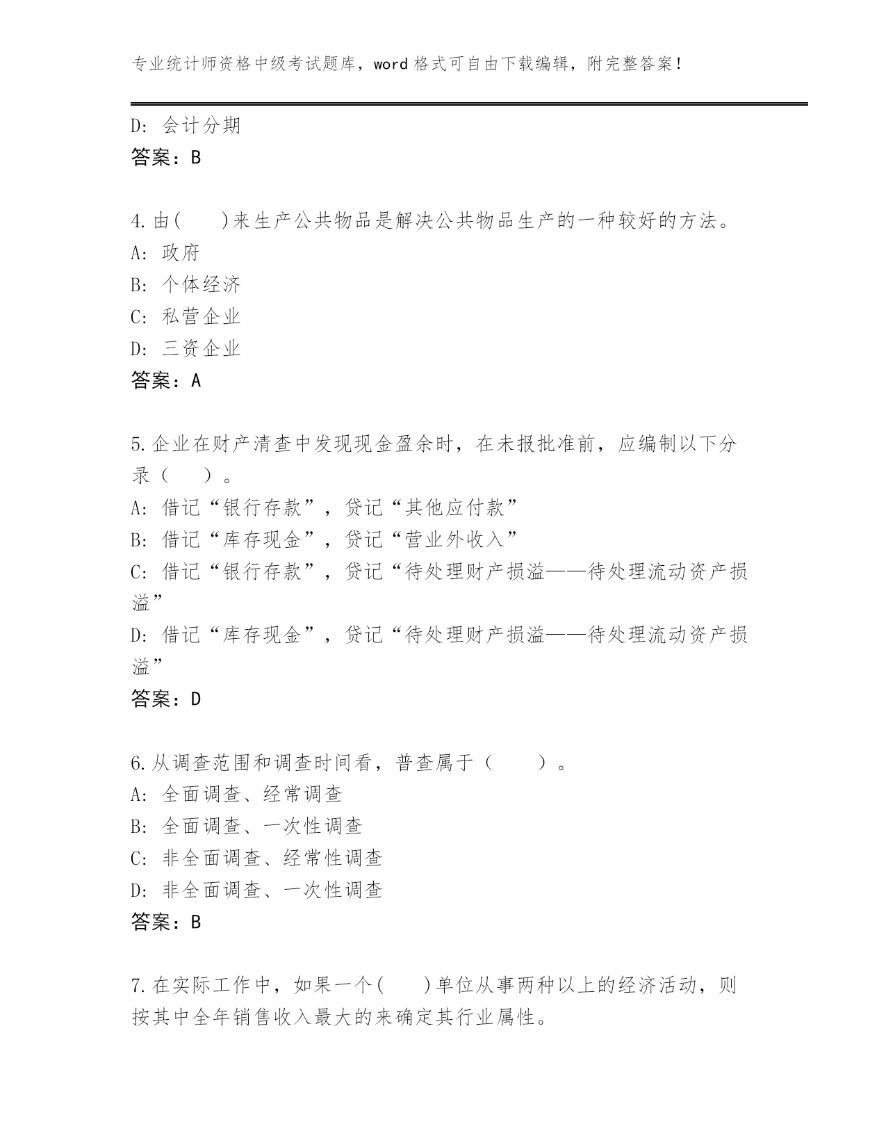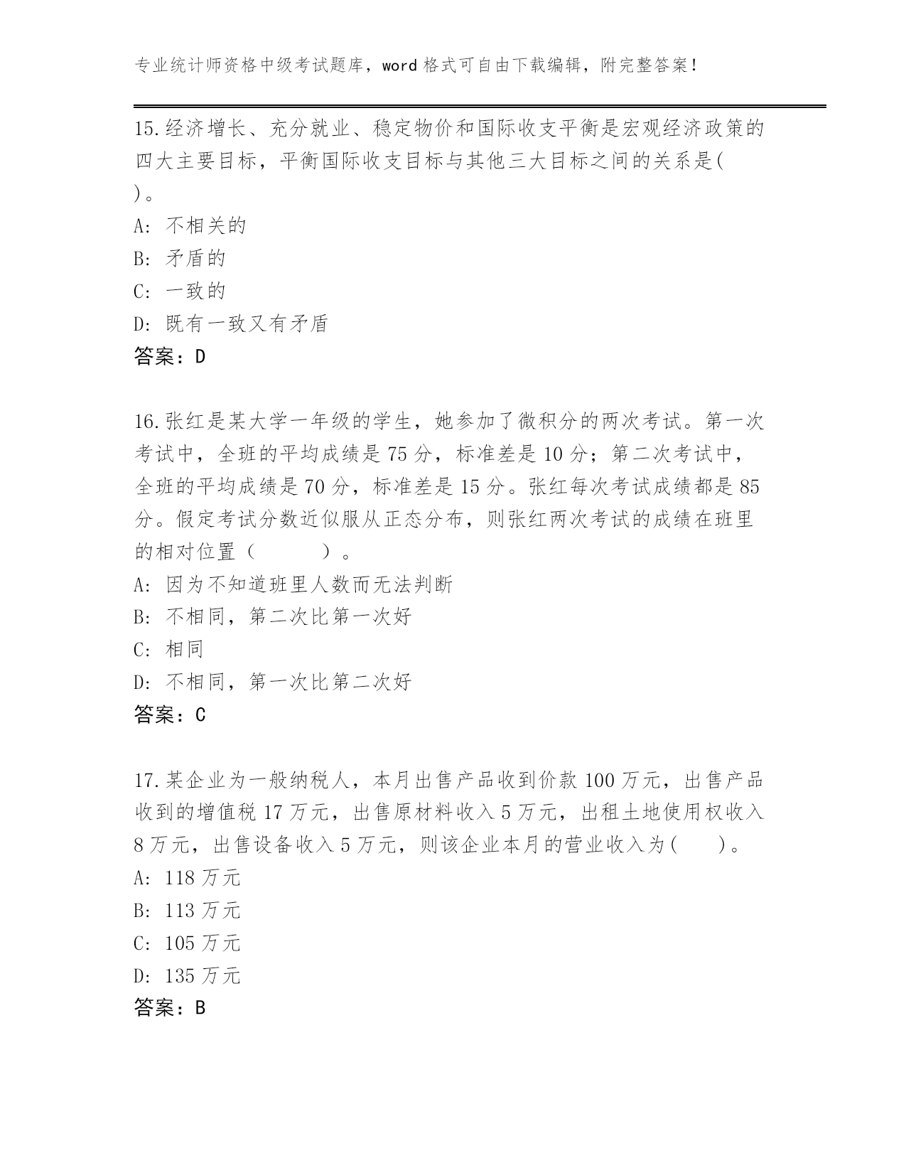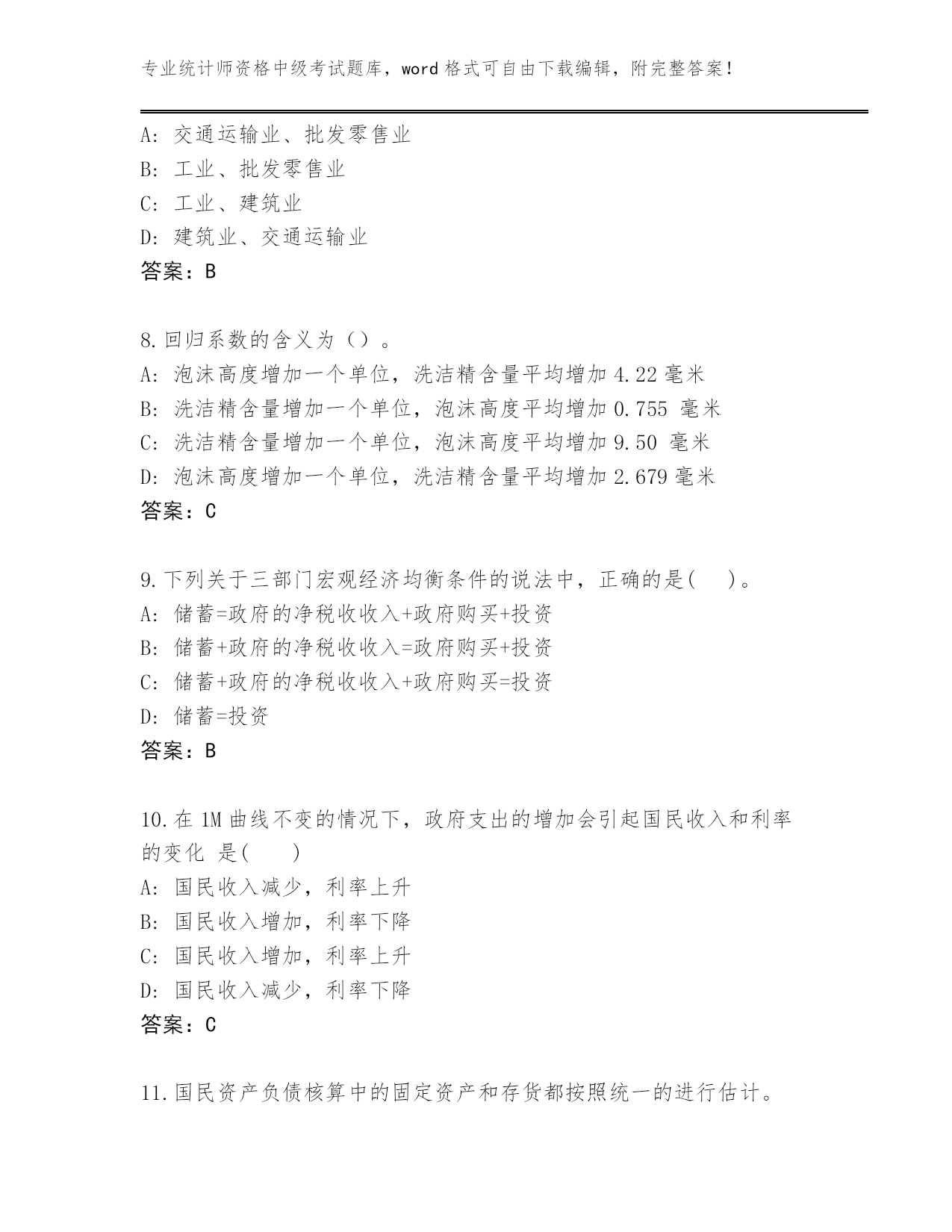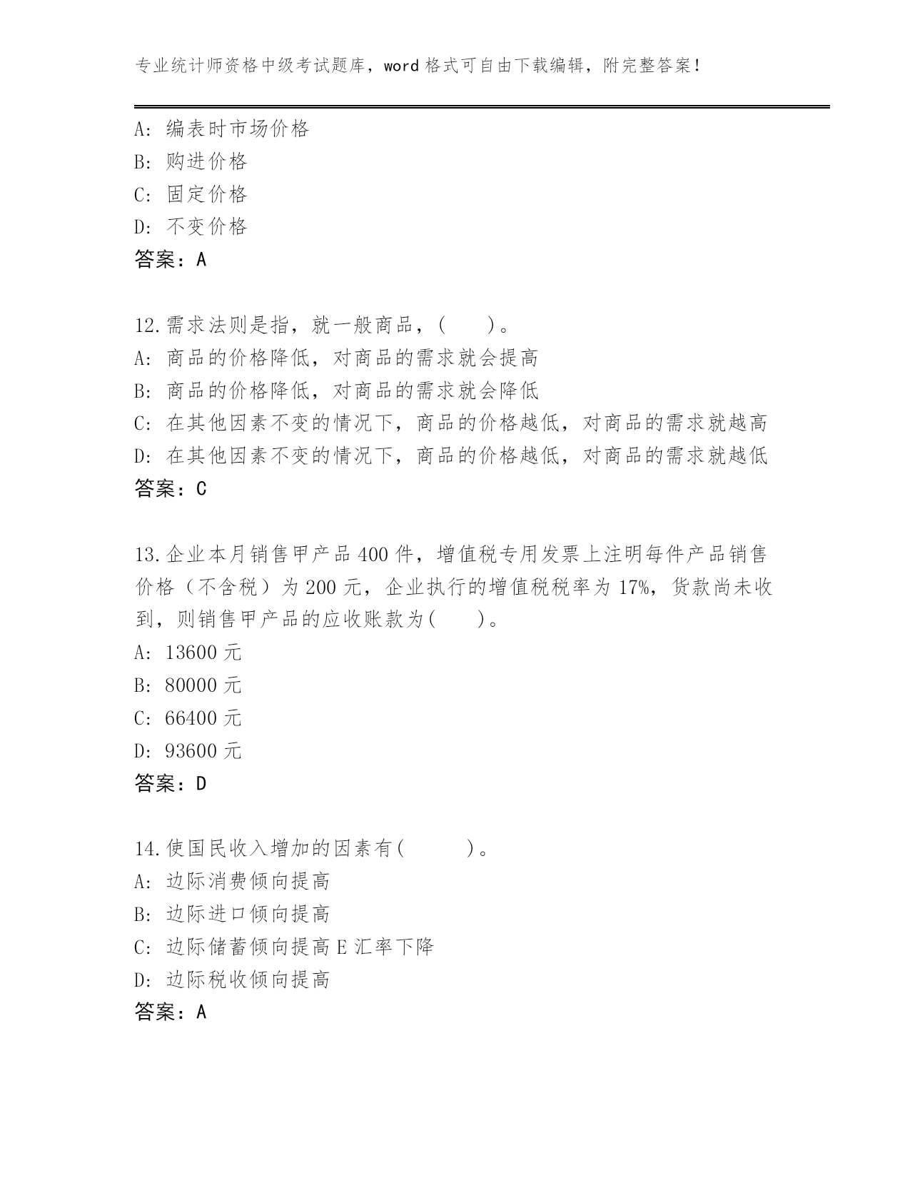 专业统计师资格中级考试题库,word格式可自由下载编辑,附完整答案!完整版黑龙江省杜尔伯特蒙古族自治县统计师资格中级考试真题题库带答案(夺分金卷)第I部分单选题(100题)1.下列各项中属于消费范围的是()。A:妈妈在家做饭B:爷爷接送孙子上学C:儿子在家饭后涮碗D:爸爸在家修理自行车时购买的配件答案:D2.在财务统计中,企业主营业务收入是指企业从事主要生产经营活动所取得的营业收入,对于不同行业的企业,其具体内容有所不同。其中交通运输企业的主营业务收入是()。A:工程结算收入B:营运业务收入C:营业收入D:产品销售收入答案:B3.会计基本假设中的()要求会计核算应当以企业持续、正常的生产经营活动为前提。A:货币计量B:持续经营C:会计主体D:会计分期答案:B4.由()来生产公共物品是解决公共物品生产的一种较好的方法。A:政府B:个体经济C:私营企业D:三资企业答案:A5.企业在财产清查中发现现金盈余时,在未报批准前,应编制以下分录()。A:借记“银行存款”,贷记“其他应付款”B:借记“库存现金”,贷记“营业外收入”C:借记“银行存款”,贷记“待处理财产损溢——待处理流动资产损溢”D:借记“库存现金”,贷记“待处理财产损溢——待处理流动资产损溢”答案:D6.从调查范围和调查时间看,普查属于()。A:全面调查、经常调查B:全面调查、一次性调查C:非全面调查、经常性调查D:非全面调查、一次性调查答案:B7.在实际工作中,如果一个()单位从事两种以上的经济活动,则按其中全年销售收入最大的来确定其行业属性。A:交通运输业、批发零售业B:工业、批发零售业C:工业、建筑业D:建筑业、交通运输业答案:B8.回归系数的含义为()。A:泡沫高度增加一个单位,洗洁精含量平均增加4.22毫米B:洗洁精含量增加一个单位,泡沫高度平均增加0.755毫米C:洗洁精含量增加一个单位,泡沫高度平均增加9.50毫米D:泡沫高度增加一个单位,洗洁精含量平均增加2.679毫米答案:C9.下列关于三部门宏观经济均衡条件的说法中,正确的是()。A:储蓄=政府的净税收收入+政府购买+投资B:储蓄+政府的净税收收入=政府购买+投资C:储蓄+政府的净税收收入+政府购买=投资D:储蓄=投资答案:B10.在1M曲线不变的情况下,政府支出的增加会引起国民收入和利率的变化是()A:国民收入减少,利率上升B:国民收入增加,利率下降C:国民收入增加,利率上升D:国民收入减少,利率下降答案:C11.国民资产负债核算中的固定资产和存货都按照统一的进行估计。A:编表时市场价格B:购进价格C:固定价格D:不变价格答案:A12.需求法则是指,就一般商品,()。A:商品的价格降低,对商品的需求就会提高B:商品的价格降低,对商品的需求就会降低C:在其他因素不变的情况下,商品的价格越低,对商品的需求就越高D:在其他因素不变的情况下,商品的价格越低,对商品的需求就越低答案:C13.企业本月销售甲产品400件,增值税专用发票上注明每件产品销售价格(不含税)为200元,企业执行的增值税税率为17%,货款尚未收到,则销售甲产品的应收账款为()。A:13600元B:80000元C:66400元D:93600元答案:D14.使国民收入增加的因素有()。A:边际消费倾向提高B:边际进口倾向提高C:边际储蓄倾向提高E汇率下降D:边际税收倾向提高答案:A15.经济增长、充分就业、稳定物价和国际收支平衡是宏观经济政策的四大主要目标,平衡国际收支目标与其他三大目标之间的关系是()。A:不相关的B:矛盾的C:一致的D:既有一致又有矛盾答案:D16.张红是某大学一年级的学生,她参加了微积分的两次考试。第一次考试中,全班的平均成绩是75分,标准差是10分;第二次考试中,全班的平均成绩是70分,标准差是15分。张红每次考试成绩都是85分。假定考试分数近似服从正态分布,则张红两次考试的成绩在班里的相对位置()。A:因为不知道班里人数而无法判断B:不相同,第二次比第一次好C:相同D:不相同,第一次比第二次好答案:C17.某企业为一般纳税人,本月出售产品收到价款100万元,出售产品收到的增值税17万元,出售原材料收入5万元,出租土地使用权收入8万元,出售设备收入5万元,则该企业本月的营业收入为()。A:118万元B:113万元C:105万元D:135万元答案:B18.根据法律法规规章规定,适用没收违法所得的统计违法行为是()。A:拒绝提供统计资料B:未按照国家有关规定设置原始记录、统计台账C:违反国家有关规定,造成统计资料毁损、灭失的D:未取得涉外调查许可证进行涉外调查答案:D19.企业购人了需要安装的设备一台,取得的发票上注明的设备款为40000元,发生的运费为2500元,购入后发生安装费1000元,全部款项已从银行存款户支付,设备已2