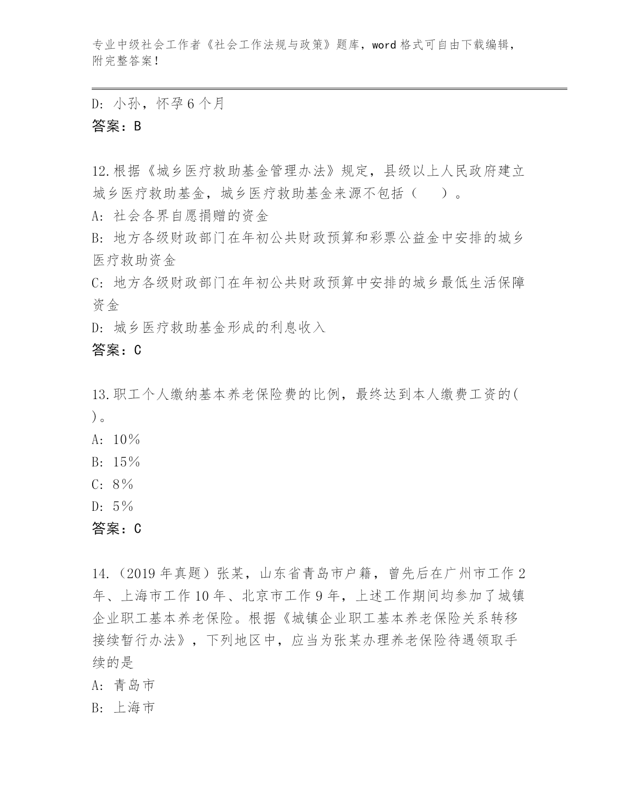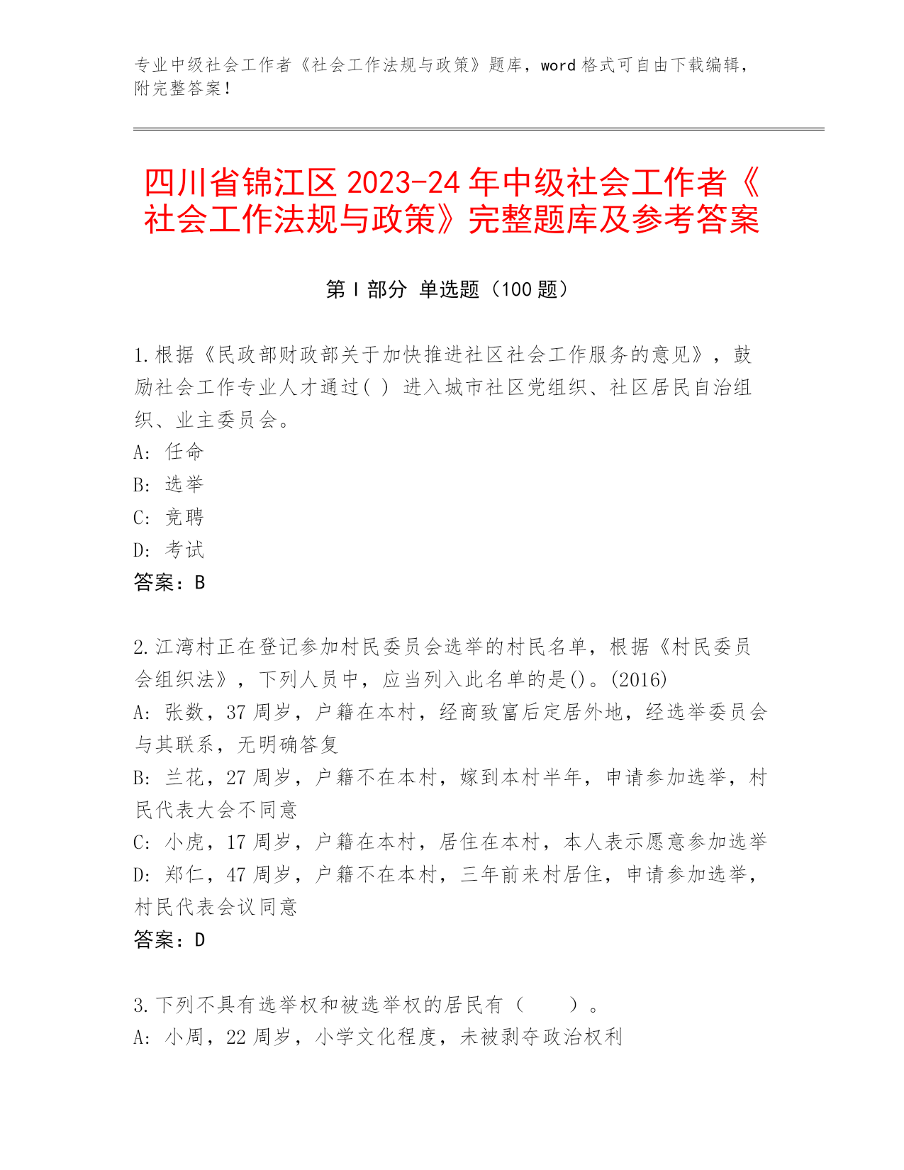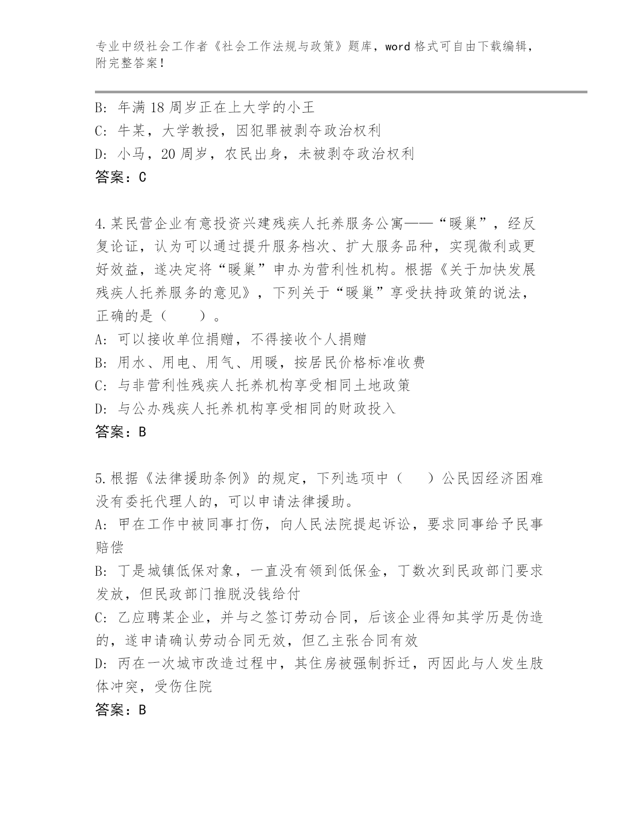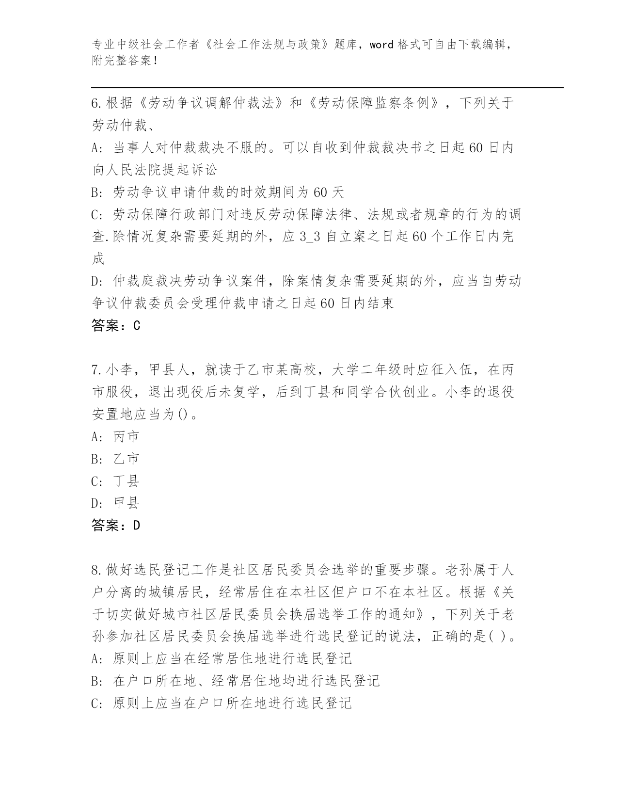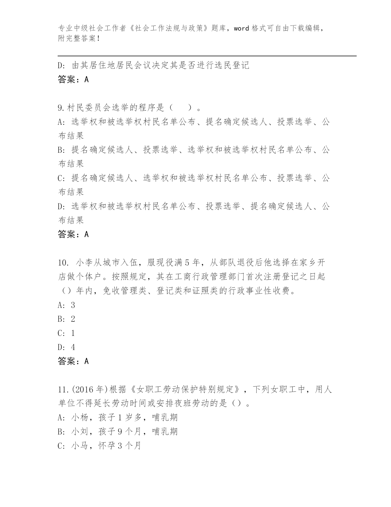 专业中级社会工作者《社会工作法规与政策》题库,word格式可自由下载编辑,附完整答案!四川省锦江区2023-24年中级社会工作者《社会工作法规与政策》完整题库及参考答案第I部分单选题(100题)1.根据《民政部财政部关于加快推进社区社会工作服务的意见》,鼓励社会工作专业人才通过()进入城市社区党组织、社区居民自治组织、业主委员会。A:任命B:选举C:竞聘D:考试答案:B2.江湾村正在登记参加村民委员会选举的村民名单,根据《村民委员会组织法》,下列人员中,应当列入此名单的是()。(2016)A:张数,37周岁,户籍在本村,经商致富后定居外地,经选举委员会与其联系,无明确答复B:兰花,27周岁,户籍不在本村,嫁到本村半年,申请参加选举,村民代表大会不同意C:小虎,17周岁,户籍在本村,居住在本村,本人表示愿意参加选举D:郑仁,47周岁,户籍不在本村,三年前来村居住,申请参加选举,村民代表会议同意答案:D3.下列不具有选举权和被选举权的居民有()。A:小周,22周岁,小学文化程度,未被剥夺政治权利B:年满18周岁正在上大学的小王C:牛某,大学教授,因犯罪被剥夺政治权利D:小马,20周岁,农民出身,未被剥夺政治权利答案:C4.某民营企业有意投资兴建残疾人托养服务公寓——“暖巢”,经反复论证,认为可以通过提升服务档次、扩大服务品种,实现微利或更好效益,遂决定将“暖巢”申办为营利性机构。根据《关于加快发展残疾人托养服务的意见》,下列关于“暖巢”享受扶持政策的说法,正确的是()。A:可以接收单位捐赠,不得接收个人捐赠B:用水、用电、用气、用暖,按居民价格标准收费C:与非营利性残疾人托养机构享受相同土地政策D:与公办残疾人托养机构享受相同的财政投入答案:B5.根据《法律援助条例》的规定,下列选项中()公民因经济困难没有委托代理人的,可以申请法律援助。A:甲在工作中被同事打伤,向人民法院提起诉讼,要求同事给予民事赔偿B:丁是城镇低保对象,一直没有领到低保金,丁数次到民政部门要求发放,但民政部门推脱没钱给付C:乙应聘某企业,并与之签订劳动合同,后该企业得知其学历是伪造的,遂申请确认劳动合同无效,但乙主张合同有效D:丙在一次城市改造过程中,其住房被强制拆迁,丙因此与人发生肢体冲突,受伤住院答案:B6.根据《劳动争议调解仲裁法》和《劳动保障监察条例》,下列关于劳动仲裁、A:当事人对仲裁裁决不服的。可以自收到仲裁裁决书之日起60日内向人民法院提起诉讼B:劳动争议申请仲裁的时效期间为60天C:劳动保障行政部门对违反劳动保障法律、法规或者规章的行为的调查.除情况复杂需要延期的外,应3_3自立案之日起60个工作日内完成D:仲裁庭裁决劳动争议案件,除案情复杂需要延期的外,应当自劳动争议仲裁委员会受理仲裁申请之日起60日内结束答案:C7.小李,甲县人,就读于乙市某高校,大学二年级时应征入伍,在丙市服役,退出现役后未复学,后到丁县和同学合伙创业。小李的退役安置地应当为()。A:丙市B:乙市C:丁县D:甲县答案:D8.做好选民登记工作是社区居民委员会选举的重要步骤。老孙属于人户分离的城镇居民,经常居住在本社区但户口不在本社区。根据《关于切实做好城市社区居民委员会换届选举工作的通知》,下列关于老孙参加社区居民委员会换届选举进行选民登记的说法,正确的是()。A:原则上应当在经常居住地进行选民登记B:在户口所在地、经常居住地均进行选民登记C:原则上应当在户口所在地进行选民登记D:由其居住地居民会议决定其是否进行选民登记答案:A9.村民委员会选举的程序是()。A:选举权和被选举权村民名单公布、提名确定候选人、投票选举、公布结果B:提名确定候选人、投票选举、选举权和被选举权村民名单公布、公布结果C:提名确定候选人、选举权和被选举权村民名单公布、投票选举、公布结果D:选举权和被选举权村民名单公布、投票选举、提名确定候选人、公布结果答案:A10.小李从城市入伍,服现役满5年,从部队退役后他选择在家乡开店做个体户。按照规定,其在工商行政管理部门首次注册登记之日起()年内,免收管理类、登记类和证照类的行政事业性收费。A:3B:2C:1D:4答案:A11.(2016年)根据《女职工劳动保护特别规定》,下列女职工中,用人单位不得延长劳动时间或安排夜班劳动的是()。A:小杨,孩子1岁多,哺乳期B:小刘,孩子9个月,哺乳期C:小马,怀孕3个月D:小孙,怀孕6个月答案:B12.根据《城乡医疗救助基金管理办法》规定,县级以上人民政府建立城乡医疗救助基金,城乡医疗救助基金来源不包括()。A:社会各界自愿捐赠的资金B:地方各级财政部门在年初公共财政预算和彩票公益金中安排的城乡医疗救助资金C:地方各级财政部门在年初公共财政预算中安排的城乡最低生活保障资金D:城乡医疗救助基金形成的利息收入答案:C13.