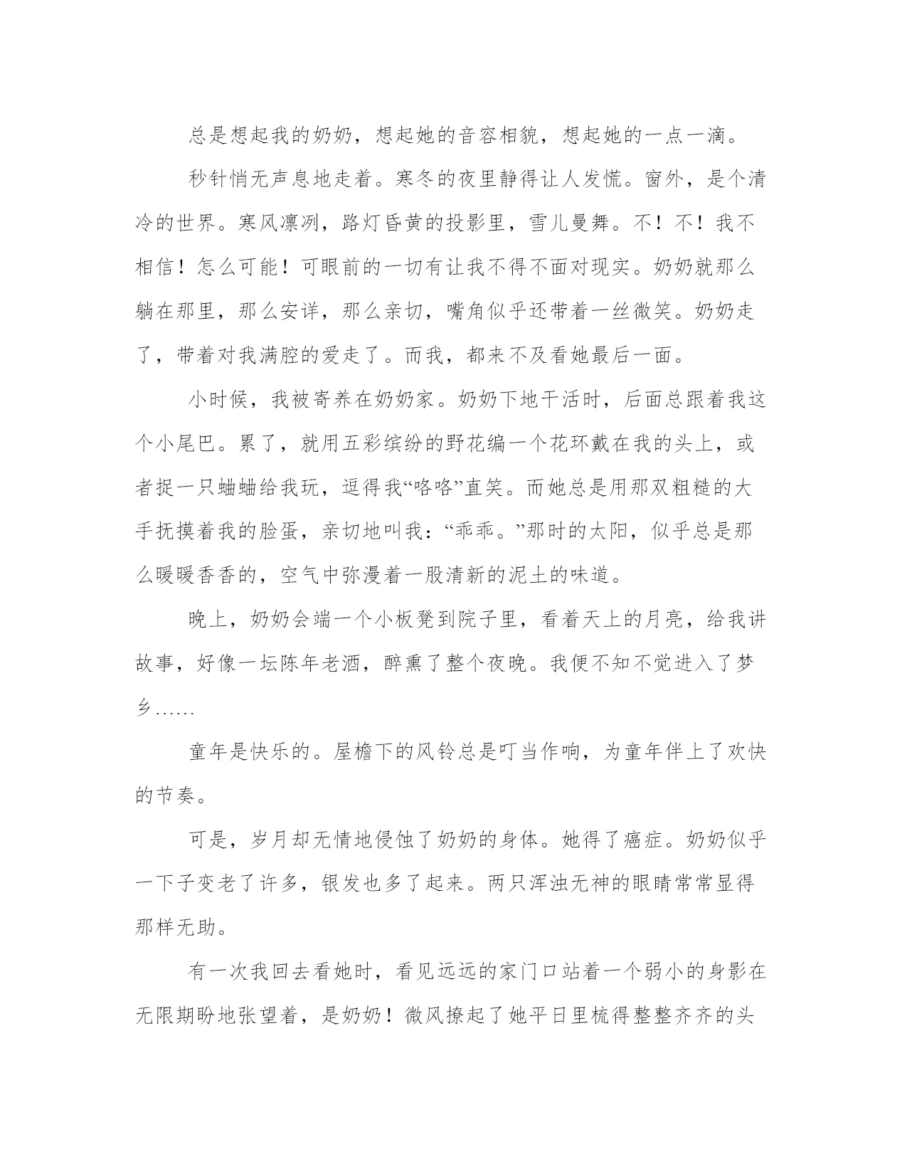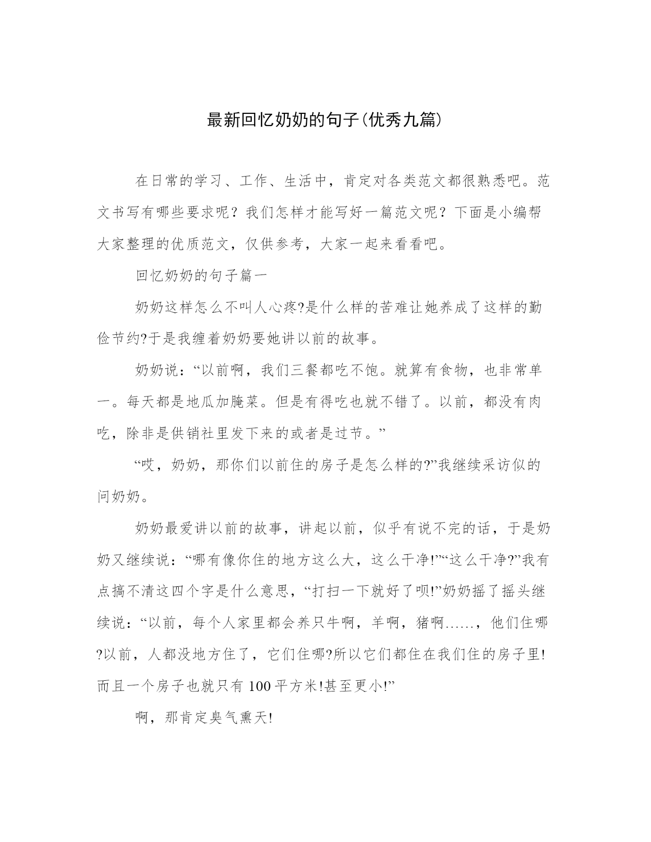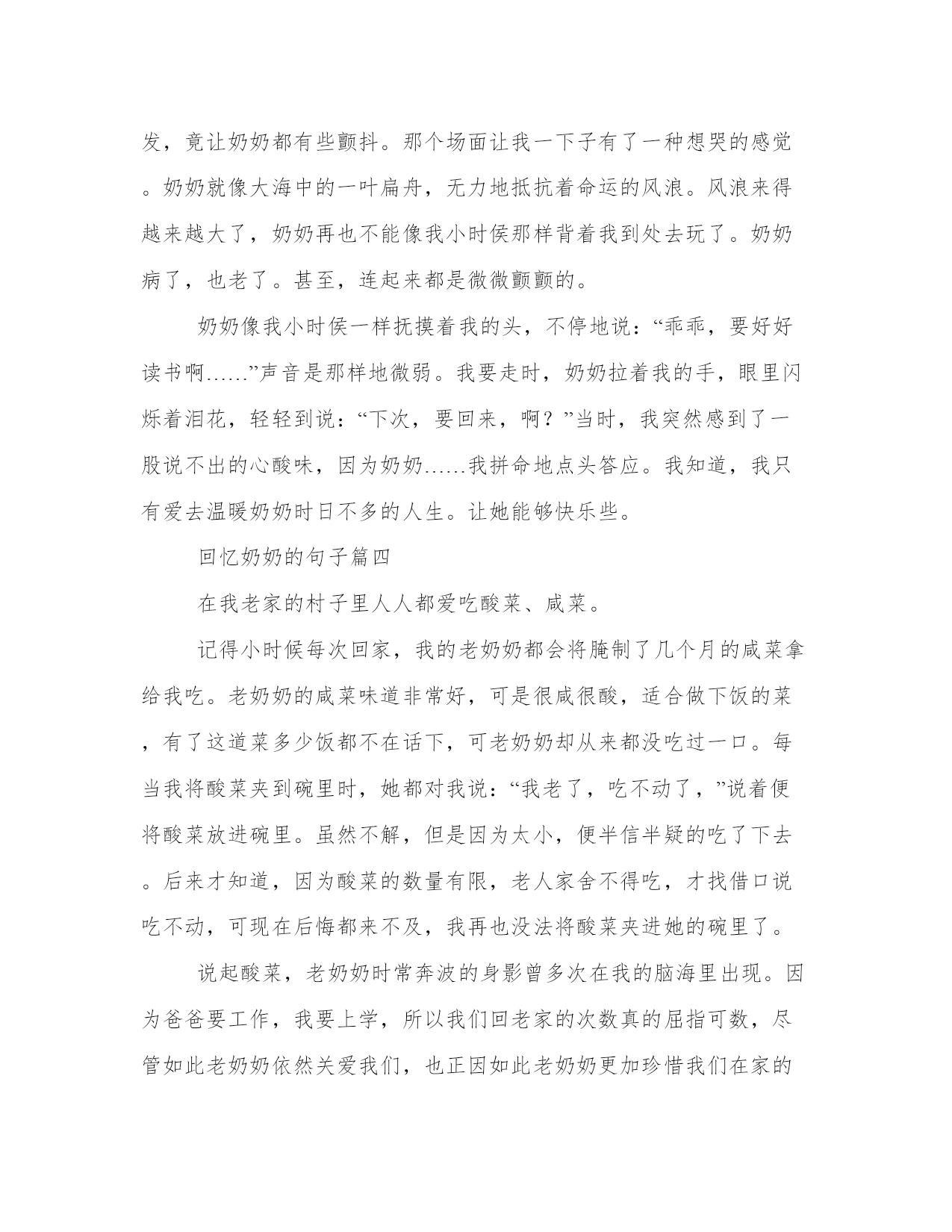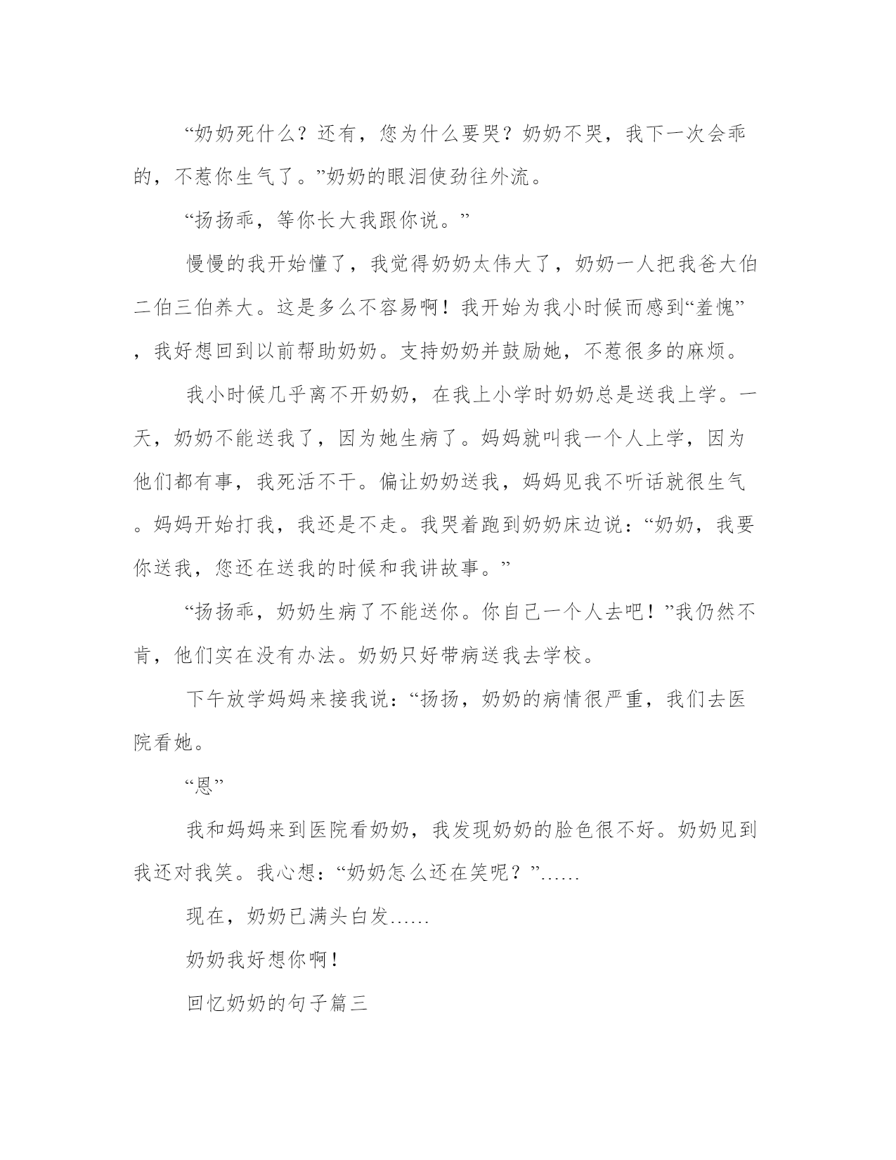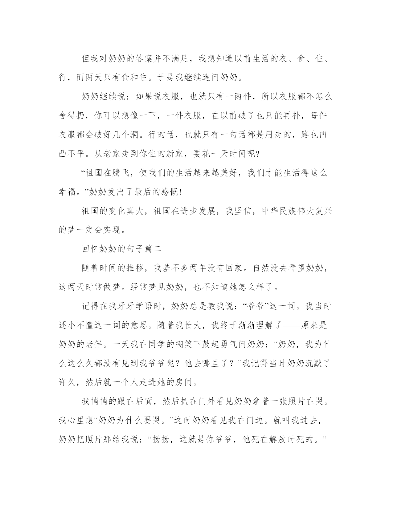 最新回忆奶奶的句子(优秀九篇)在日常的学习、工作、生活中,肯定对各类范文都很熟悉吧。范文书写有哪些要求呢?我们怎样才能写好一篇范文呢?下面是小编帮大家整理的优质范文,仅供参考,大家一起来看看吧。回忆奶奶的句子篇一奶奶这样怎么不叫人心疼?是什么样的苦难让她养成了这样的勤俭节约?于是我缠着奶奶要她讲以前的故事。奶奶说:“以前啊,我们三餐都吃不饱。就算有食物,也非常单一。每天都是地瓜加腌菜。但是有得吃也就不错了。以前,都没有肉吃,除非是供销社里发下来的或者是过节。”“哎,奶奶,那你们以前住的房子是怎么样的?”我继续采访似的问奶奶。奶奶最爱讲以前的故事,讲起以前,似乎有说不完的话,于是奶奶又继续说:“哪有像你住的地方这么大,这么干净!”“这么干净?”我有点搞不清这四个字是什么意思,“打扫一下就好了呗!”奶奶摇了摇头继续说:“以前,每个人家里都会养只牛啊,羊啊,猪啊……,他们住哪?以前,人都没地方住了,它们住哪?所以它们都住在我们住的房子里!而且一个房子也就只有100平方米!甚至更小!”啊,那肯定臭气熏天!但我对奶奶的答案并不满足,我想知道以前生活的衣、食、住、行,而两天只有食和住。于是我继续追问奶奶。奶奶继续说:如果说衣服,也就只有一两件,所以衣服都不怎么舍得扔,你可以想像一下,一件衣服,在以前破了也只能再补,每件衣服都会破好几个洞。行的话,也就只有一句话都是用走的,路也凹凸不平。从老家走到你住的新家,要花一天时间呢?“祖国在腾飞,使我们的生活越来越美好,我们才能生活得这么幸福。”奶奶发出了最后的感慨!祖国的变化真大,祖国在进步发展,我坚信,中华民族伟大复兴的梦一定会实现。回忆奶奶的句子篇二随着时间的推移,我差不多两年没有回家。自然没去看望奶奶,这两天时常做梦。经常梦见奶奶,也不知道她怎么样了。记得在我牙牙学语时,奶奶总是教我说:“爷爷”这一词。我当时还小不懂这一词的意思。随着我长大,我终于渐渐理解了——原来是奶奶的老伴。一天我在同学的嘲笑下鼓起勇气问奶奶:“奶奶,我为什么这么久都没有见到我爷爷呢?他去哪里了?”我记得当时奶奶沉默了许久,然后就一个人走进她的房间。我悄悄的跟在后面,然后扒在门外看见奶奶拿着一张照片在哭。我心里想“奶奶为什么要哭。”这时奶奶看见我在门边。就叫我过去,奶奶把照片那给我说:“扬扬,这就是你爷爷,他死在解放时死的。”“奶奶死什么?还有,您为什么要哭?奶奶不哭,我下一次会乖的,不惹你生气了。”奶奶的眼泪使劲往外流。“扬扬乖,等你长大我跟你说。”慢慢的我开始懂了,我觉得奶奶太伟大了,奶奶一人把我爸大伯二伯三伯养大。这是多么不容易啊!我开始为我小时候而感到“羞愧”,我好想回到以前帮助奶奶。支持奶奶并鼓励她,不惹很多的麻烦。我小时候几乎离不开奶奶,在我上小学时奶奶总是送我上学。一天,奶奶不能送我了,因为她生病了。妈妈就叫我一个人上学,因为他们都有事,我死活不干。偏让奶奶送我,妈妈见我不听话就很生气。妈妈开始打我,我还是不走。我哭着跑到奶奶床边说:“奶奶,我要你送我,您还在送我的时候和我讲故事。”“扬扬乖,奶奶生病了不能送你。你自己一个人去吧!”我仍然不肯,他们实在没有办法。奶奶只好带病送我去学校。下午放学妈妈来接我说:“扬扬,奶奶的病情很严重,我们去医院看她。“恩”我和妈妈来到医院看奶奶,我发现奶奶的脸色很不好。奶奶见到我还对我笑。我心想:“奶奶怎么还在笑呢?”……现在,奶奶已满头白发……奶奶我好想你啊!回忆奶奶的句子篇三总是想起我的奶奶,想起她的音容相貌,想起她的一点一滴。秒针悄无声息地走着。寒冬的夜里静得让人发慌。窗外,是个清冷的世界。寒风凛冽,路灯昏黄的投影里,雪儿曼舞。不!不!我不相信!怎么可能!可眼前的一切有让我不得不面对现实。奶奶就那么躺在那里,那么安详,那么亲切,嘴角似乎还带着一丝微笑。奶奶走了,带着对我满腔的爱走了。而我,都来不及看她最后一面。小时候,我被寄养在奶奶家。奶奶下地干活时,后面总跟着我这个小尾巴。累了,就用五彩缤纷的野花编一个花环戴在我的头上,或者捉一只蛐蛐给我玩,逗得我“咯咯”直笑。而她总是用那双粗糙的大手抚摸着我的脸蛋,亲切地叫我:“乖乖。”那时的太阳,似乎总是那么暖暖香香的,空气中弥漫着一股清新的泥土的味道。晚上,奶奶会端一个小板凳到院子里,看着天上的月亮,给我讲故事,好像一坛陈年老酒,醉熏了整个夜晚。我便不知不觉进入了梦乡……童年是快乐的。屋檐下的风铃总是叮当作响,为童年伴上了欢快的节奏。可是,岁月却无情地侵蚀了奶奶的身体。她得了癌症。奶奶似乎一下子变老了许多,银发也多了起来。两只浑浊无神的眼睛常常显得那样无助。有一次我回去看她时,看见远远的家门口站着一个弱小的身影在无限期盼地张望着,是奶奶!微风撩起了她平日里梳得整整齐齐的头发,竟让奶奶都有些颤抖。那个场面让我一下子有了一种想哭的感