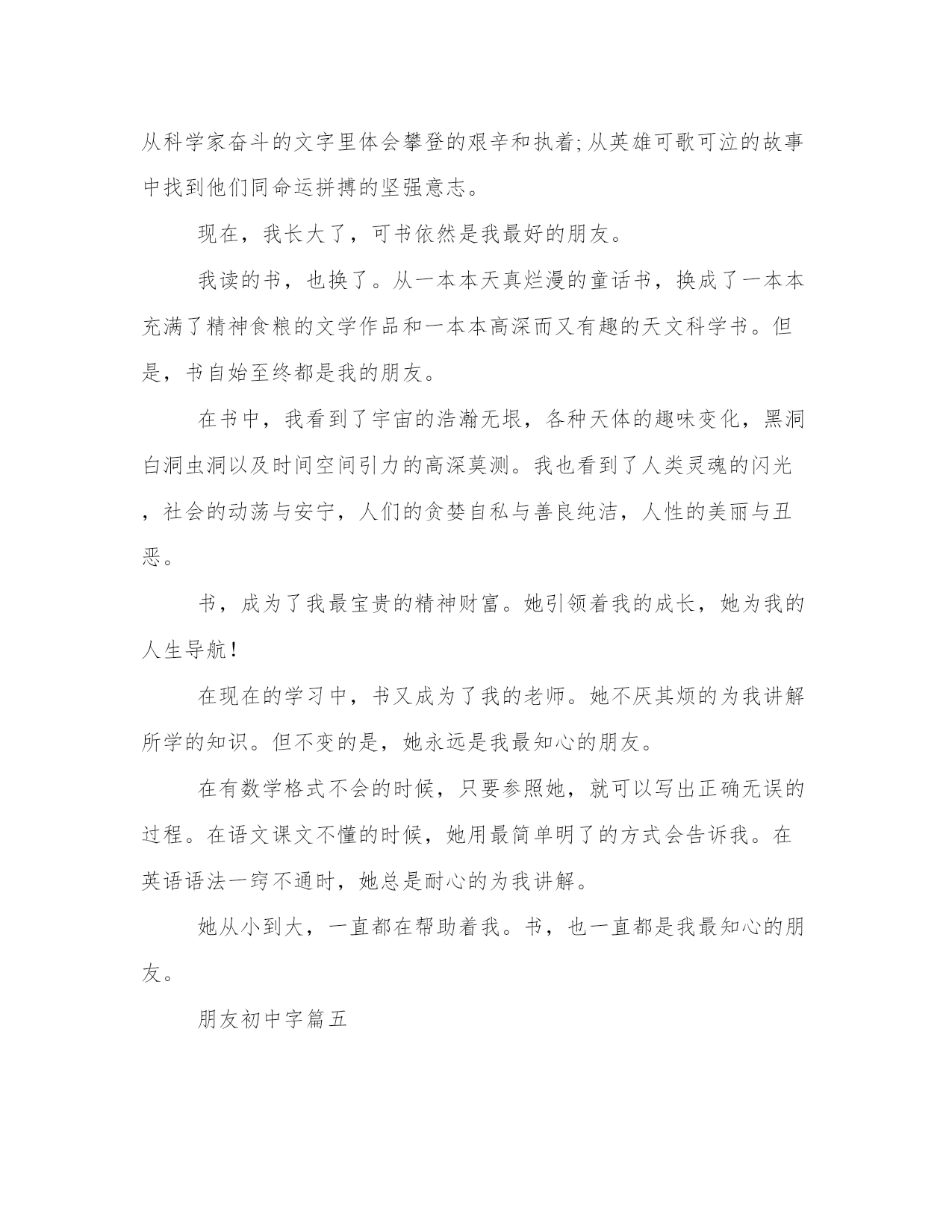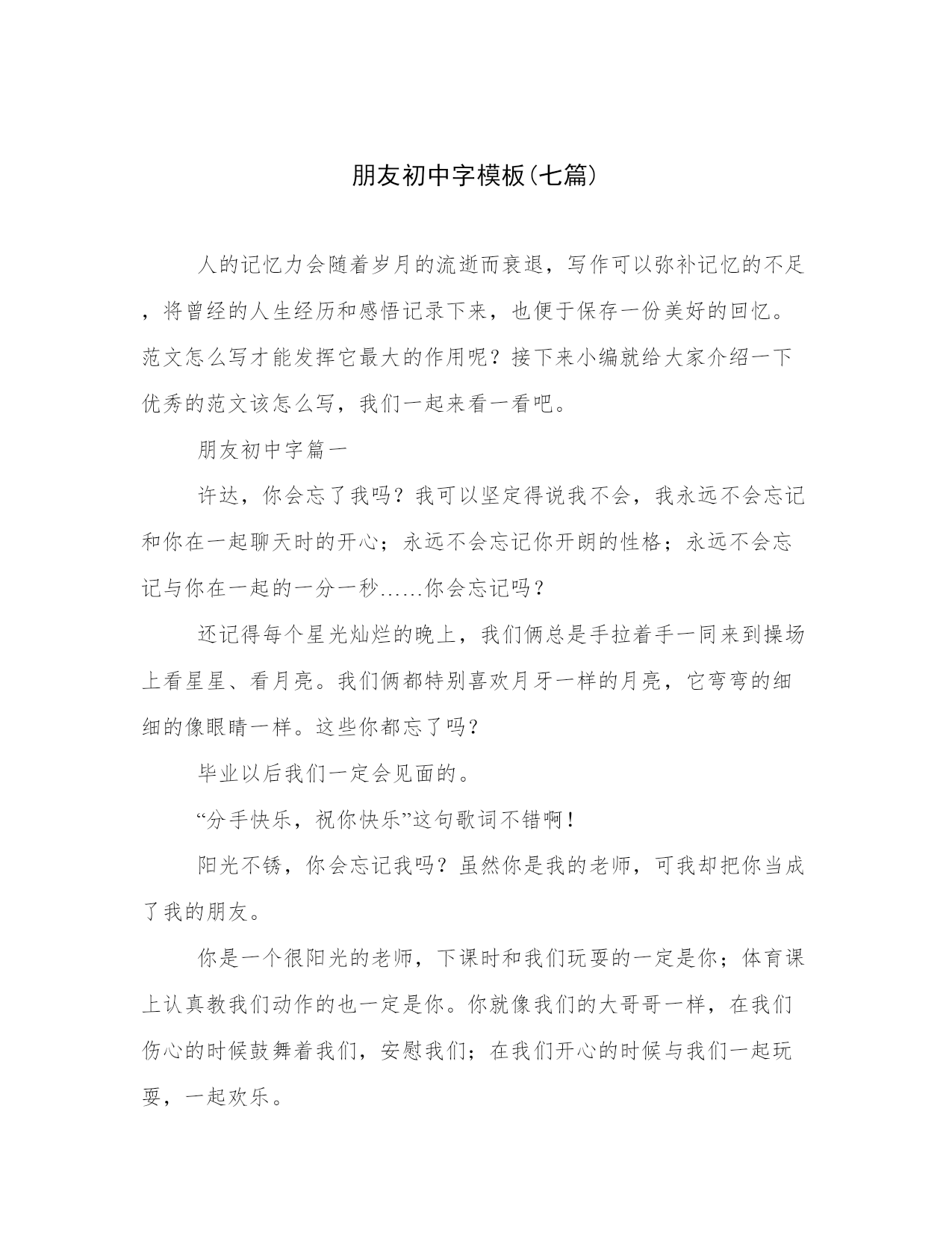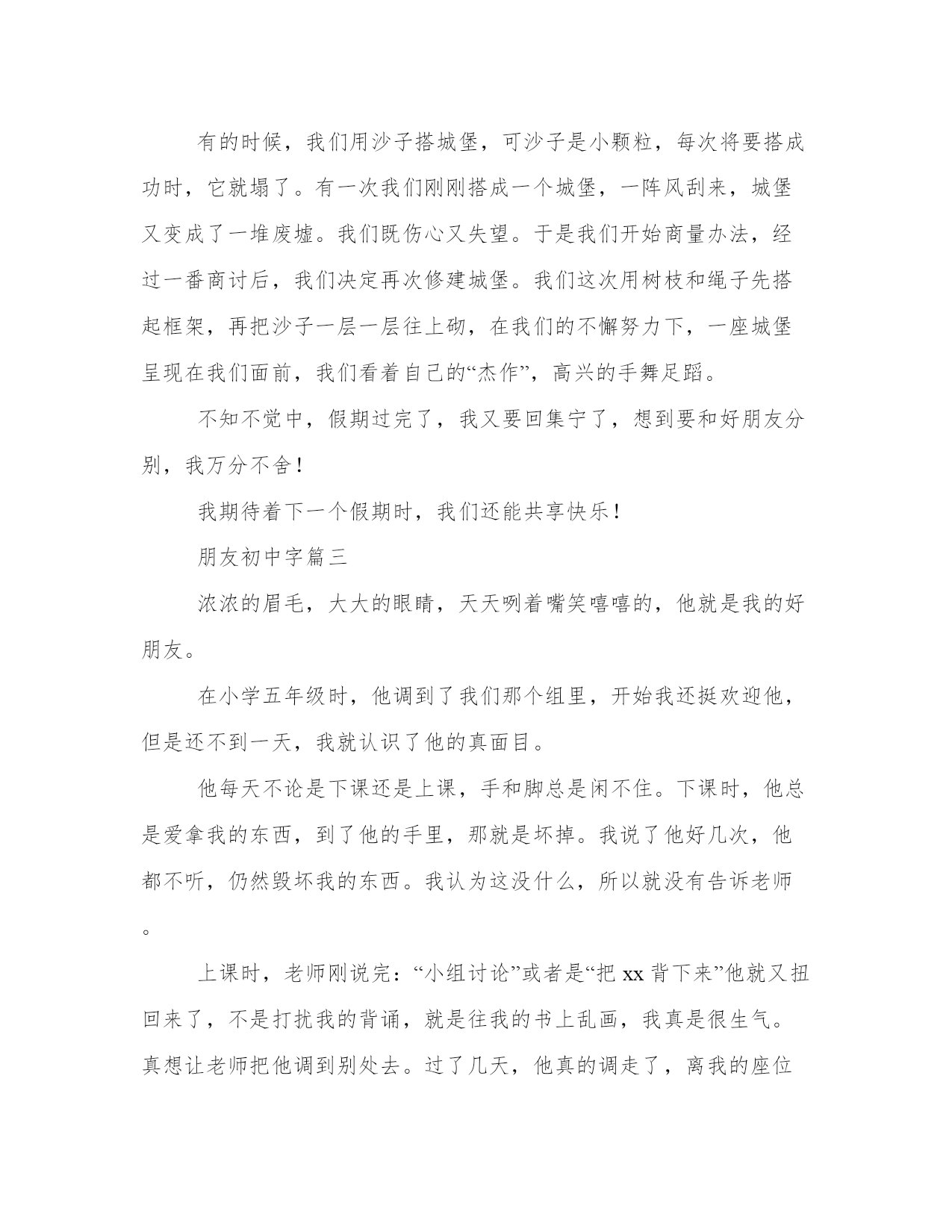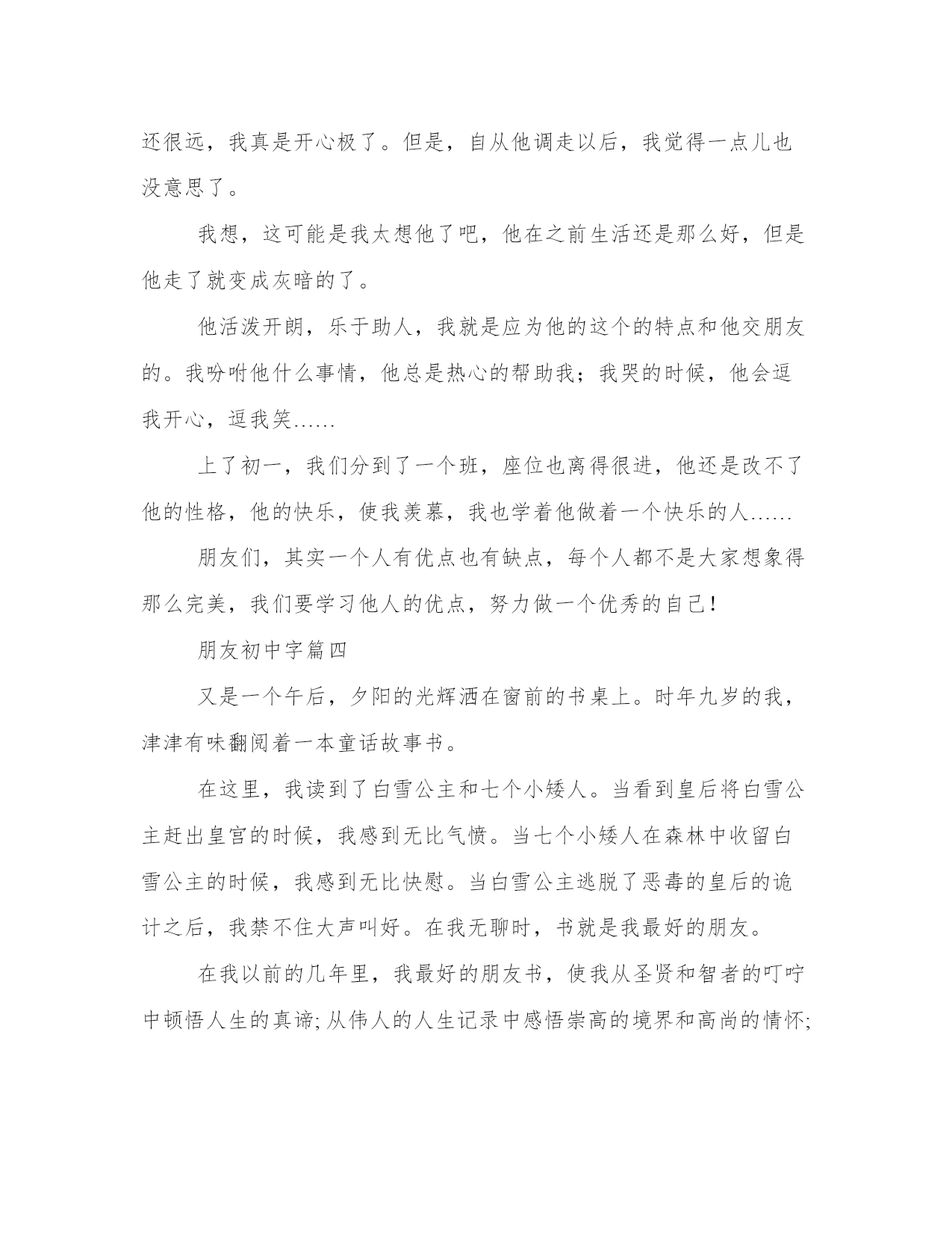 朋友初中字模板(七篇)人的记忆力会随着岁月的流逝而衰退,写作可以弥补记忆的不足,将曾经的人生经历和感悟记录下来,也便于保存一份美好的回忆。范文怎么写才能发挥它最大的作用呢?接下来小编就给大家介绍一下优秀的范文该怎么写,我们一起来看一看吧。朋友初中字篇一许达,你会忘了我吗?我可以坚定得说我不会,我永远不会忘记和你在一起聊天时的开心;永远不会忘记你开朗的性格;永远不会忘记与你在一起的一分一秒……你会忘记吗?还记得每个星光灿烂的晚上,我们俩总是手拉着手一同来到操场上看星星、看月亮。我们俩都特别喜欢月牙一样的月亮,它弯弯的细细的像眼睛一样。这些你都忘了吗?毕业以后我们一定会见面的。“分手快乐,祝你快乐”这句歌词不错啊!阳光不锈,你会忘记我吗?虽然你是我的老师,可我却把你当成了我的朋友。你是一个很阳光的老师,下课时和我们玩耍的一定是你;体育课上认真教我们动作的也一定是你。你就像我们的大哥哥一样,在我们伤心的时候鼓舞着我们,安慰我们;在我们开心的时候与我们一起玩耍,一起欢乐。我依旧清晰地记得,在那节篮球课上你教我们传球和防守,在让我们自己练习时你见我和许达的动作不到位,便手把手得教我们,直到我们把动作做对。马上我们就要毕业了,就要与你说再见了,希望在以后的日子里你继续和教我们那样教育更多的学生,也祝福你生活得幸福!一定不要忘记我哦!马上就要毕业了,老师、同学都让我依依不舍。不管怎样我都应该装的坚强,因为我已经长大!朋友初中字篇二暑假已经接近尾声,在这个愉快的暑假中,我交了两个新朋友。我的新朋友,一个是名叫宋涛的女孩儿。她头上扎着马尾辫,天气酷热时她会穿着裙子在树荫下乘凉,但大多数时间是穿长裤,因为我们这里酷热的时候很少。另一个是叫李维的男孩儿,他的外号叫“李嘟嘟”,因为它肉嘟嘟的,很可爱。他总是酷酷的,尤其是那次戴着一副小墨镜,昂着头,迈着优雅的步子从我眼前经过,简直是酷毙啦!他几乎每天都会穿不同的衣服,并且都很时尚。我们三个是邻居,每天下午我们都会在家门口一起玩耍。我们家旁边有一个跳跳床,那是我们的乐园。我们在跳跳床上一蹦老高,有时其中一人摔倒,另两个人会更起劲地跳,把倒下的那个颠的爬不起来,无论他(她)怎么高呼:“停!停!”我们都不会理他,直跳到大汗淋漓、筋疲力竭,才倒在跳跳床上笑成一团!有的时候,我们用沙子搭城堡,可沙子是小颗粒,每次将要搭成功时,它就塌了。有一次我们刚刚搭成一个城堡,一阵风刮来,城堡又变成了一堆废墟。我们既伤心又失望。于是我们开始商量办法,经过一番商讨后,我们决定再次修建城堡。我们这次用树枝和绳子先搭起框架,再把沙子一层一层往上砌,在我们的不懈努力下,一座城堡呈现在我们面前,我们看着自己的“杰作”,高兴的手舞足蹈。不知不觉中,假期过完了,我又要回集宁了,想到要和好朋友分别,我万分不舍!我期待着下一个假期时,我们还能共享快乐!朋友初中字篇三浓浓的眉毛,大大的眼睛,天天咧着嘴笑嘻嘻的,他就是我的好朋友。在小学五年级时,他调到了我们那个组里,开始我还挺欢迎他,但是还不到一天,我就认识了他的真面目。他每天不论是下课还是上课,手和脚总是闲不住。下课时,他总是爱拿我的东西,到了他的手里,那就是坏掉。我说了他好几次,他都不听,仍然毁坏我的东西。我认为这没什么,所以就没有告诉老师。上课时,老师刚说完:“小组讨论”或者是“把xx背下来”他就又扭回来了,不是打扰我的背诵,就是往我的书上乱画,我真是很生气。真想让老师把他调到别处去。过了几天,他真的调走了,离我的座位还很远,我真是开心极了。但是,自从他调走以后,我觉得一点儿也没意思了。我想,这可能是我太想他了吧,他在之前生活还是那么好,但是他走了就变成灰暗的了。他活泼开朗,乐于助人,我就是应为他的这个的特点和他交朋友的。我吩咐他什么事情,他总是热心的帮助我;我哭的时候,他会逗我开心,逗我笑……上了初一,我们分到了一个班,座位也离得很进,他还是改不了他的性格,他的快乐,使我羡慕,我也学着他做着一个快乐的人……朋友们,其实一个人有优点也有缺点,每个人都不是大家想象得那么完美,我们要学习他人的优点,努力做一个优秀的自己!朋友初中字篇四又是一个午后,夕阳的光辉洒在窗前的书桌上。时年九岁的我,津津有味翻阅着一本童话故事书。在这里,我读到了白雪公主和七个小矮人。当看到皇后将白雪公主赶出皇宫的时候,我感到无比气愤。当七个小矮人在森林中收留白雪公主的时候,我感到无比快慰。当白雪公主逃脱了恶毒的皇后的诡计之后,我禁不住大声叫好。在我无聊时,书就是我最好的朋友。在我以前的几年里,我最好的朋友书,使我从圣贤和智者的叮咛中顿悟人生的真谛;从伟人的人生记录中感悟崇高的境界和高尚的情怀;从科学家奋斗的文字里体会攀登的艰辛和执着;从英雄可歌可泣的故事中找到他们同命运拼搏的坚强意志。现在,我长大了,可书依然是我最好的朋