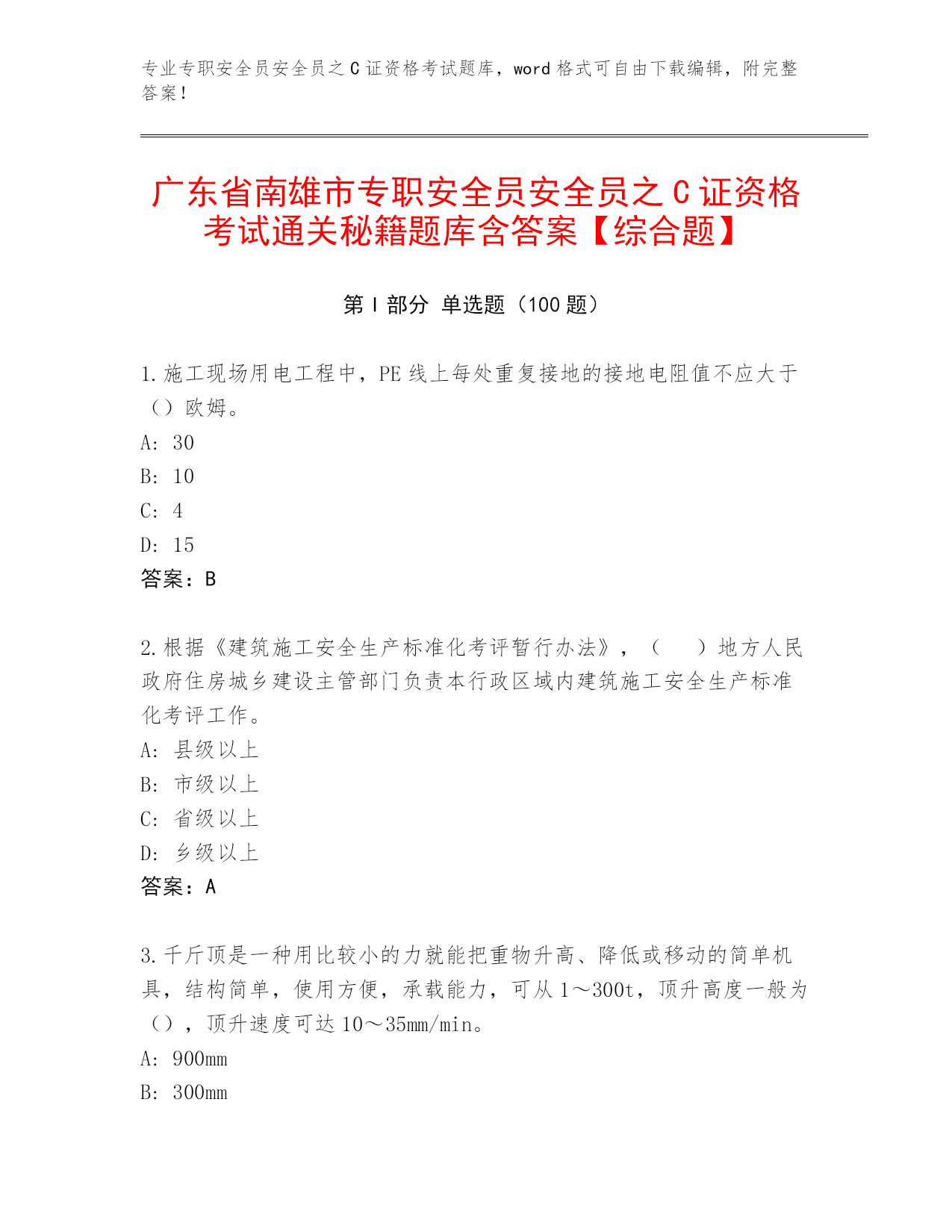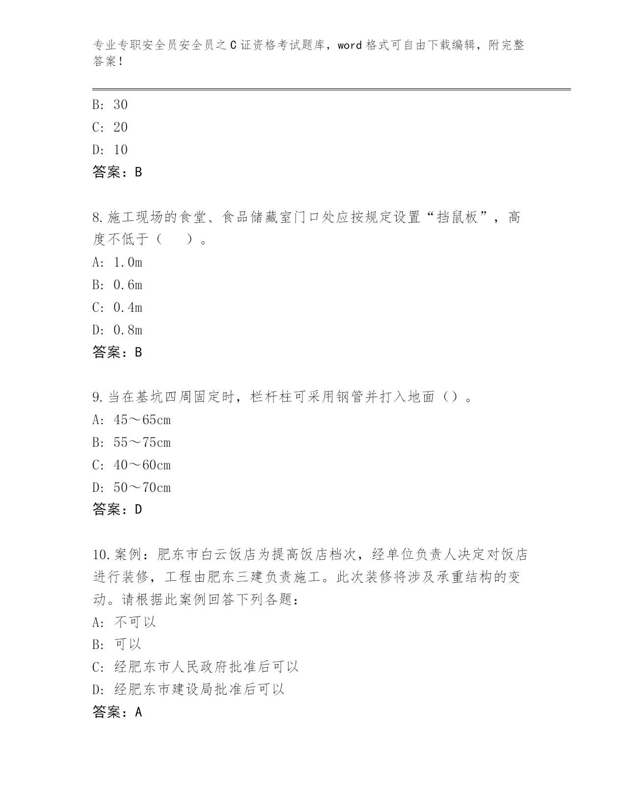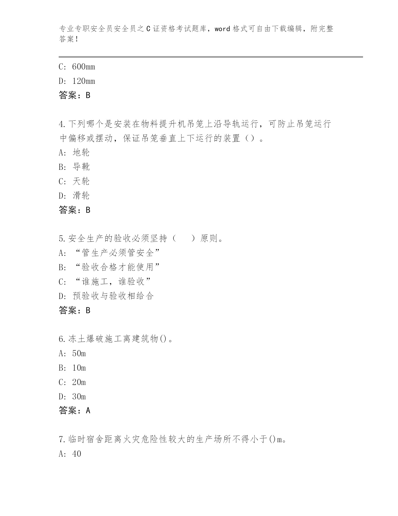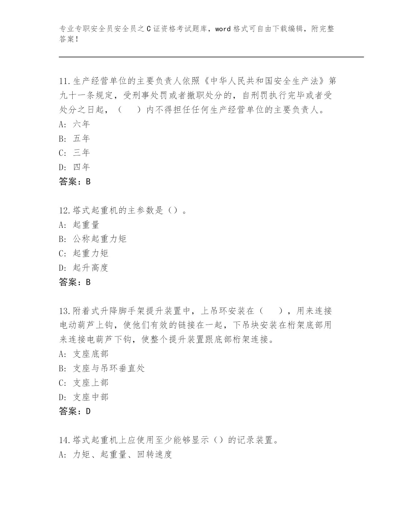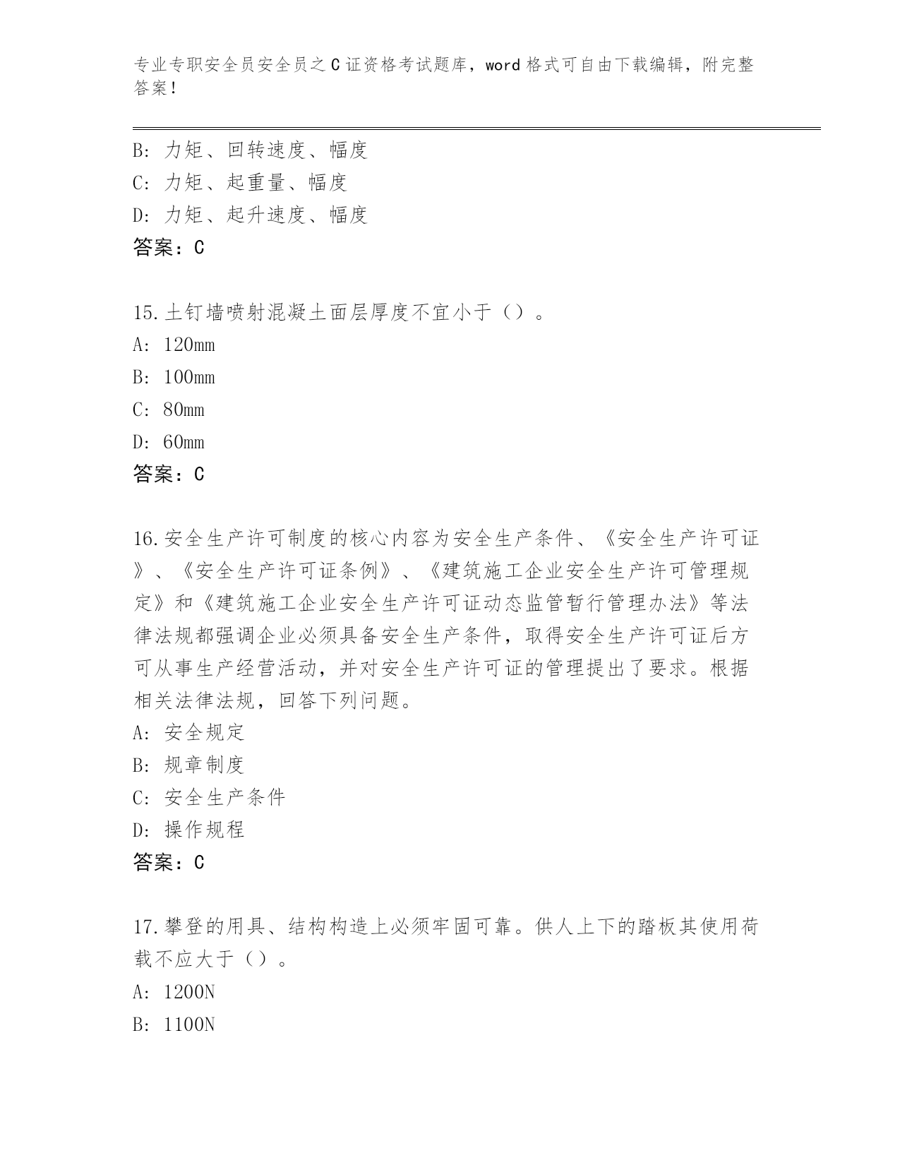 专业专职安全员安全员之C证资格考试题库,word格式可自由下载编辑,附完整答案!广东省南雄市专职安全员安全员之C证资格考试通关秘籍题库含答案【综合题】第I部分单选题(100题)1.施工现场用电工程中,PE线上每处重复接地的接地电阻值不应大于()欧姆。A:30B:10C:4D:15答案:B2.根据《建筑施工安全生产标准化考评暂行办法》,()地方人民政府住房城乡建设主管部门负责本行政区域内建筑施工安全生产标准化考评工作。A:县级以上B:市级以上C:省级以上D:乡级以上答案:A3.千斤顶是一种用比较小的力就能把重物升高、降低或移动的简单机具,结构简单,使用方便,承载能力,可从1~300t,顶升高度一般为(),顶升速度可达10~35mm/min。A:900mmB:300mmC:600mmD:120mm答案:B4.下列哪个是安装在物料提升机吊笼上沿导轨运行,可防止吊笼运行中偏移或摆动,保证吊笼垂直上下运行的装置()。A:地轮B:导靴C:天轮D:滑轮答案:B5.安全生产的验收必须坚持()原则。A:“管生产必须管安全”B:“验收合格才能使用”C:“谁施工,谁验收”D:预验收与验收相给合答案:B6.冻土爆破施工离建筑物()。A:50mB:10mC:20mD:30m答案:A7.临时宿舍距离火灾危险性较大的生产场所不得小于()m。A:40B:30C:20D:10答案:B8.施工现场的食堂、食品储藏室门口处应按规定设置“挡鼠板”,高度不低于()。A:1.0mB:0.6mC:0.4mD:0.8m答案:B9.当在基坑四周固定时,栏杆柱可采用钢管并打入地面()。A:45~65cmB:55~75cmC:40~60cmD:50~70cm答案:D10.案例:肥东市白云饭店为提高饭店档次,经单位负责人决定对饭店进行装修,工程由肥东三建负责施工。此次装修将涉及承重结构的变动。请根据此案例回答下列各题:A:不可以B:可以C:经肥东市人民政府批准后可以D:经肥东市建设局批准后可以答案:A11.生产经营单位的主要负责人依照《中华人民共和国安全生产法》第九十一条规定,受刑事处罚或者撤职处分的,自刑罚执行完毕或者受处分之日起,()内不得担任任何生产经营单位的主要负责人。A:六年B:五年C:三年D:四年答案:B12.塔式起重机的主参数是()。A:起重量B:公称起重力矩C:起重力矩D:起升高度答案:B13.附着式升降脚手架提升装置中,上吊环安装在(),用来连接电动葫芦上钩,使他们有效的链接在一起,下吊块安装在桁架底部用来连接电葫芦下钩,使整个提升装置跟底部桁架连接。A:支座底部B:支座与吊环垂直处C:支座上部D:支座中部答案:D14.塔式起重机上应使用至少能够显示()的记录装置。A:力矩、起重量、回转速度B:力矩、回转速度、幅度C:力矩、起重量、幅度D:力矩、起升速度、幅度答案:C15.土钉墙喷射混凝土面层厚度不宜小于()。A:120mmB:100mmC:80mmD:60mm答案:C16.安全生产许可制度的核心内容为安全生产条件、《安全生产许可证》、《安全生产许可证条例》、《建筑施工企业安全生产许可管理规定》和《建筑施工企业安全生产许可证动态监管暂行管理办法》等法律法规都强调企业必须具备安全生产条件,取得安全生产许可证后方可从事生产经营活动,并对安全生产许可证的管理提出了要求。根据相关法律法规,回答下列问题。A:安全规定B:规章制度C:安全生产条件D:操作规程答案:C17.攀登的用具、结构构造上必须牢固可靠。供人上下的踏板其使用荷载不应大于()。A:1200NB:1100NC:1000ND:1300N答案:B18.建设单位与施工企业应当在施工合同中明确安全防护、文明施工措施项目总费用,以及费用预付、支付计划、使用要求、调整方式等条款。合同中未作约定或约定不明的,合同工期在一年以内的,建设单位预付安全防护、文明施工措施项目费用不得低于该费用总额的()。A:70%B:50%C:30%D:60%答案:B19.当采用龙门桅杆滑移法吊装时,其上部横梁的改制要符合国家的有关标准要求,焊缝应作()。A:80%磁粉探伤B:80%超声波探伤C:100%超声波探伤D:100%磁粉探伤答案:C20.某工程安全检查结果如下文明施工:保证项目得50分,一般项目得36分,则文明施工分项在汇总表中得分是()。A:12.9分B:86分C:0分D:8.6分答案:A21.振动棒各插上间距应均匀,一般间距不超过振动棒有效作业半径的()倍。A:2B:1.5C:1.3D:1.7答案:B22.混凝土搅拌输送车搅拌装置连续运行不超过()。A:6B:12C:8D:10答案:C23.根据《建设工程安全生产管理条例》规定,施工现场临时搭建的建筑物应当符合安全使用要求。施工现场使用的装配式活动房屋应当具有()。A:安装验收单B:使