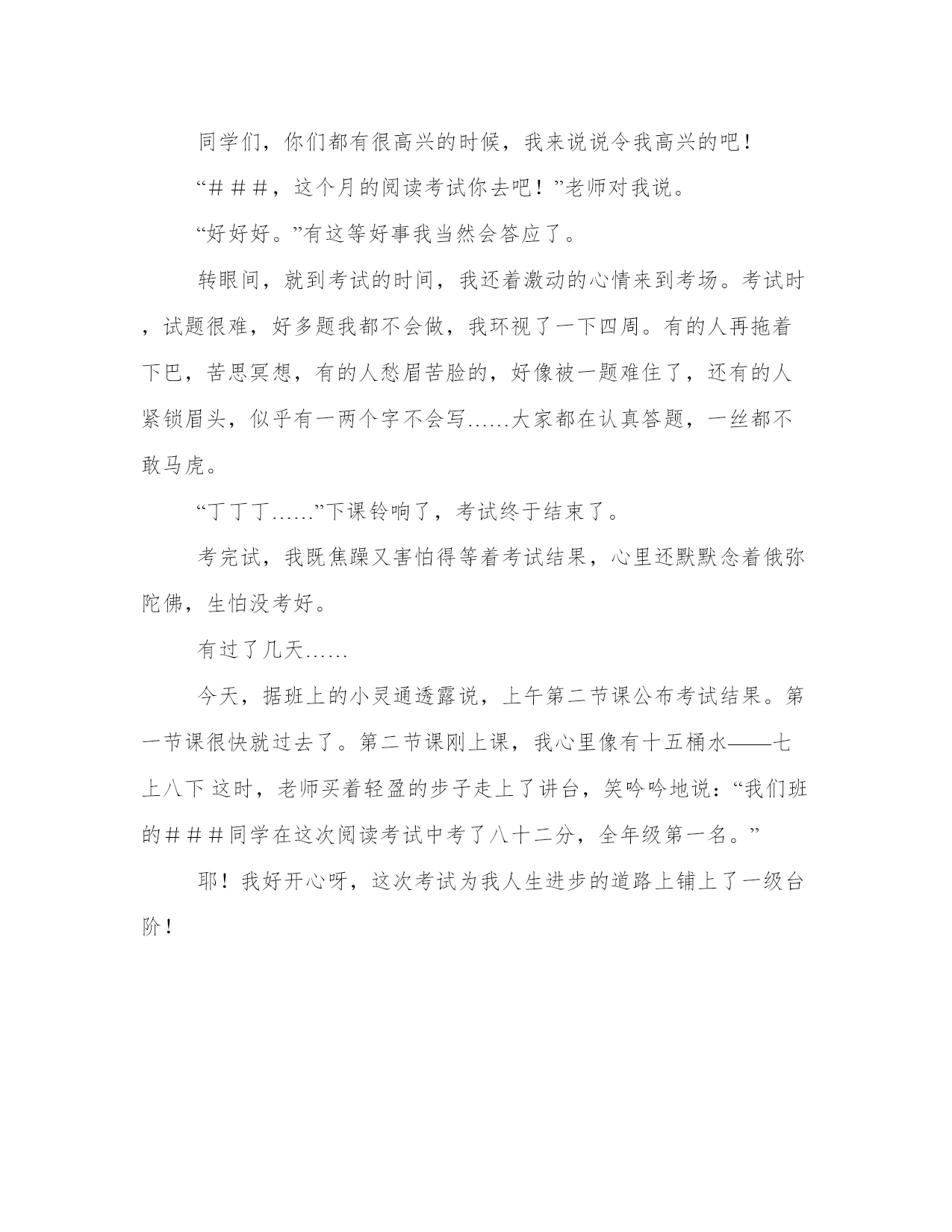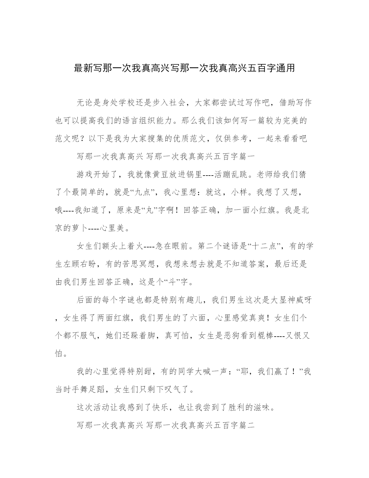 最新写那一次我真高兴写那一次我真高兴五百字通用无论是身处学校还是步入社会,大家都尝试过写作吧,借助写作也可以提高我们的语言组织能力。那么我们该如何写一篇较为完美的范文呢?以下是我为大家搜集的优质范文,仅供参考,一起来看看吧写那一次我真高兴写那一次我真高兴五百字篇一游戏开始了,我就像黄豆放进锅里----活蹦乱跳。老师给我们猜了个最简单的,就是“九点”,我心里想:就这,小样。我想了又想,哦----我知道了,原来是“丸”字啊!回答正确,加一面小红旗。我是北京的萝卜----心里美。女生们额头上着火----急在眼前。第二个谜语是“十二点”,有的学生左顾右盼,有的苦思冥想,我想来想去就是不知道答案,最后还是由我们男生回答正确,这是个“斗”字。后面的每个字谜也都是特别有趣儿,我们男生这次是大显神威呀,女生得了两面红旗,我们男生的了六面,心里感觉真爽!女生们个个都不服气,她们还跺着脚,真可怕,女生是恶狗看到棍棒----又恨又怕。我的心里觉得特别甜,有的同学大喊一声:“耶,我们赢了!”我当时手舞足蹈,女生们只剩下叹气了。这次活动让我感到了快乐,也让我尝到了胜利的滋味。写那一次我真高兴写那一次我真高兴五百字篇二同学们,你们都有很高兴的时候,我来说说令我高兴的吧!“###,这个月的阅读考试你去吧!”老师对我说。“好好好。”有这等好事我当然会答应了。转眼间,就到考试的时间,我还着激动的心情来到考场。考试时,试题很难,好多题我都不会做,我环视了一下四周。有的人再拖着下巴,苦思冥想,有的人愁眉苦脸的,好像被一题难住了,还有的人紧锁眉头,似乎有一两个字不会写……大家都在认真答题,一丝都不敢马虎。“丁丁丁……”下课铃响了,考试终于结束了。考完试,我既焦躁又害怕得等着考试结果,心里还默默念着俄弥陀佛,生怕没考好。有过了几天……今天,据班上的小灵通透露说,上午第二节课公布考试结果。第一节课很快就过去了。第二节课刚上课,我心里像有十五桶水——七上八下这时,老师买着轻盈的步子走上了讲台,笑吟吟地说:“我们班的###同学在这次阅读考试中考了八十二分,全年级第一名。”耶!我好开心呀,这次考试为我人生进步的道路上铺上了一级台阶!