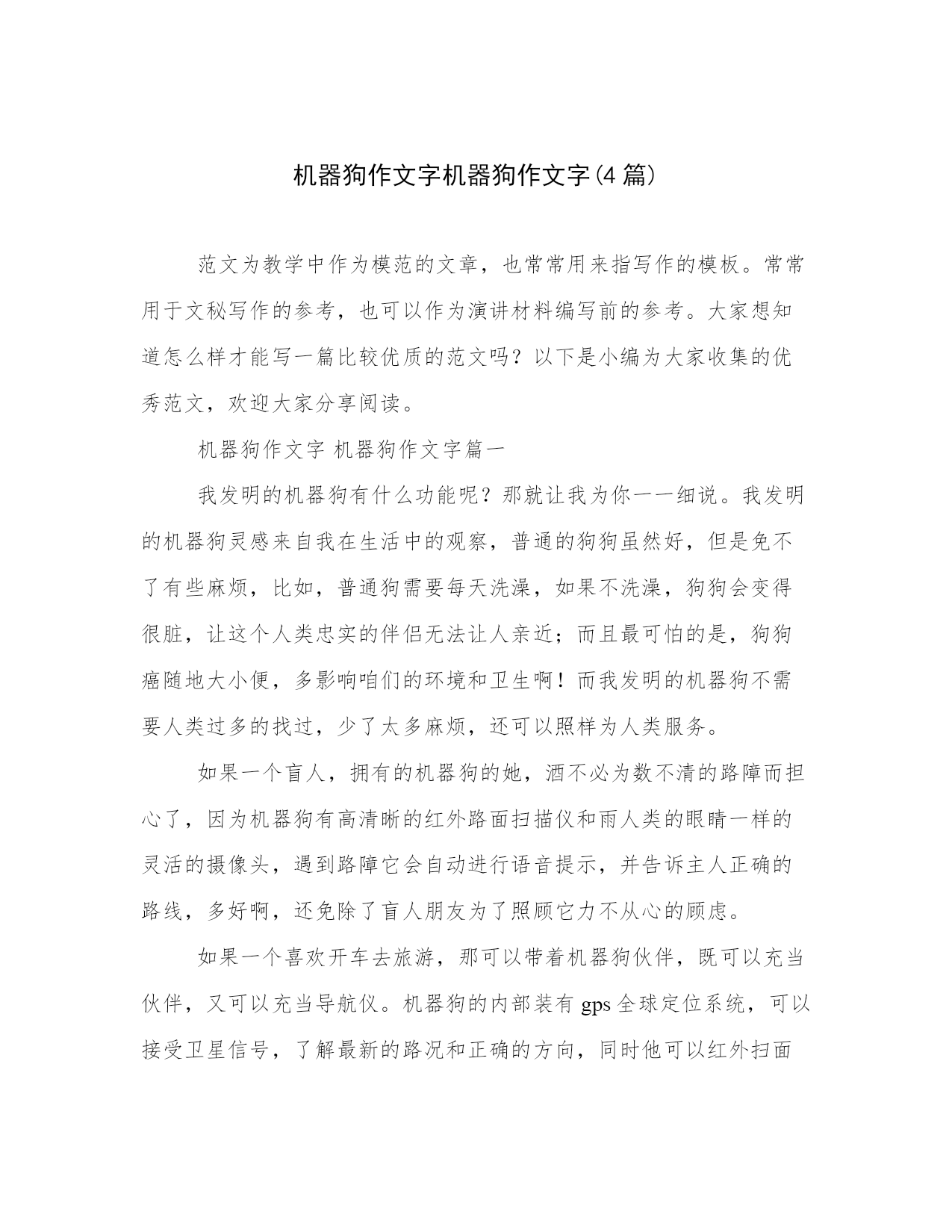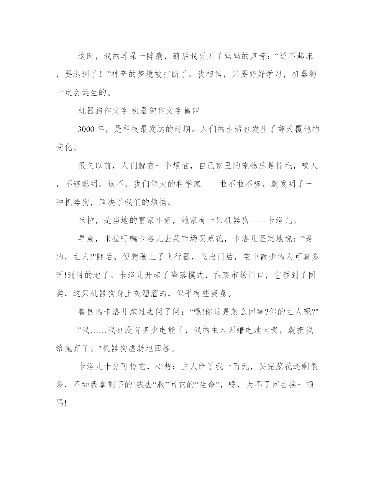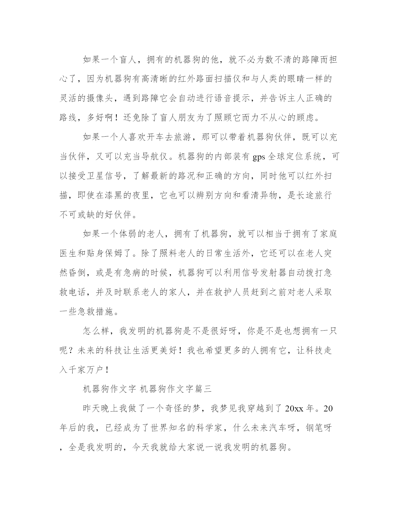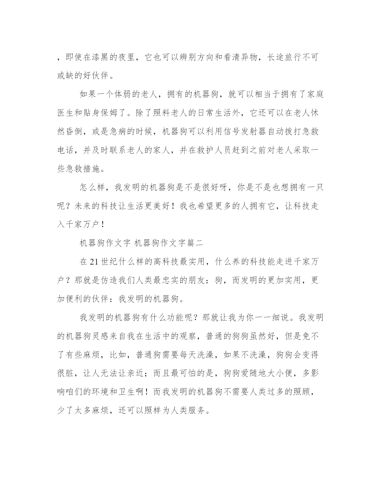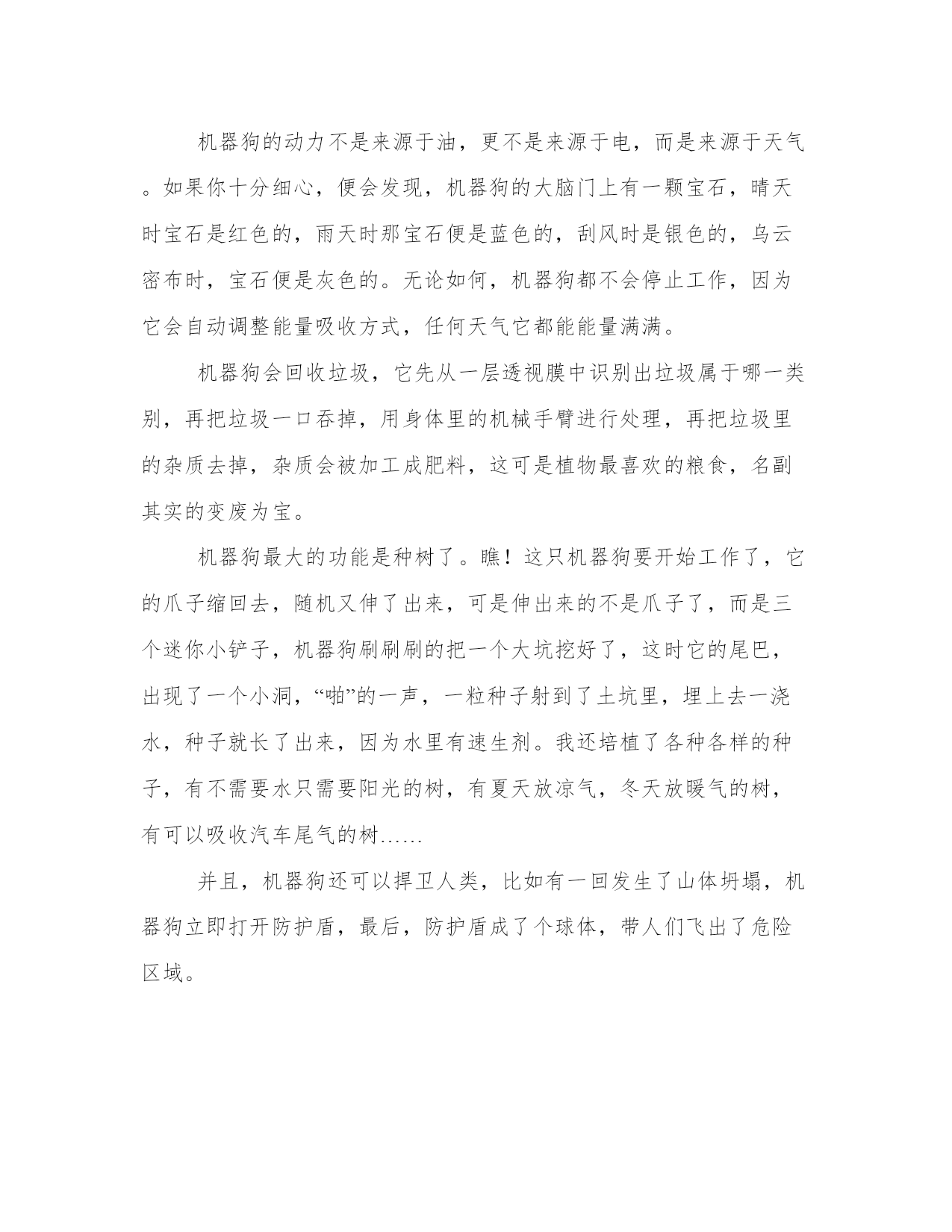 机器狗作文字机器狗作文字(4篇)范文为教学中作为模范的文章,也常常用来指写作的模板。常常用于文秘写作的参考,也可以作为演讲材料编写前的参考。大家想知道怎么样才能写一篇比较优质的范文吗?以下是小编为大家收集的优秀范文,欢迎大家分享阅读。机器狗作文字机器狗作文字篇一我发明的机器狗有什么功能呢?那就让我为你一一细说。我发明的机器狗灵感来自我在生活中的观察,普通的狗狗虽然好,但是免不了有些麻烦,比如,普通狗需要每天洗澡,如果不洗澡,狗狗会变得很脏,让这个人类忠实的伴侣无法让人亲近;而且最可怕的是,狗狗癌随地大小便,多影响咱们的环境和卫生啊!而我发明的机器狗不需要人类过多的找过,少了太多麻烦,还可以照样为人类服务。如果一个盲人,拥有的机器狗的她,酒不必为数不清的路障而担心了,因为机器狗有高清晰的红外路面扫描仪和雨人类的眼睛一样的灵活的摄像头,遇到路障它会自动进行语音提示,并告诉主人正确的路线,多好啊,还免除了盲人朋友为了照顾它力不从心的顾虑。如果一个喜欢开车去旅游,那可以带着机器狗伙伴,既可以充当伙伴,又可以充当导航仪。机器狗的内部装有gps全球定位系统,可以接受卫星信号,了解最新的路况和正确的方向,同时他可以红外扫面,即使在漆黑的夜里,它也可以辨别方向和看清异物,长途旅行不可或缺的好伙伴。如果一个体弱的老人,拥有的机器狗,就可以相当于拥有了家庭医生和贴身保姆了。除了照料老人的日常生活外,它还可以在老人怵然昏倒,或是急病的时候,机器狗可以利用信号发射器自动拨打急救电话,并及时联系老人的家人,并在救护人员赶到之前对老人采取一些急救措施。怎么样,我发明的机器狗是不是很好呀,你是不是也想拥有一只呢?未来的科技让生活更美好!我也希望更多的人拥有它,让科技走入千家万户!机器狗作文字机器狗作文字篇二在21世纪什么样的高科技最实用,什么养的科技能走进千家万户?那就是仿造我们人类最忠实的朋友:狗,而发明的更加实用,更加便利的伙伴:我发明的机器狗。我发明的机器狗有什么功能呢?那就让我为你一一细说。我发明的机器狗灵感来自我在生活中的观察,普通的狗狗虽然好,但是免不了有些麻烦,比如,普通狗需要每天洗澡,如果不洗澡,狗狗会变得很脏,让人无法让亲近;而且最可怕的是,狗狗爱随地大小便,多影响咱们的环境和卫生啊!而我发明的机器狗不需要人类过多的照顾,少了太多麻烦,还可以照样为人类服务。如果一个盲人,拥有的机器狗的他,就不必为数不清的路障而担心了,因为机器狗有高清晰的红外路面扫描仪和与人类的眼睛一样的灵活的摄像头,遇到路障它会自动进行语音提示,并告诉主人正确的路线,多好啊!还免除了盲人朋友为了照顾它而力不从心的顾虑。如果一个人喜欢开车去旅游,那可以带着机器狗伙伴,既可以充当伙伴,又可以充当导航仪。机器狗的内部装有gps全球定位系统,可以接受卫星信号,了解最新的路况和正确的方向,同时他可以红外扫描,即使在漆黑的夜里,它也可以辨别方向和看清异物,是长途旅行不可或缺的好伙伴。如果一个体弱的老人,拥有了机器狗,就可以相当于拥有了家庭医生和贴身保姆了。除了照料老人的日常生活外,它还可以在老人突然昏倒,或是有急病的时候,机器狗可以利用信号发射器自动拨打急救电话,并及时联系老人的家人,并在救护人员赶到之前对老人采取一些急救措施。怎么样,我发明的机器狗是不是很好呀,你是不是也想拥有一只呢?未来的科技让生活更美好!我也希望更多的人拥有它,让科技走入千家万户!机器狗作文字机器狗作文字篇三昨天晚上我做了一个奇怪的梦,我梦见我穿越到了20xx年。20年后的我,已经成为了世界知名的科学家,什么未来汽车呀,钢笔呀,全是我发明的,今天我就给大家说一说我发明的机器狗。机器狗的动力不是来源于油,更不是来源于电,而是来源于天气。如果你十分细心,便会发现,机器狗的大脑门上有一颗宝石,晴天时宝石是红色的,雨天时那宝石便是蓝色的,刮风时是银色的,乌云密布时,宝石便是灰色的。无论如何,机器狗都不会停止工作,因为它会自动调整能量吸收方式,任何天气它都能能量满满。机器狗会回收垃圾,它先从一层透视膜中识别出垃圾属于哪一类别,再把垃圾一口吞掉,用身体里的机械手臂进行处理,再把垃圾里的杂质去掉,杂质会被加工成肥料,这可是植物最喜欢的粮食,名副其实的变废为宝。机器狗最大的功能是种树了。瞧!这只机器狗要开始工作了,它的爪子缩回去,随机又伸了出来,可是伸出来的不是爪子了,而是三个迷你小铲子,机器狗刷刷刷的把一个大坑挖好了,这时它的尾巴,出现了一个小洞,“啪”的一声,一粒种子射到了土坑里,埋上去一浇水,种子就长了出来,因为水里有速生剂。我还培植了各种各样的种子,有不需要水只需要阳光的树,有夏天放凉气,冬天放暖气的树,有可以吸收汽车尾气的树……并且,机器狗还可以捍卫人类,比如有一回发生了山体坍塌,机器狗立即打开防护盾,最后,防护盾