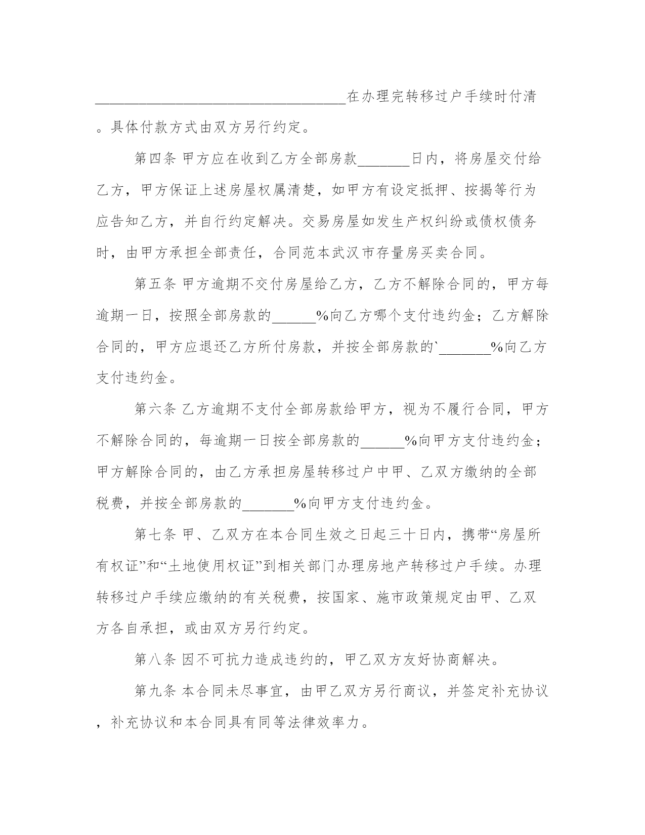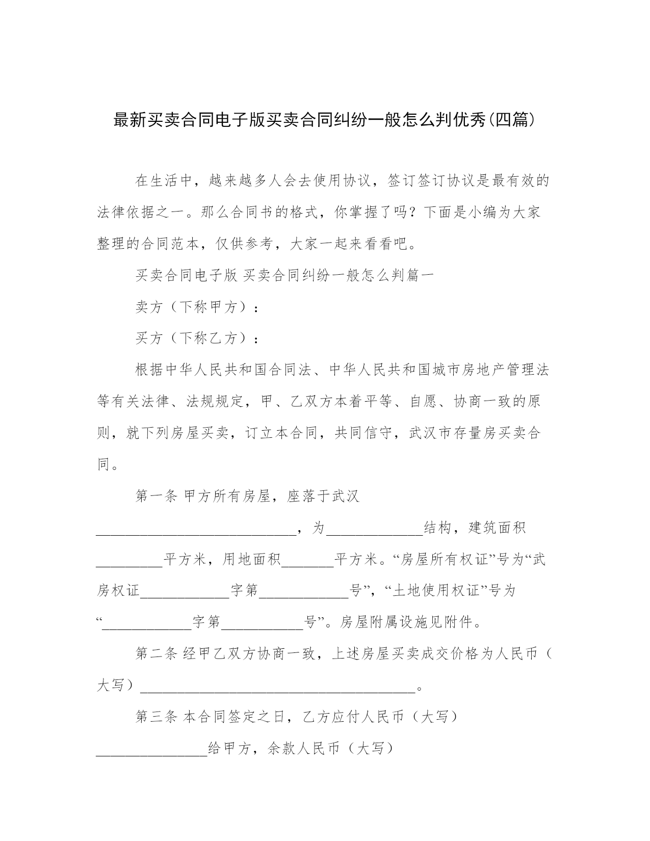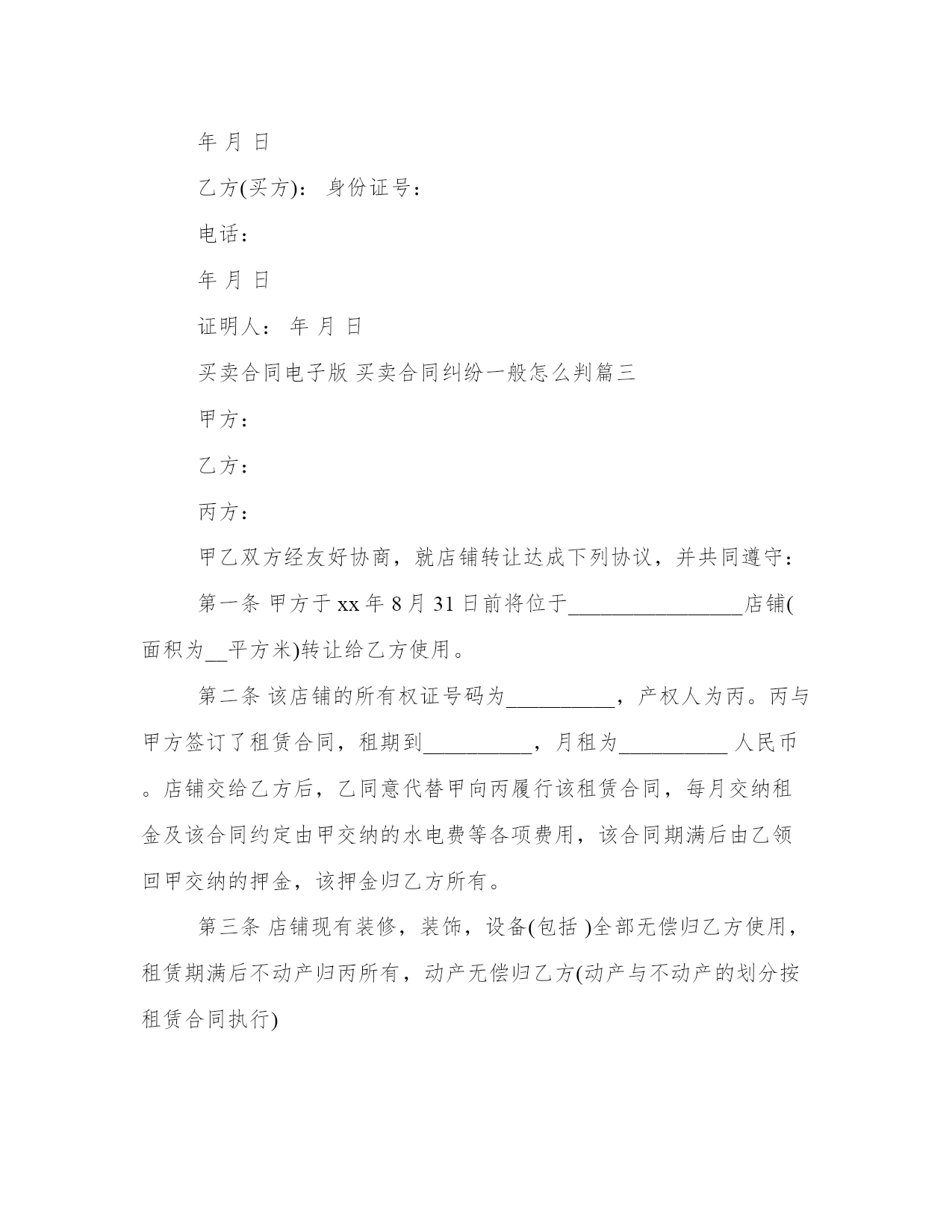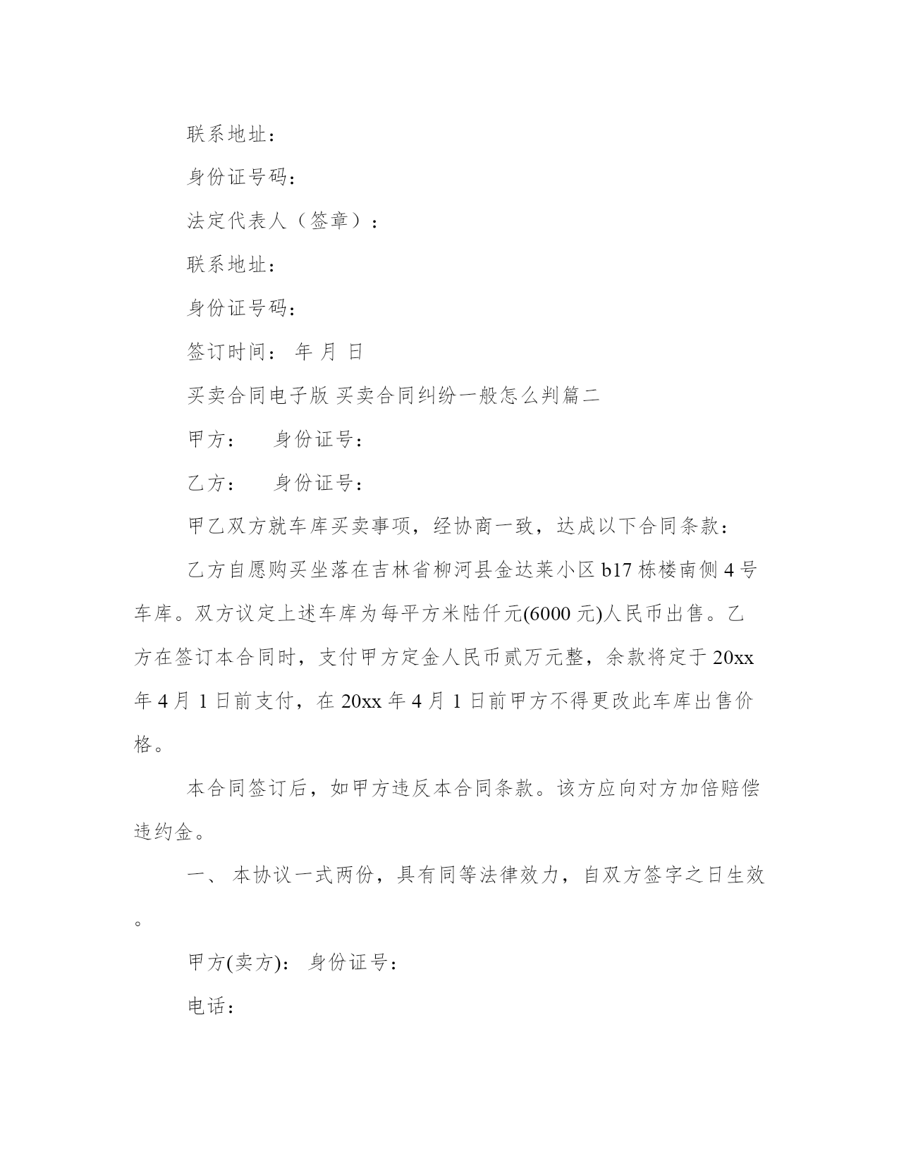 最新买卖合同电子版买卖合同纠纷一般怎么判优秀(四篇)在生活中,越来越多人会去使用协议,签订签订协议是最有效的法律依据之一。那么合同书的格式,你掌握了吗?下面是小编为大家整理的合同范本,仅供参考,大家一起来看看吧。买卖合同电子版买卖合同纠纷一般怎么判篇一卖方(下称甲方):买方(下称乙方):根据中华人民共和国合同法、中华人民共和国城市房地产管理法等有关法律、法规规定,甲、乙双方本着平等、自愿、协商一致的原则,就下列房屋买卖,订立本合同,共同信守,武汉市存量房买卖合同。第一条甲方所有房屋,座落于武汉___________________________,为_____________结构,建筑面积_________平方米,用地面积_______平方米。“房屋所有权证”号为“武房权证____________字第____________号”,“土地使用权证”号为“____________字第___________号”。房屋附属设施见附件。第二条经甲乙双方协商一致,上述房屋买卖成交价格为人民币(大写)_____________________________________。第三条本合同签定之日,乙方应付人民币(大写)_______________给甲方,余款人民币(大写)__________________________________在办理完转移过户手续时付清。具体付款方式由双方另行约定。第四条甲方应在收到乙方全部房款_______日内,将房屋交付给乙方,甲方保证上述房屋权属清楚,如甲方有设定抵押、按揭等行为应告知乙方,并自行约定解决。交易房屋如发生产权纠纷或债权债务时,由甲方承担全部责任,合同范本武汉市存量房买卖合同。第五条甲方逾期不交付房屋给乙方,乙方不解除合同的,甲方每逾期一日,按照全部房款的______%向乙方哪个支付违约金;乙方解除合同的,甲方应退还乙方所付房款,并按全部房款的`_______%向乙方支付违约金。第六条乙方逾期不支付全部房款给甲方,视为不履行合同,甲方不解除合同的,每逾期一日按全部房款的______%向甲方支付违约金;甲方解除合同的,由乙方承担房屋转移过户中甲、乙双方缴纳的全部税费,并按全部房款的_______%向甲方支付违约金。第七条甲、乙双方在本合同生效之日起三十日内,携带“房屋所有权证”和“土地使用权证”到相关部门办理房地产转移过户手续。办理转移过户手续应缴纳的有关税费,按国家、施市政策规定由甲、乙双方各自承担,或由双方另行约定。第八条因不可抗力造成违约的,甲乙双方友好协商解决。第九条本合同未尽事宜,由甲乙双方另行商议,并签定补充协议,补充协议和本合同具有同等法律效率力。第十条本合同履行中若发生争议,由甲乙双方友好协商解决,协商不成时,可以向武汉市仲裁委员会申请仲裁或向该房屋所在地人民法院起诉。第十一条本合同自双方签字之日起生效。第十二条本合同一式四份,双方各执一份,其他两份交有关部门存档。第十三条补充协议、附件:立合同人卖方(签章):联系地址:身份证号码:代理人(签章):联系地址:身份证号码:法定代表人(签章):联系地址:身份证号码:买方(签章):联系地址:身份证号码:代理人(签章):联系地址:身份证号码:法定代表人(签章):联系地址:身份证号码:签订时间:年月日买卖合同电子版买卖合同纠纷一般怎么判篇二甲方:身份证号:乙方:身份证号:甲乙双方就车库买卖事项,经协商一致,达成以下合同条款:乙方自愿购买坐落在吉林省柳河县金达莱小区b17栋楼南侧4号车库。双方议定上述车库为每平方米陆仟元(6000元)人民币出售。乙方在签订本合同时,支付甲方定金人民币贰万元整,余款将定于20xx年4月1日前支付,在20xx年4月1日前甲方不得更改此车库出售价格。本合同签订后,如甲方违反本合同条款。该方应向对方加倍赔偿违约金。一、本协议一式两份,具有同等法律效力,自双方签字之日生效。甲方(卖方):身份证号:电话:年月日乙方(买方):身份证号:电话:年月日证明人:年月日买卖合同电子版买卖合同纠纷一般怎么判篇三甲方:乙方:丙方:甲乙双方经友好协商,就店铺转让达成下列协议,并共同遵守:第一条甲方于xx年8月31日前将位于________________店铺(面积为__平方米)转让给乙方使用。第二条该店铺的所有权证号码为__________,产权人为丙。丙与甲方签订了租赁合同,租期到__________,月租为__________人民币。店铺交给乙方后,乙同意代替甲向丙履行该租赁合同,每月交纳租金及该合同约定由甲交纳的水电费等各项费用,该合同期满后由乙领回甲交纳的押金,该押金归乙方所有。第三条店铺现有装修,装饰,设备(包括)全部无偿归乙方使用,租赁期满后不动产归丙所有,动产无偿归乙方(动产与不动产的划分按租赁合同执行)第四条乙方在__