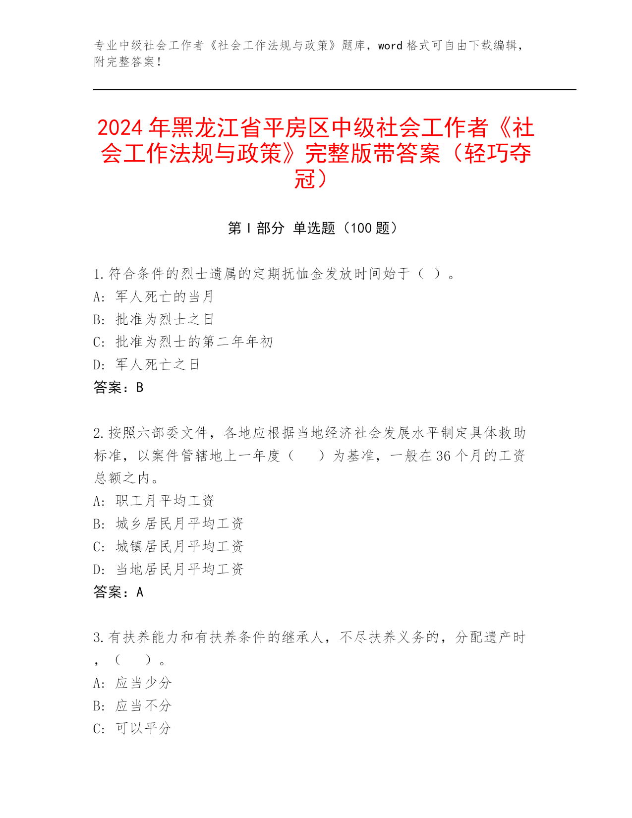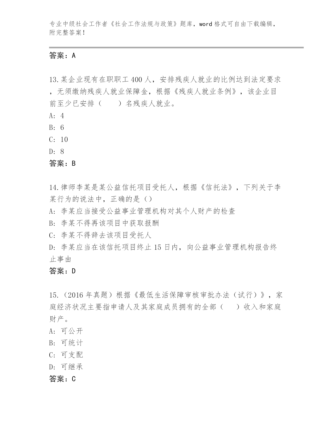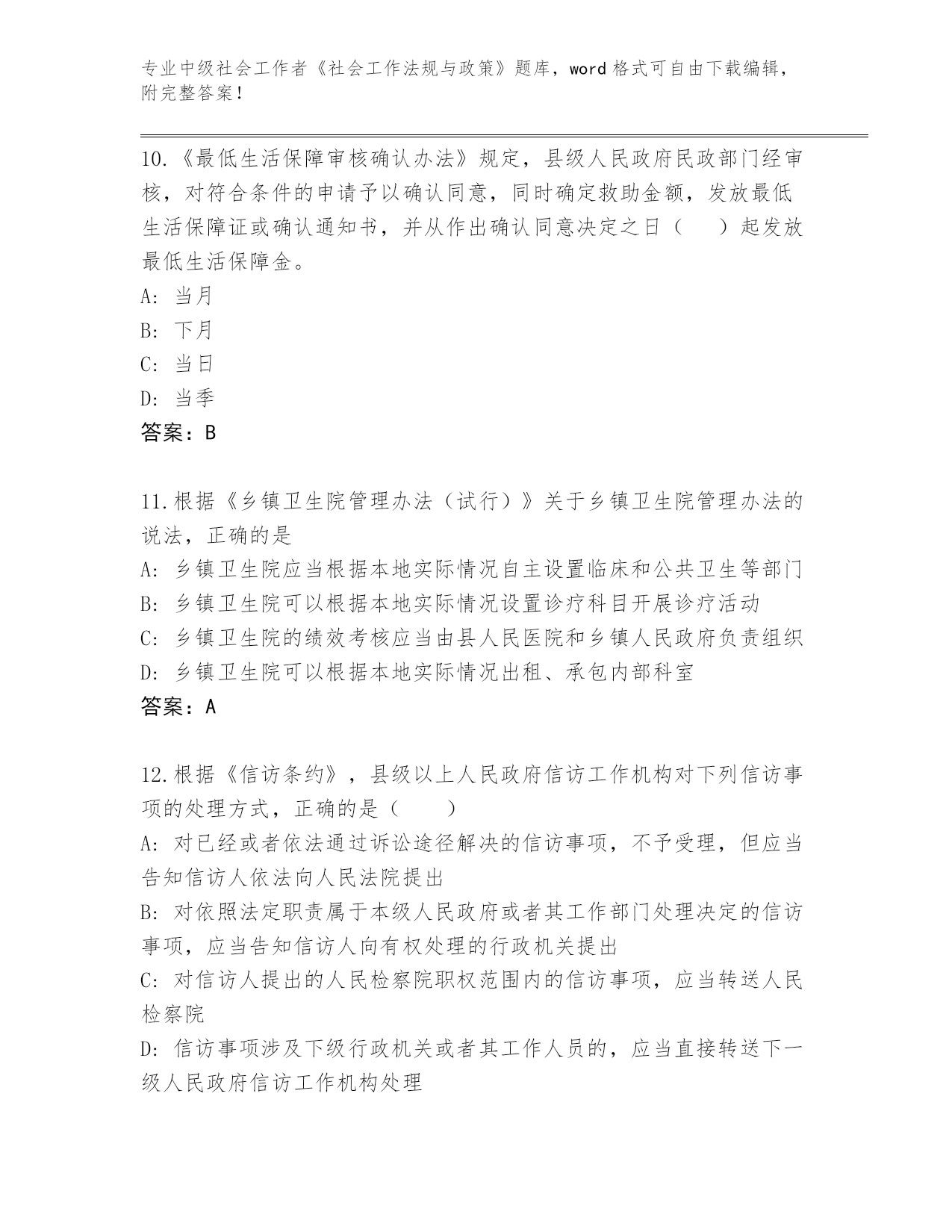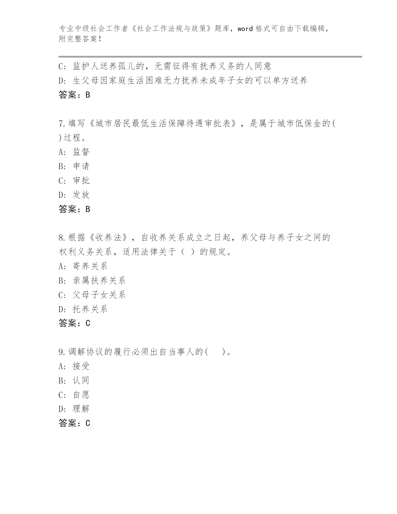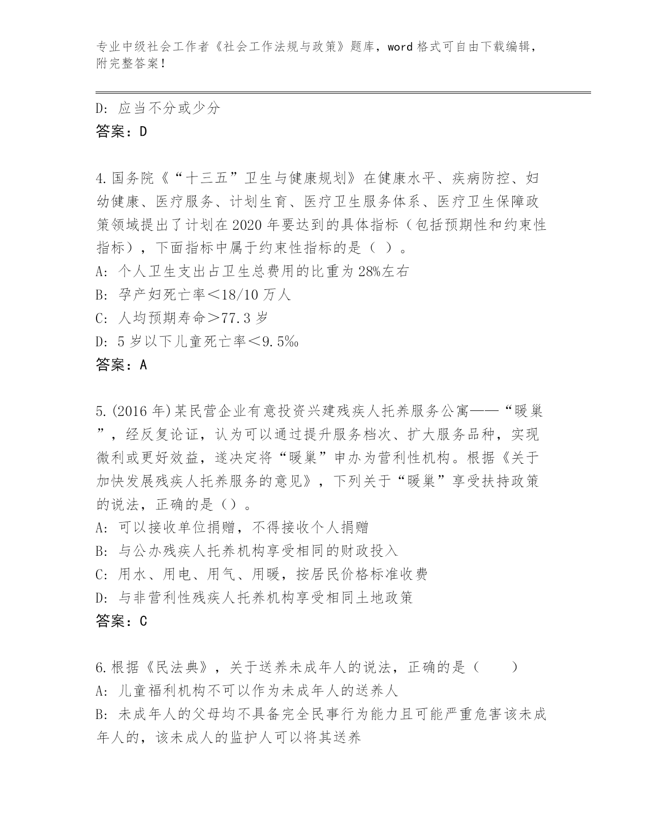 专业中级社会工作者《社会工作法规与政策》题库,word格式可自由下载编辑,附完整答案!2024年黑龙江省平房区中级社会工作者《社会工作法规与政策》完整版带答案(轻巧夺冠)第I部分单选题(100题)1.符合条件的烈士遗属的定期抚恤金发放时间始于()。A:军人死亡的当月B:批准为烈士之日C:批准为烈士的第二年年初D:军人死亡之日答案:B2.按照六部委文件,各地应根据当地经济社会发展水平制定具体救助标准,以案件管辖地上一年度()为基准,一般在36个月的工资总额之内。A:职工月平均工资B:城乡居民月平均工资C:城镇居民月平均工资D:当地居民月平均工资答案:A3.有扶养能力和有扶养条件的继承人,不尽扶养义务的,分配遗产时,()。A:应当少分B:应当不分C:可以平分D:应当不分或少分答案:D4.国务院《“十三五”卫生与健康规划》在健康水平、疾病防控、妇幼健康、医疗服务、计划生育、医疗卫生服务体系、医疗卫生保障政策领域提出了计划在2020年要达到的具体指标(包括预期性和约束性指标),下面指标中属于约束性指标的是()。A:个人卫生支出占卫生总费用的比重为28%左右B:孕产妇死亡率<18/10万人C:人均预期寿命>77.3岁D:5岁以下儿童死亡率<9.5‰答案:A5.(2016年)某民营企业有意投资兴建残疾人托养服务公寓——“暖巢”,经反复论证,认为可以通过提升服务档次、扩大服务品种,实现微利或更好效益,遂决定将“暖巢”申办为营利性机构。根据《关于加快发展残疾人托养服务的意见》,下列关于“暖巢”享受扶持政策的说法,正确的是()。A:可以接收单位捐赠,不得接收个人捐赠B:与公办残疾人托养机构享受相同的财政投入C:用水、用电、用气、用暖,按居民价格标准收费D:与非营利性残疾人托养机构享受相同土地政策答案:C6.根据《民法典》,关于送养未成年人的说法,正确的是()A:儿童福利机构不可以作为未成年人的送养人B:未成年人的父母均不具备完全民事行为能力且可能严重危害该未成年人的,该未成人的监护人可以将其送养C:监护人送养孤儿的,无需征得有抚养义务的人同意D:生父母因家庭生活困难无力抚养未成年子女的可以单方送养答案:B7.填写《城市居民最低生活保障待遇审批表》,是属于城市低保金的()过程。A:监督B:申请C:审批D:发放答案:B8.根据《收养法》,自收养关系成立之日起,养父母与养子女之间的权利义务关系,适用法律关于()的规定。A:寄养关系B:亲属扶养关系C:父母子女关系D:托养关系答案:C9.调解协议的履行必须出自当事人的()。A:接受B:认同C:自愿D:理解答案:C10.《最低生活保障审核确认办法》规定,县级人民政府民政部门经审核,对符合条件的申请予以确认同意,同时确定救助金额,发放最低生活保障证或确认通知书,并从作出确认同意决定之日()起发放最低生活保障金。A:当月B:下月C:当日D:当季答案:B11.根据《乡镇卫生院管理办法(试行)》关于乡镇卫生院管理办法的说法,正确的是A:乡镇卫生院应当根据本地实际情况自主设置临床和公共卫生等部门B:乡镇卫生院可以根据本地实际情况设置诊疗科目开展诊疗活动C:乡镇卫生院的绩效考核应当由县人民医院和乡镇人民政府负责组织D:乡镇卫生院可以根据本地实际情况出租、承包内部科室答案:A12.根据《信访条约》,县级以上人民政府信访工作机构对下列信访事项的处理方式,正确的是()A:对已经或者依法通过诉讼途径解决的信访事项,不予受理,但应当告知信访人依法向人民法院提出B:对依照法定职责属于本级人民政府或者其工作部门处理决定的信访事项,应当告知信访人向有权处理的行政机关提出C:对信访人提出的人民检察院职权范围内的信访事项,应当转送人民检察院D:信访事项涉及下级行政机关或者其工作人员的,应当直接转送下一级人民政府信访工作机构处理答案:A13.某企业现有在职职工400人,安排残疾人就业的比例达到法定要求,无须缴纳残疾人就业保障金,根据《残疾人就业条例》,该企业目前至少已安排()名残疾人就业。A:4B:6C:10D:8答案:B14.律师李某是某公益信托项目受托人,根据《信托法》,下列关于李某行为的说法中,正确的是()A:李某应当接受公益事业管理机构对其个人财产的检查B:李某不得再该项目中获取报酬C:李某不得辞去该项目受托人D:李某应当在该信托项目终止15日内,向公益事业管理机构报告终止事由答案:D15.(2016年真题)根据《最低生活保障审核审批办法(试行)》,家庭经济状况主要指申请人及其家庭成员拥有的全部()收入和家庭财产。A:可公开B:可统计C:可支配D:可继承答案:C16.为保证做事效率,及时处理百姓的问题,行政机关及其工作人员办理信访事项,应当恪尽职守、秉公办事,查明事实、分清责任,宣传法制、教育疏导,及时妥善处理,不得推诿、敷衍、拖