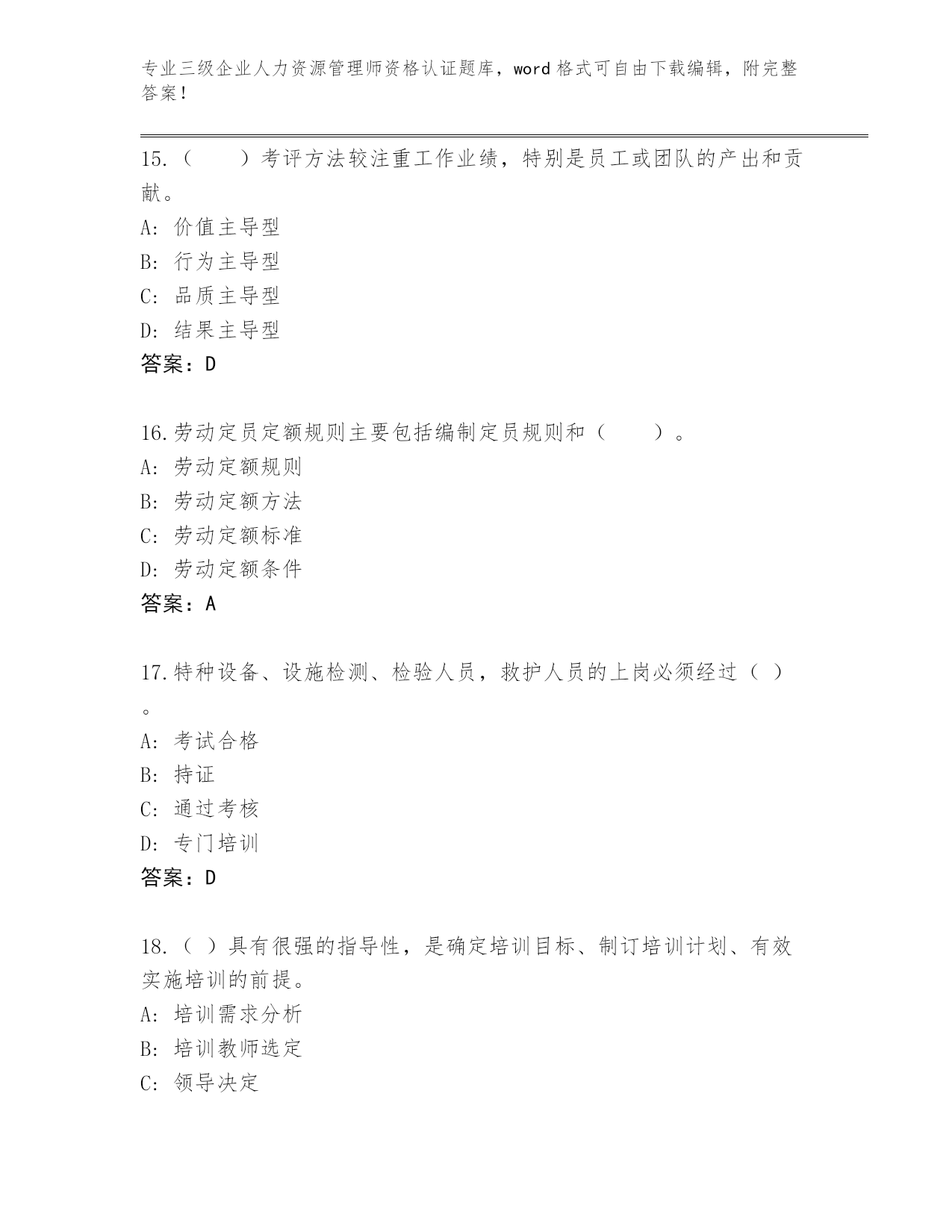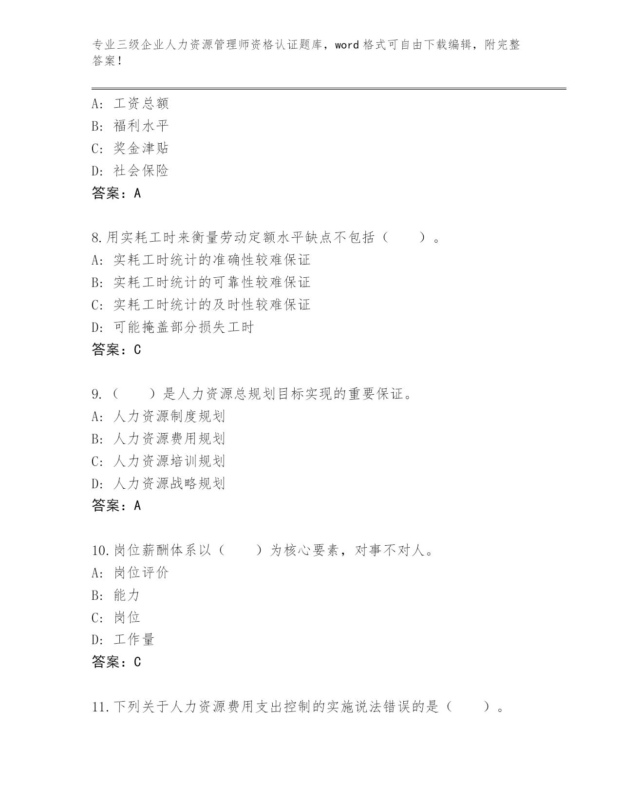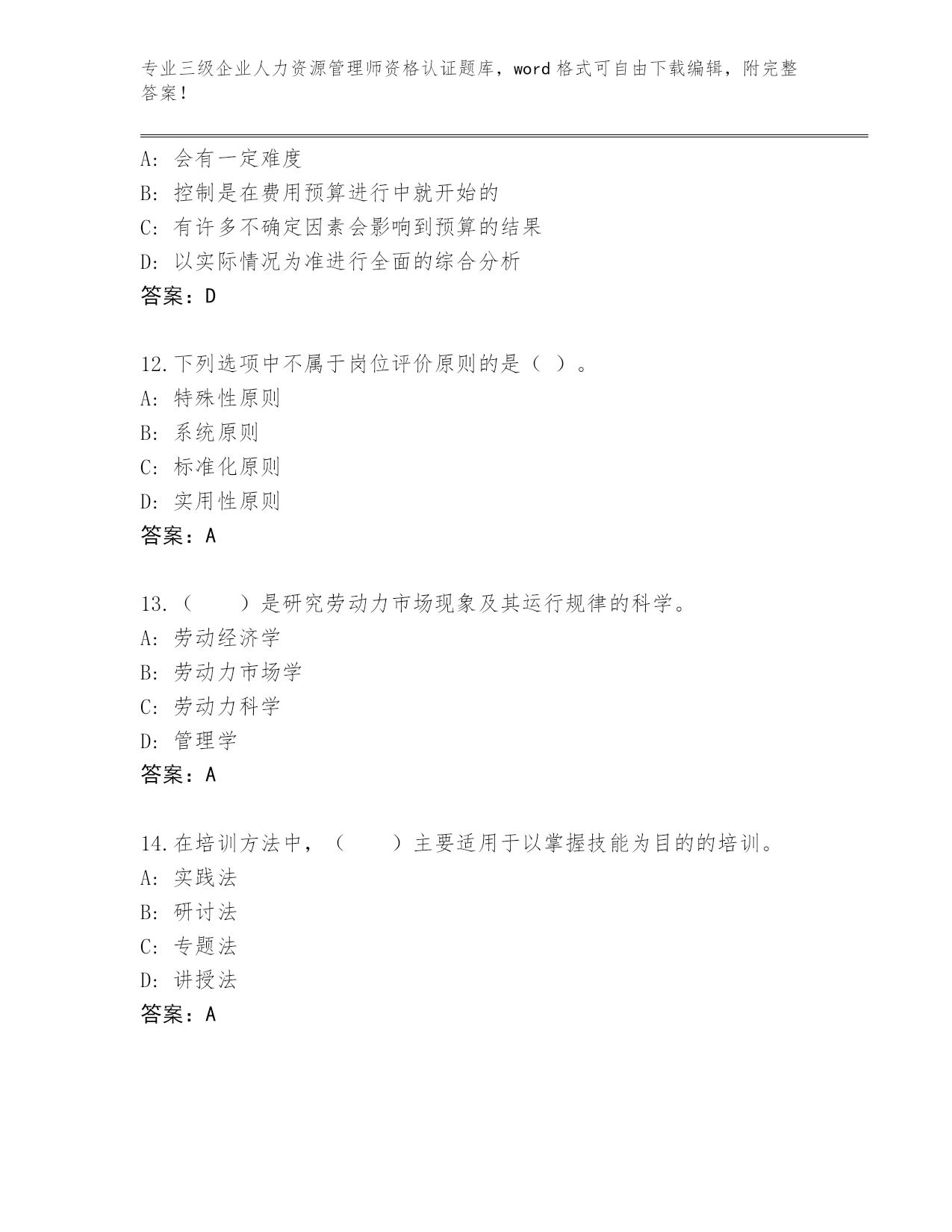 专业三级企业人力资源管理师资格认证题库,word格式可自由下载编辑,附完整答案!河北省涿州市2024年三级企业人力资源管理师资格认证大全【达标题】第I部分单选题(100题)1.职工代表大会或者全体职工讨论集体合同草案或专项集体合同草案,须经全体职工代表或者全体职工()同意,集体合同草案或专项集体合同草案方获通过。A:3/4B:3/5以上C:2/3以上D:半数以上答案:D2.集体合同与劳动公司的()表现在,协商、订立集体合同的目的是规定企业的一般劳动条件,为劳动关系的各个方面设定具体标准,并作为单个劳动合同的基础和指导原则。A:主体不同B:内容不同C:法律效力不同D:功能不同答案:D3.“敬业”概念包含的基本内容是()A:恪尽职守、勤奋努力、享受工作、精益求精B:勤奋努力、用心工作、等价交换、劳有所得C:热爱岗位、敬畏工作、一心一意、不求回报D:守土有责、勤奋工作、按劳分配、自享其乐答案:A4.()是指对薪酬体系运行状况进行控制和监督,以减少运行过程中的偏差。A:薪酬管理B:薪酬结构C:薪酬水平D:薪酬政策答案:A5.以下关于货币工资的描述,不正确的是()。A:能够准确说明工资的实际购买力B:工人单位时间的货币所得C:受到相关工资制度安排的影响D:受到工资率与工作时间长度的影响答案:A6.公文处理模拟法又称()测试,它是经过多年实践检验的一种有效的管理人员的测评方法。A:文件筐B:公文筐C:文件夹D:事件簿答案:B7.对()的准确统计是国家从宏观上了解员工生活水平的重要依据,也是企业掌握人工成本的主要信息来源。A:工资总额B:福利水平C:奖金津贴D:社会保险答案:A8.用实耗工时来衡量劳动定额水平缺点不包括()。A:实耗工时统计的准确性较难保证B:实耗工时统计的可靠性较难保证C:实耗工时统计的及时性较难保证D:可能掩盖部分损失工时答案:C9.()是人力资源总规划目标实现的重要保证。A:人力资源制度规划B:人力资源费用规划C:人力资源培训规划D:人力资源战略规划答案:A10.岗位薪酬体系以()为核心要素,对事不对人。A:岗位评价B:能力C:岗位D:工作量答案:C11.下列关于人力资源费用支出控制的实施说法错误的是()。A:会有一定难度B:控制是在费用预算进行中就开始的C:有许多不确定因素会影响到预算的结果D:以实际情况为准进行全面的综合分析答案:D12.下列选项中不属于岗位评价原则的是()。A:特殊性原则B:系统原则C:标准化原则D:实用性原则答案:A13.()是研究劳动力市场现象及其运行规律的科学。A:劳动经济学B:劳动力市场学C:劳动力科学D:管理学答案:A14.在培训方法中,()主要适用于以掌握技能为目的的培训。A:实践法B:研讨法C:专题法D:讲授法答案:A15.()考评方法较注重工作业绩,特别是员工或团队的产出和贡献。A:价值主导型B:行为主导型C:品质主导型D:结果主导型答案:D16.劳动定员定额规则主要包括编制定员规则和()。A:劳动定额规则B:劳动定额方法C:劳动定额标准D:劳动定额条件答案:A17.特种设备、设施检测、检验人员,救护人员的上岗必须经过()。A:考试合格B:持证C:通过考核D:专门培训答案:D18.()具有很强的指导性,是确定培训目标、制订培训计划、有效实施培训的前提。A:培训需求分析B:培训教师选定C:领导决定D:培训过程答案:A19.()随着技能等级的变化而变化。A:外部回报B:员工薪酬C:内部回报D:工资和薪金答案:B20.合理的劳动定员是企业人力资源计划的()。A:素质B:主要依据C:科学标准D:基础答案:D21.难以随机应变,所收集信息的范围有限的面试类型是()A:非结构化面试B:诊断面试C:结构化面试D:初步面试答案:C22.招募渠道收益成本比等于某招募渠道吸引人数除以()再乘以百分之百。A:为其付出的总量B:为其付出的成本C:为其付出的利润D:为其付出的总费用答案:D23.设计绩效管理程序时,对部门或者科室员工绩效考评过程所做的设计属于()A:具体标准设计B:具体程序设计C:总方法设计D:总流程设计答案:B24.企业内部劳动规则的基本特点是()A:社会性调整B:雇主意志的体现C:当事人双方的意志D:国家意志答案:B25.下列关于关键事件法的叙述不正确的是()。A:关键事件是指有效和无效的工作行为B:该方法只注重对行为本身的评价C:该方法要考虑行为的情境D:关键事件对事不对人答案:B26.沟通阶段是整个绩效计划阶段的()。A:中心B:重点C:核心D:条件答案:C27.下列有关实耗工时的说法错误的是()。A:衡量现行劳动定额水平是否先进合理B:是企业核算产品实际成本的基本依据C:揭示产品质量检验过程中的主要问题D:考察企业以及车间、班组和个人劳动定额的完成情况答案:C28.以下是人力资源费