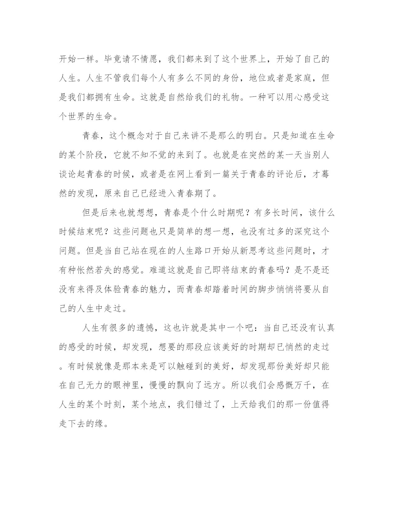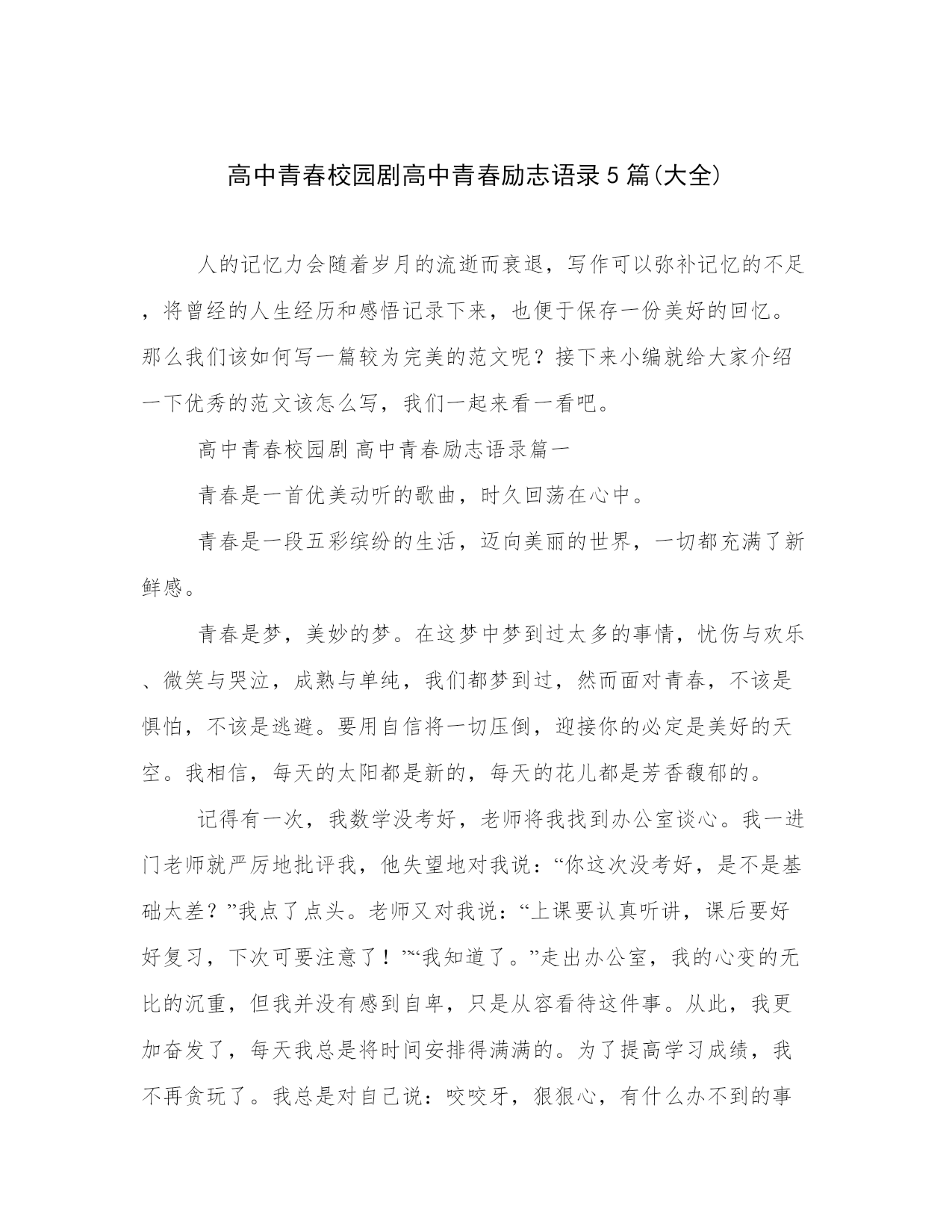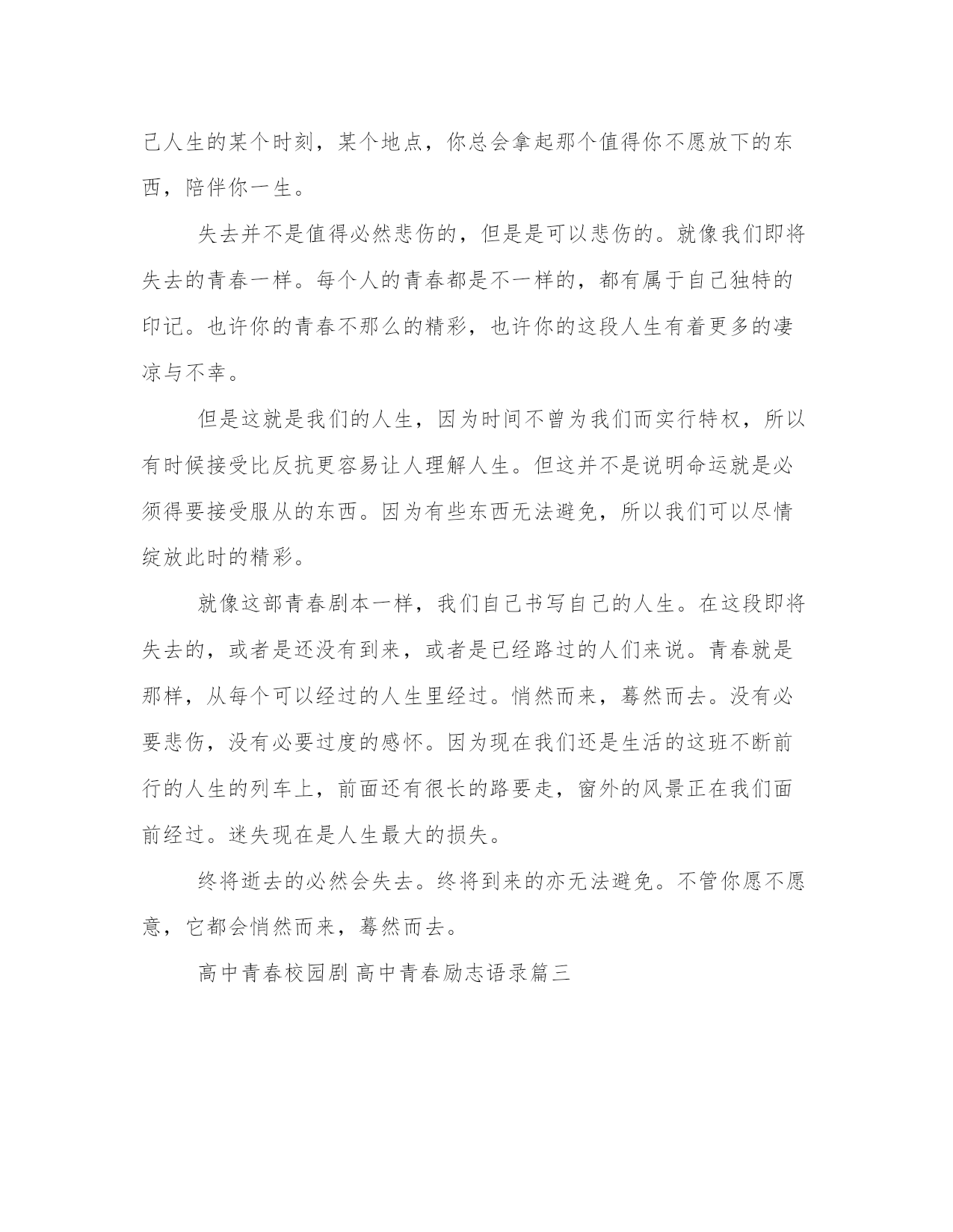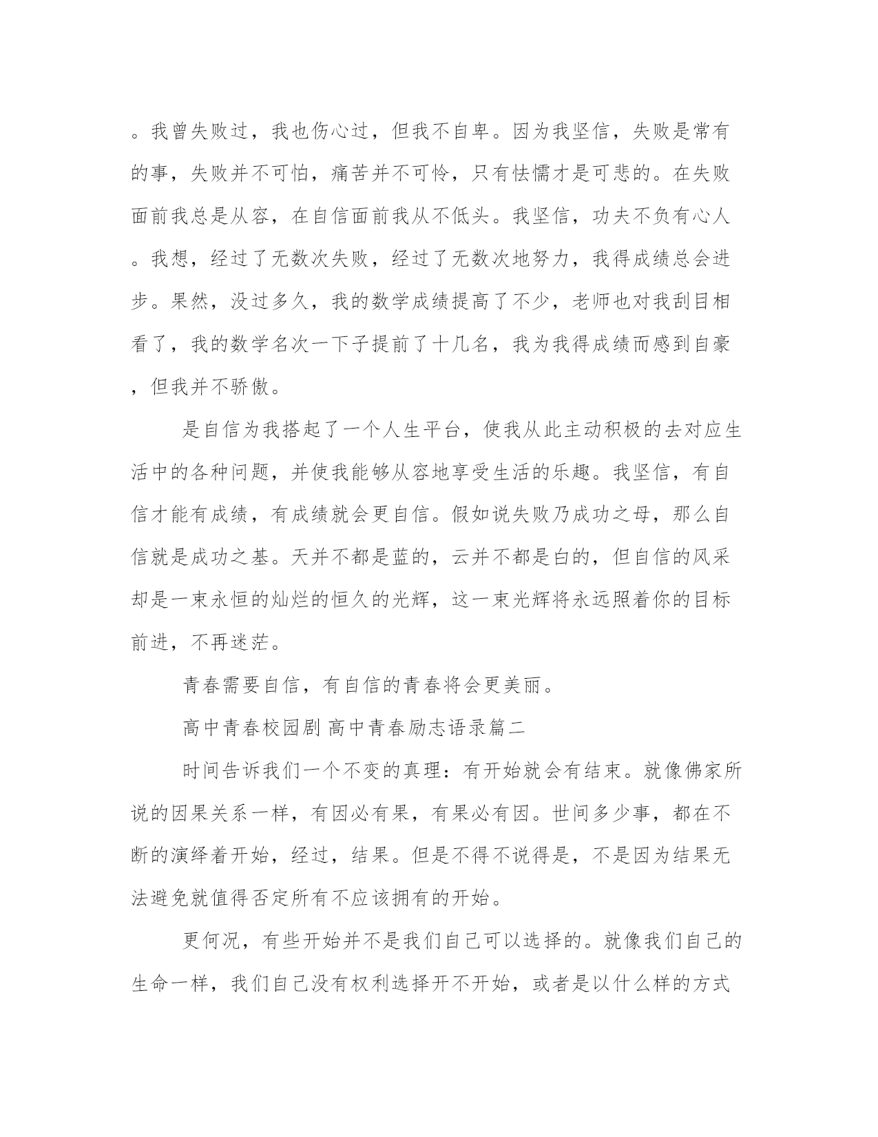 高中青春校园剧高中青春励志语录5篇(大全)人的记忆力会随着岁月的流逝而衰退,写作可以弥补记忆的不足,将曾经的人生经历和感悟记录下来,也便于保存一份美好的回忆。那么我们该如何写一篇较为完美的范文呢?接下来小编就给大家介绍一下优秀的范文该怎么写,我们一起来看一看吧。高中青春校园剧高中青春励志语录篇一青春是一首优美动听的歌曲,时久回荡在心中。青春是一段五彩缤纷的生活,迈向美丽的世界,一切都充满了新鲜感。青春是梦,美妙的梦。在这梦中梦到过太多的事情,忧伤与欢乐、微笑与哭泣,成熟与单纯,我们都梦到过,然而面对青春,不该是惧怕,不该是逃避。要用自信将一切压倒,迎接你的必定是美好的天空。我相信,每天的太阳都是新的,每天的花儿都是芳香馥郁的。记得有一次,我数学没考好,老师将我找到办公室谈心。我一进门老师就严厉地批评我,他失望地对我说:“你这次没考好,是不是基础太差?”我点了点头。老师又对我说:“上课要认真听讲,课后要好好复习,下次可要注意了!”“我知道了。”走出办公室,我的心变的无比的沉重,但我并没有感到自卑,只是从容看待这件事。从此,我更加奋发了,每天我总是将时间安排得满满的。为了提高学习成绩,我不再贪玩了。我总是对自己说:咬咬牙,狠狠心,有什么办不到的事。我曾失败过,我也伤心过,但我不自卑。因为我坚信,失败是常有的事,失败并不可怕,痛苦并不可怜,只有怯懦才是可悲的。在失败面前我总是从容,在自信面前我从不低头。我坚信,功夫不负有心人。我想,经过了无数次失败,经过了无数次地努力,我得成绩总会进步。果然,没过多久,我的数学成绩提高了不少,老师也对我刮目相看了,我的数学名次一下子提前了十几名,我为我得成绩而感到自豪,但我并不骄傲。是自信为我搭起了一个人生平台,使我从此主动积极的去对应生活中的各种问题,并使我能够从容地享受生活的乐趣。我坚信,有自信才能有成绩,有成绩就会更自信。假如说失败乃成功之母,那么自信就是成功之基。天并不都是蓝的,云并不都是白的,但自信的风采却是一束永恒的灿烂的恒久的光辉,这一束光辉将永远照着你的目标前进,不再迷茫。青春需要自信,有自信的青春将会更美丽。高中青春校园剧高中青春励志语录篇二时间告诉我们一个不变的真理:有开始就会有结束。就像佛家所说的因果关系一样,有因必有果,有果必有因。世间多少事,都在不断的演绎着开始,经过,结果。但是不得不说得是,不是因为结果无法避免就值得否定所有不应该拥有的开始。更何况,有些开始并不是我们自己可以选择的。就像我们自己的生命一样,我们自己没有权利选择开不开始,或者是以什么样的方式开始一样。毕竟请不情愿,我们都来到了这个世界上,开始了自己的人生。人生不管我们每个人有多么不同的身份,地位或者是家庭,但是我们都拥有生命。这就是自然给我们的礼物。一种可以用心感受这个世界的生命。青春,这个概念对于自己来讲不是那么的明白。只是知道在生命的某个阶段,它就不知不觉的来到了。也就是在突然的某一天当别人谈论起青春的时候,或者是在网上看到一篇关于青春的评论后,才蓦然的发现,原来自己已经进入青春期了。但是后来也就想想,青春是个什么时期呢?有多长时间,该什么时候结束呢?这些问题也只是简单的想一想,也没有过多的深究这个问题。但是当自己站在现在的人生路口开始从新思考这些问题时,才有种怅然若失的感觉。难道这就是自己即将结束的青春吗?是不是还没有来得及体验青春的魅力,而青春却踏着时间的脚步悄悄将要从自己的人生中走过。人生有很多的遗憾,这也许就是其中一个吧:当自己还没有认真的感受的时候,却发现,想要的那段应该美好的时期却已悄然的走过。有时候就像是那本来是可以触碰到的美好,却发现那份美好却只能在自己无力的眼神里,慢慢的飘向了远方。所以我们会感慨万千,在人生的某个时刻,某个地点,我们错过了,上天给我们的那一份值得走下去的缘。只是遗憾毕竟是过去的事情,现在似乎想要开始还未晚。有人曾经告诉我,人生每个时刻都是新的开始,上帝为你关上了一扇门,会同时为你打开另一扇们。只是,不管时间过了多么久,或者是安慰的话听了过少遍,抑或是读了多少关于这些的名言警句,哲理与谎言。但是我还是觉得,自己是个感情的动物,没有那么容易忘掉那些曾经的遗憾。也许在记忆里渐渐的模糊了曾经的容颜,但是那份感觉却像是陈酿了多年的美酒一样,没有轻浮的想要去占有或者是想要从新再回到起点,只是简简单单的让她处在哪里,不去刻意的忘记,不去倔强的想要抹去,只是在某些简单的日子里可以拿出来,静静的感受那份思念。朱光潜曾说过摆脱不开是悲剧的开始。但是我的经历告诉我,如果什么都可以如此轻易的摆脱的话,喜剧还会有吗?毕竟人生是一段很长的路,不是一段人生就能诠释整个生命的意义的。悲剧可能只是短暂的伤痛,喜剧也可能只是一时的自恋。拿得起,放得下,是一种境界。拿不起,放不下是一种无奈的悲伤。境界毕竟